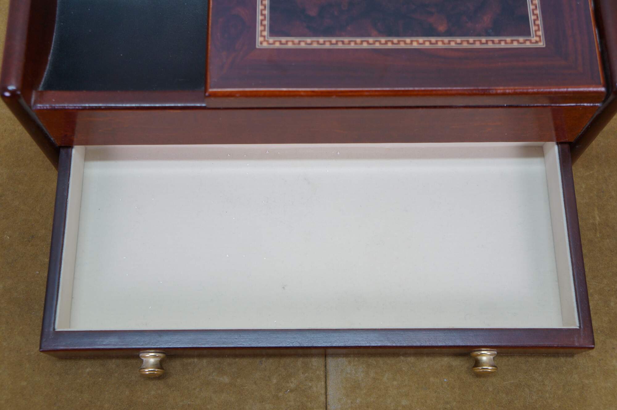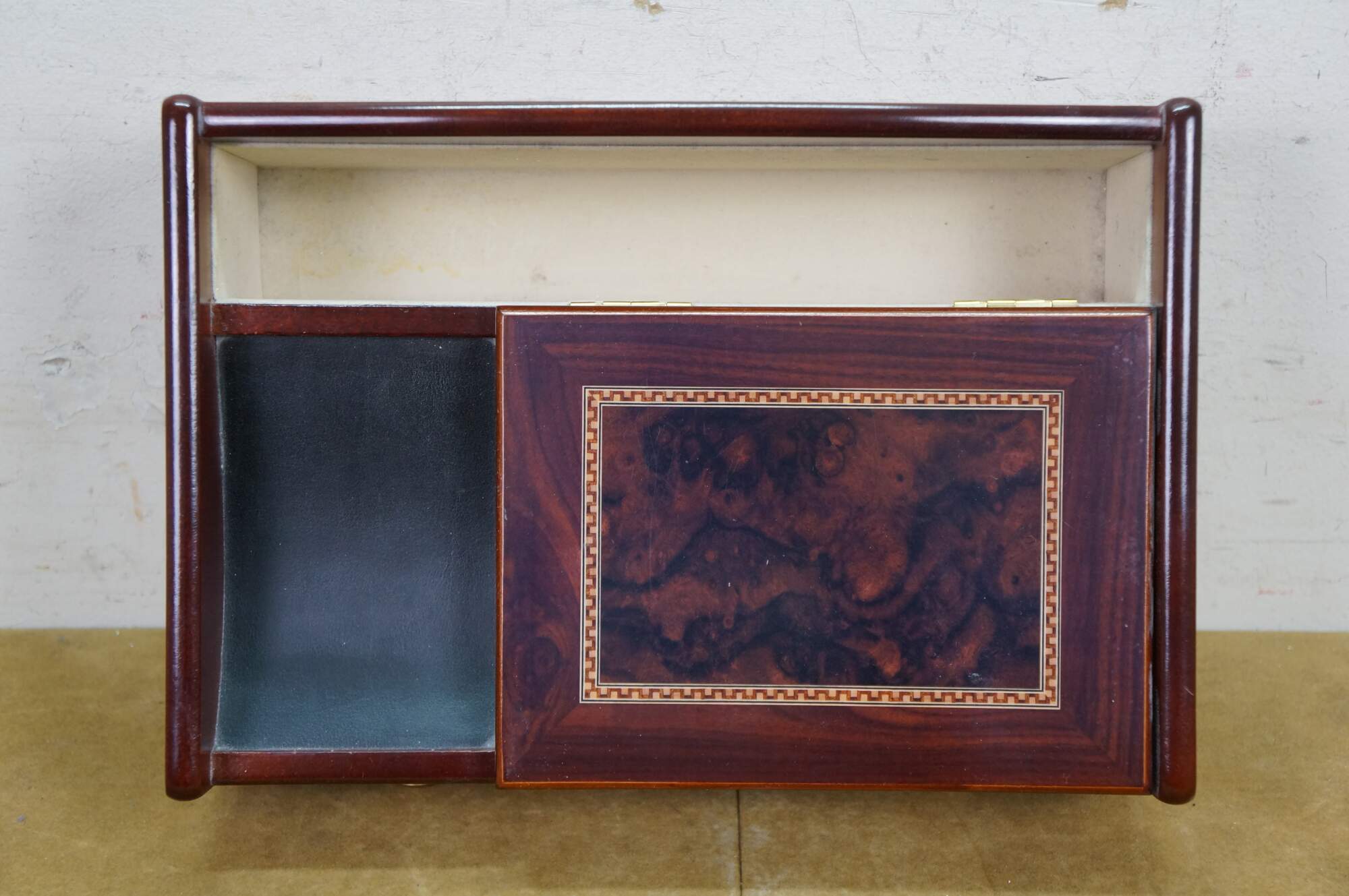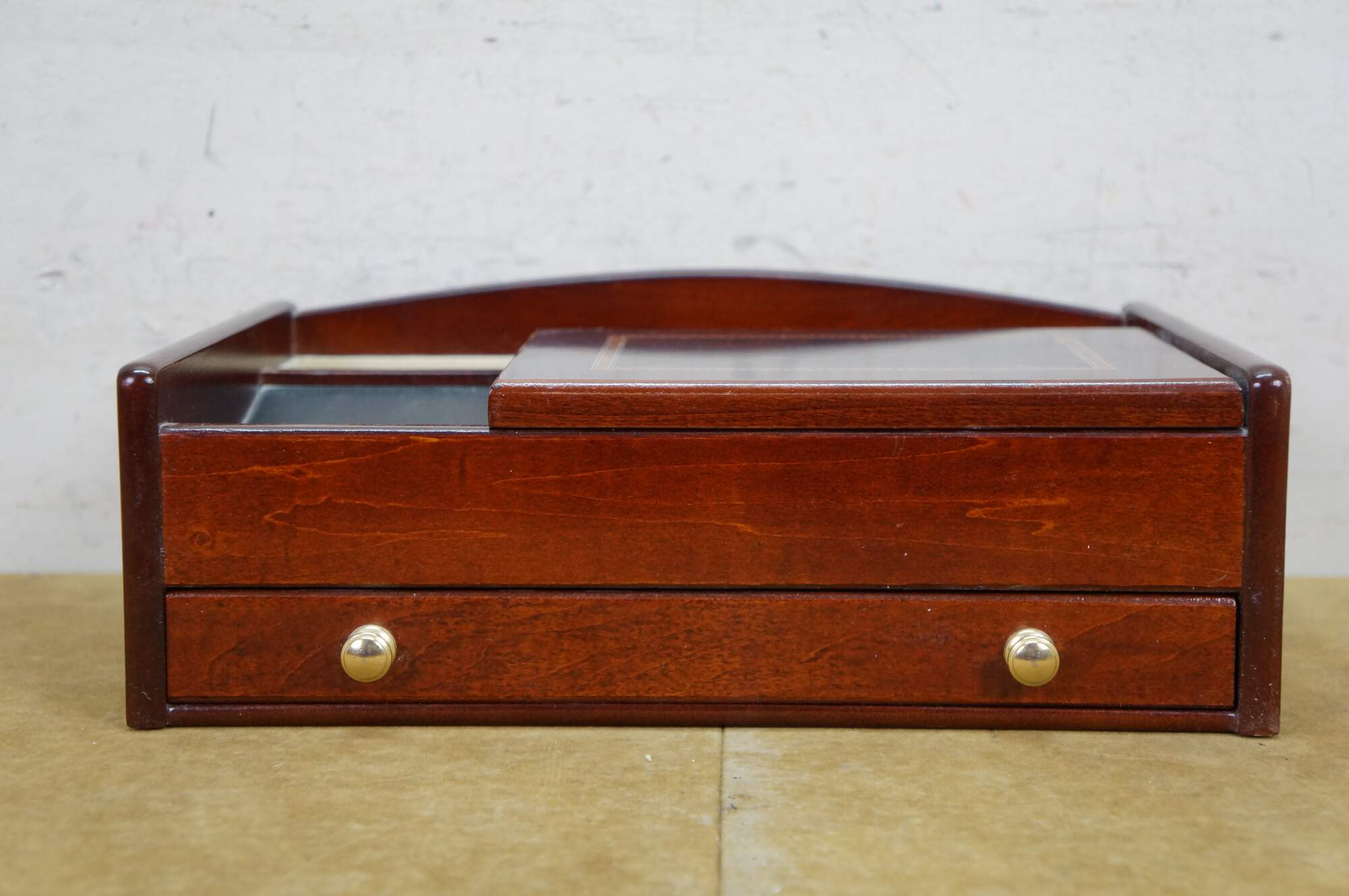 Vintage Mele & Co Davin dresser or desktop jewelry box / valet / organizer. Made of wood with a walnut and burl finish. Coin slide tray, 1 small section for loose jewelry / cufflinks, 1 large open section, a row of ring rolls, and an open area storage drawer slot.