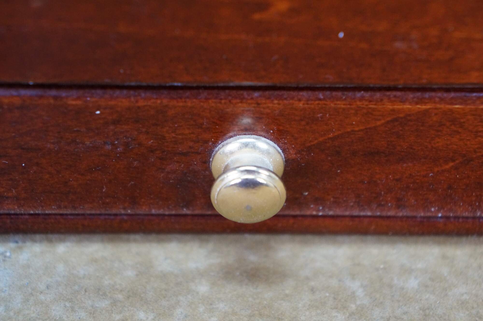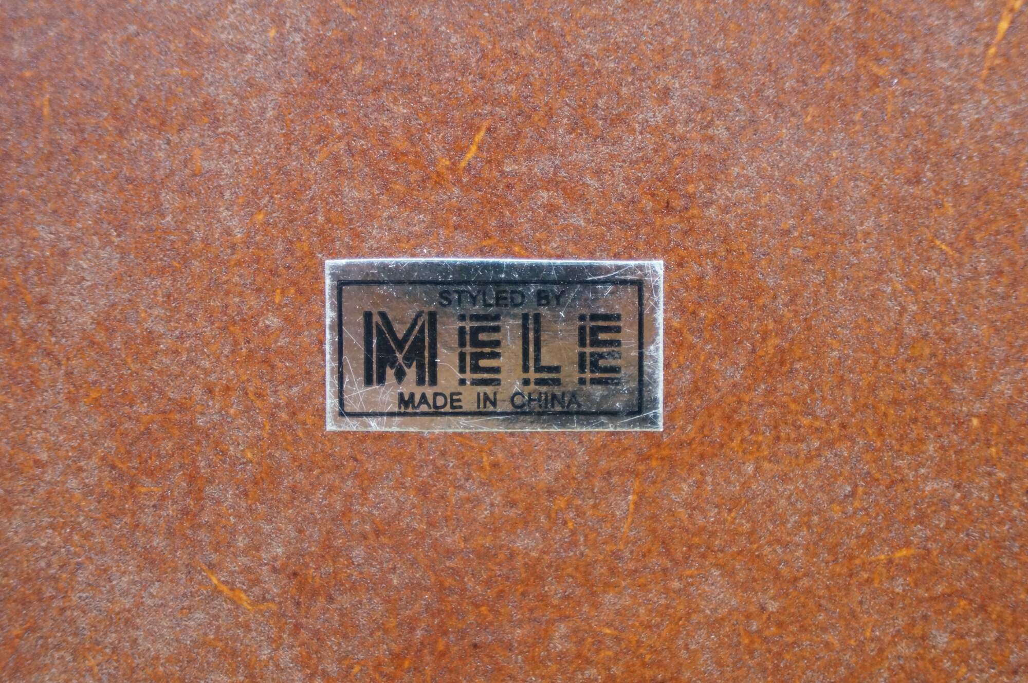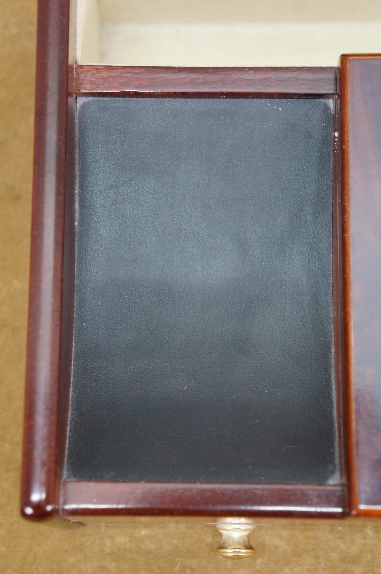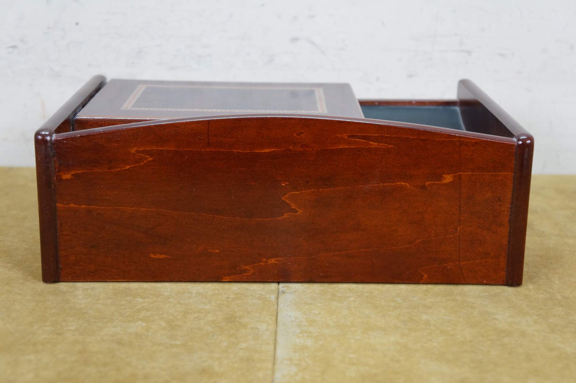 Vintage Mele & Co Davin dresser or desktop jewelry box / valet / organizer. Made of wood with a walnut and burl finish. Coin slide tray, 1 small section for loose jewelry / cufflinks, 1 large open section, a row of ring rolls, and an open area storage drawer slot.