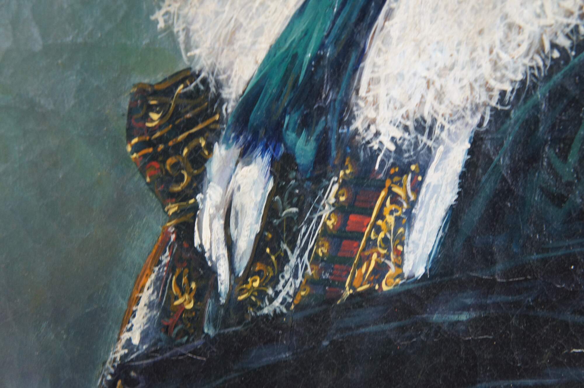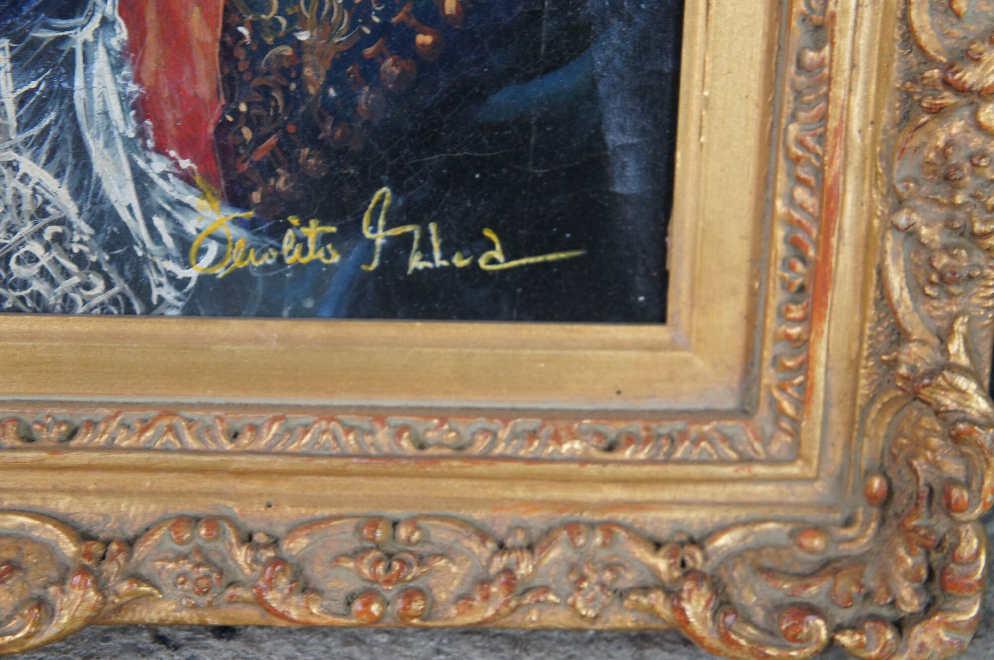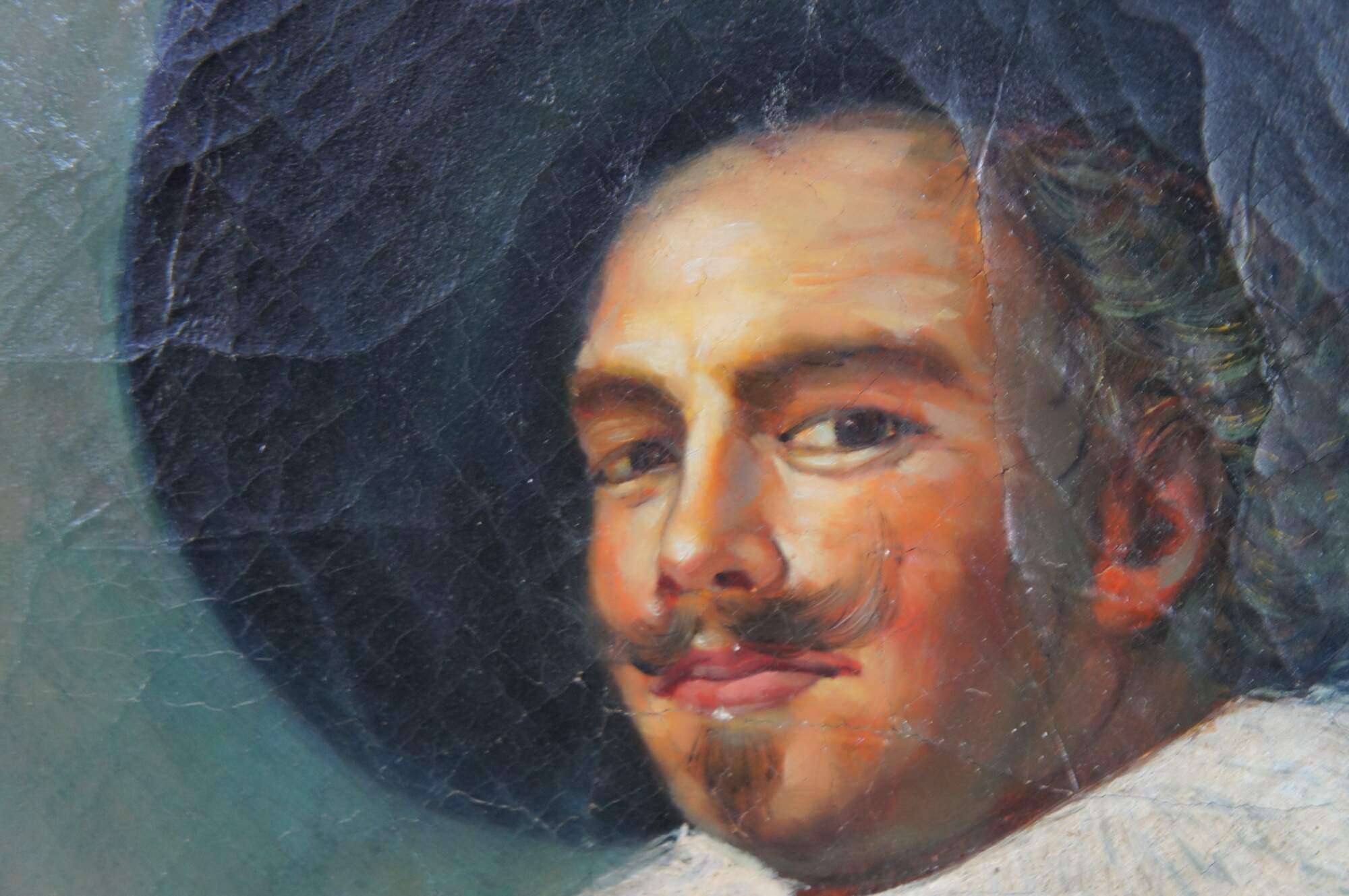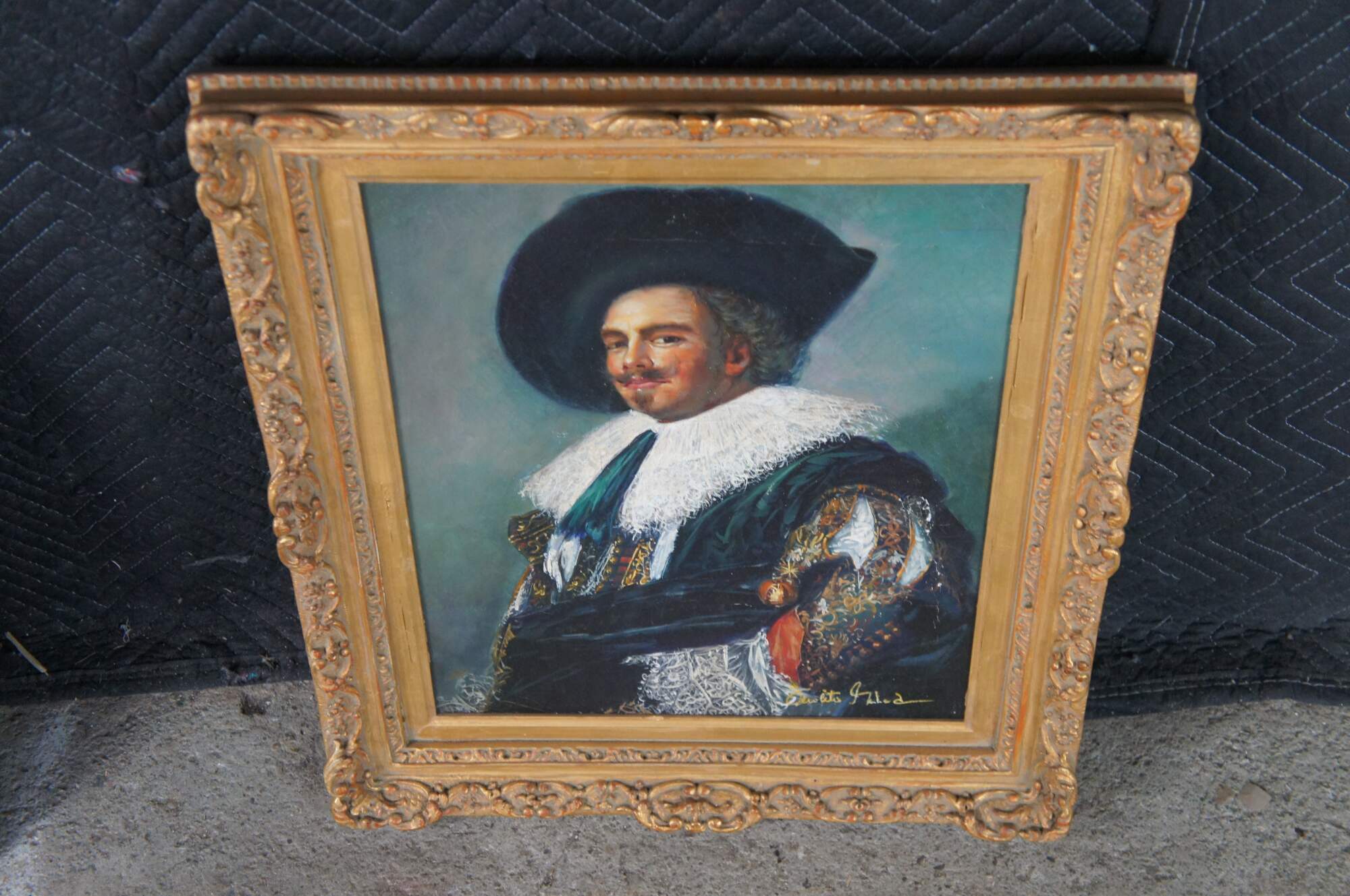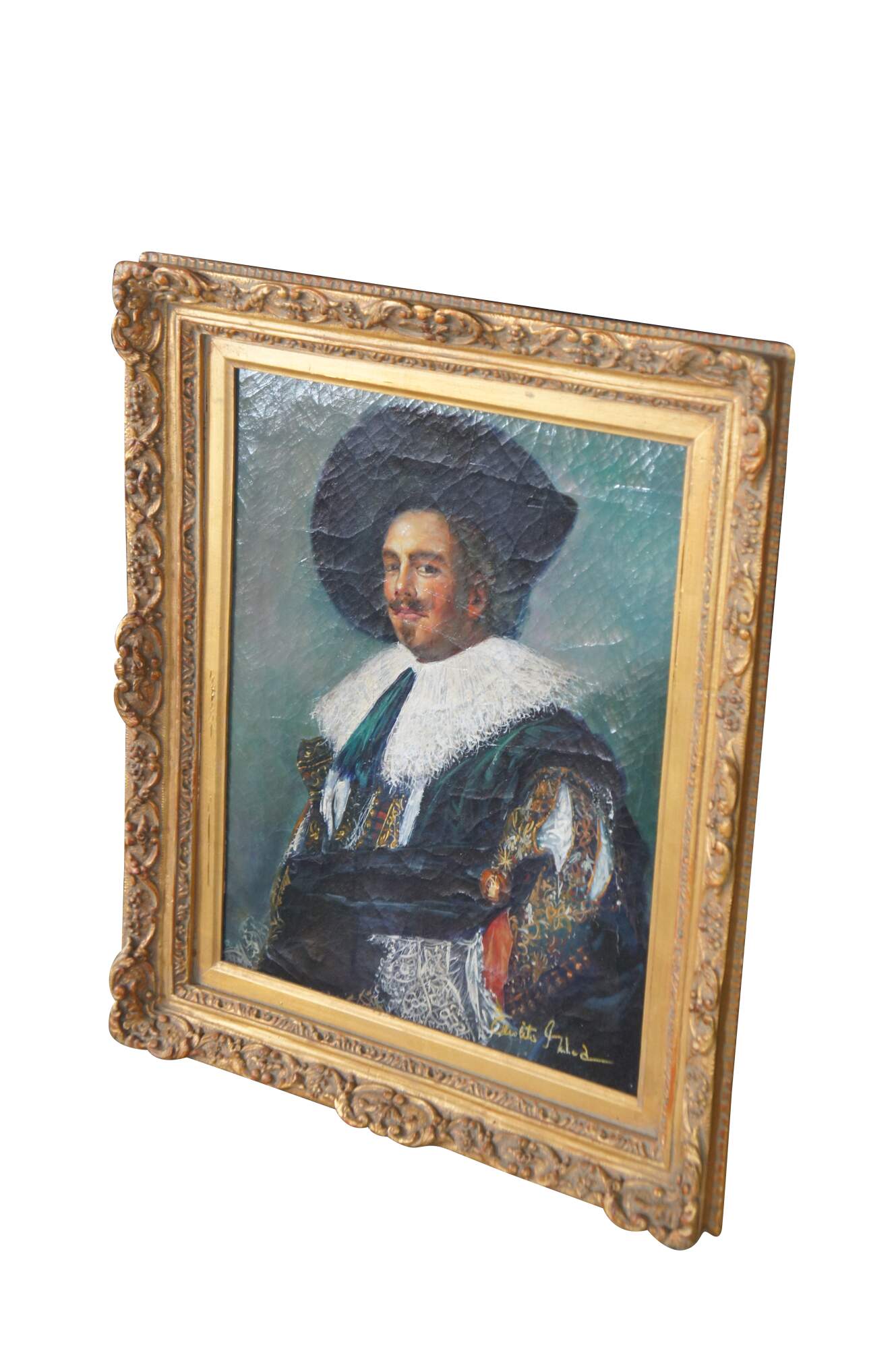 Contemporary school oil painting after the 1624 portrait The Laughing Cavalier by Dutch Golden Age painter Frans Hals. The painting is on a craquelure canvas to give the impression of age and signed lower right. The painting is ornately framed with a gold finish. Circa late 20th Century