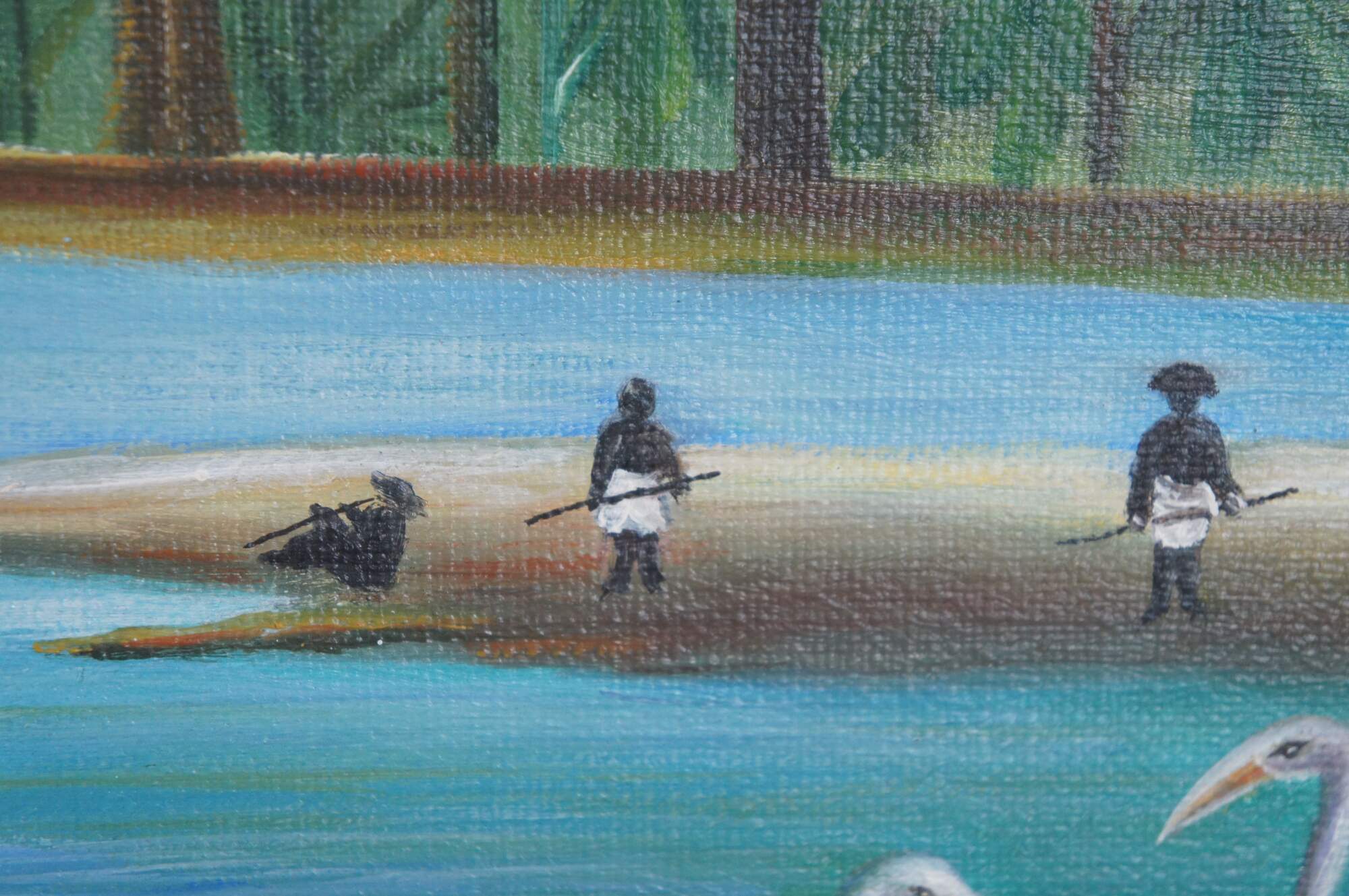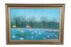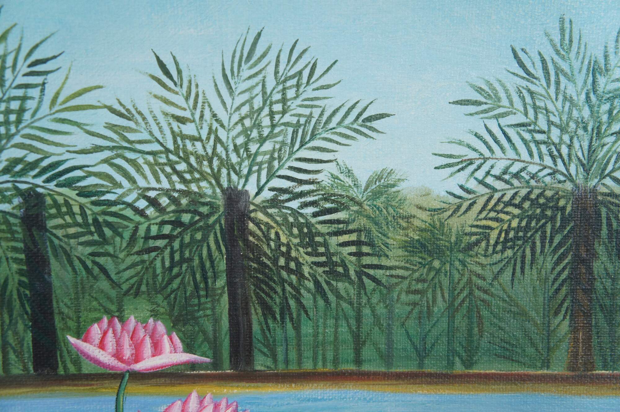 The Flamingoes is a painting by Henri Rousseau that was originally created in 1910. A tropical riverscape featuring flamingos, water lilies, and dense jungle foliage. This late 20th century contemporary school example has beautiful color and is framed in wood with a gold finish. The original painting is in a private New York Collection.