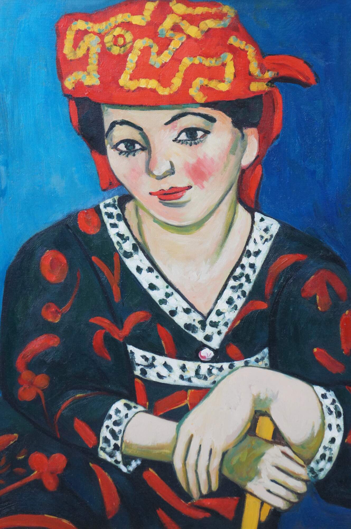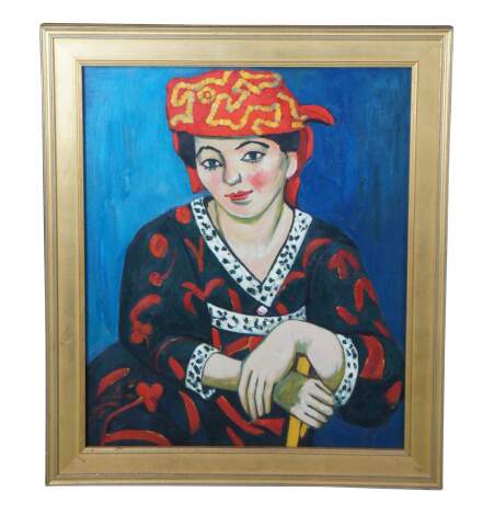 The Red Madras Headdress" (or Le Madras rouge), is a famous 1907 painting by the French artist Henri Matisse. The painting is currently housed in the Barnes Foundation in Philadelphia, Pennsylvania. This contemporary example was painted at the end of the 20th century, framed in hardwood with gold finish. The portrait depicts the artist's wife, Amélie Matisse, who modeled frequently for him