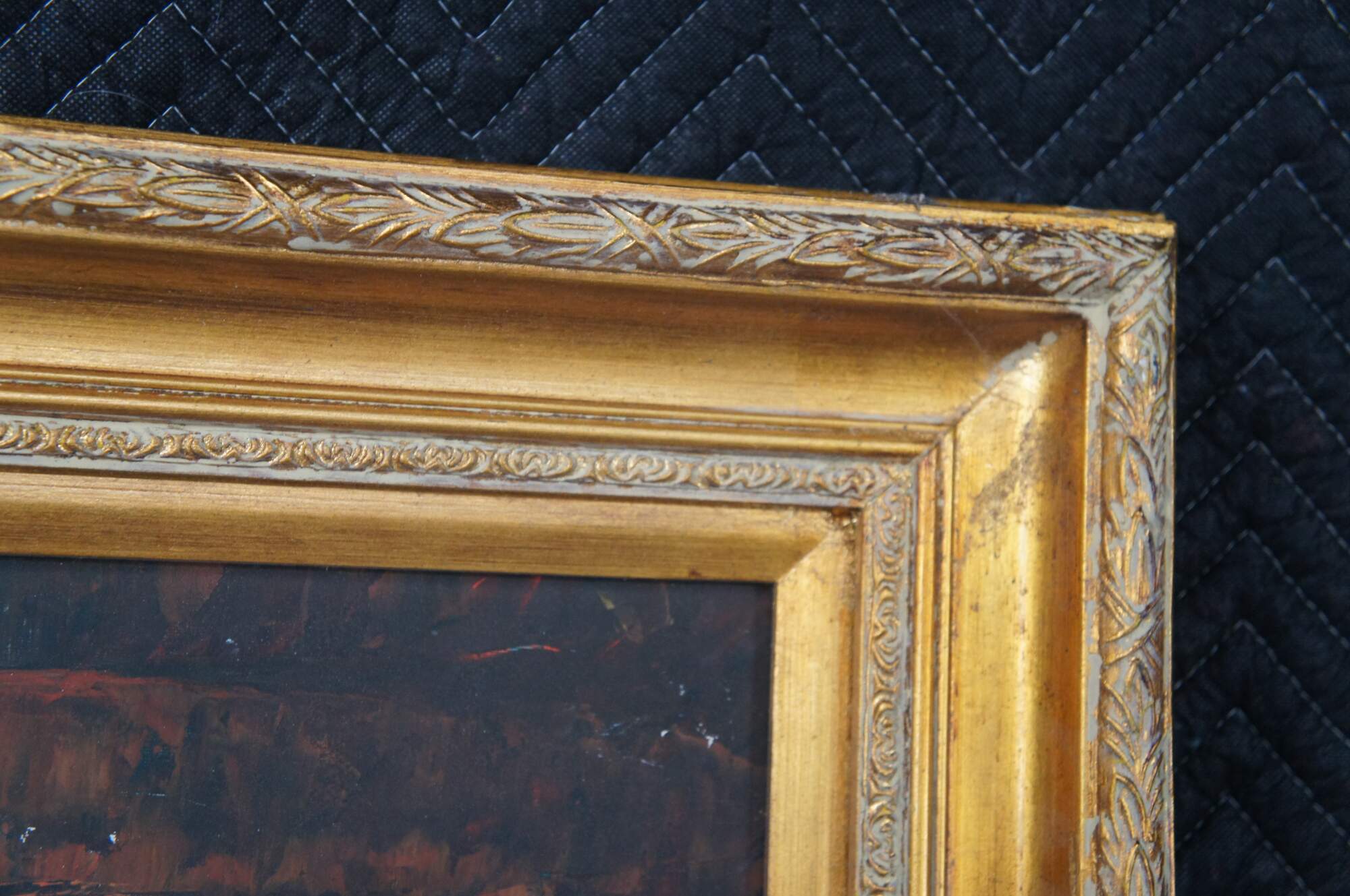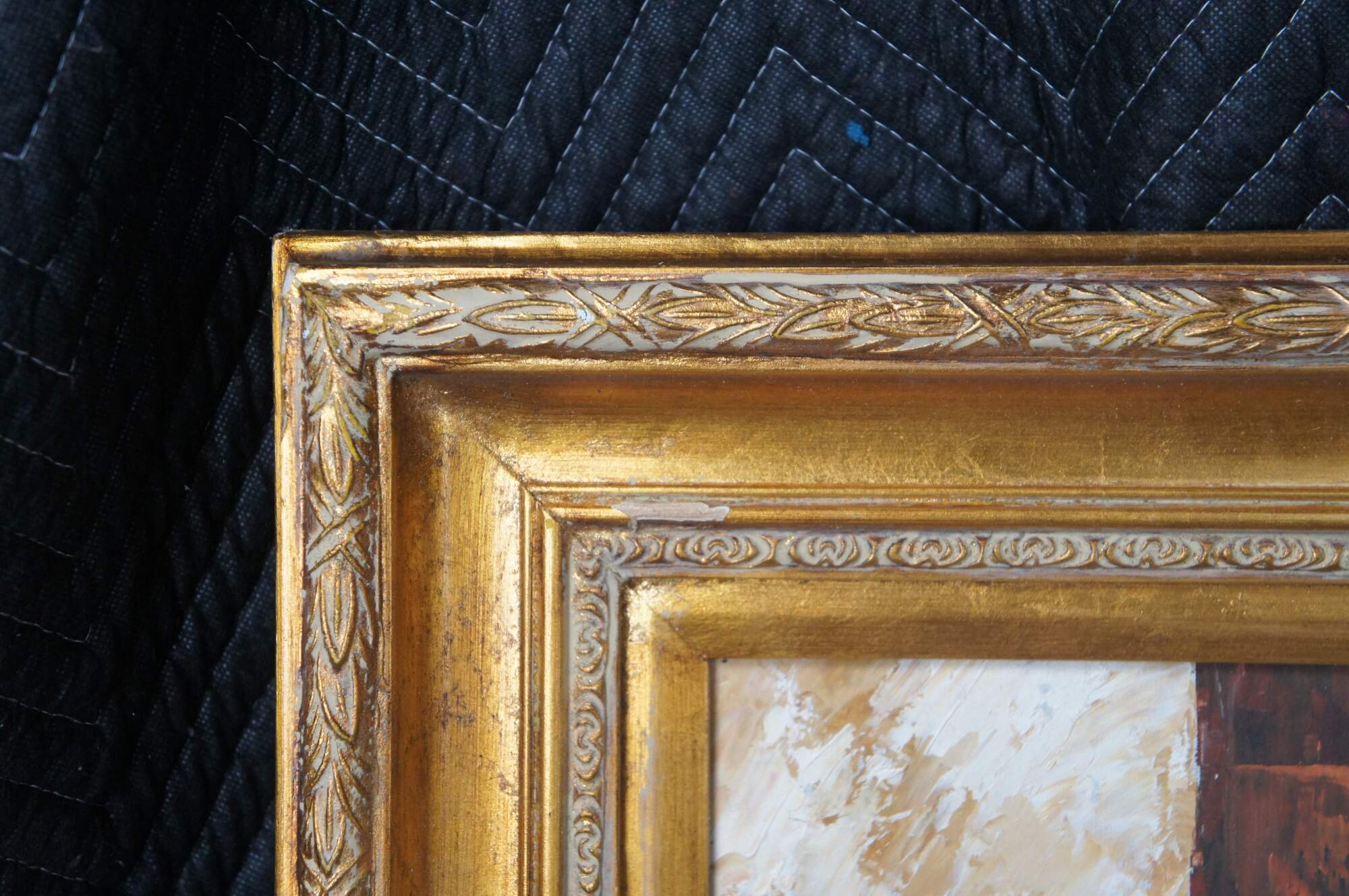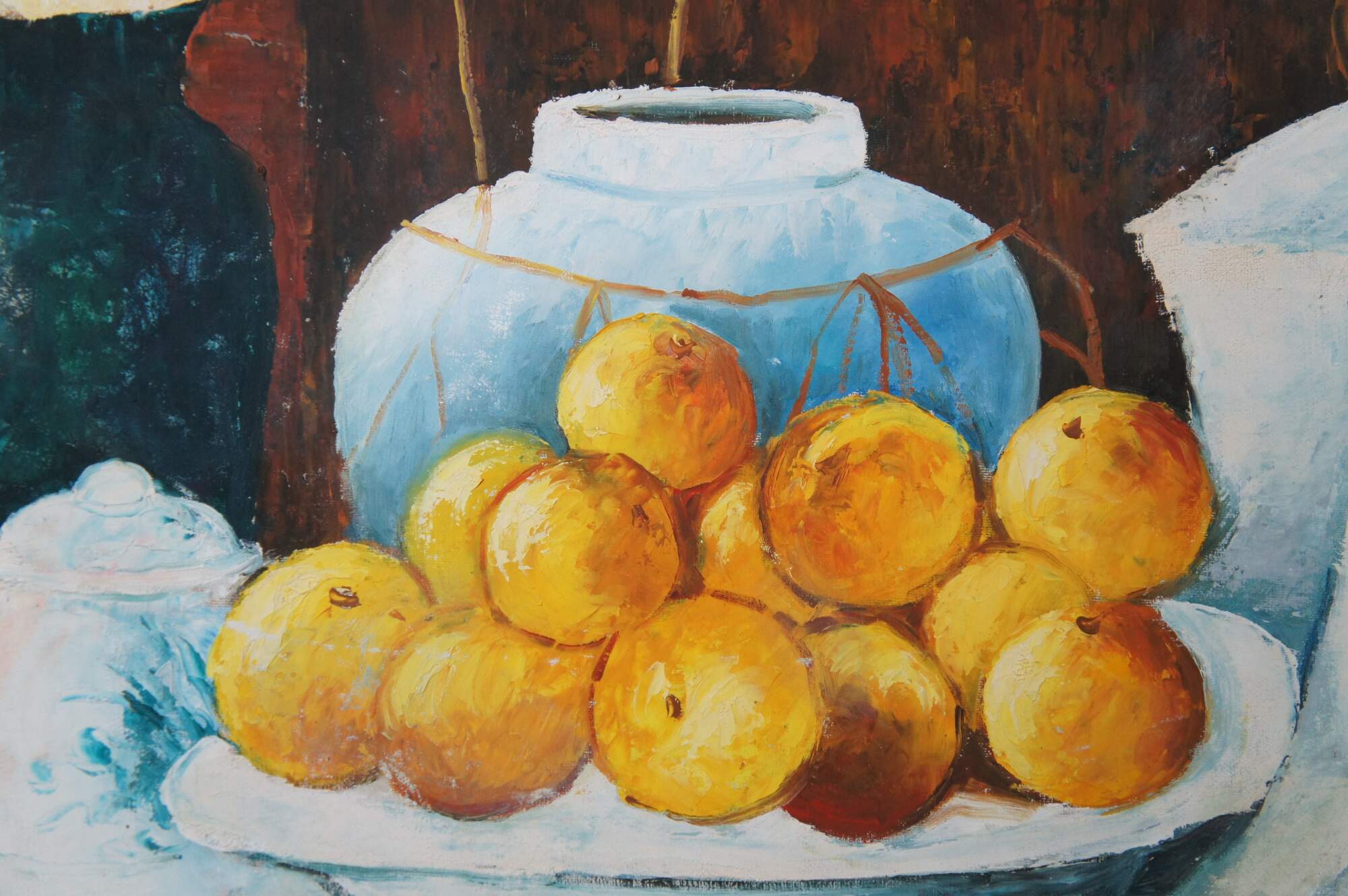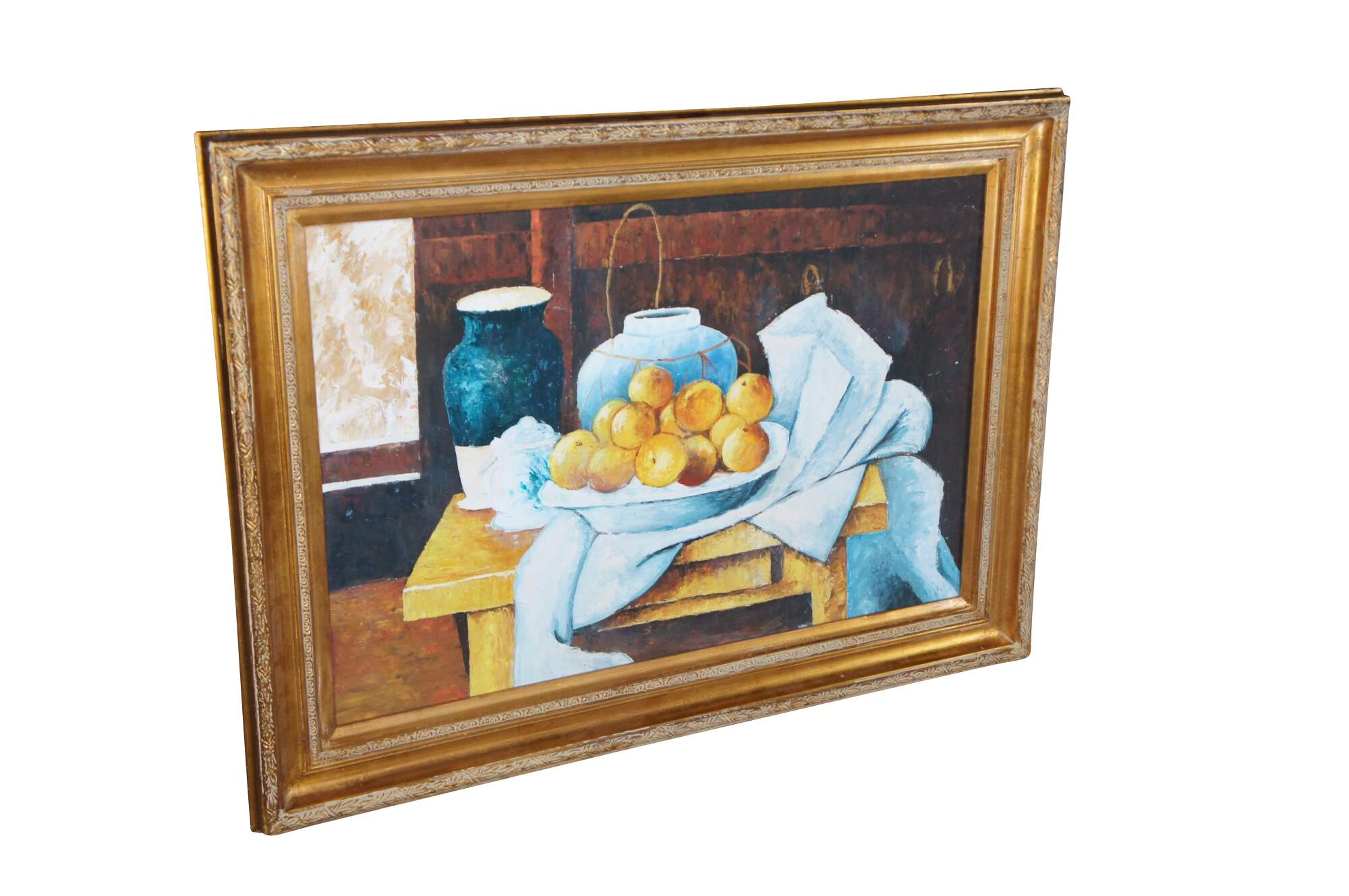Contemporary School oil painting After Paul Cezanne's Still Life with a Chest of Drawers (1883/87). The original is currently on display at the Neue Pinakothek in Munich, Germany. Features a bowl of oranges resting on a table with two vases in front of a Bureau. The canvas is framed in Louis XV manner with a gold finish.