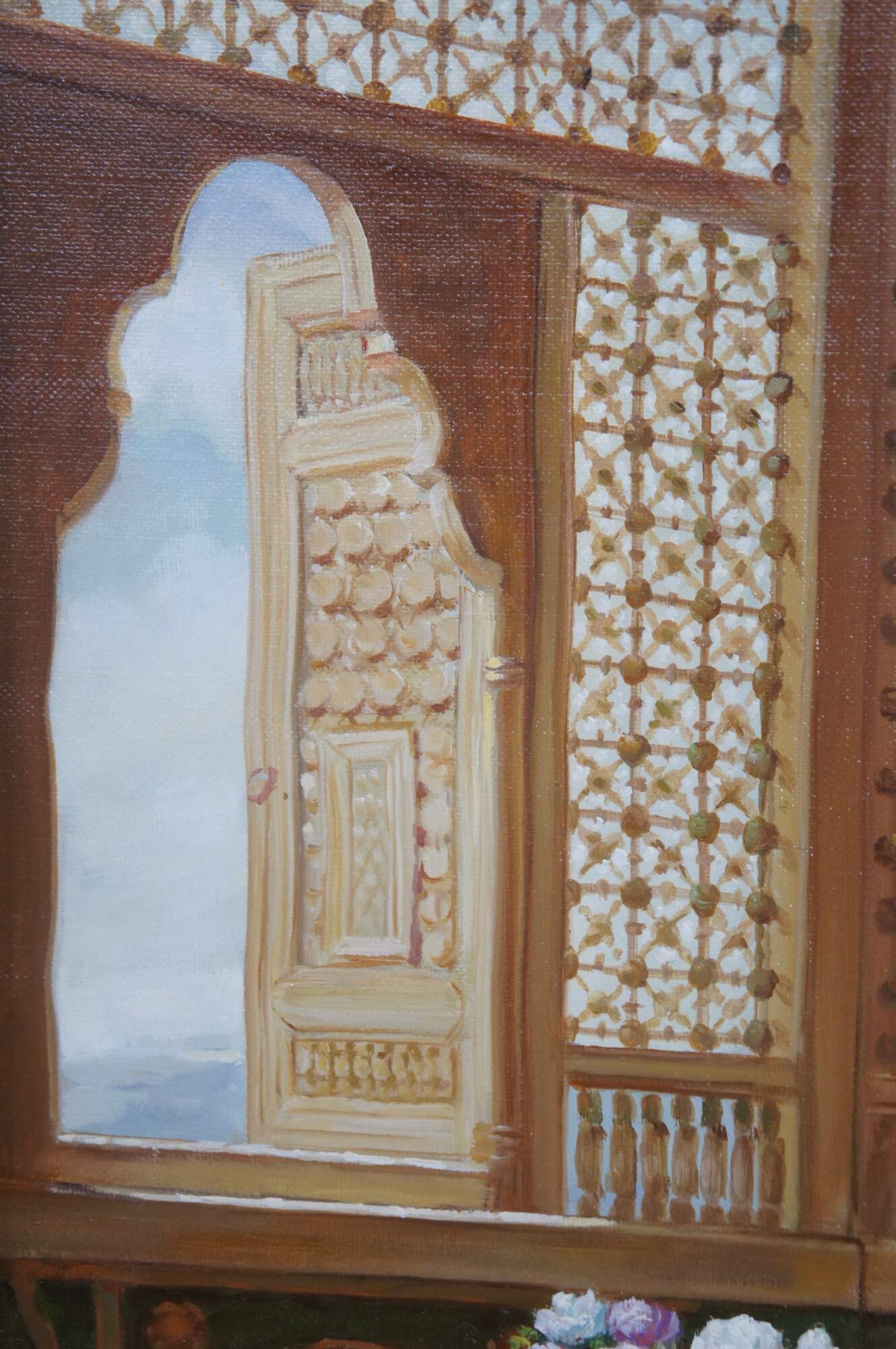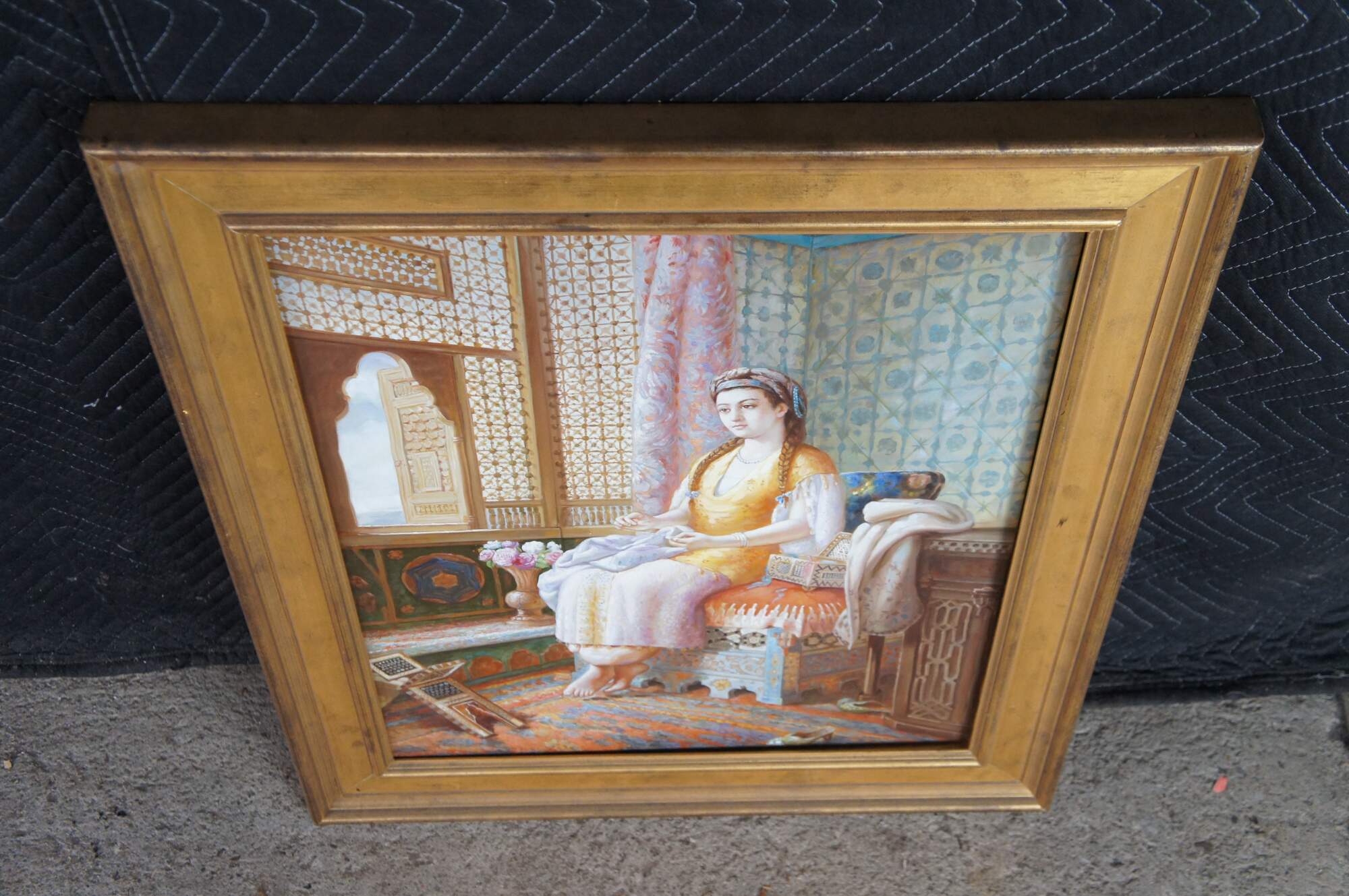Dreaminess" was created by the British artist Dorofield Hardy (1882–1920). The artwork depicts a woman in traditional Ottoman-style dress seated in an ornately decorated room embroidering.. The setting features classic Orientalist elements, including intricate lattice windows, a wool rug, tiled windows and colorful furniture. This contemporary example was painted at the end of the 20th century. Framed in wood with a gold finish.