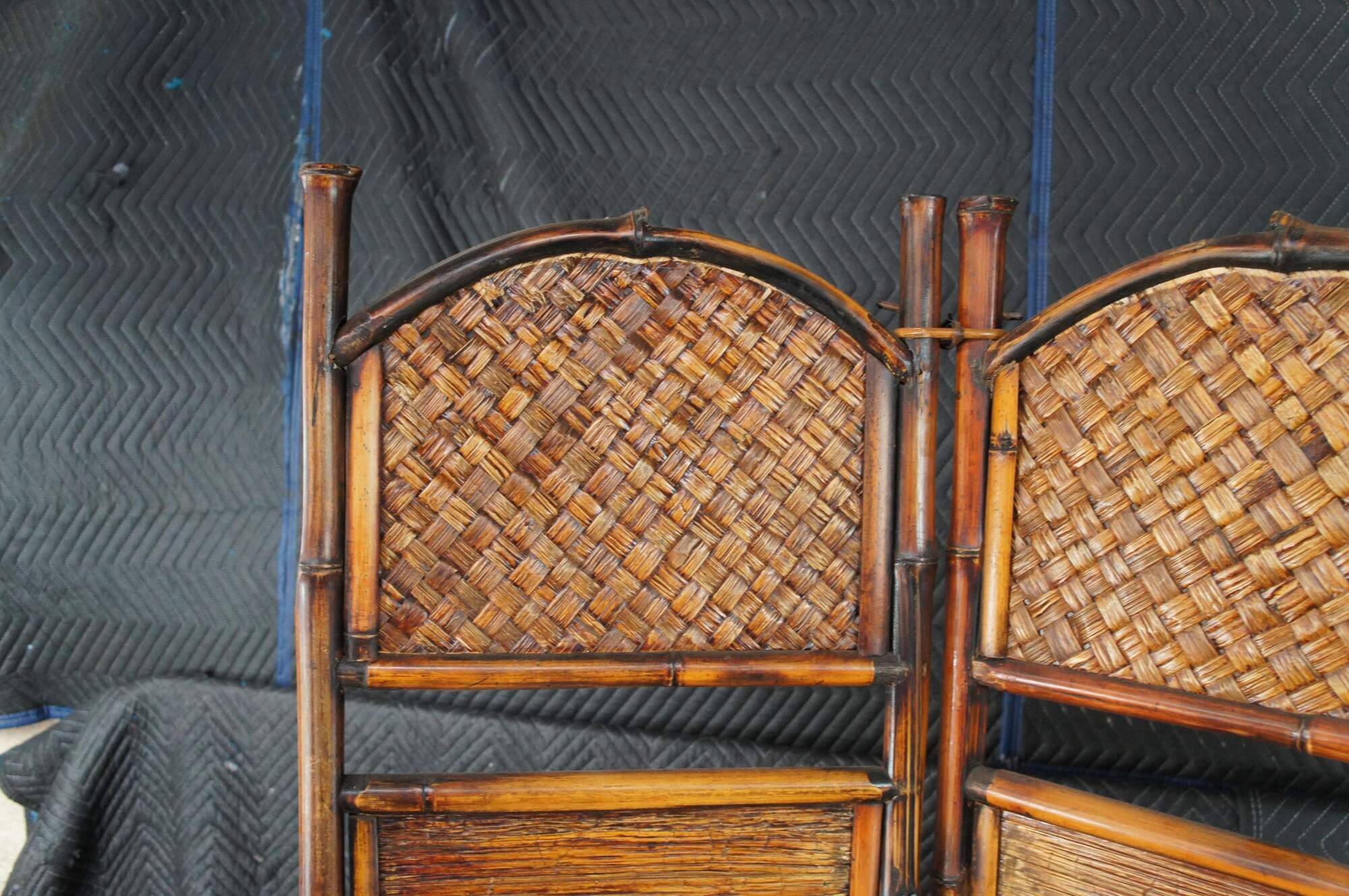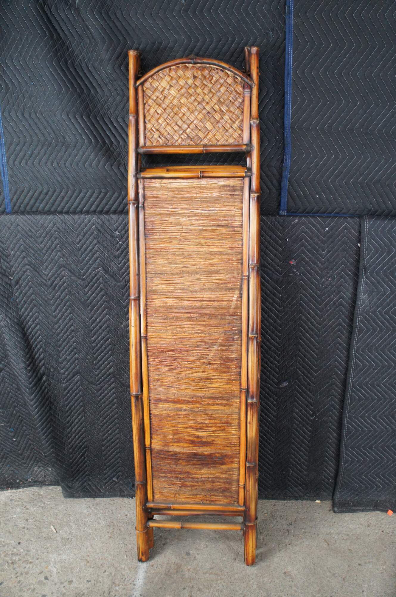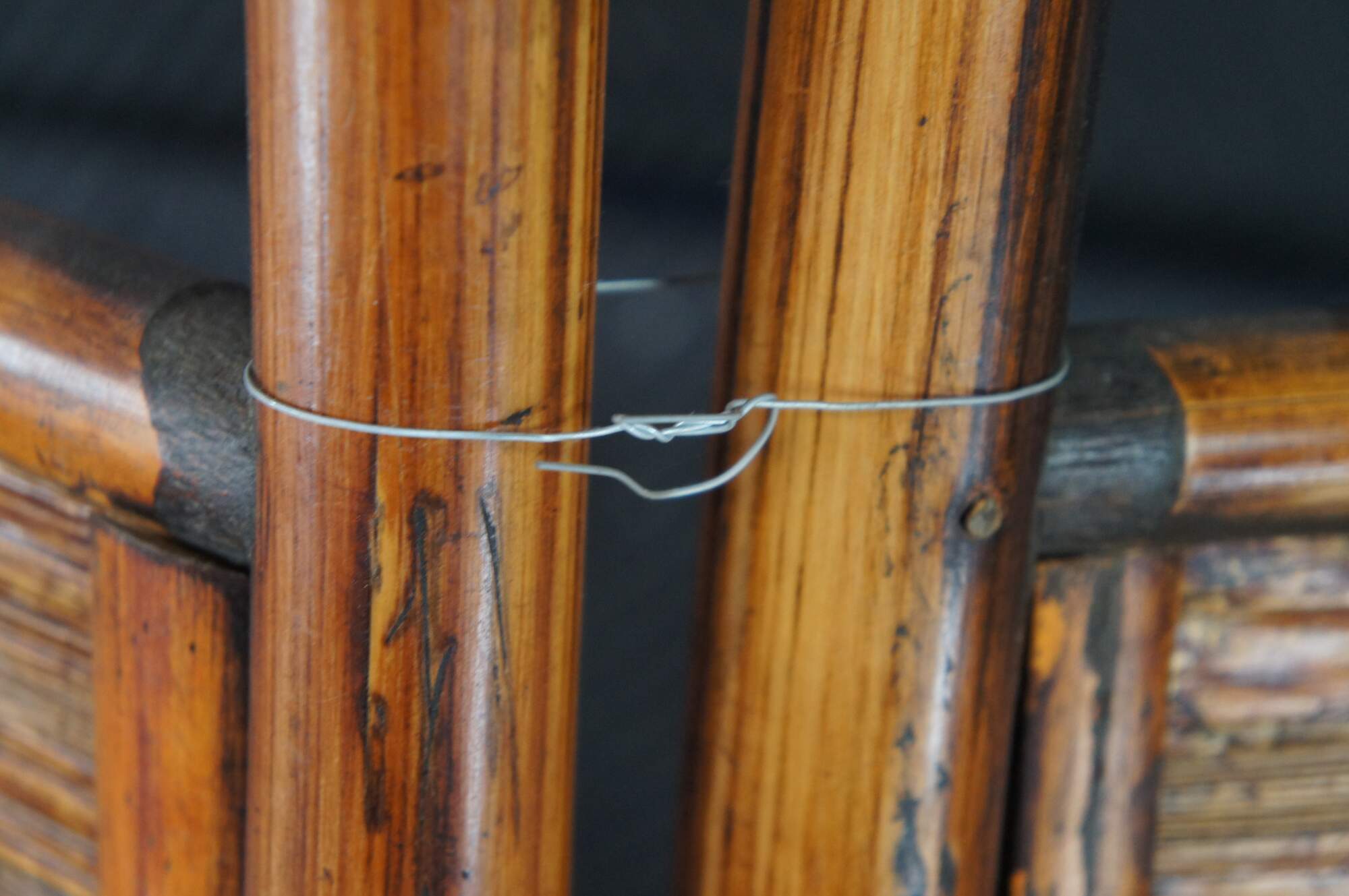 Good Condition, one of the split reed pieces connecting the bamboo is missing and was replaced with a metal wire