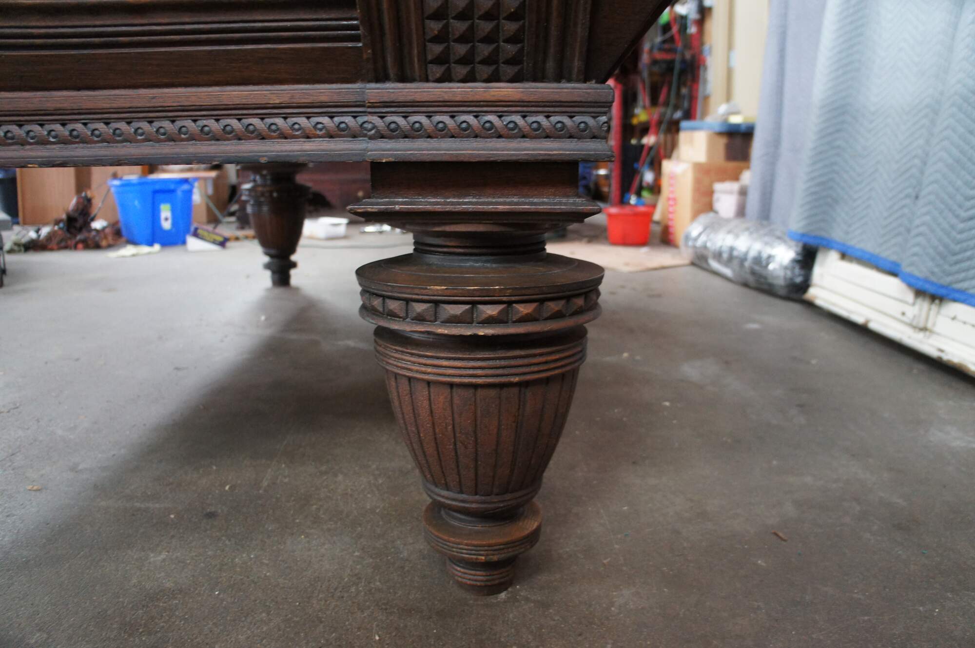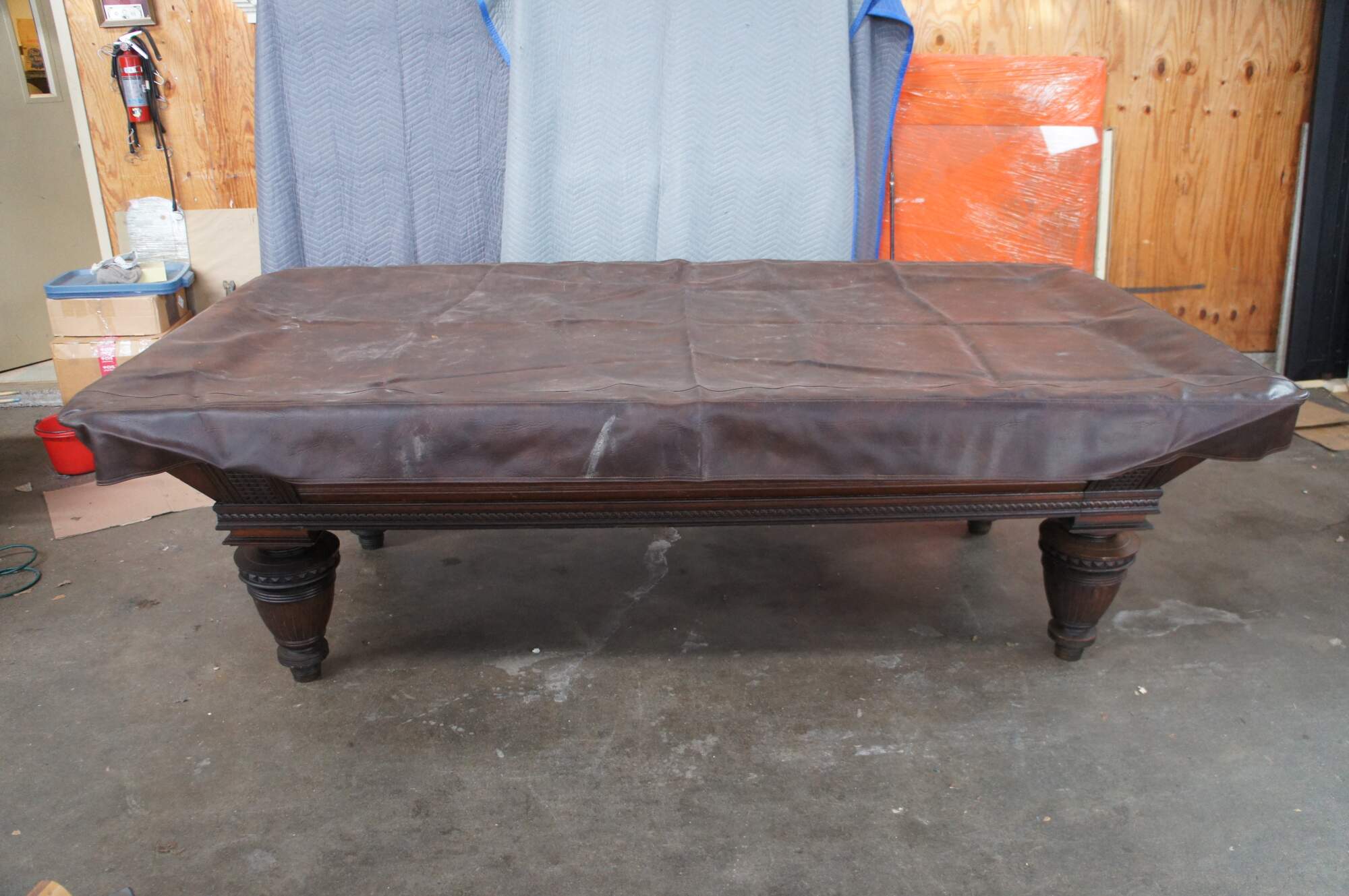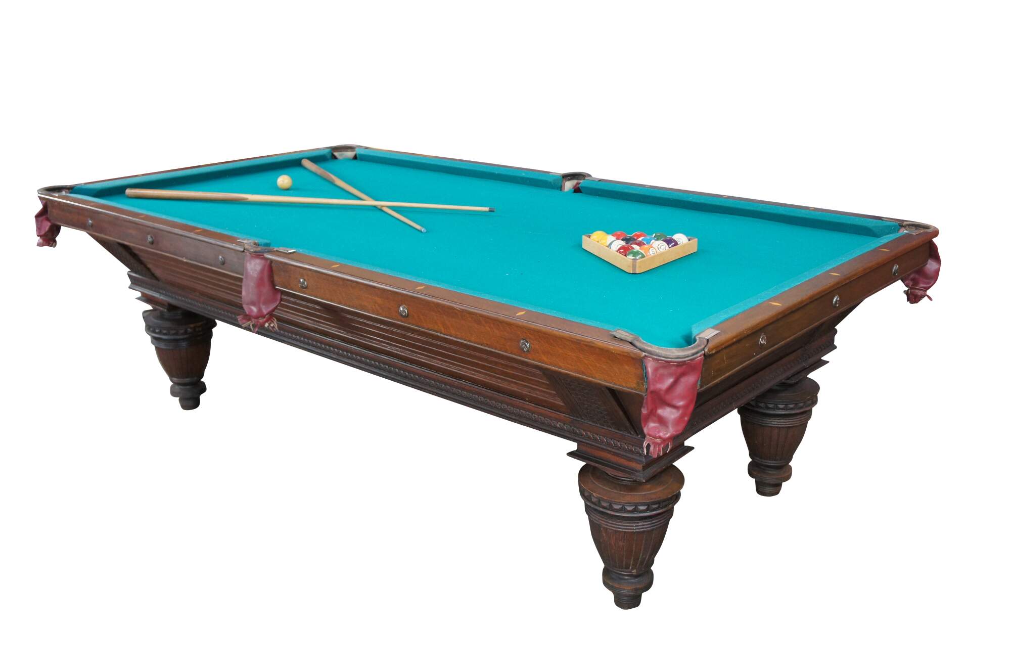 Antique Brunswick Balke Collender Improved Union League Pool Table, Circa Late 1894s to early 1900s, #34026. The Improved Union League Design drew inspiration from Jacobean and Egyptian Styling. Made from oak and quartersawn oak with carved molding over fluted and turned legs, with square caps. The table has three piece Vermont 1" slate, Monarch Cushions, red leather or interlaced leather pockets, some original and several other sticks, Belgian made Amarith balls and additional accessories. Includes table cover