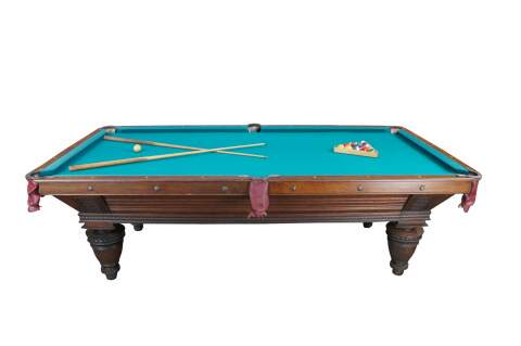 Few billiard tables present such an artistic appearance as the "Improved Union League." The legs are handsomely fluted and turned, with square caps and Egyptian moldings. There are finely manufactured brackets on the sides of the union with the head blocks, while moldings running along the sides form a capital foil to the polished woodwork. An elegantly designed frieze in the prevailing Egyptian style completes the decorative part of the table and gives it a splendid finish. The entire workmanship shown in the "Improved Union League" is of the highest order of merit and the table has met with the greatest appreciation in all parts of the country. It is perfectly constructed, thoroughly first class in all its appointments, and makes an agreeable addition to either a private residence or the most exclusive and aristocratic club house in the world.