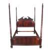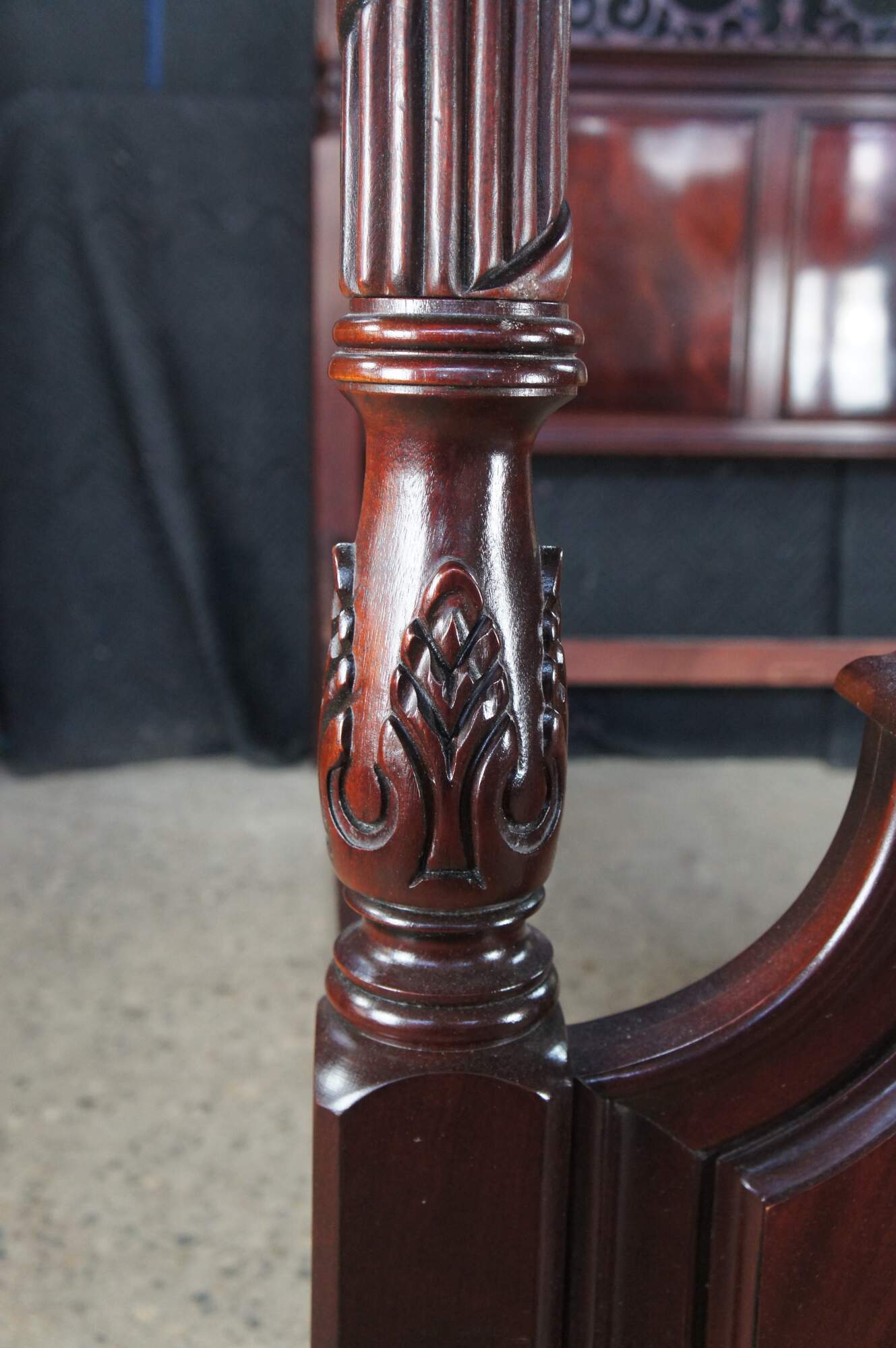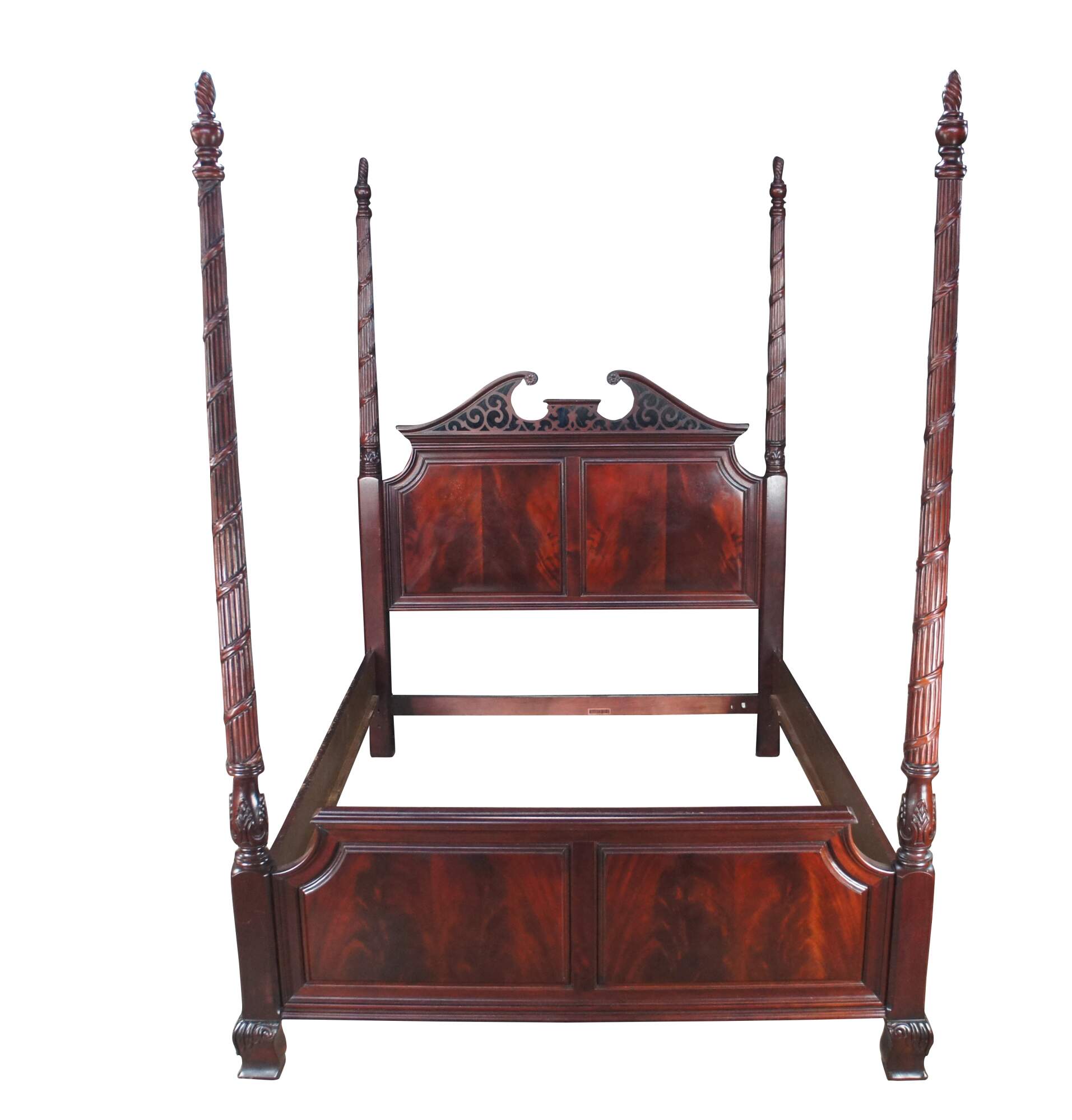 Vintage Thomasville English Chippendale / Georgian style king-size poster bed. Made from mahogany featuring a pierced / reticulated fretwork design with serpentine open pediment, flame grain panels, and tall fluted posts with acanthus accents