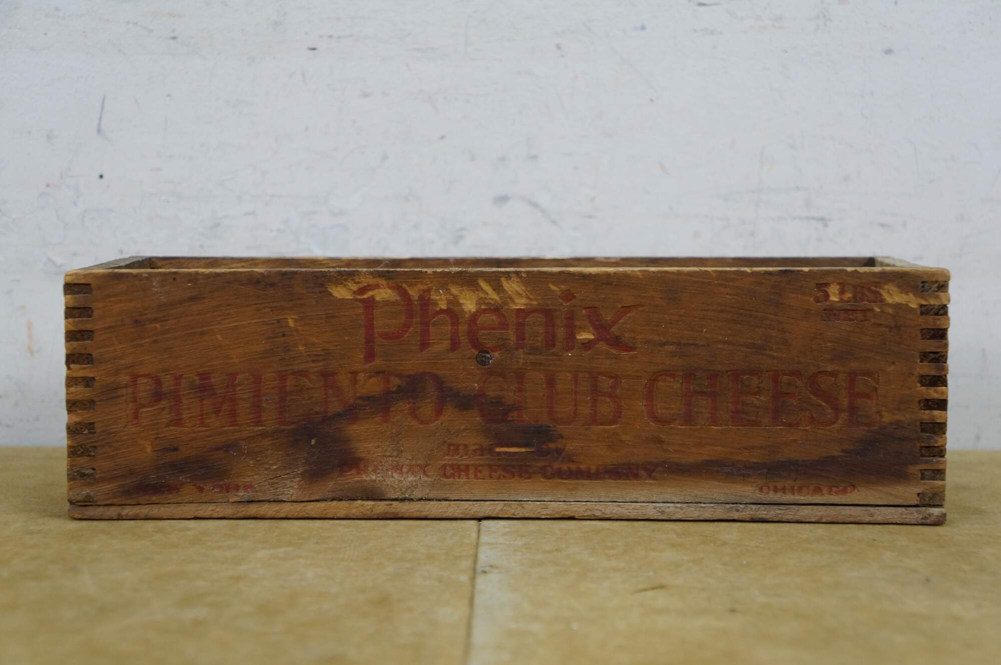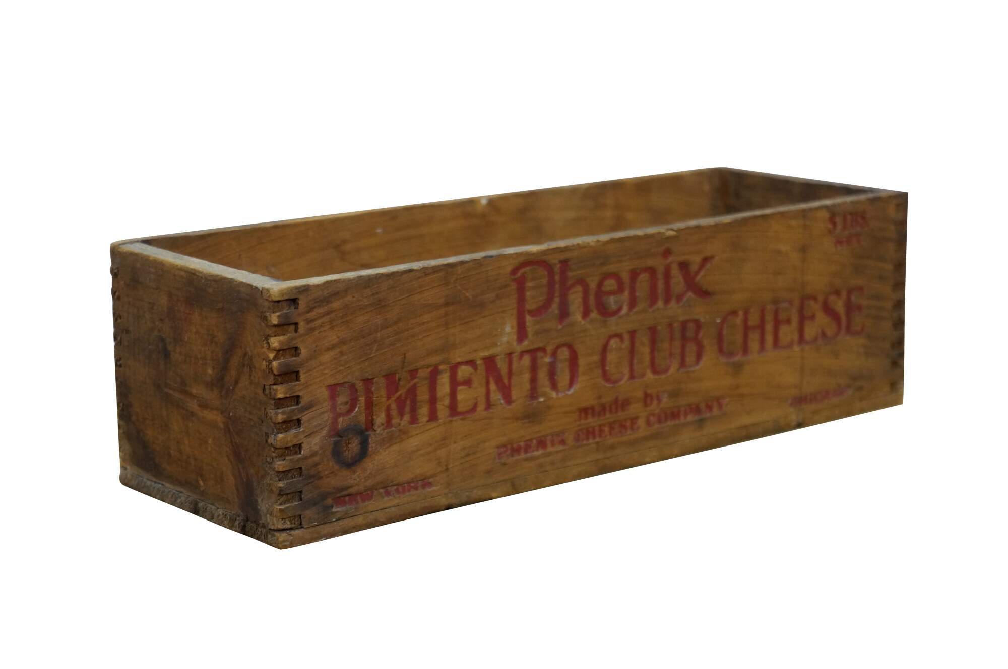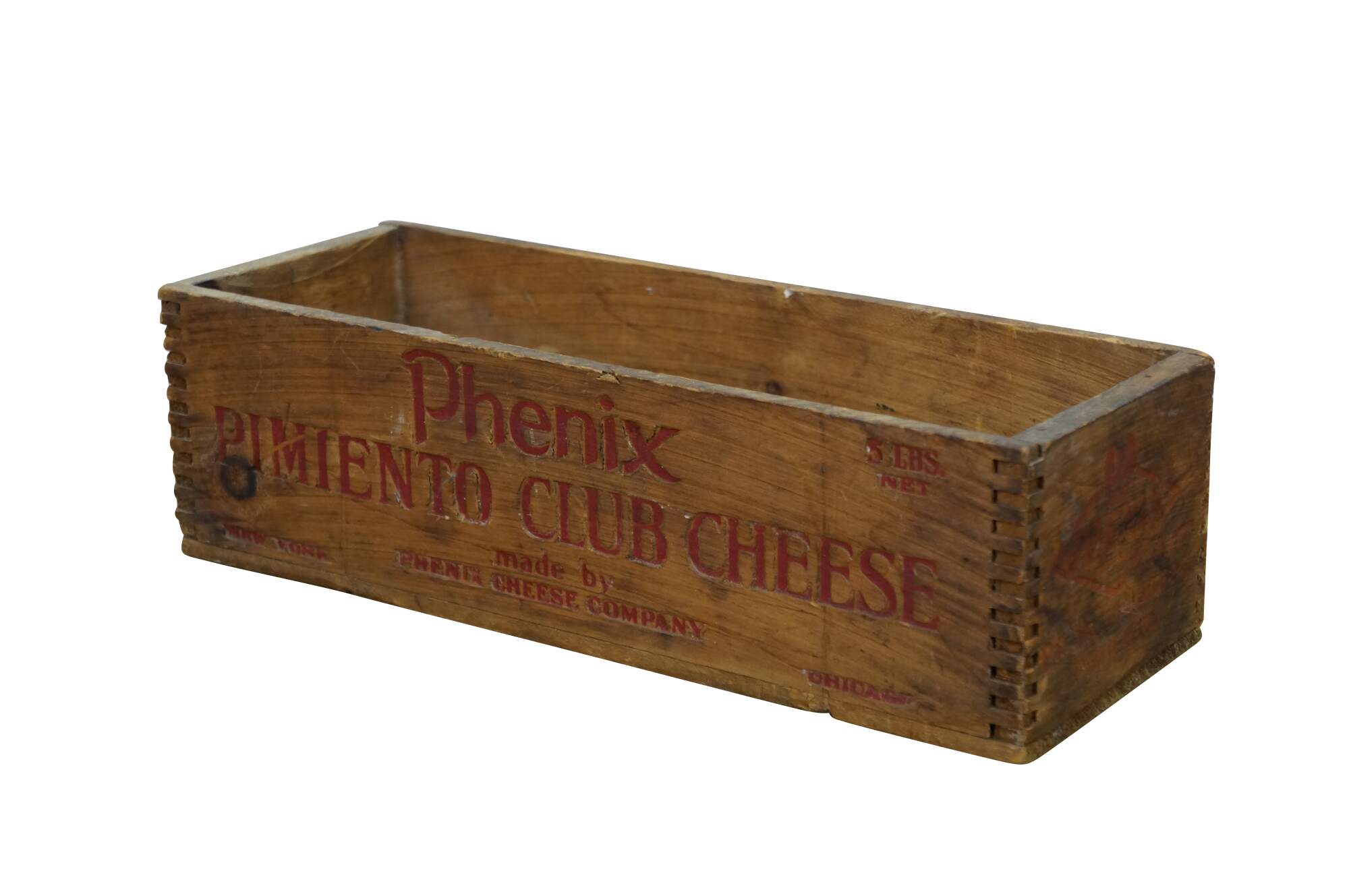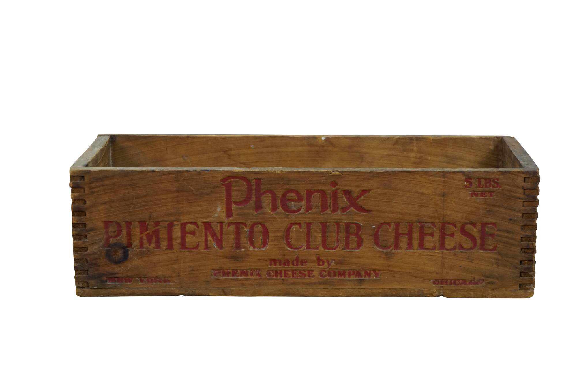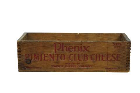 Vintage Phenix Pimiento Club Cheese wooden crate, formerly used to transport 5 pounds of cheese produced by the Phenix Cheese Company.� Constructed with dovetailed edges for durability.� Phenix was later acquired, becoming part of the Kraft-Phenix Cheese Corporation.