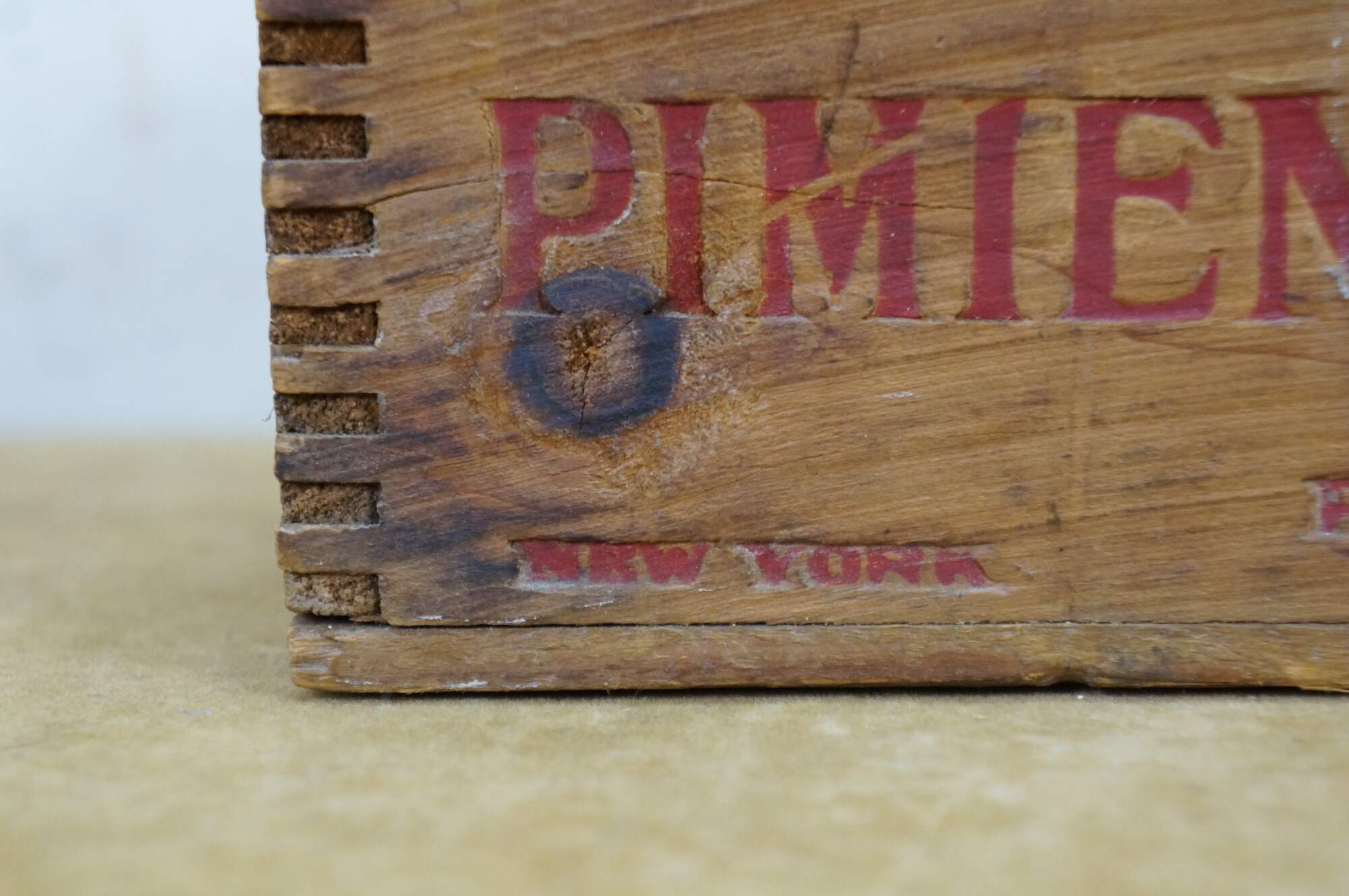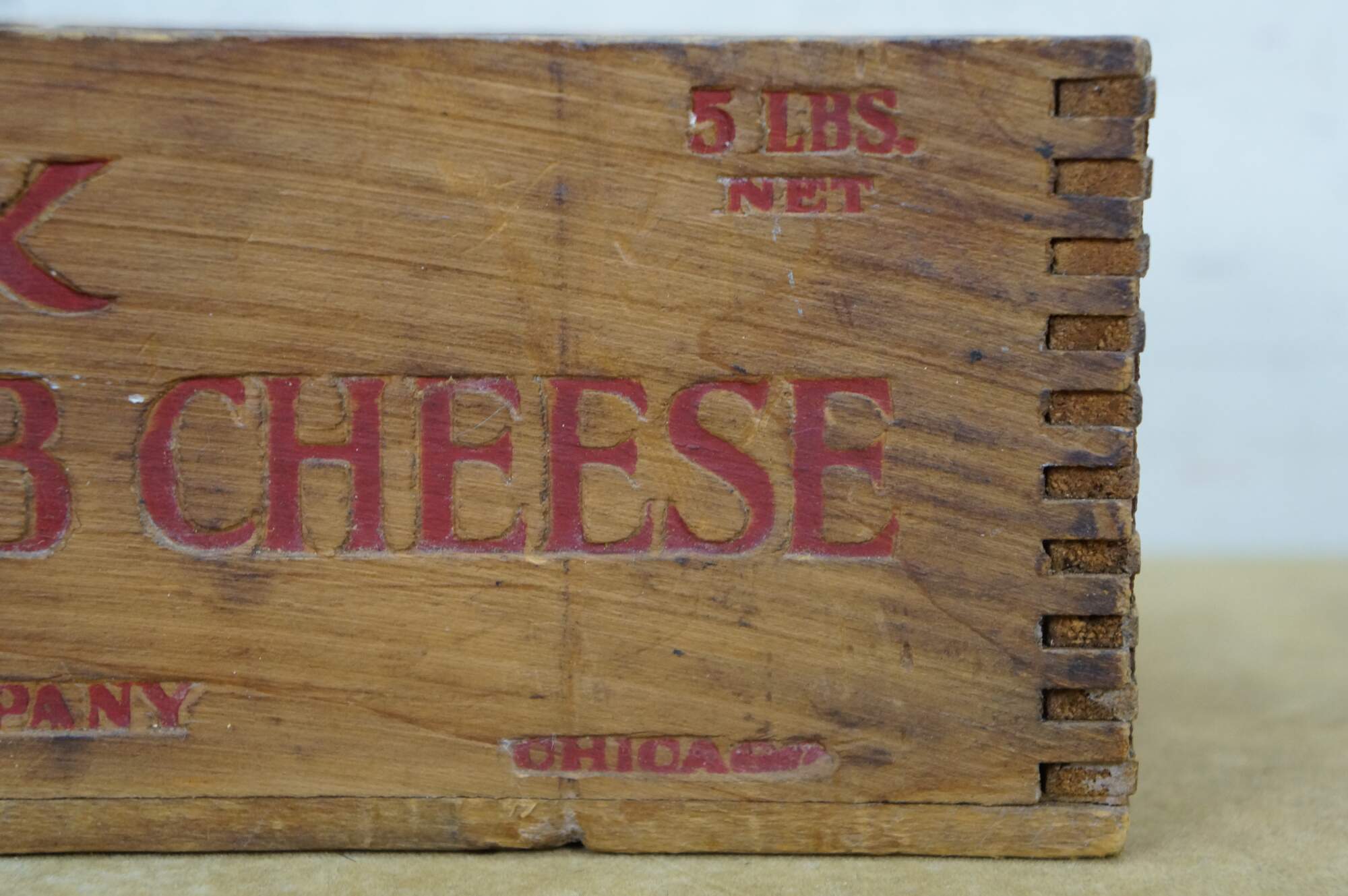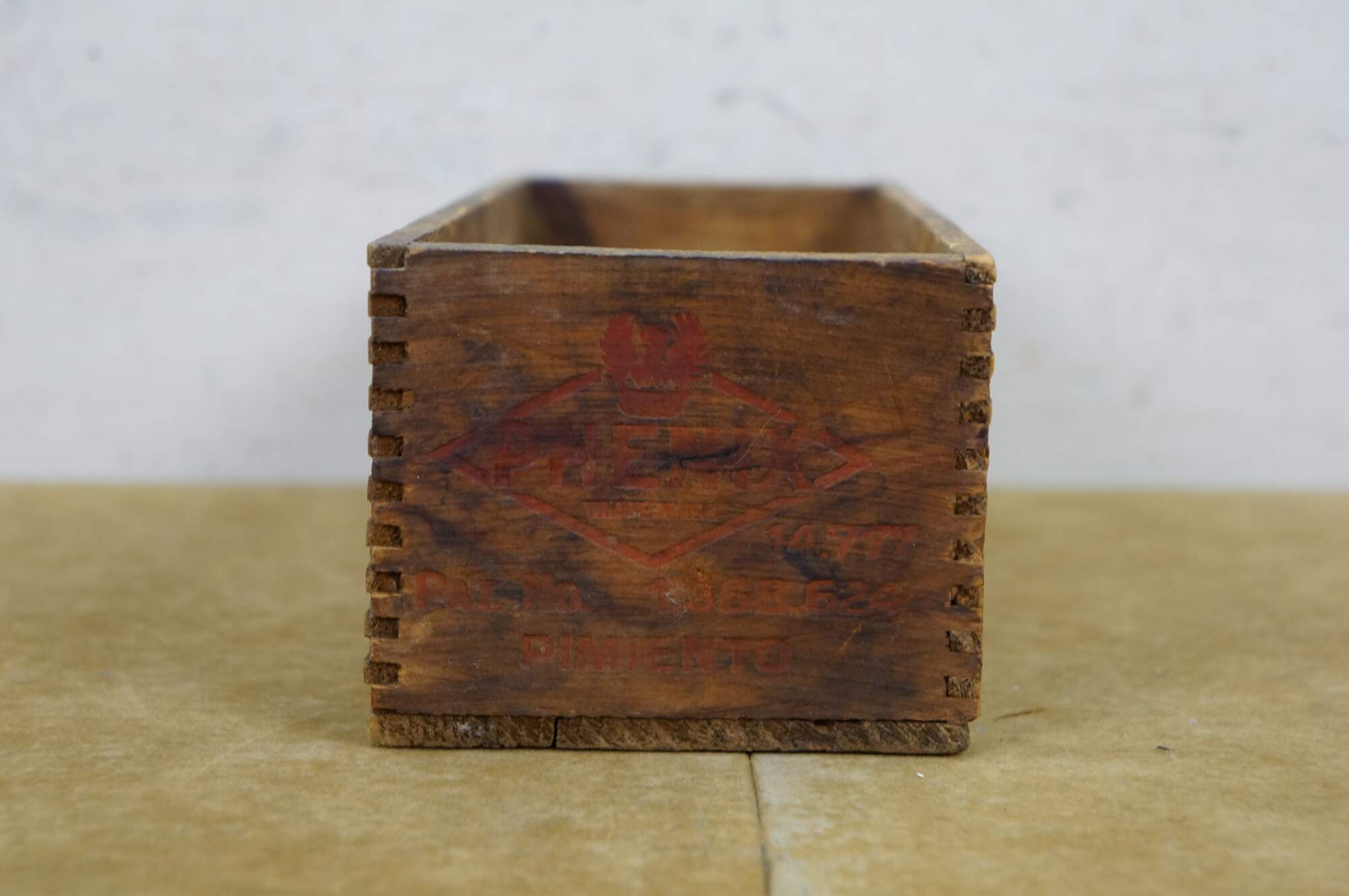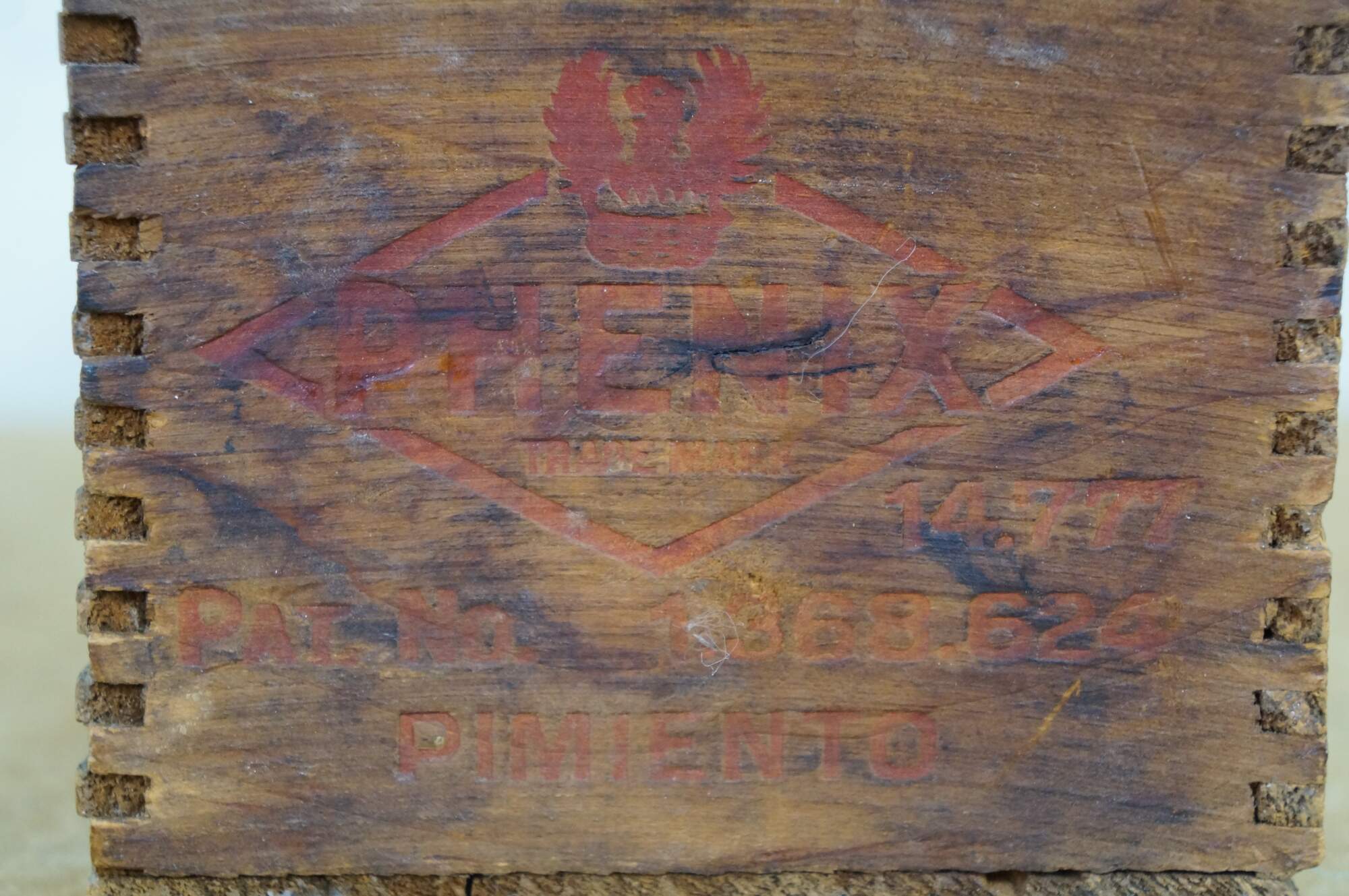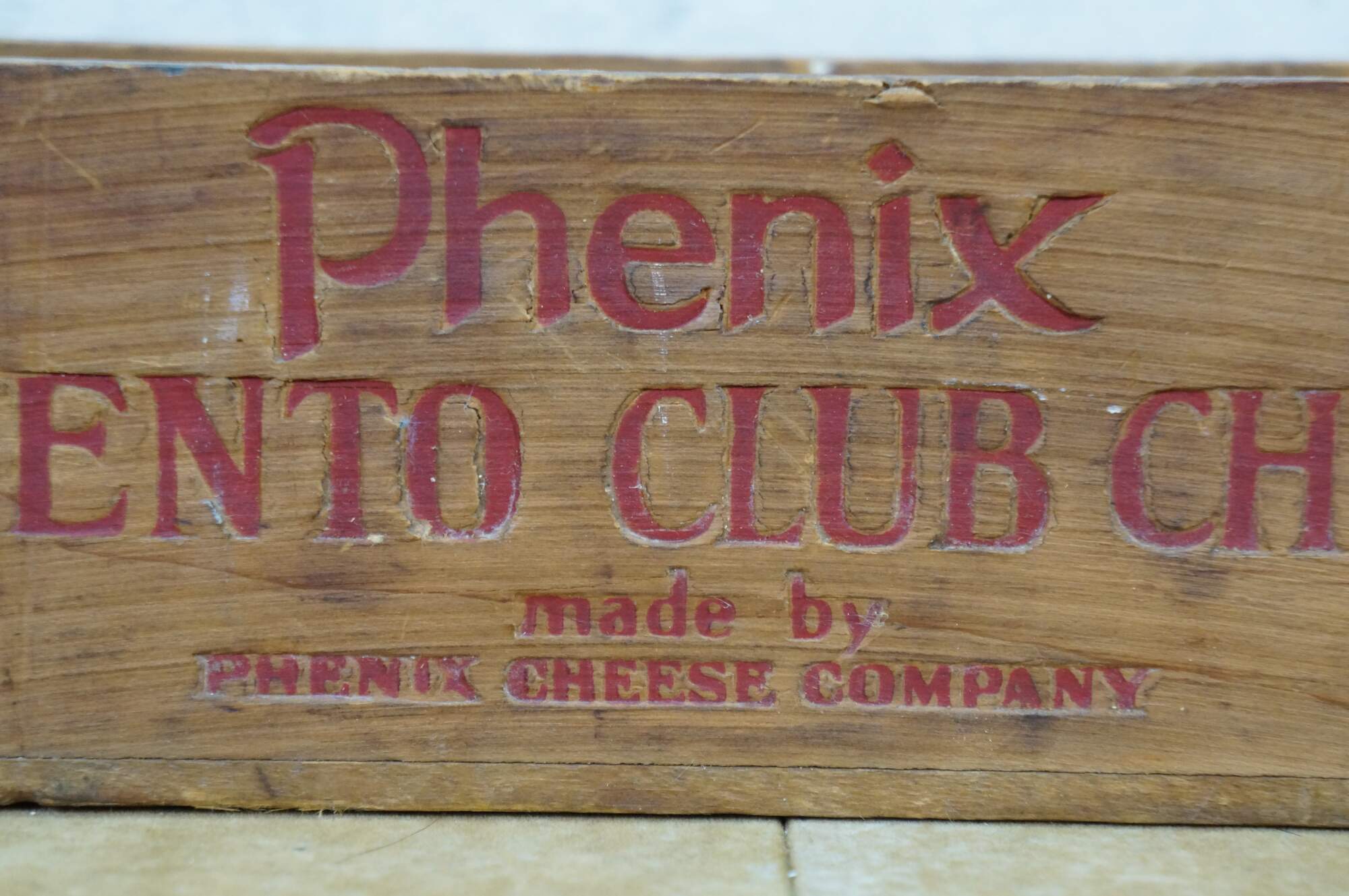 Vintage Phenix Pimiento Club Cheese wooden crate, formerly used to transport 5 pounds of cheese produced by the Phenix Cheese Company.� Constructed with dovetailed edges for durability.� Phenix was later acquired, becoming part of the Kraft-Phenix Cheese Corporation.