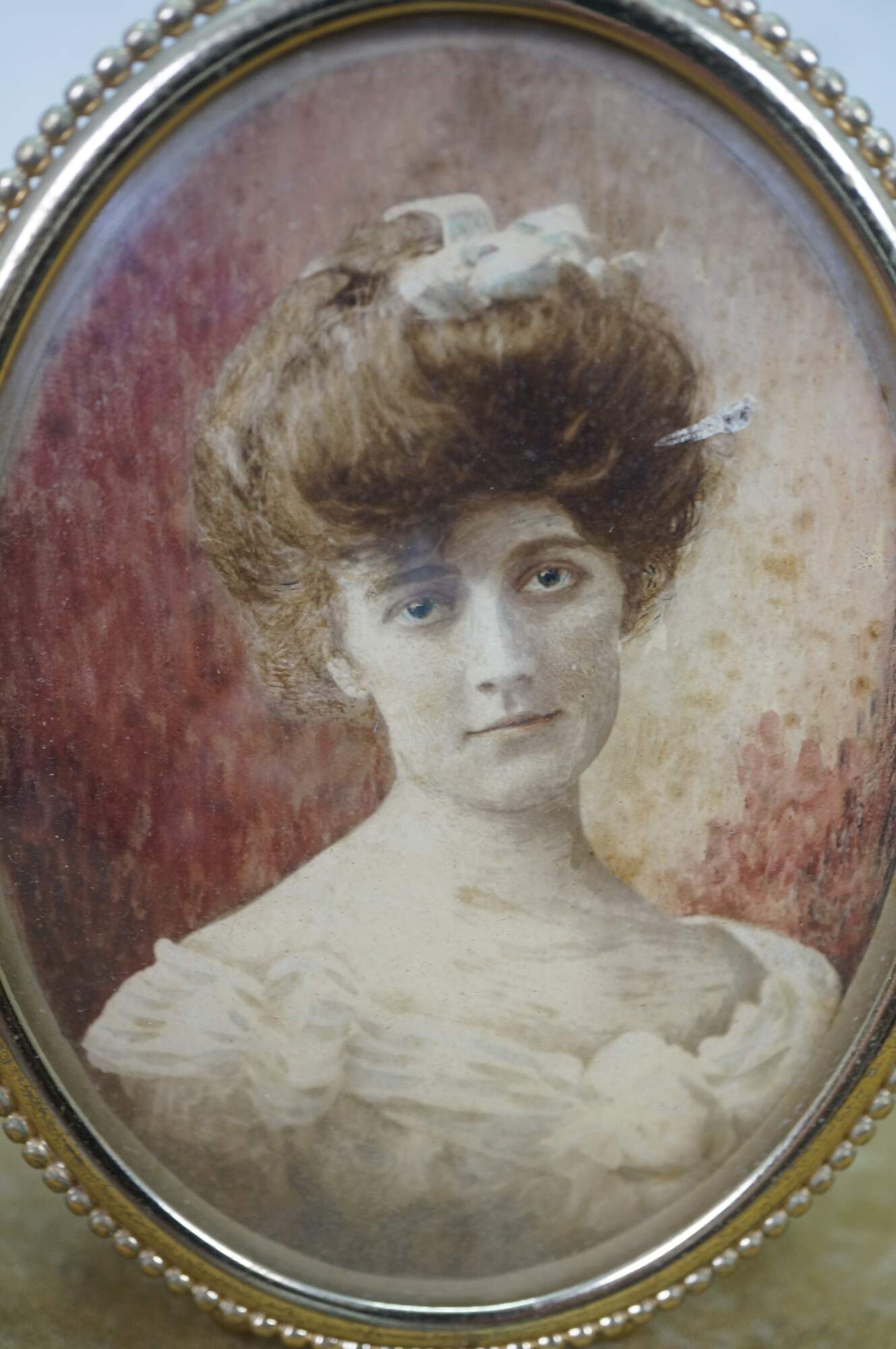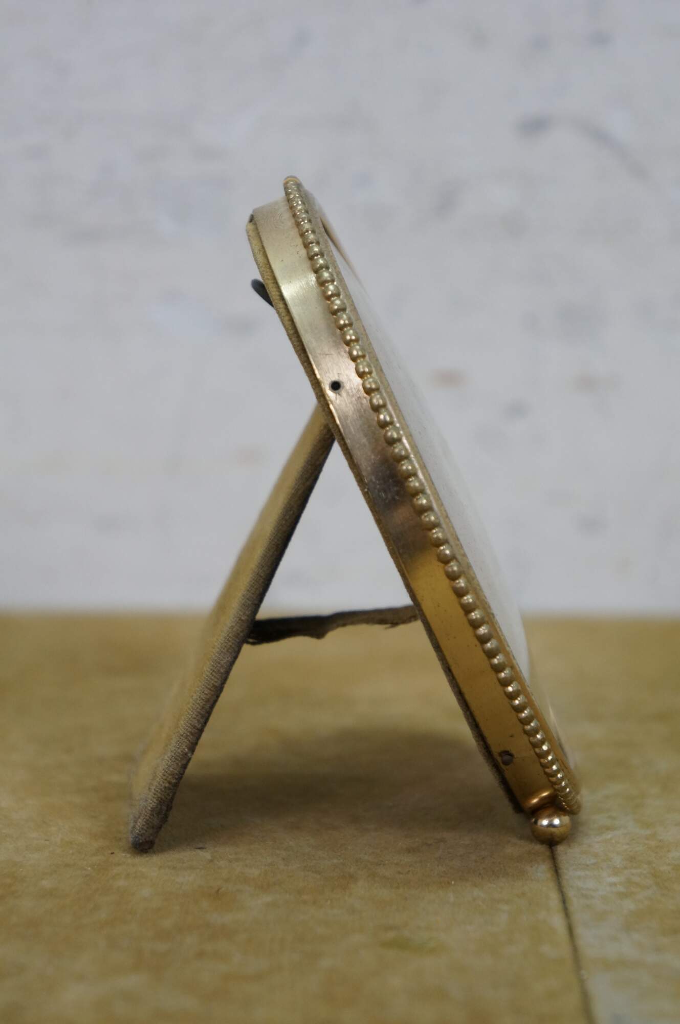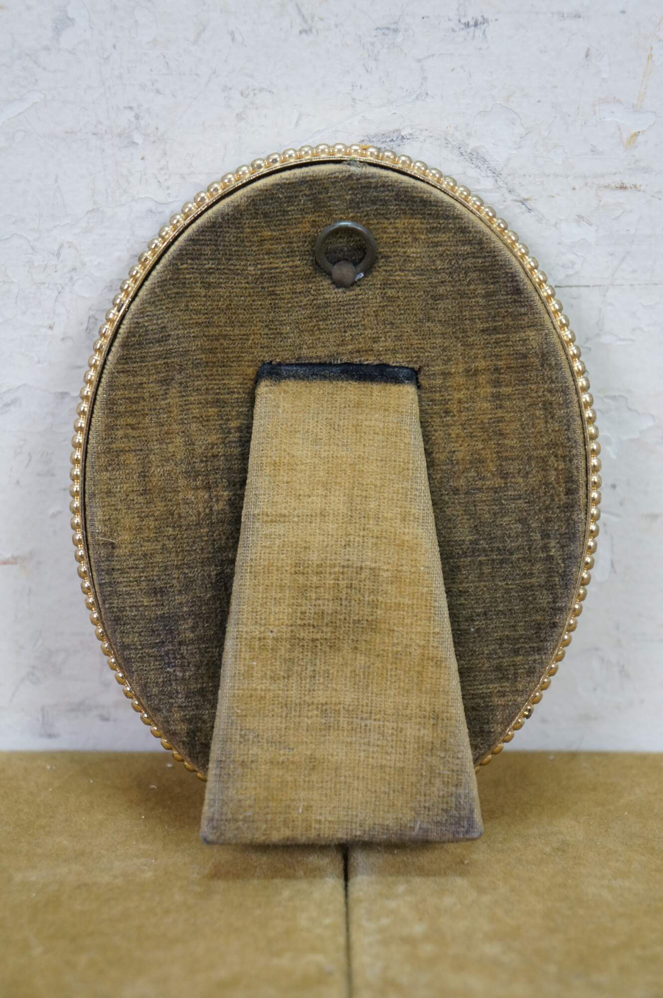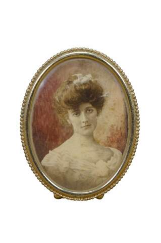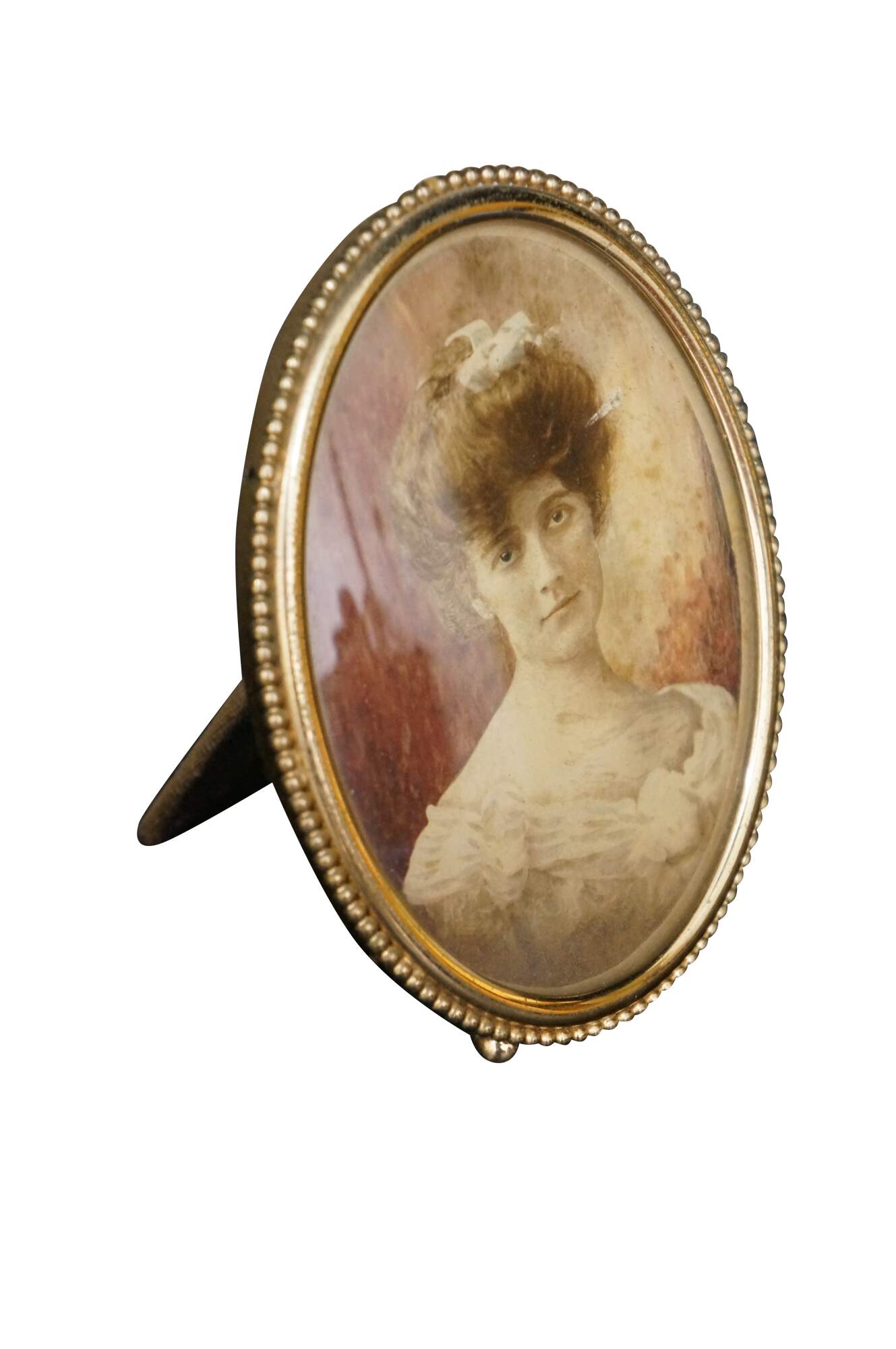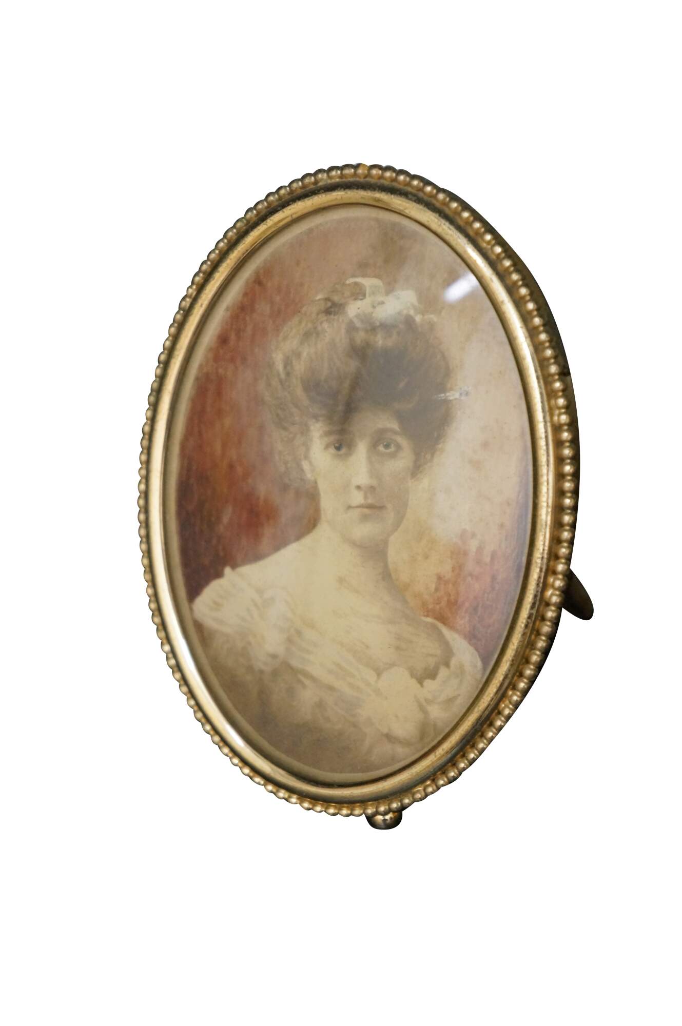 Antique gold beaded gadrooned oval portrait picture photo frame featuring a print of a woman in formal attire.