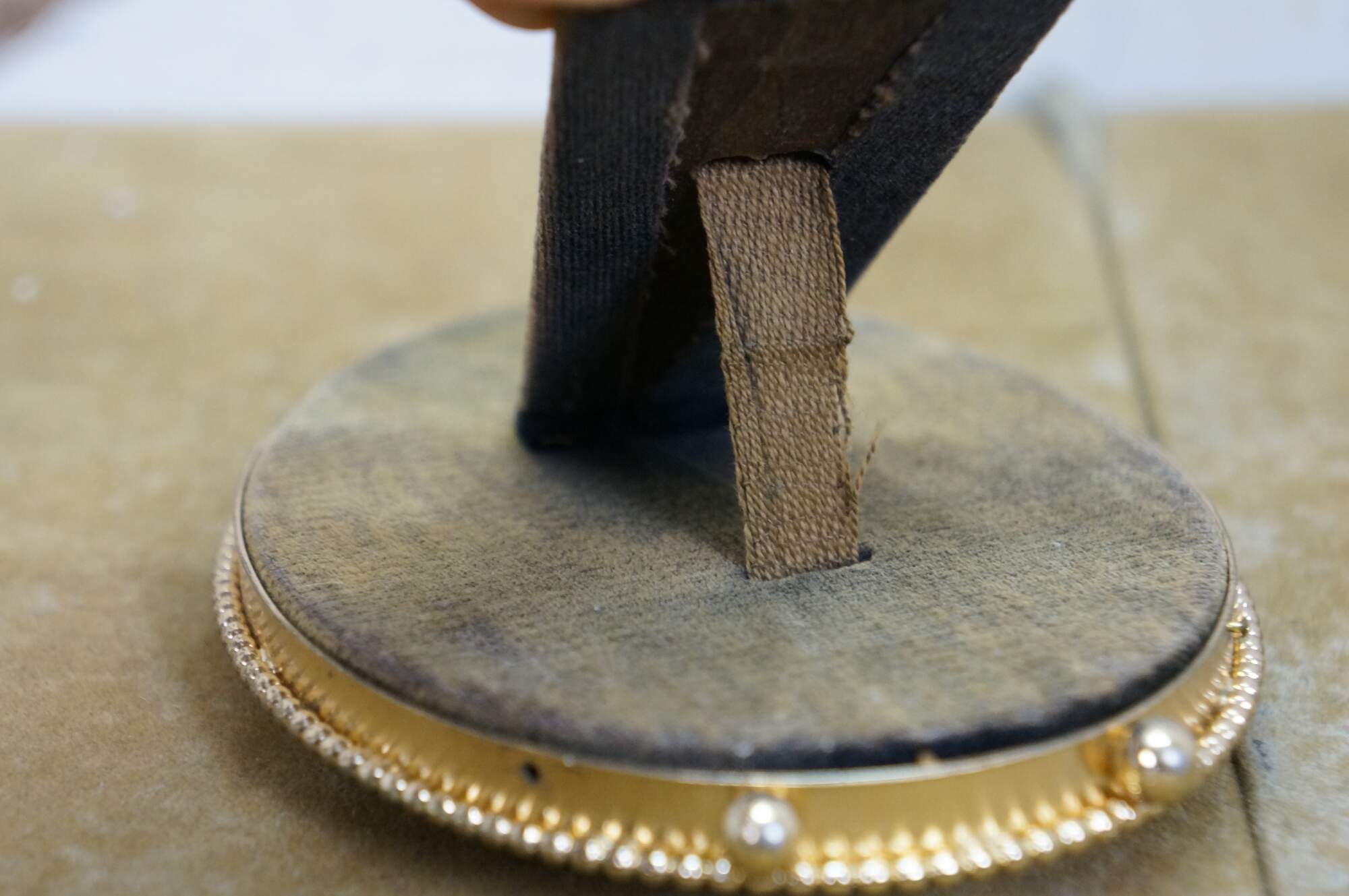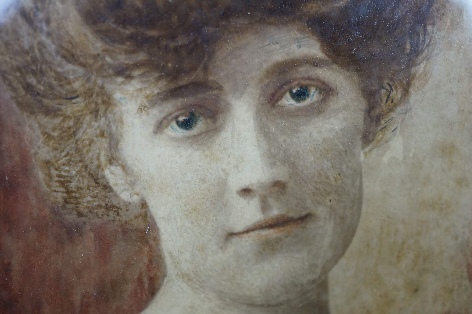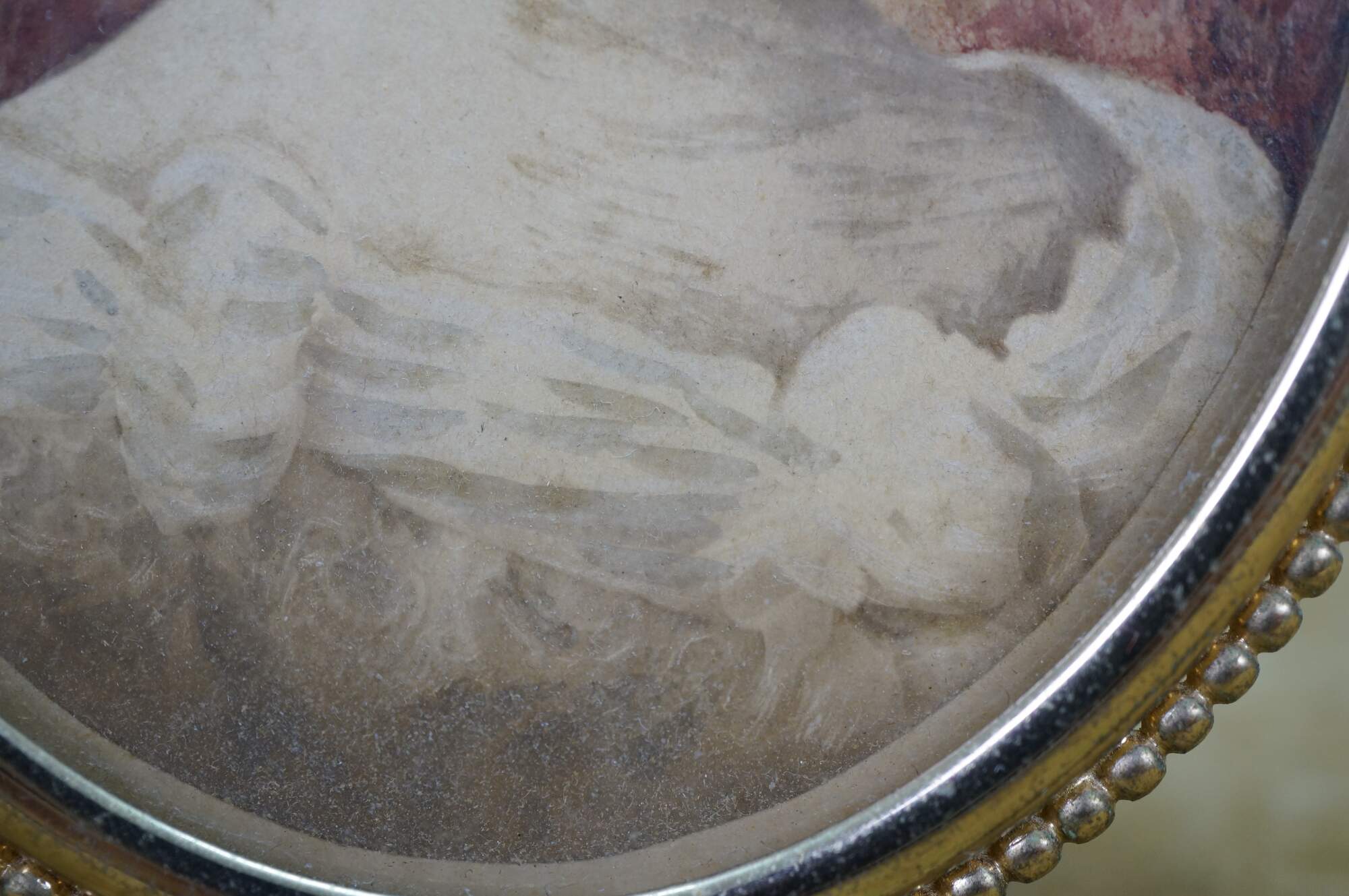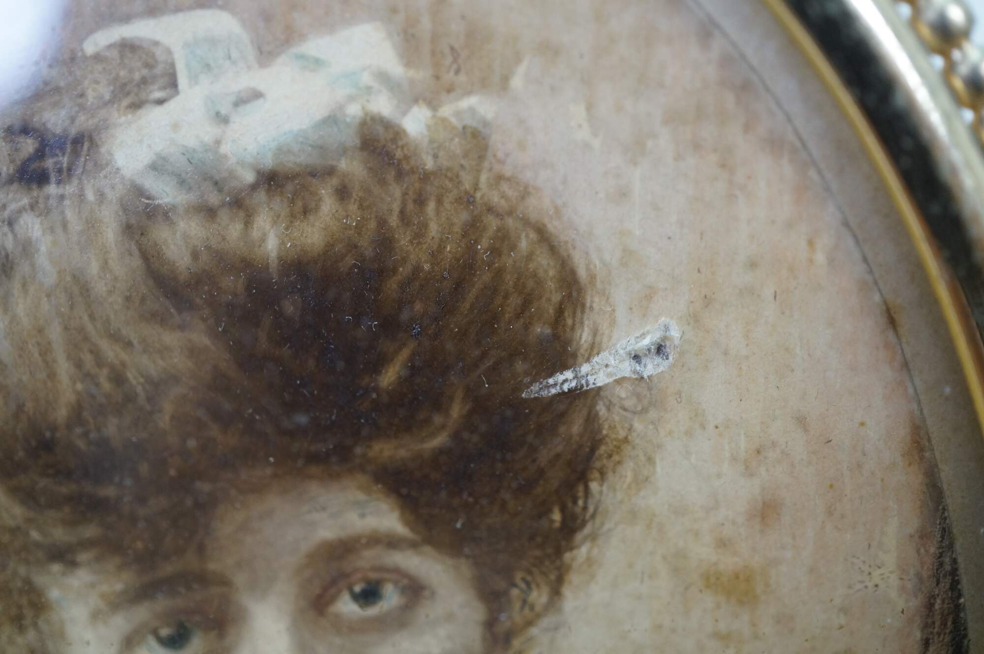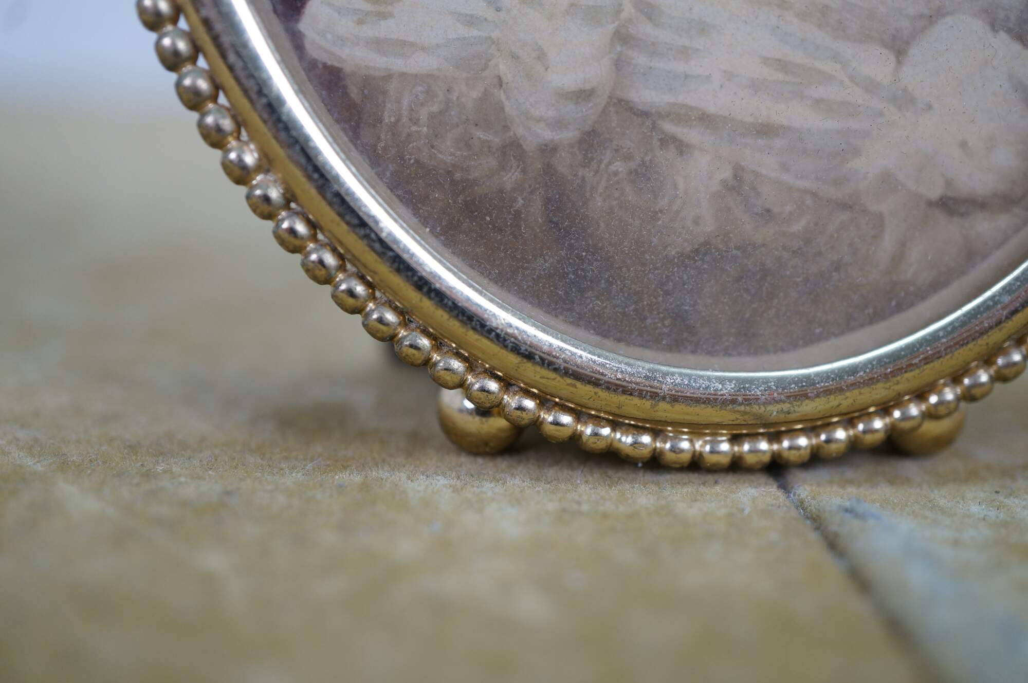 Antique gold beaded gadrooned oval portrait picture photo frame featuring a print of a woman in formal attire.