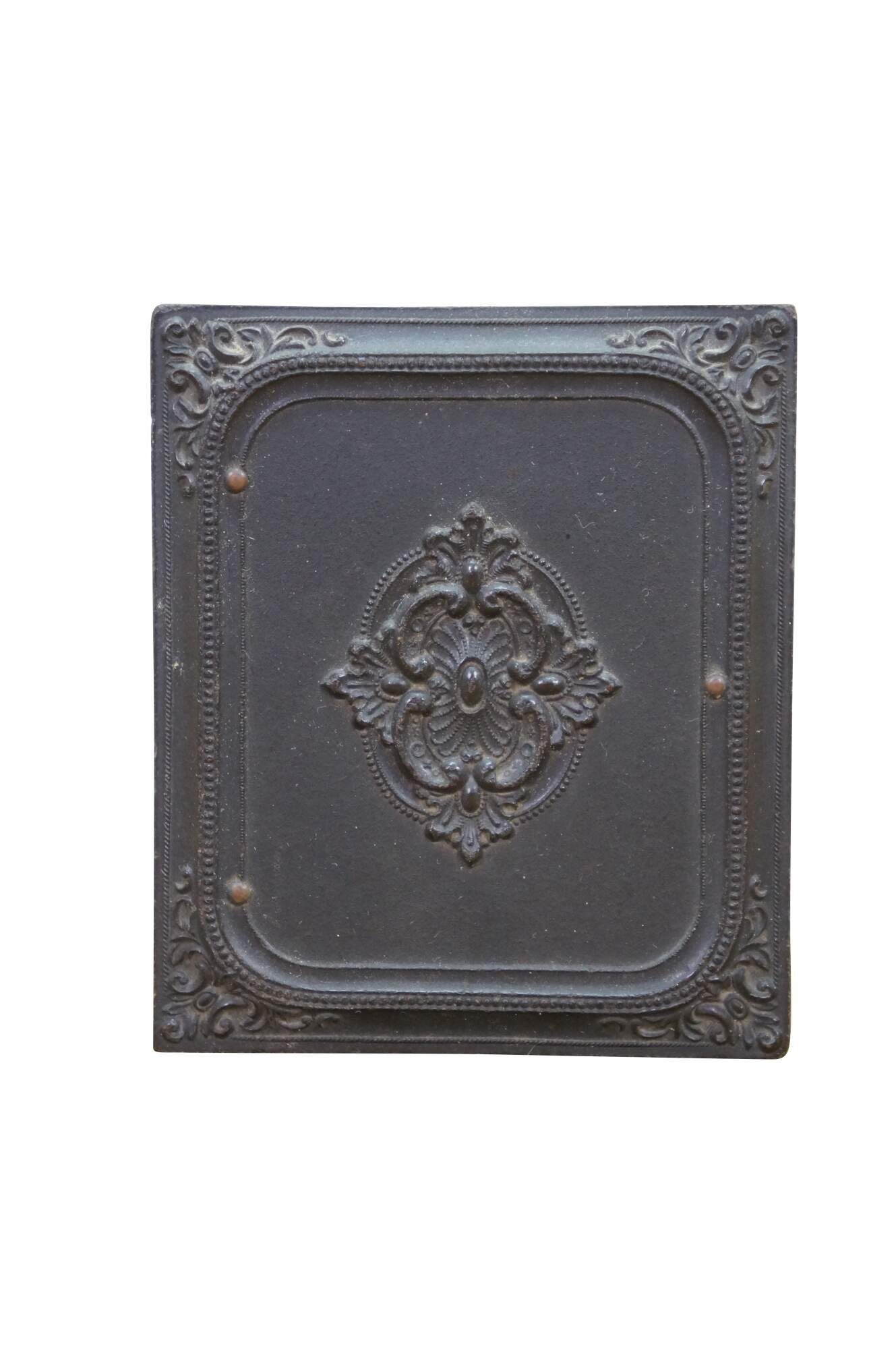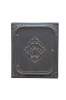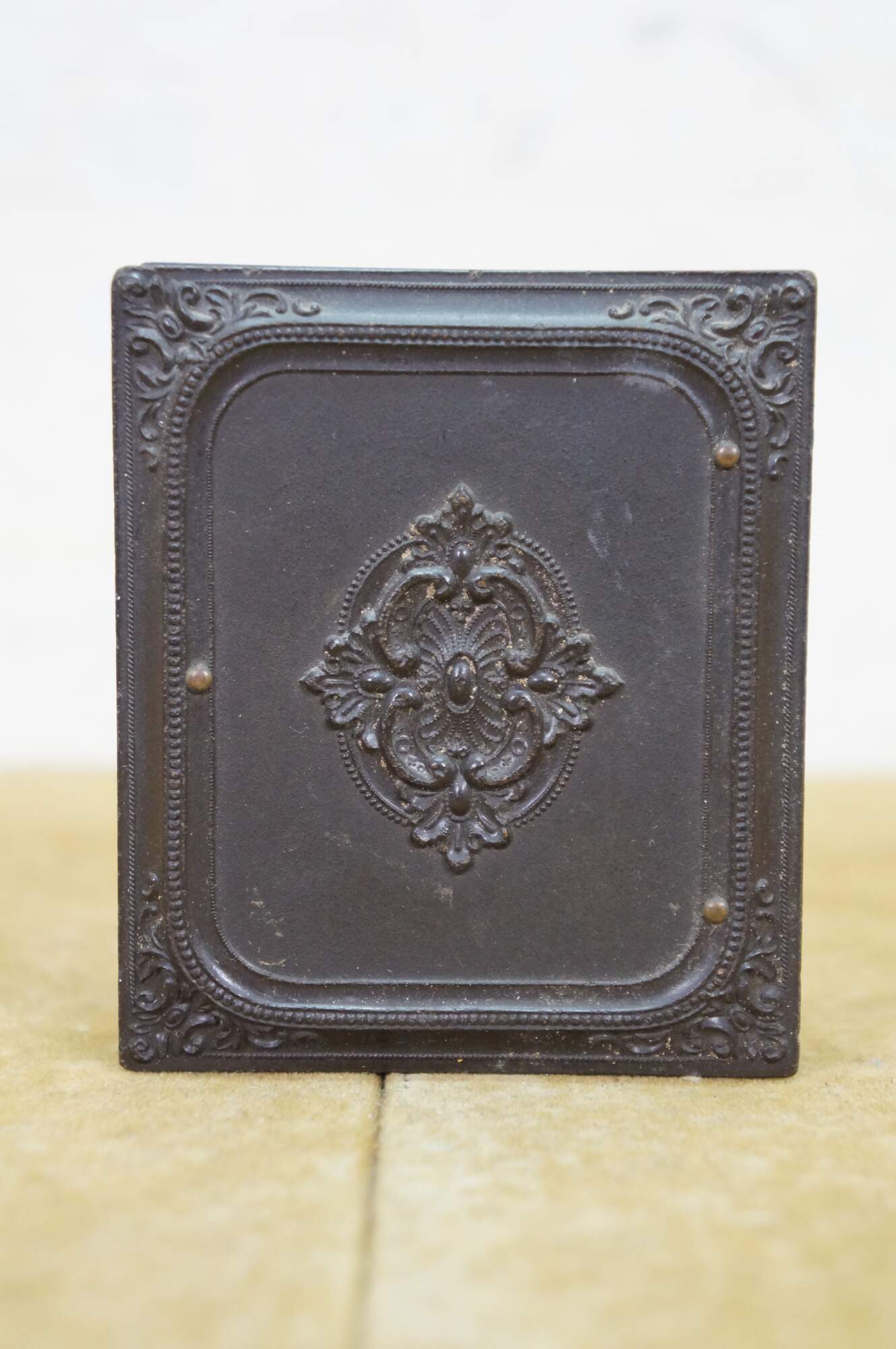 Antique Thermoplastic case with modern photograph. Features a gold engraved interior around the photo and emboirdered fabric on the reverse. The case is ornately designed with foliate.