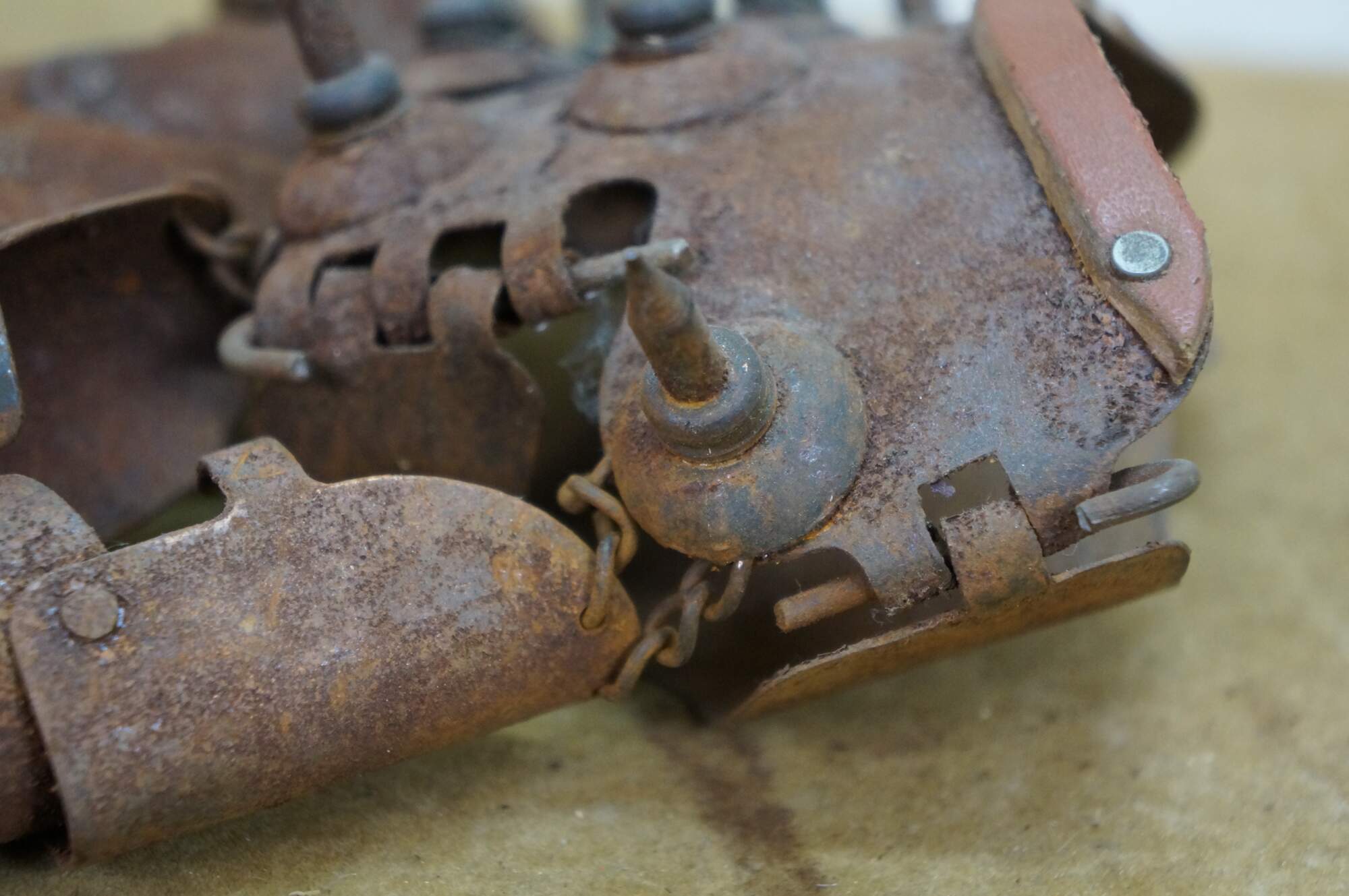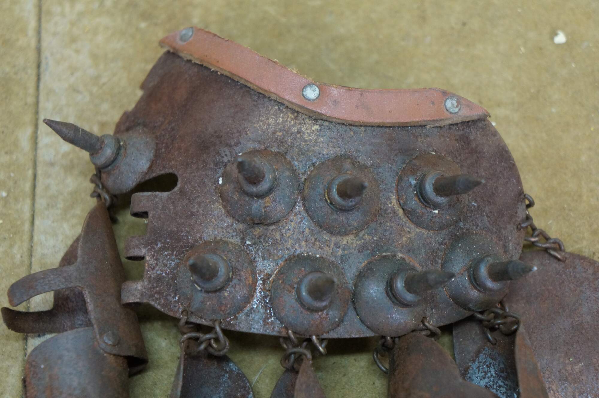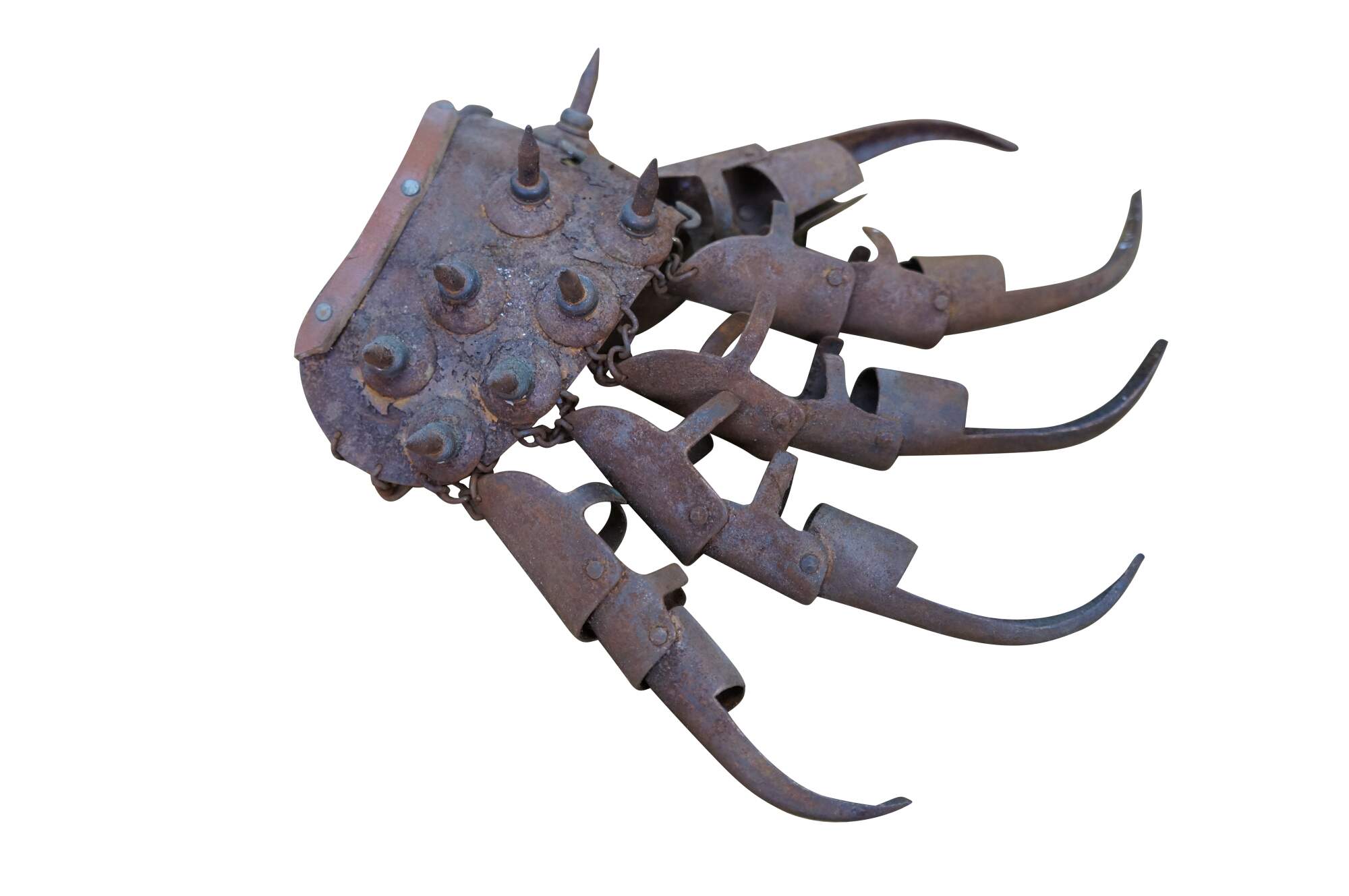 Antique pair of chinese Tiger Claw or Hawk Combat Gloves. Features a metal articulated frame with spiked wrist plates. Figers connected via chain.
