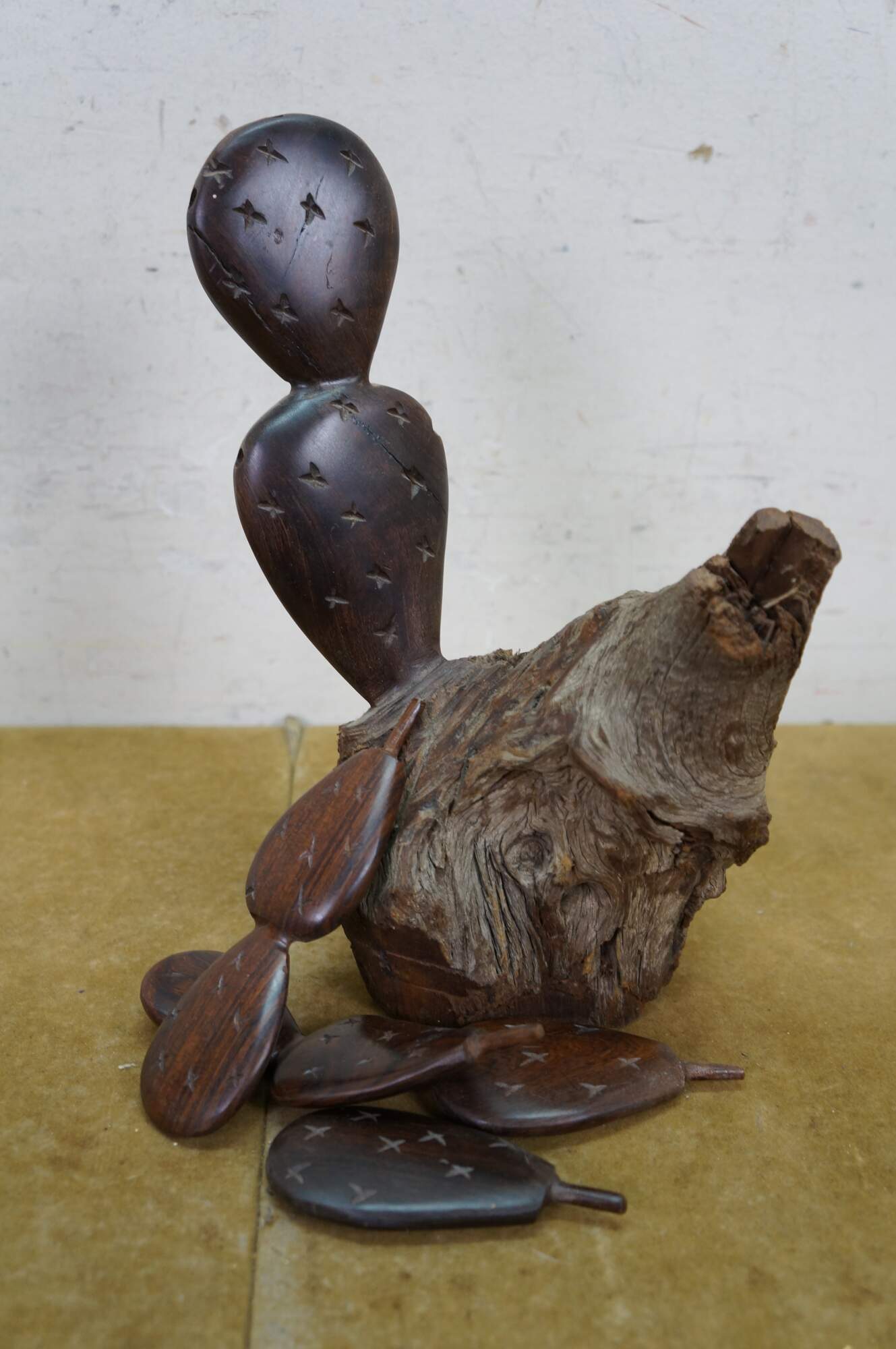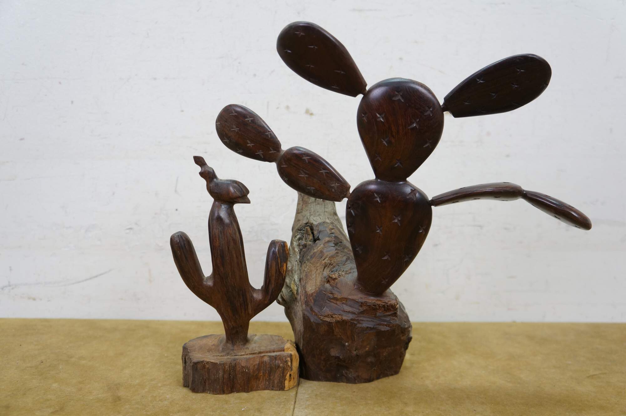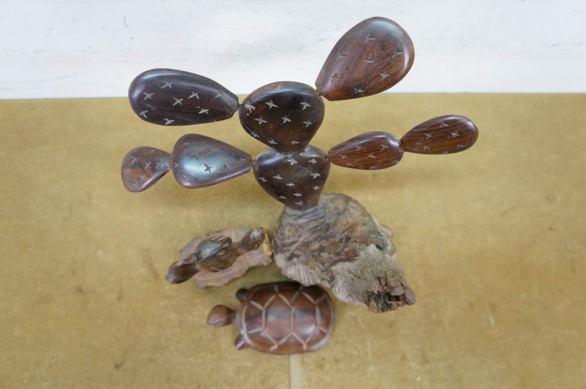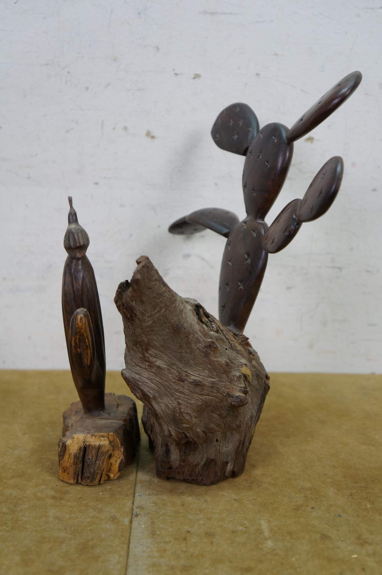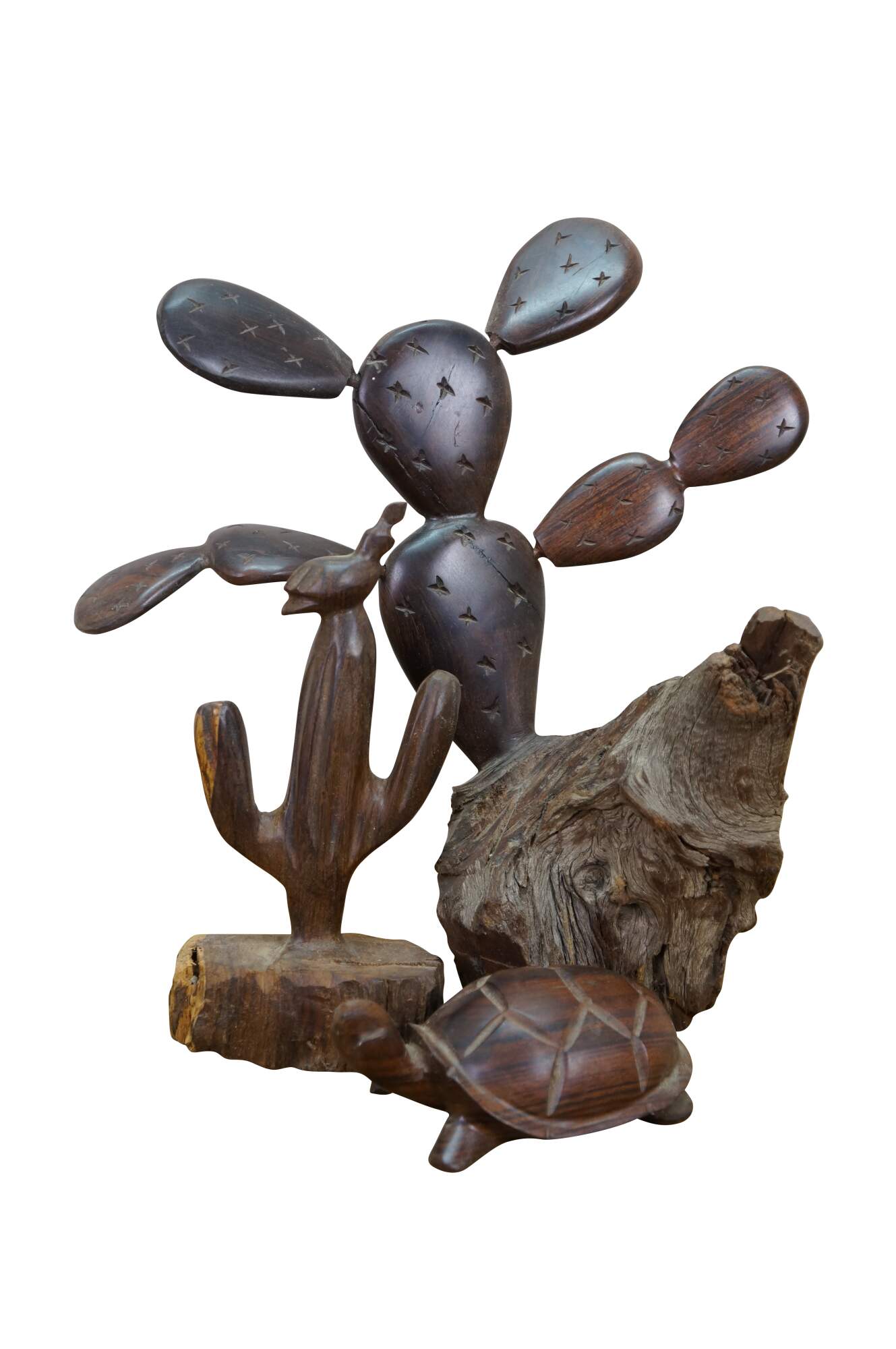 3 Vintage Hand Carved Sculptures. Made from Ironwood. Features a Saguaro cactus with bird on top. A carved turtle and a large Prickly Pear Sculpture