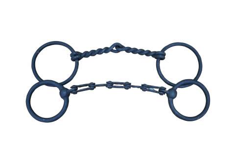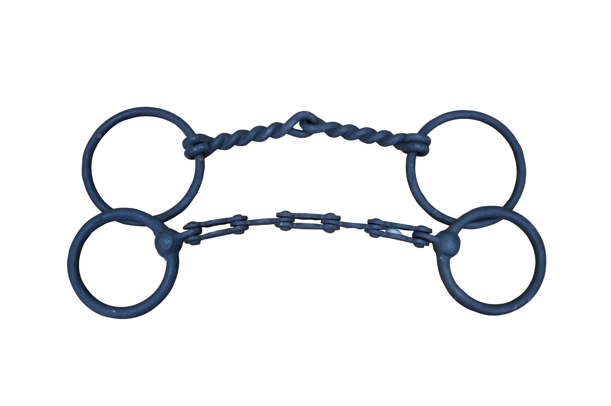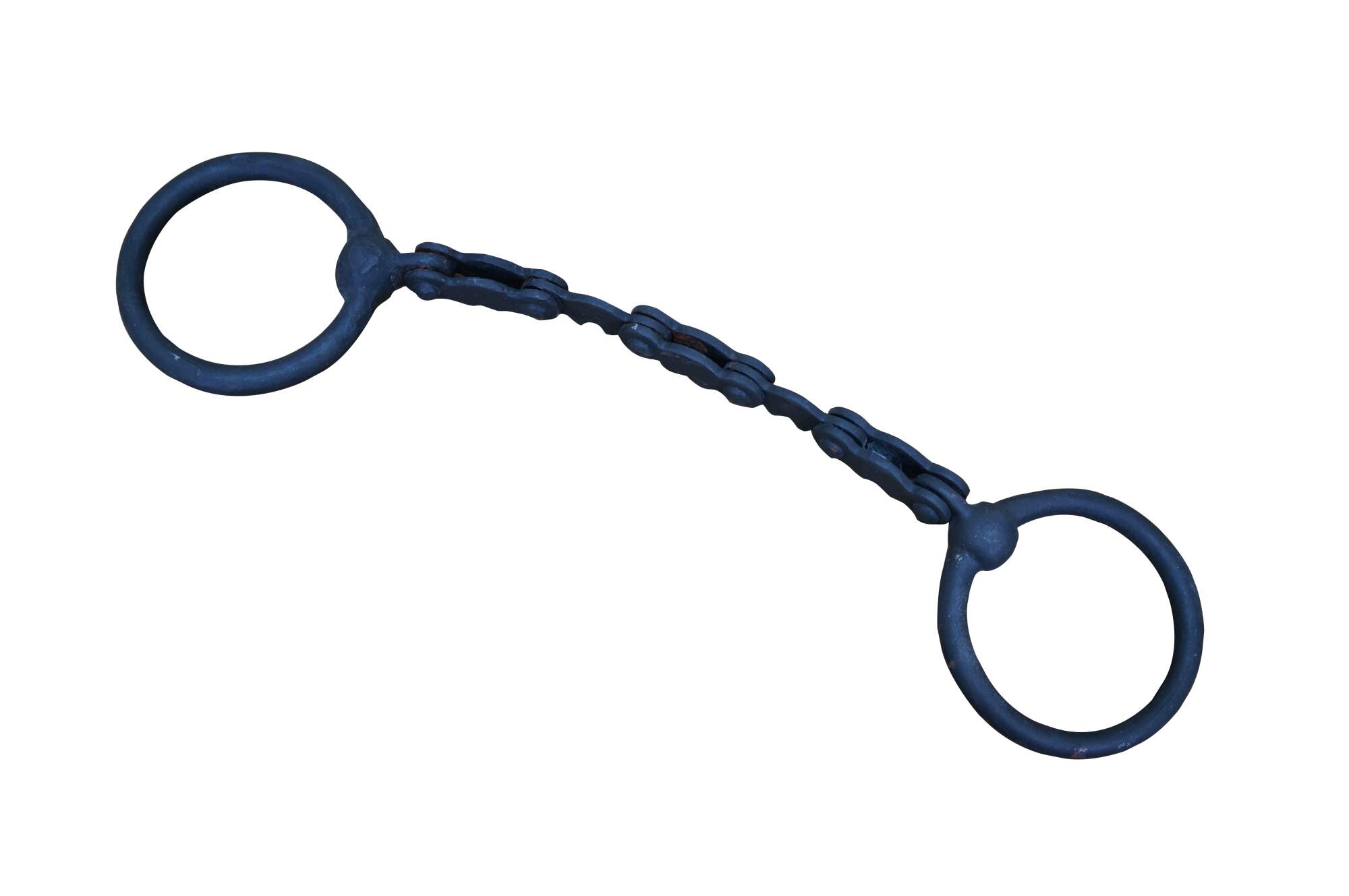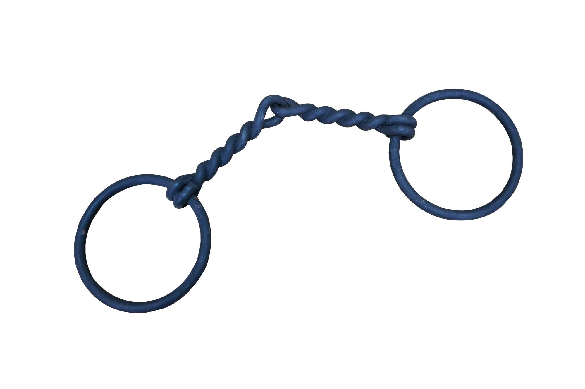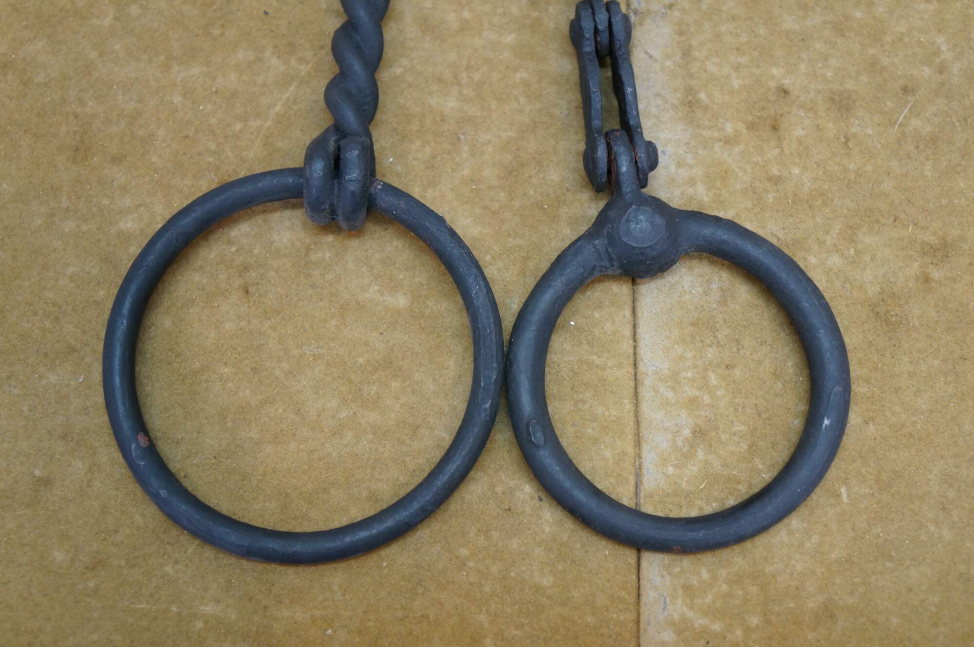 Two antique wrought iron Western farmhouse horse / mule O ring snaffle bits, one barley twisted the other chain link.