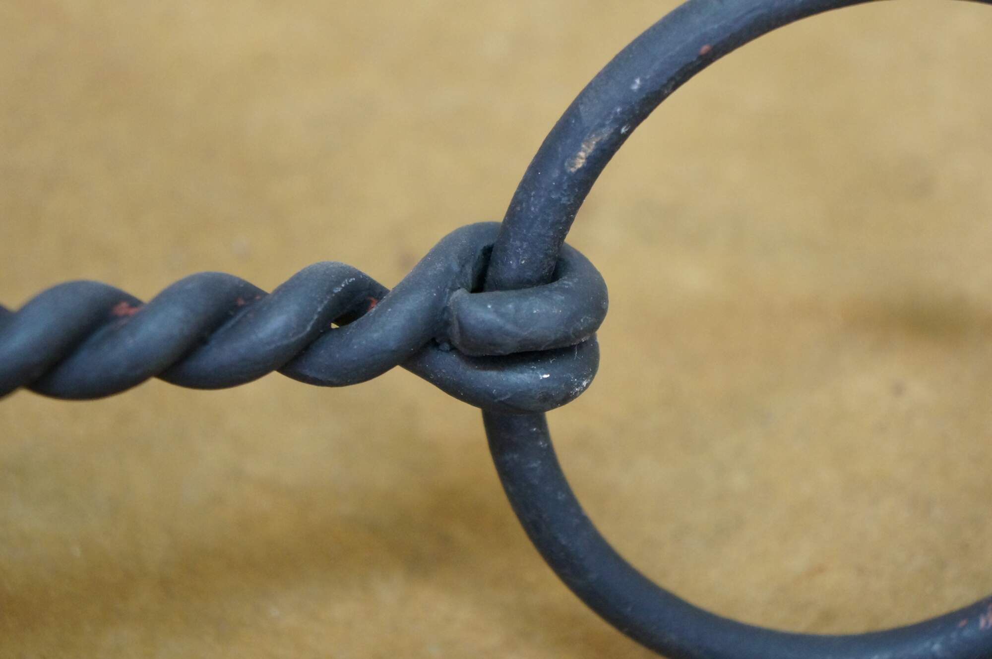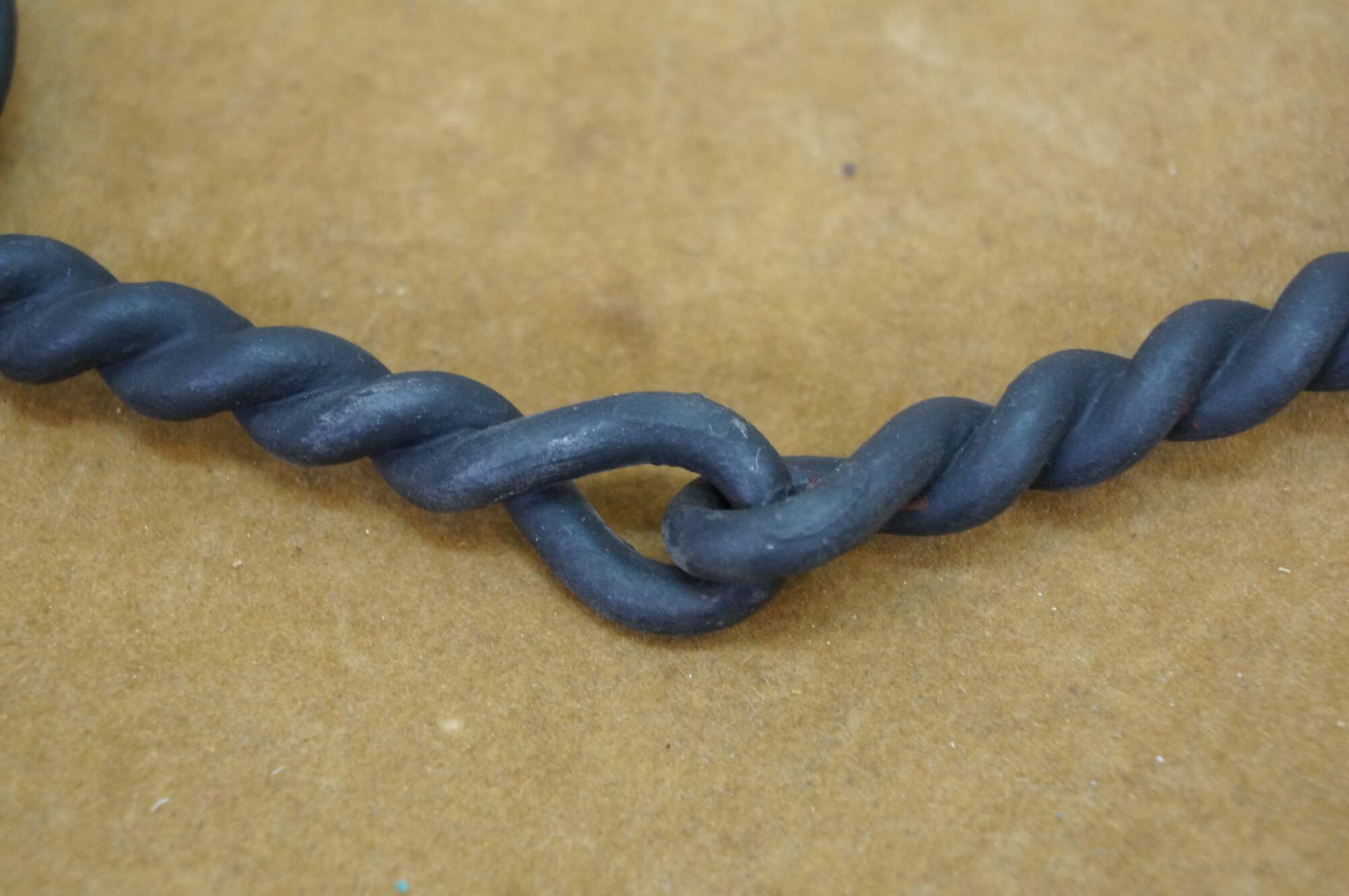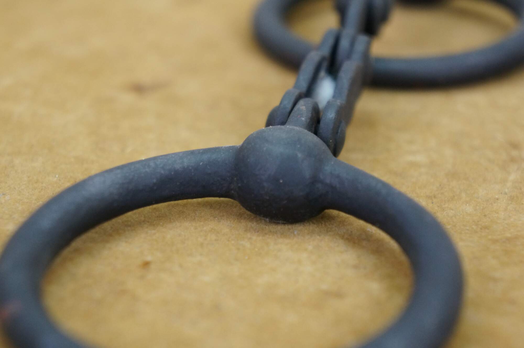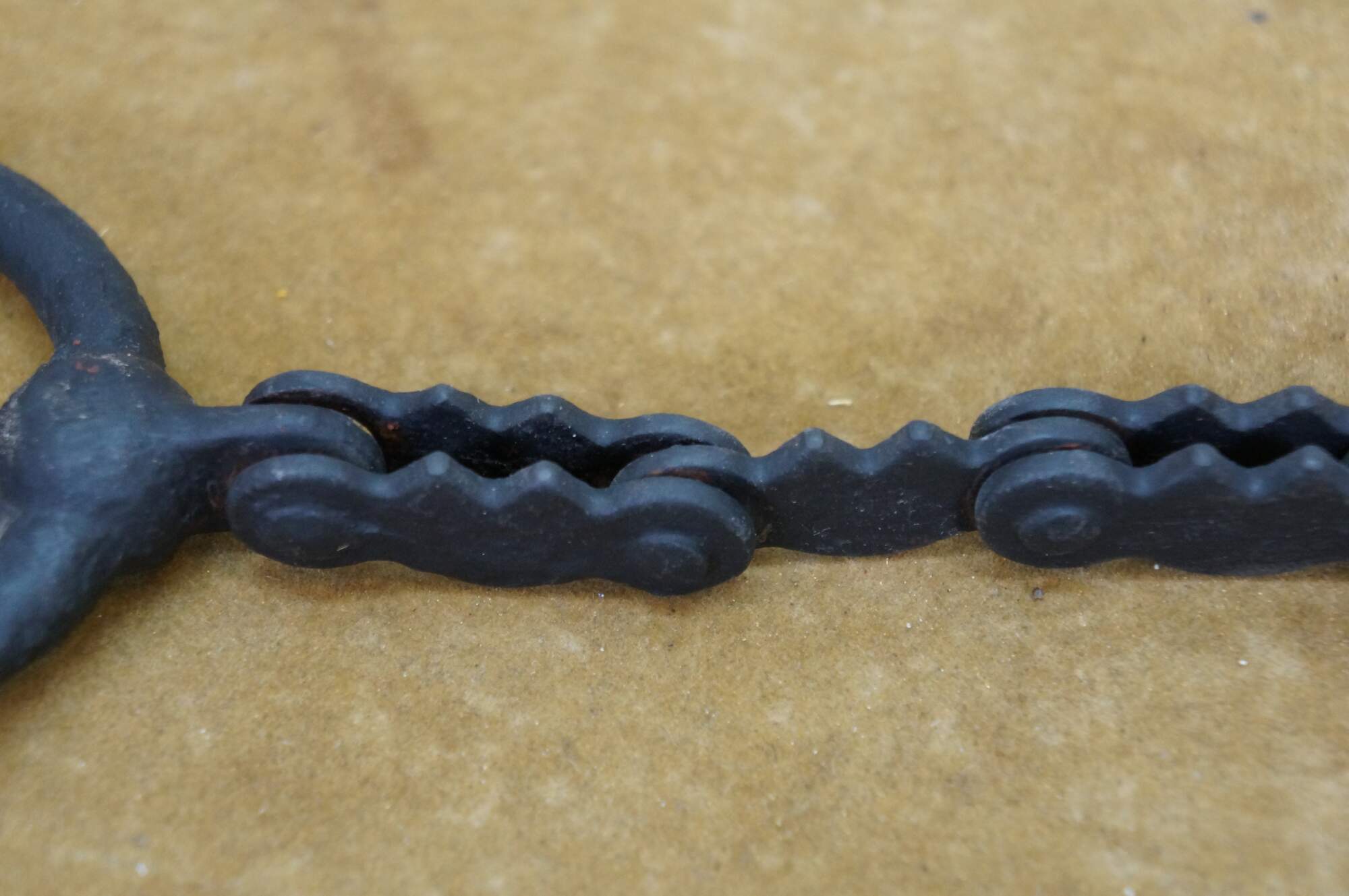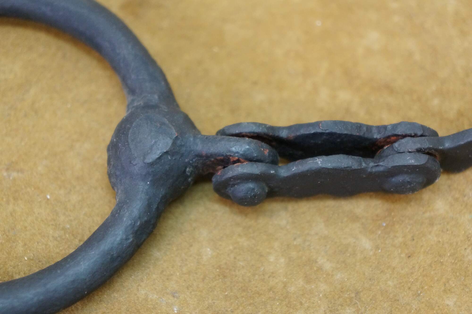 Two antique wrought iron Western farmhouse horse / mule O ring snaffle bits, one barley twisted the other chain link.