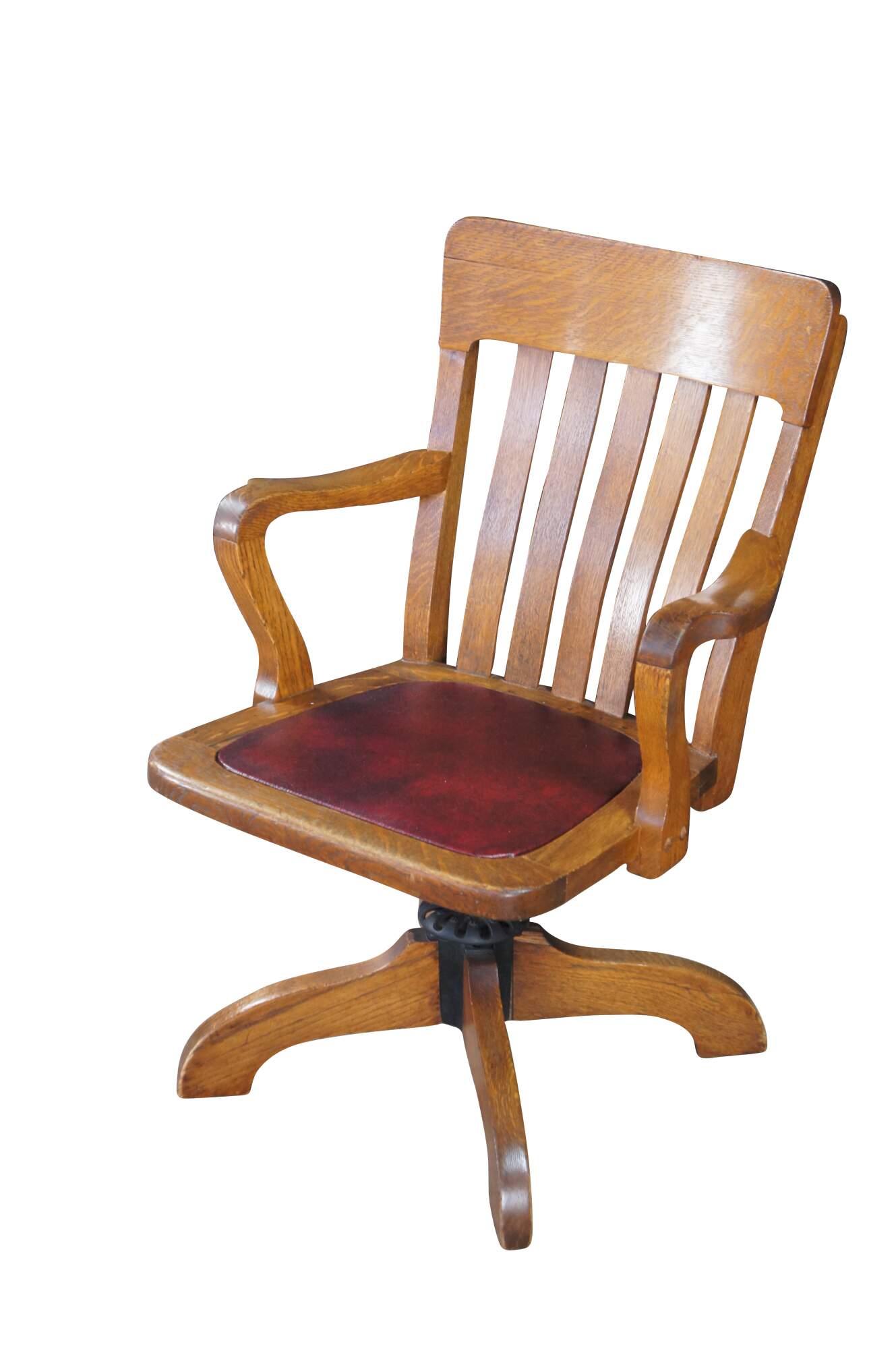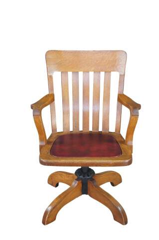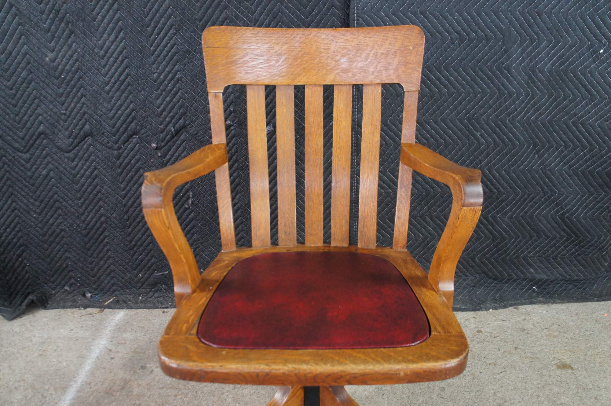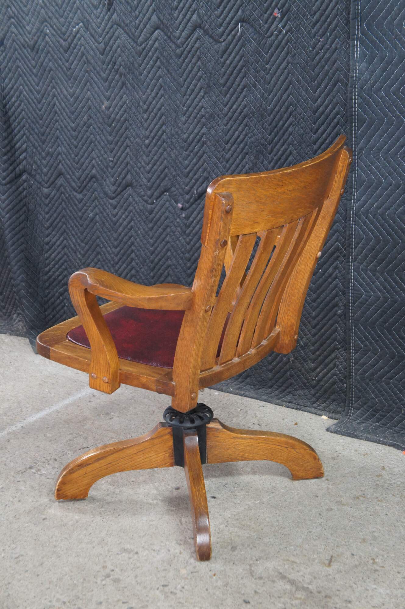 Charming Edwardian Era Desk Chair, circa 1900s. Features a quartersawn oak frame with a slat back, contoured arms and a leather seat. The seat is mounted over an adjustable base.