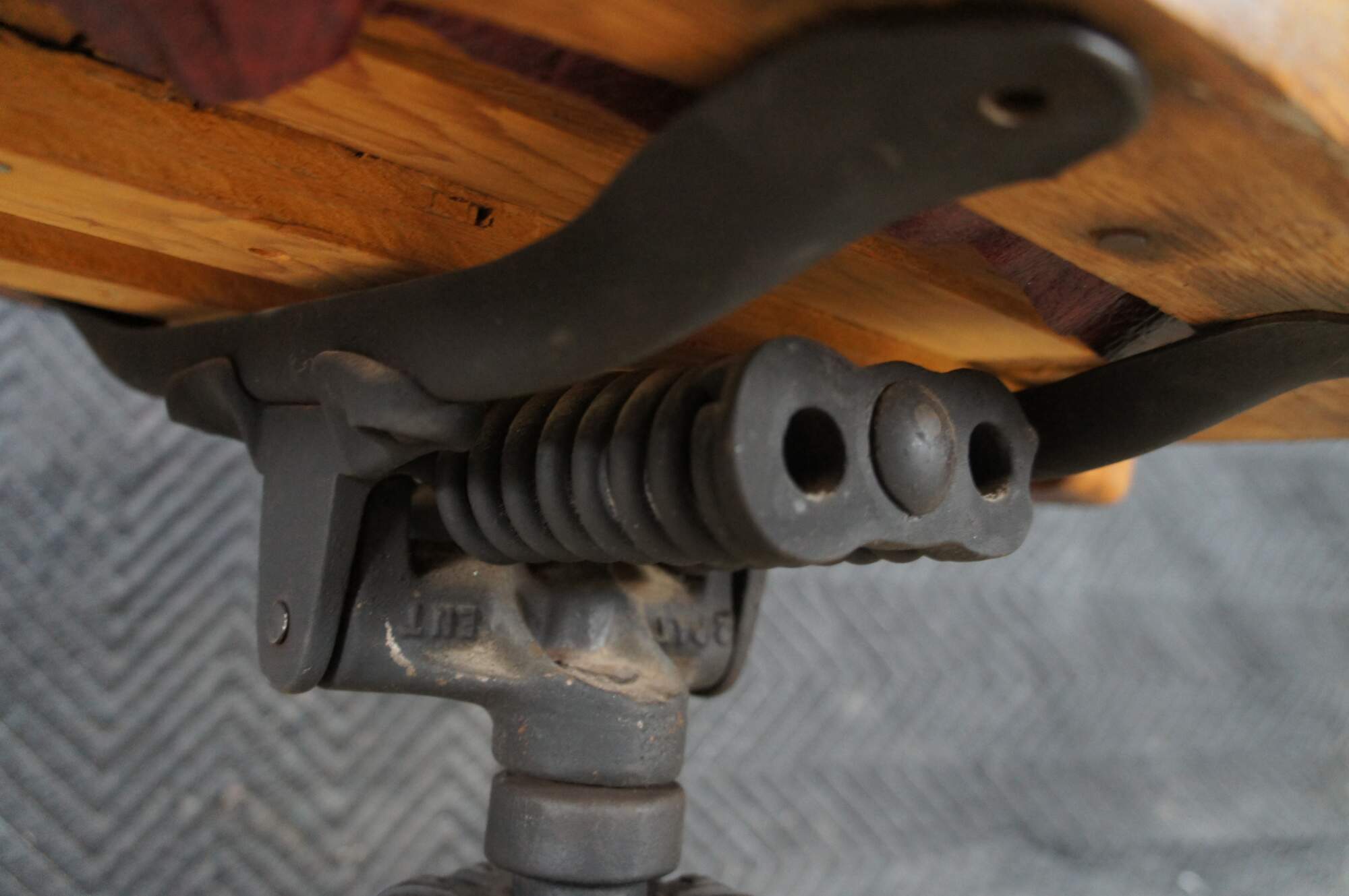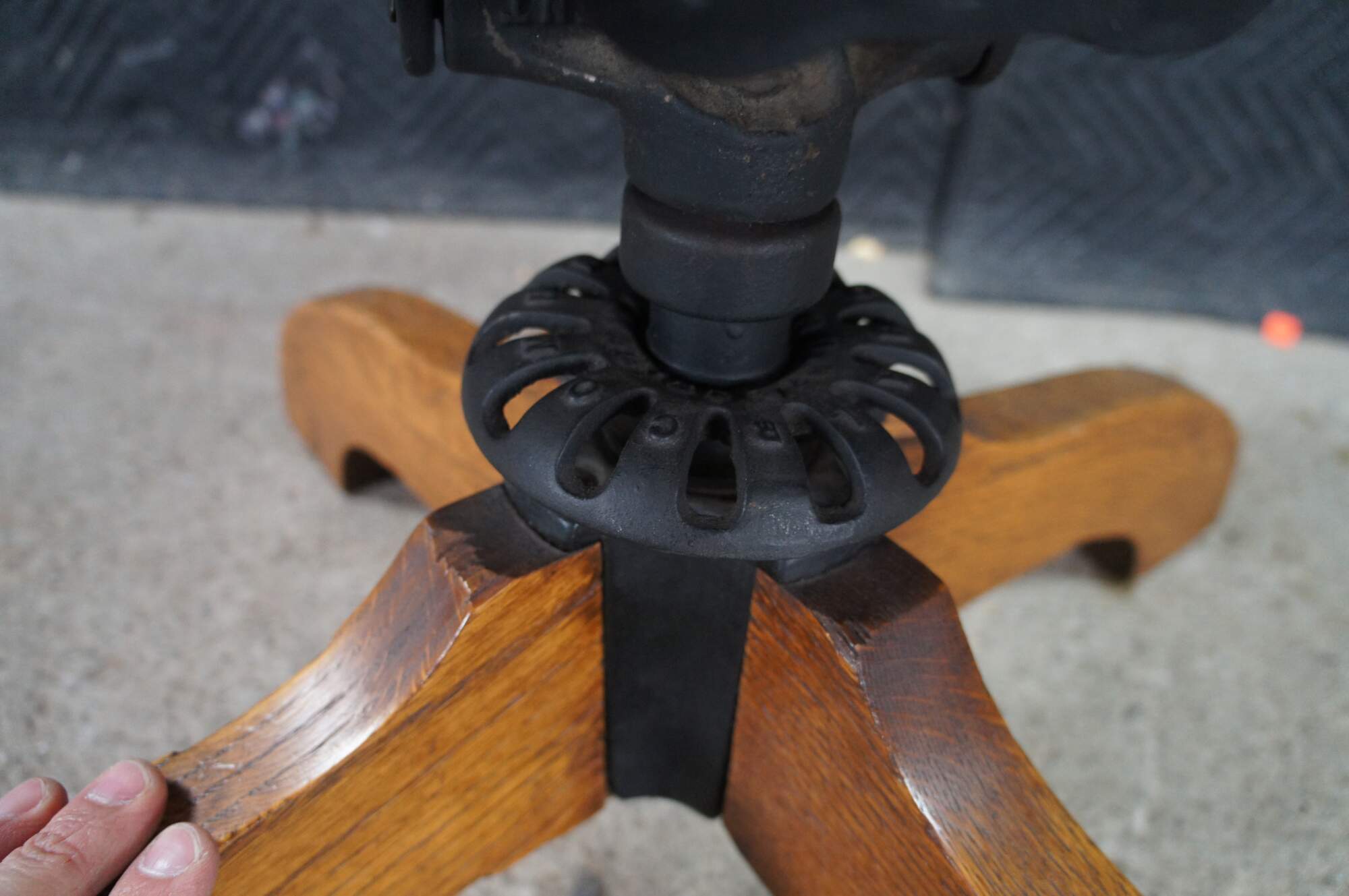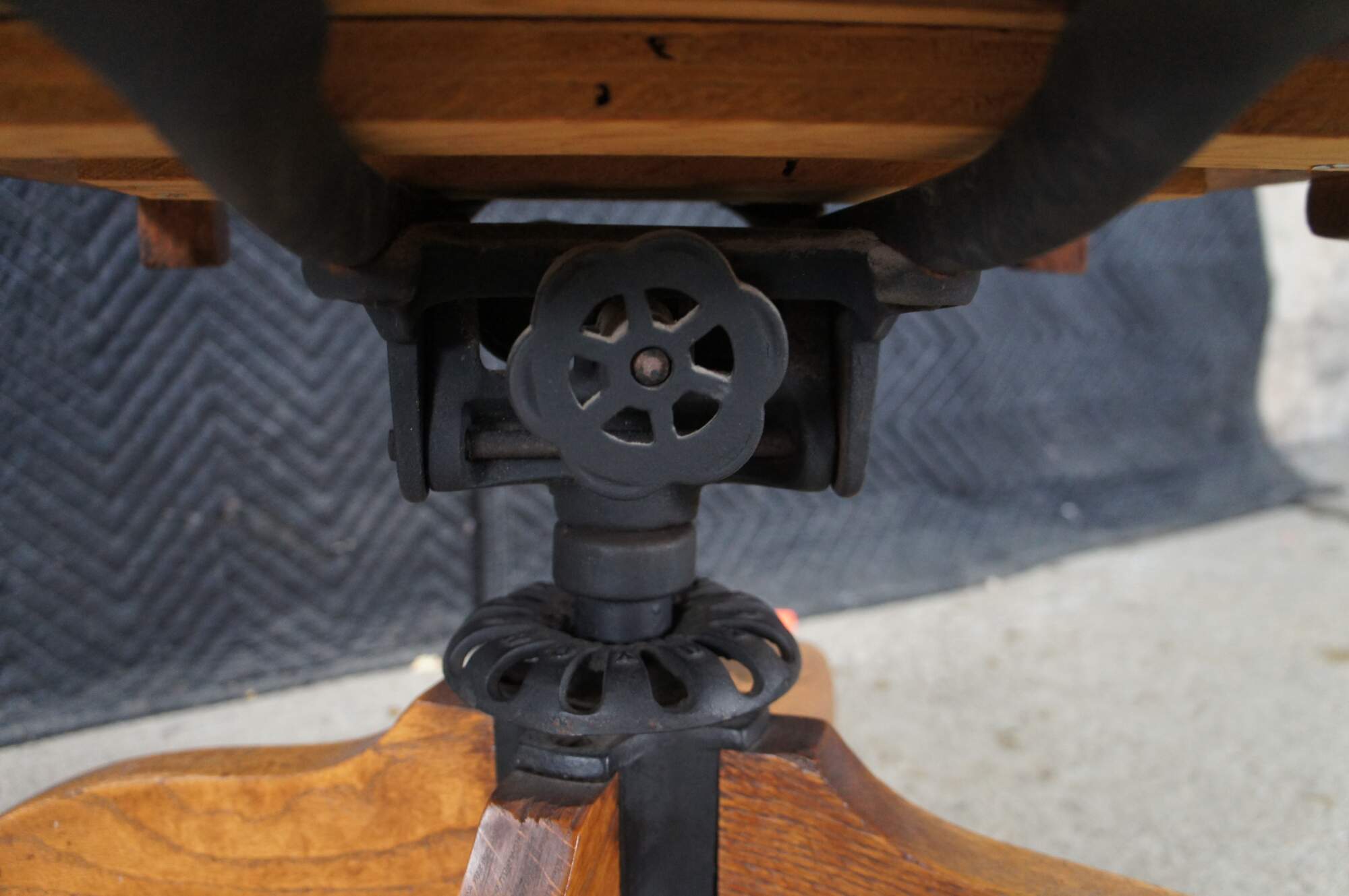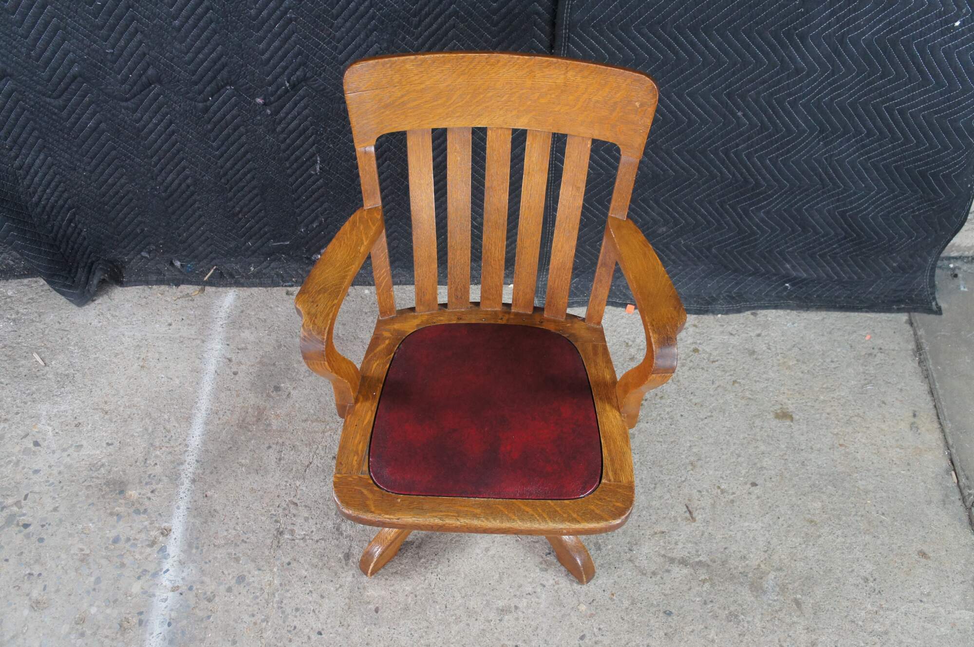 Charming Edwardian Era Desk Chair, circa 1900s. Features a quartersawn oak frame with a slat back, contoured arms and a leather seat. The seat is mounted over an adjustable base.