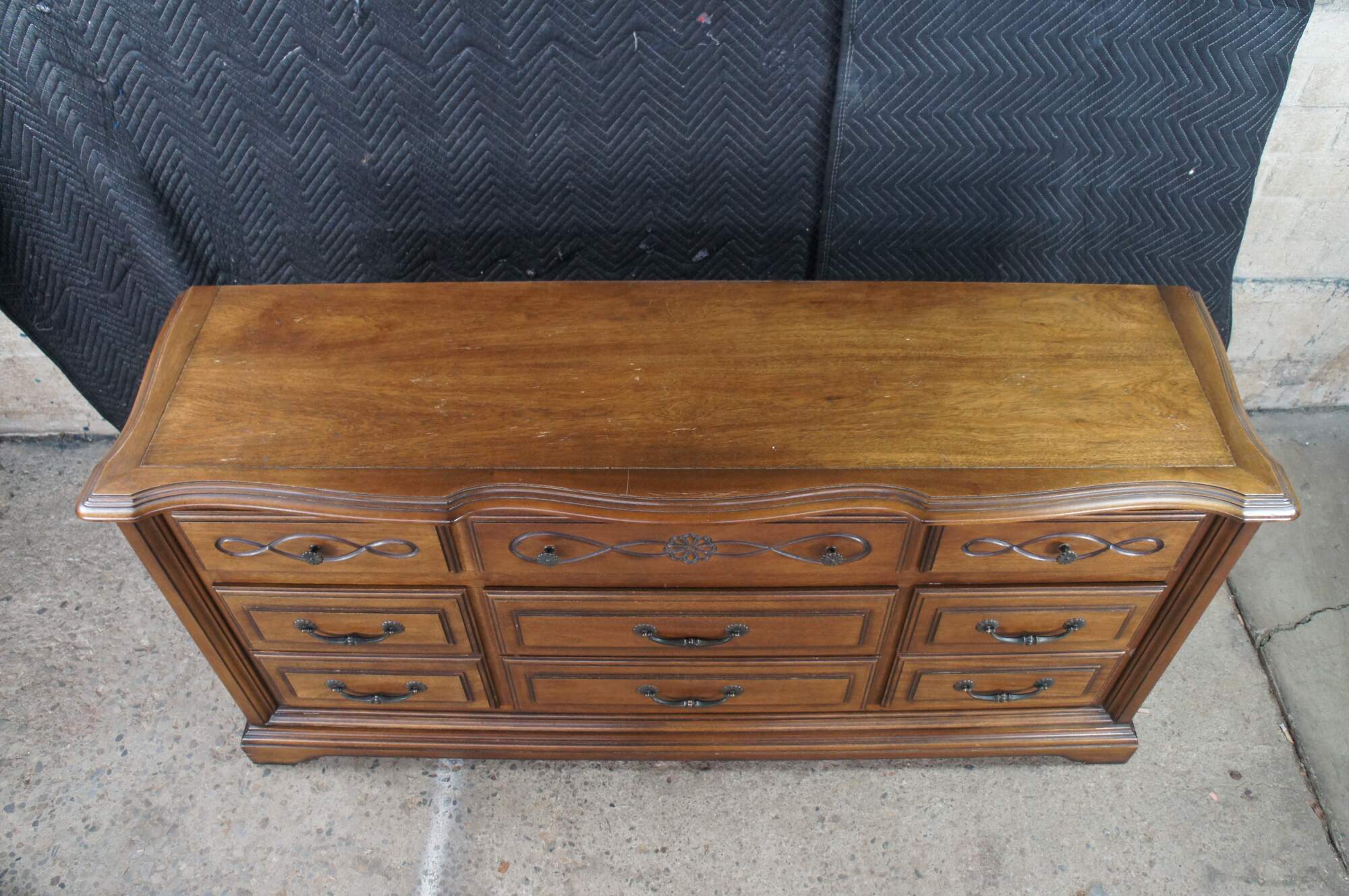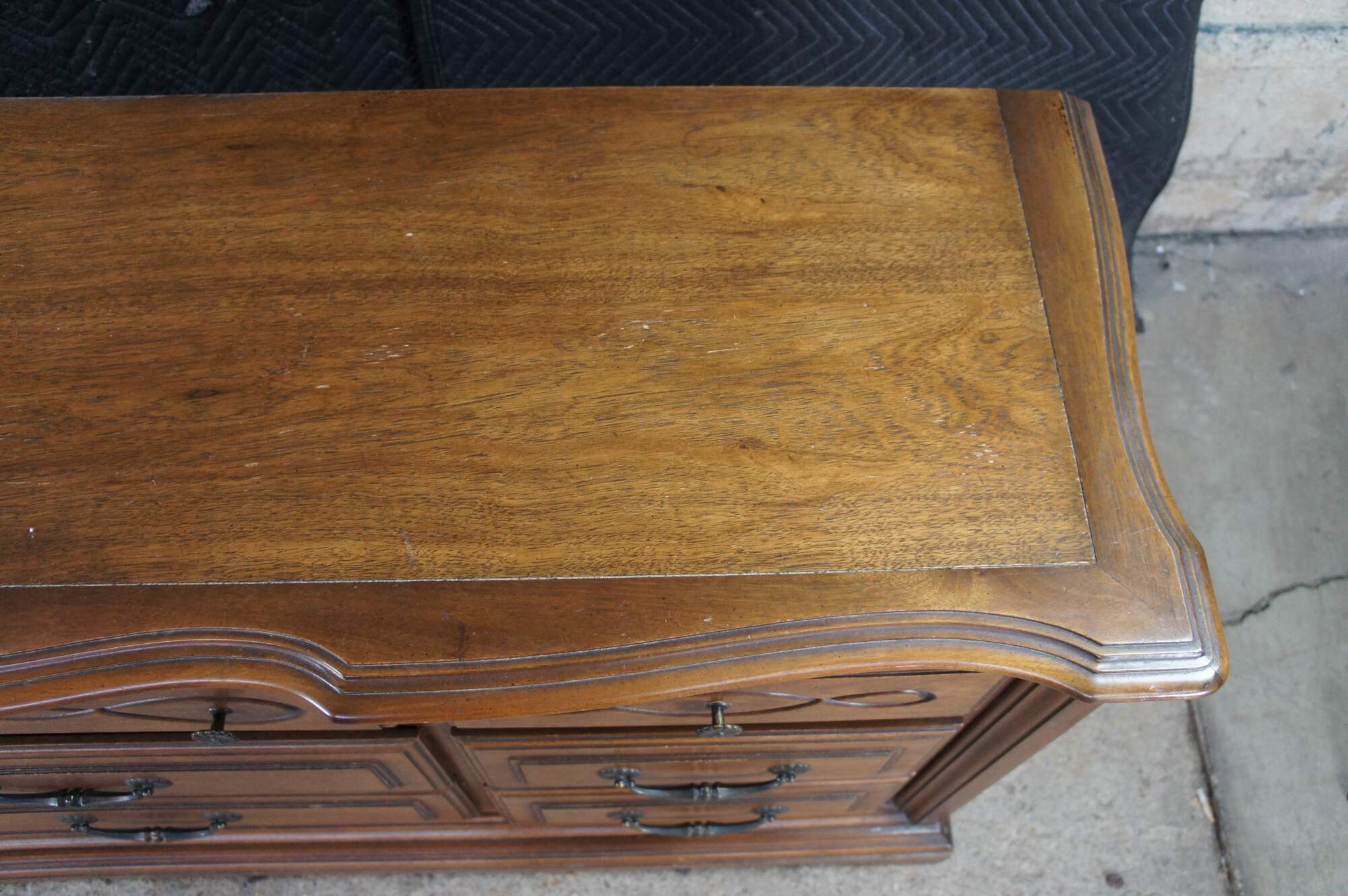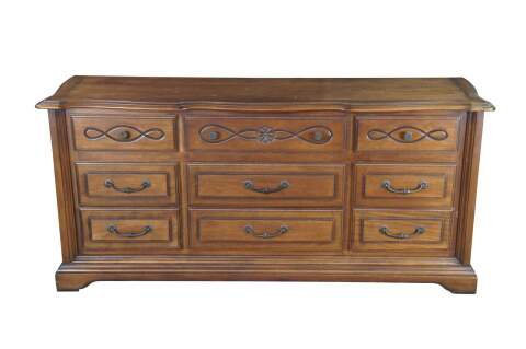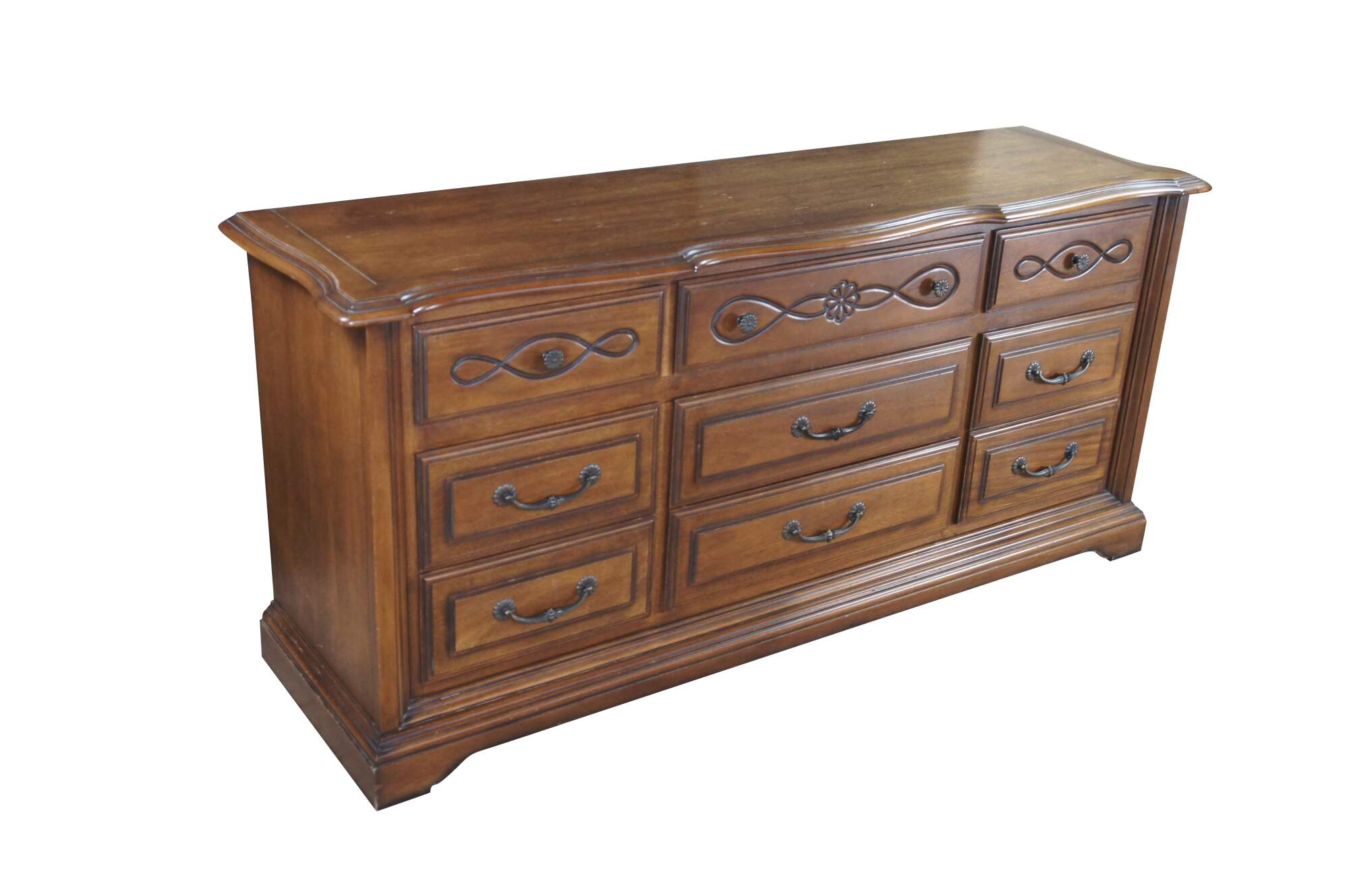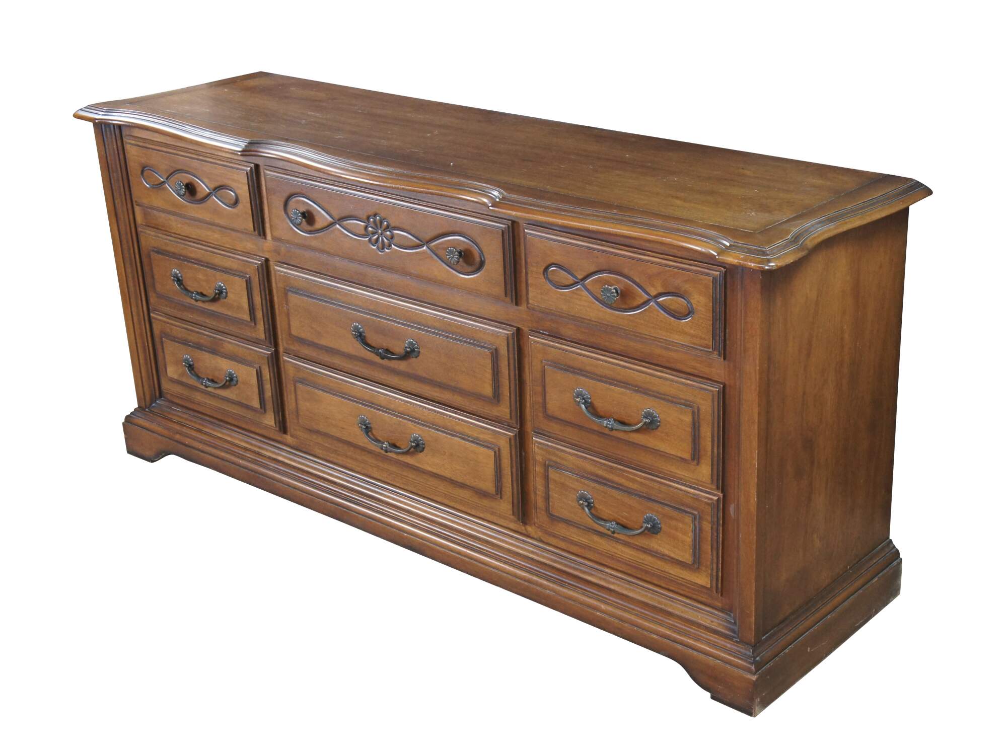 Late 20th Century French Country Triple Dresser by Century Furniture. Features a rectangular made from oak with serpentine top over nine drawers with brass hardware. Drawer fronts have a molded center and edge. The dresser is supported by a plinth base with molded feet.