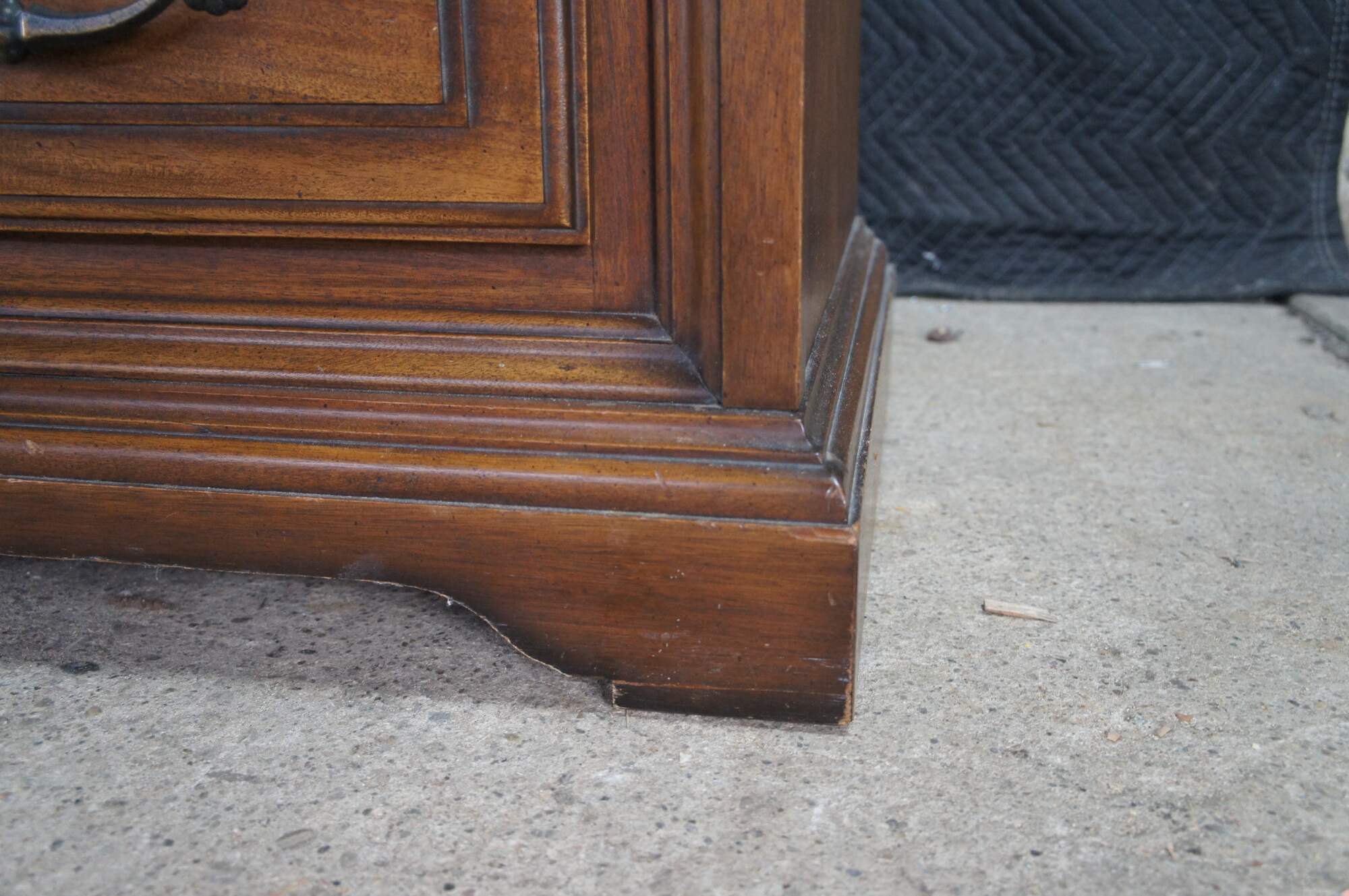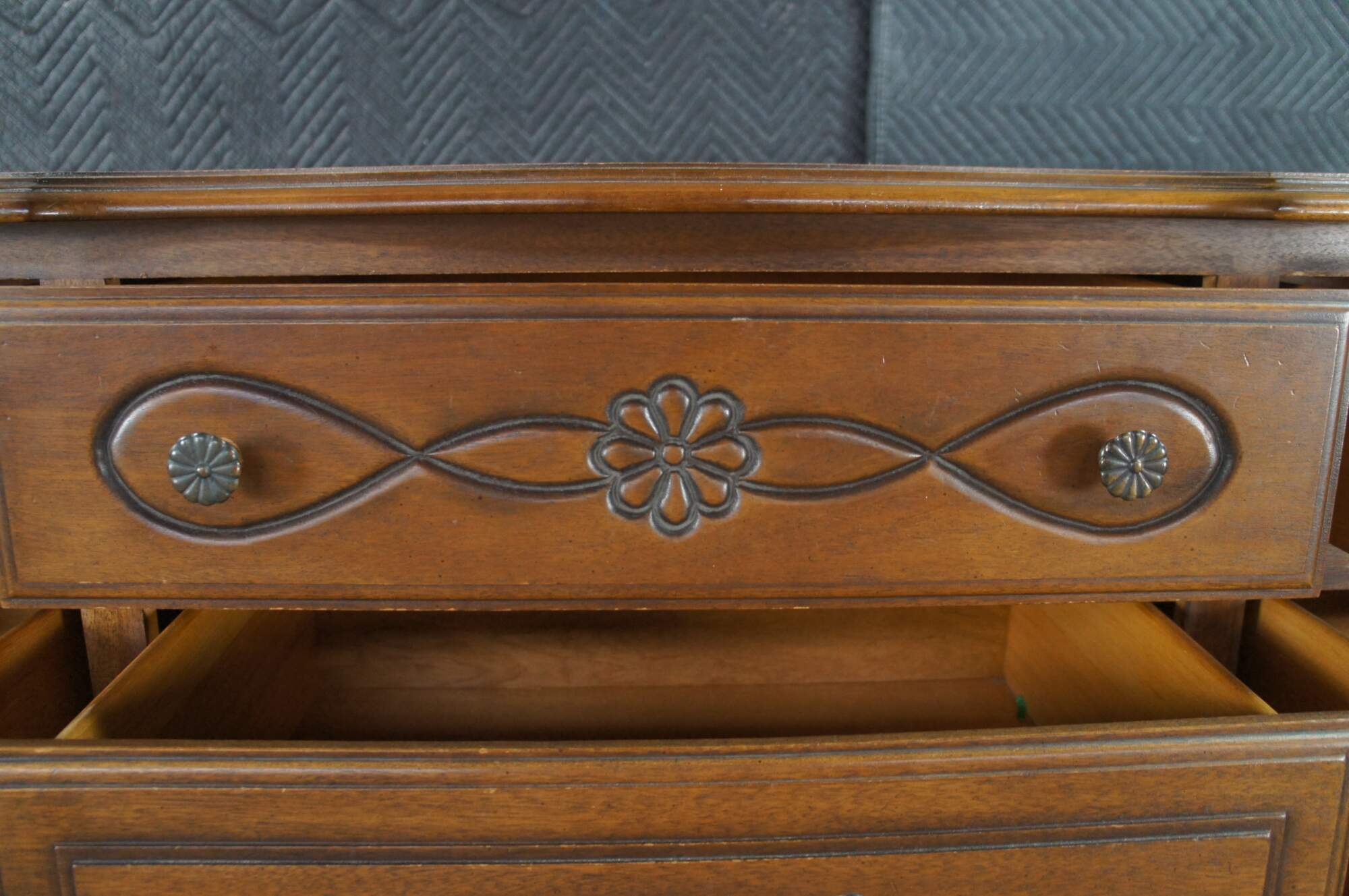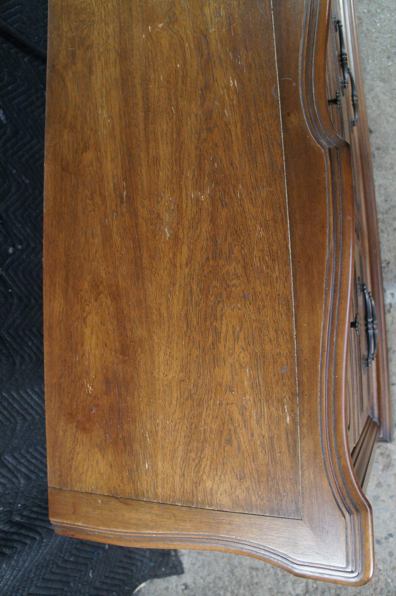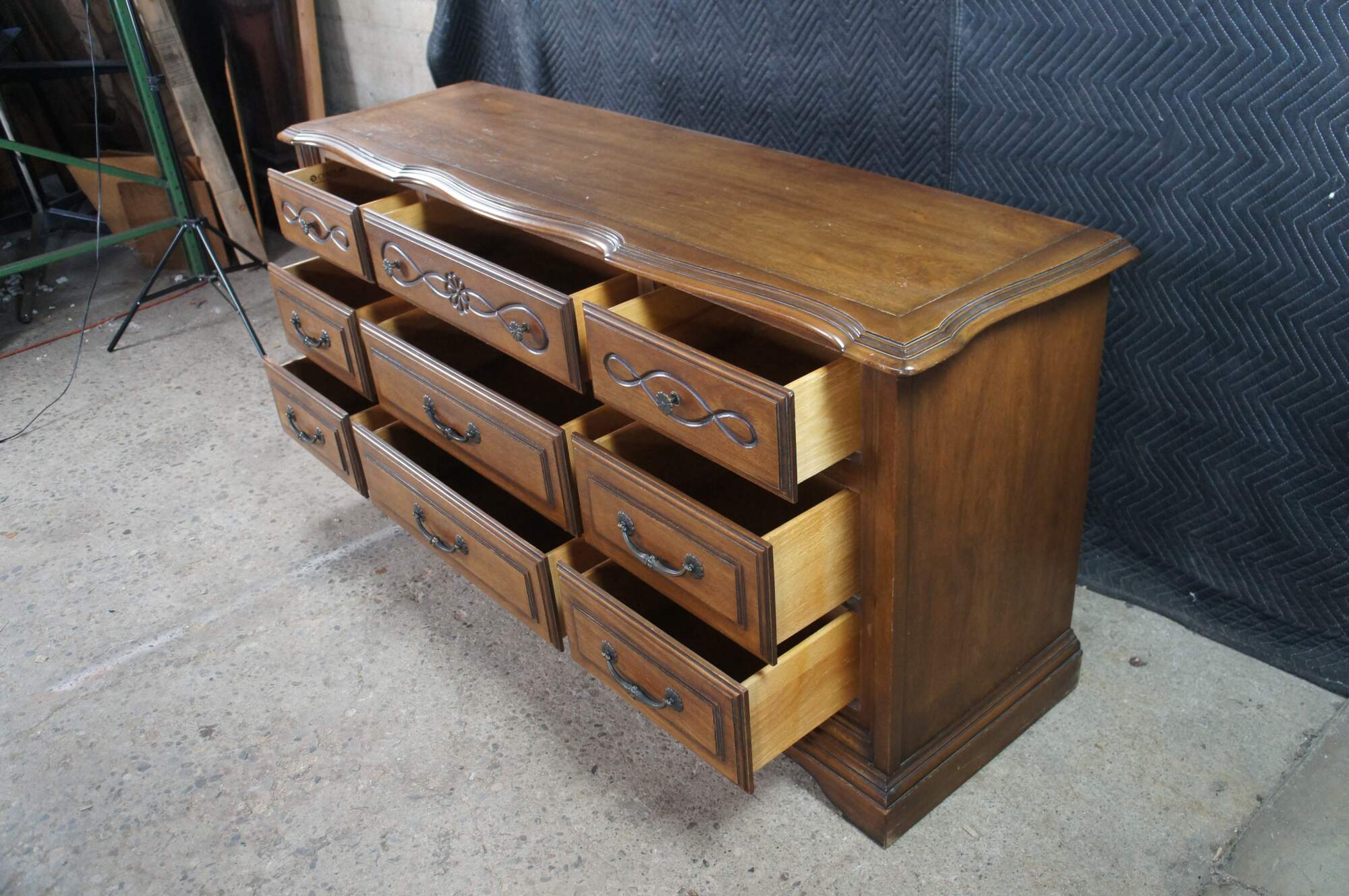 Late 20th Century French Country Triple Dresser by Century Furniture. Features a rectangular made from oak with serpentine top over nine drawers with brass hardware. Drawer fronts have a molded center and edge. The dresser is supported by a plinth base with molded feet.