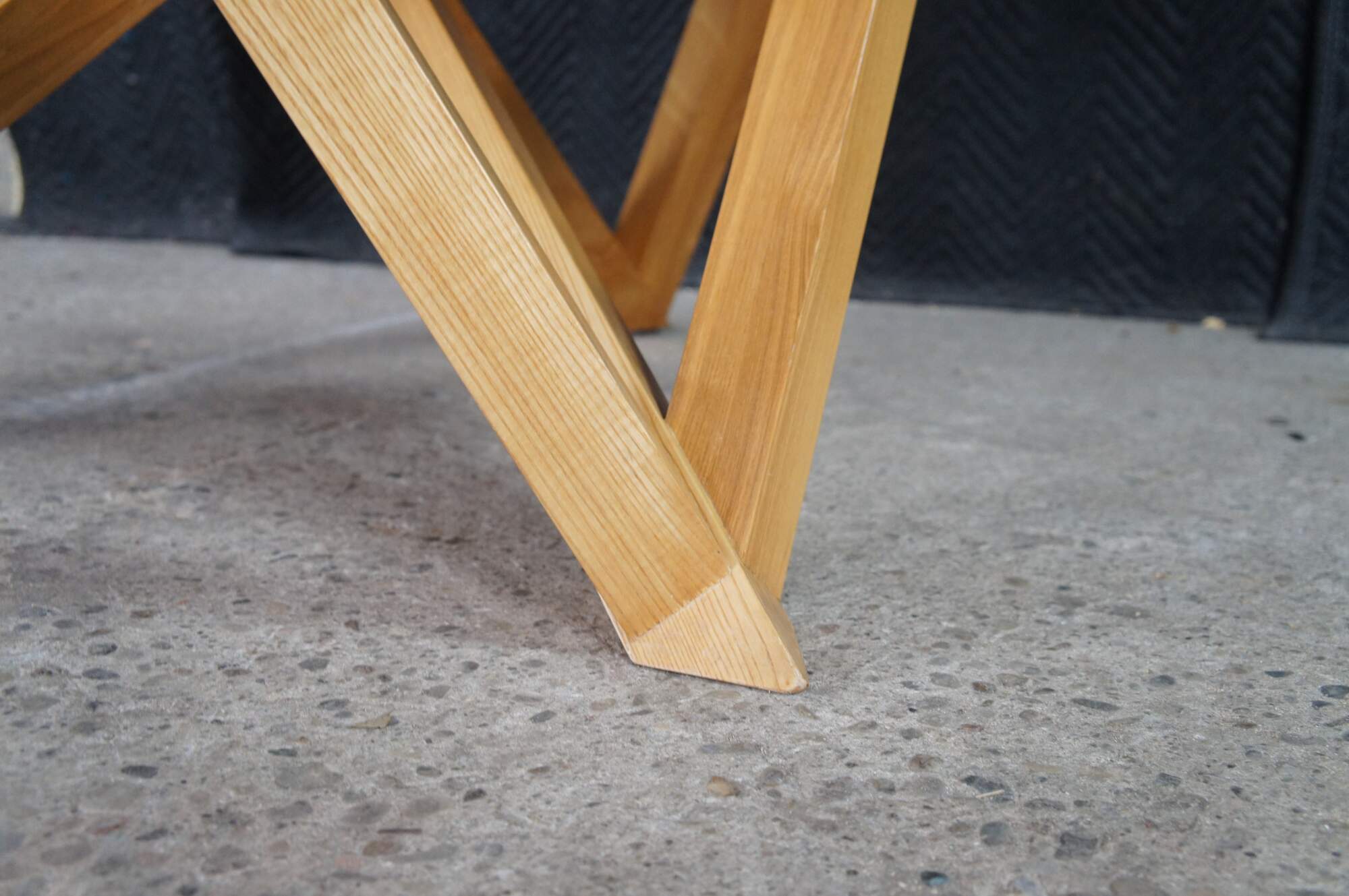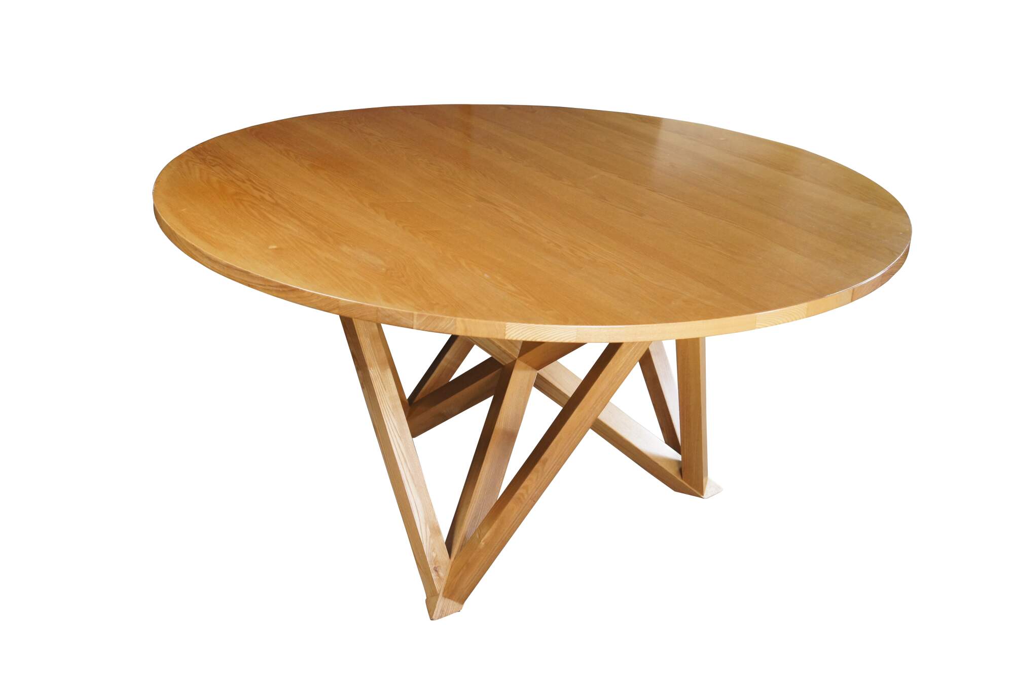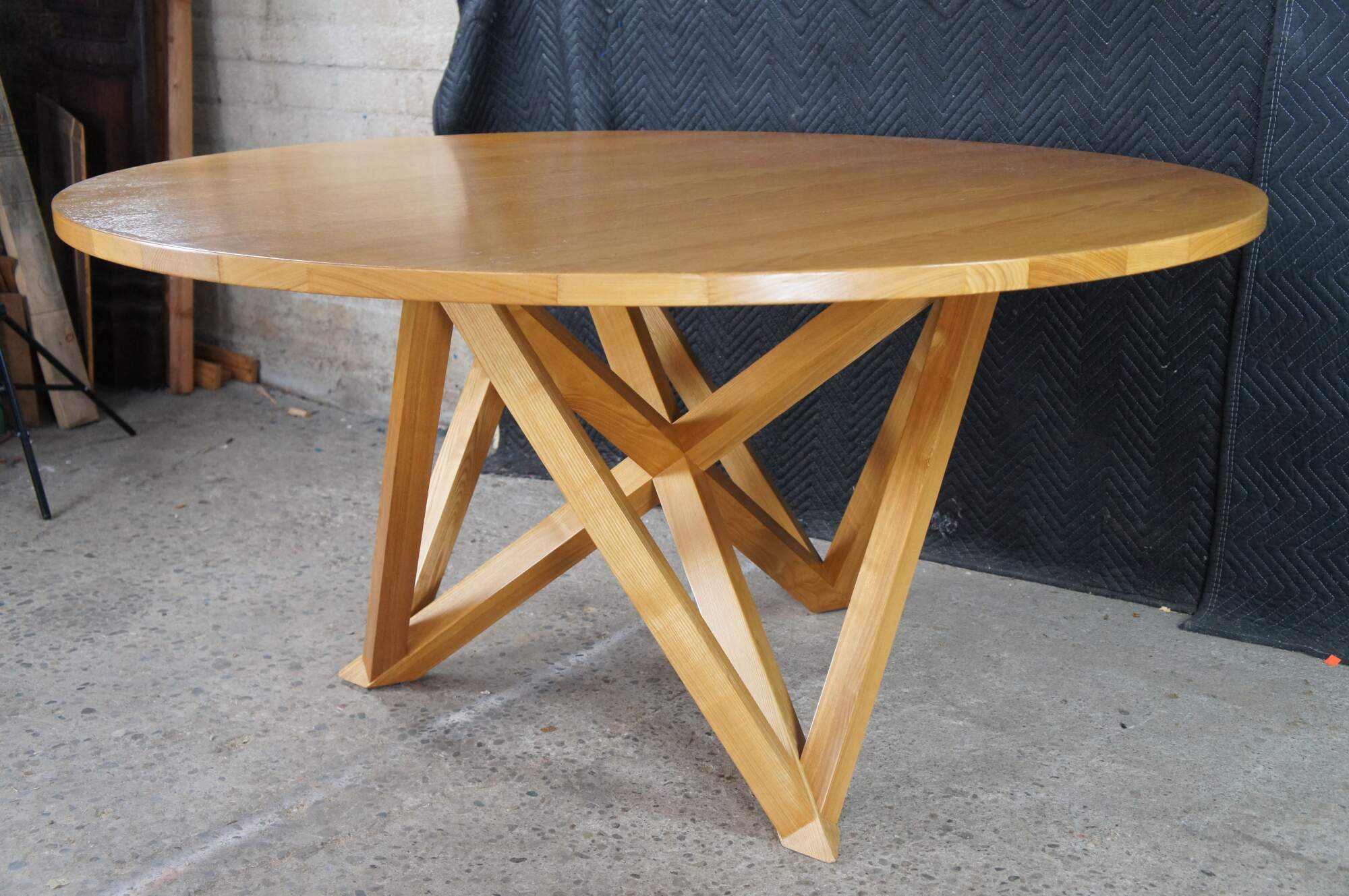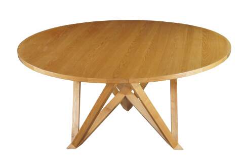 Features a round ash top over a geometric modernist base. Great for use in a game room or dining / breakfast nook. Includes Glass top.