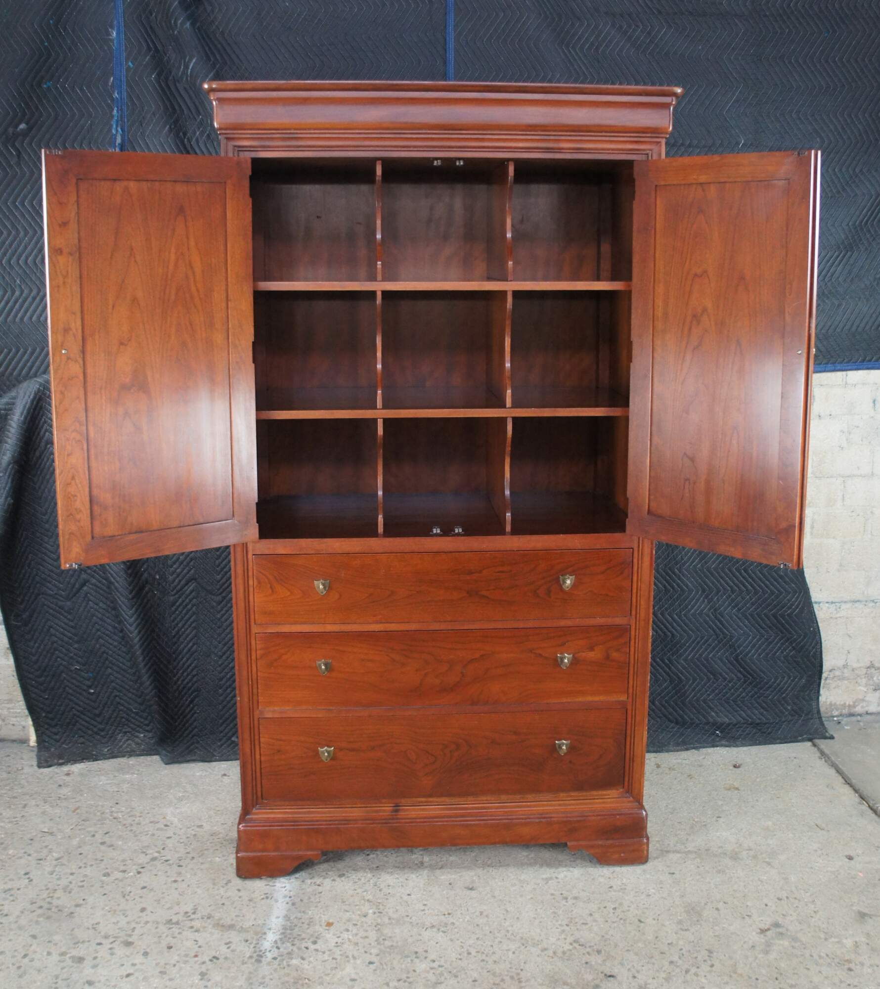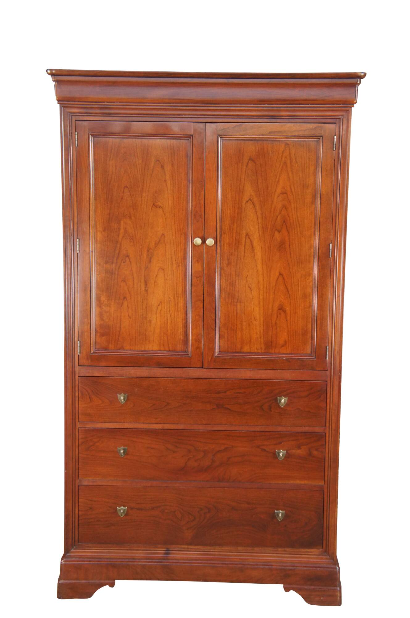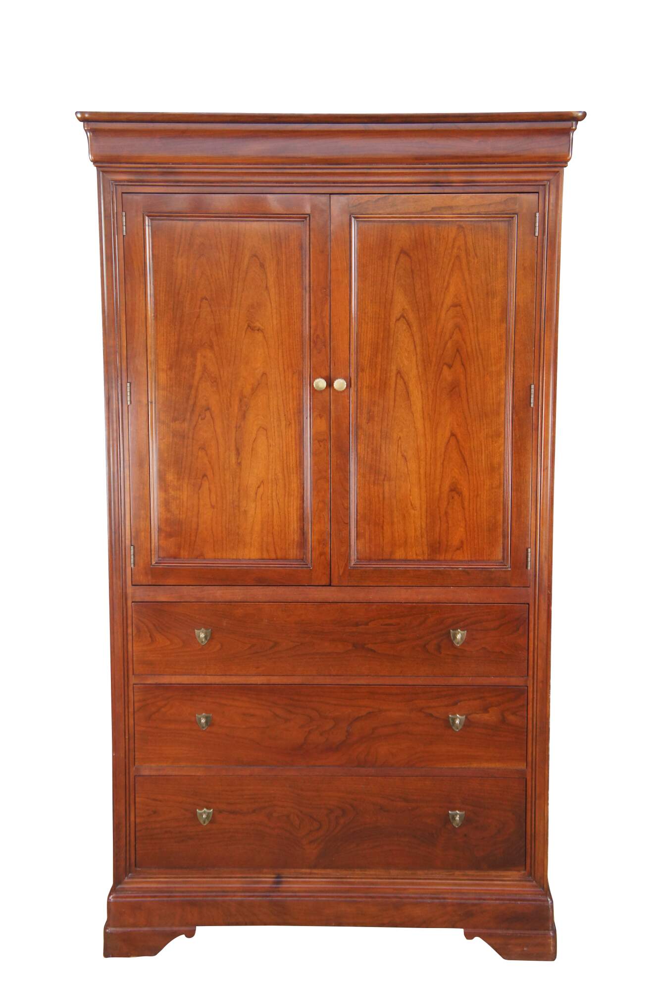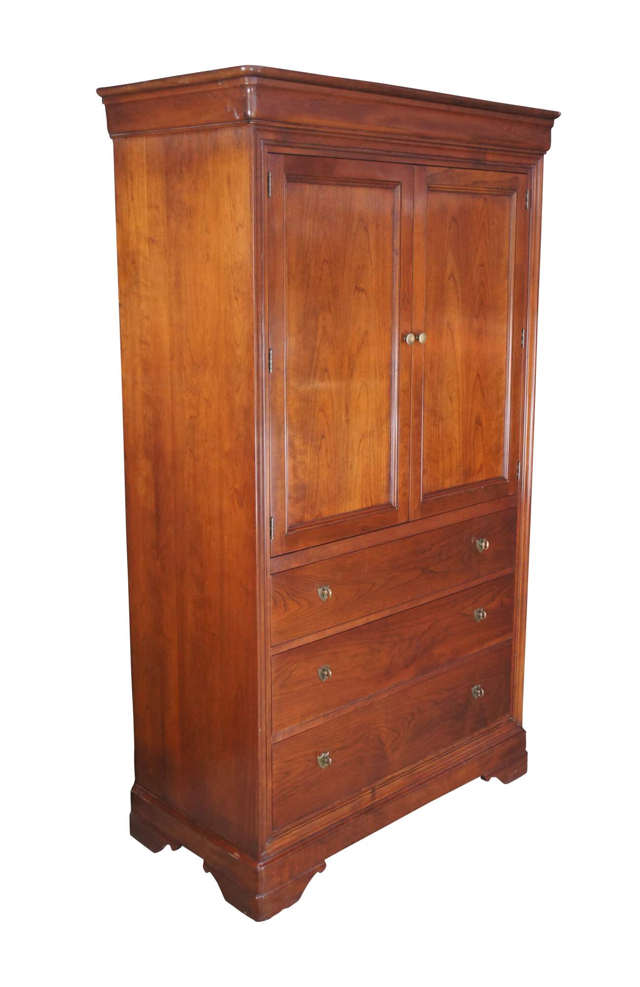 Stickley French Louis Philippe Style Armoire, #7808, circa 2005. Made from solid cherry with two doors opening to a divided interior over three lower dovetailed drawers with brass hardware. Drawer pulls have shield plates. The dresser is supported by a plinth base with bracket feet.