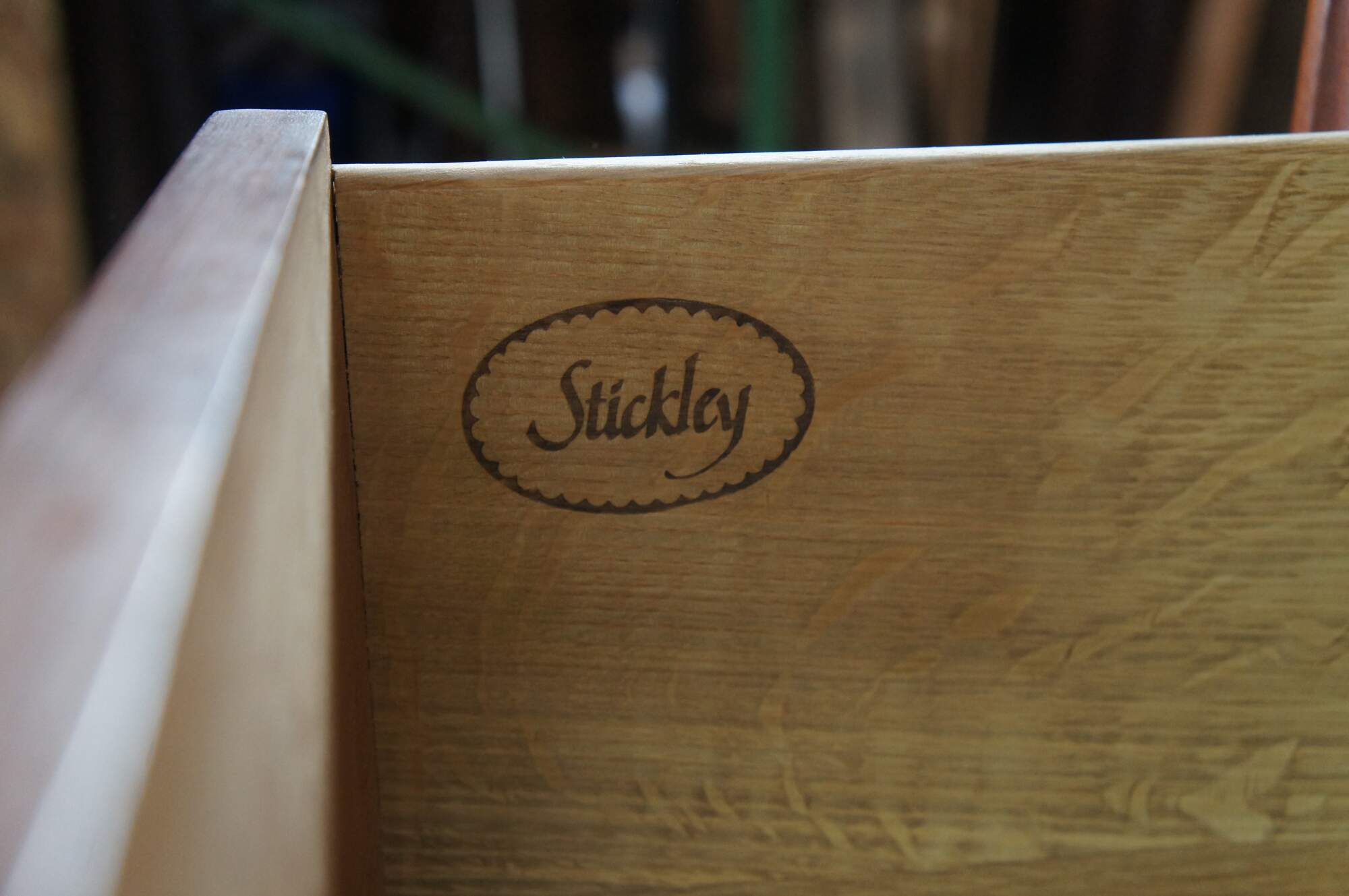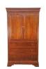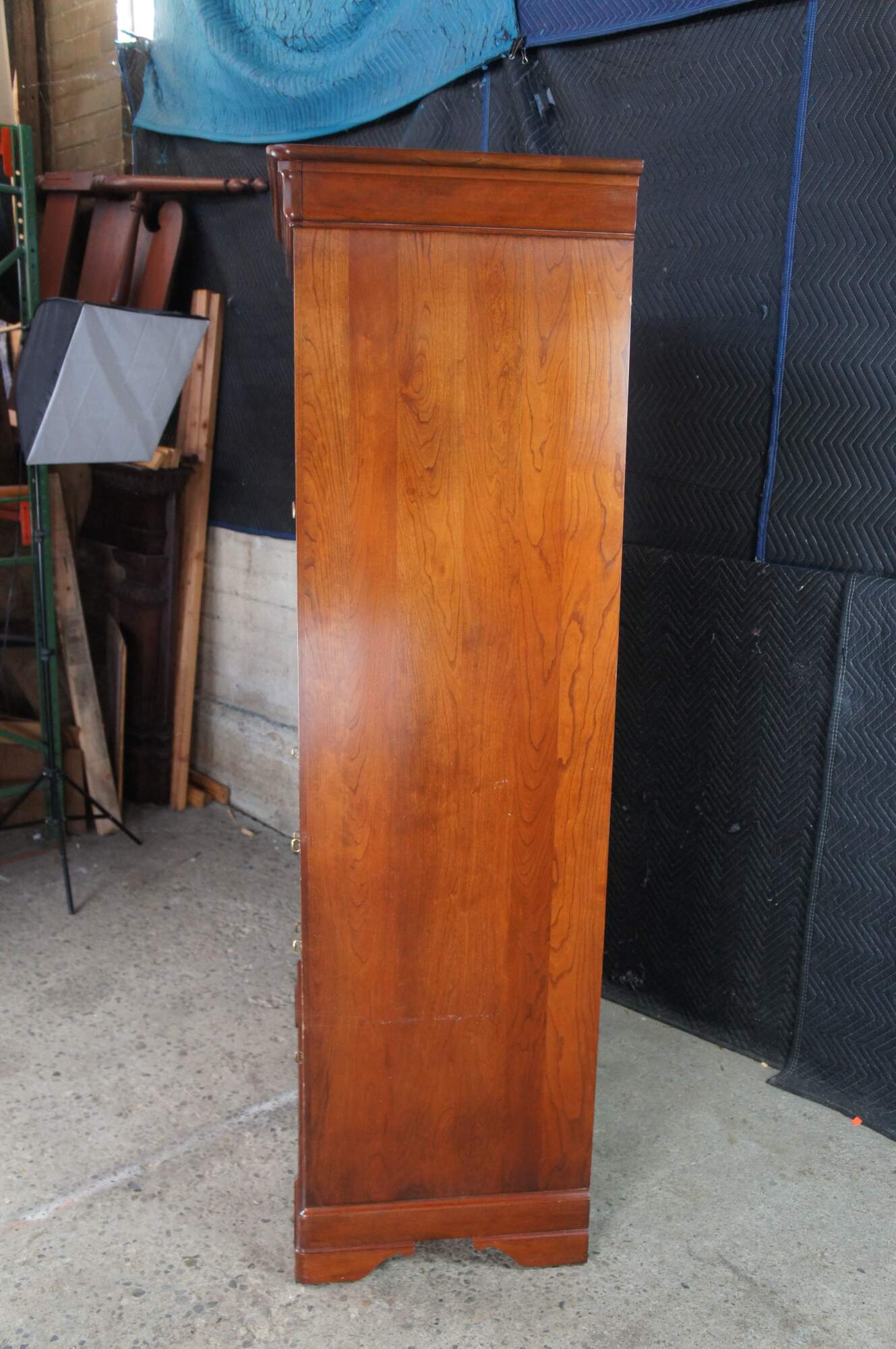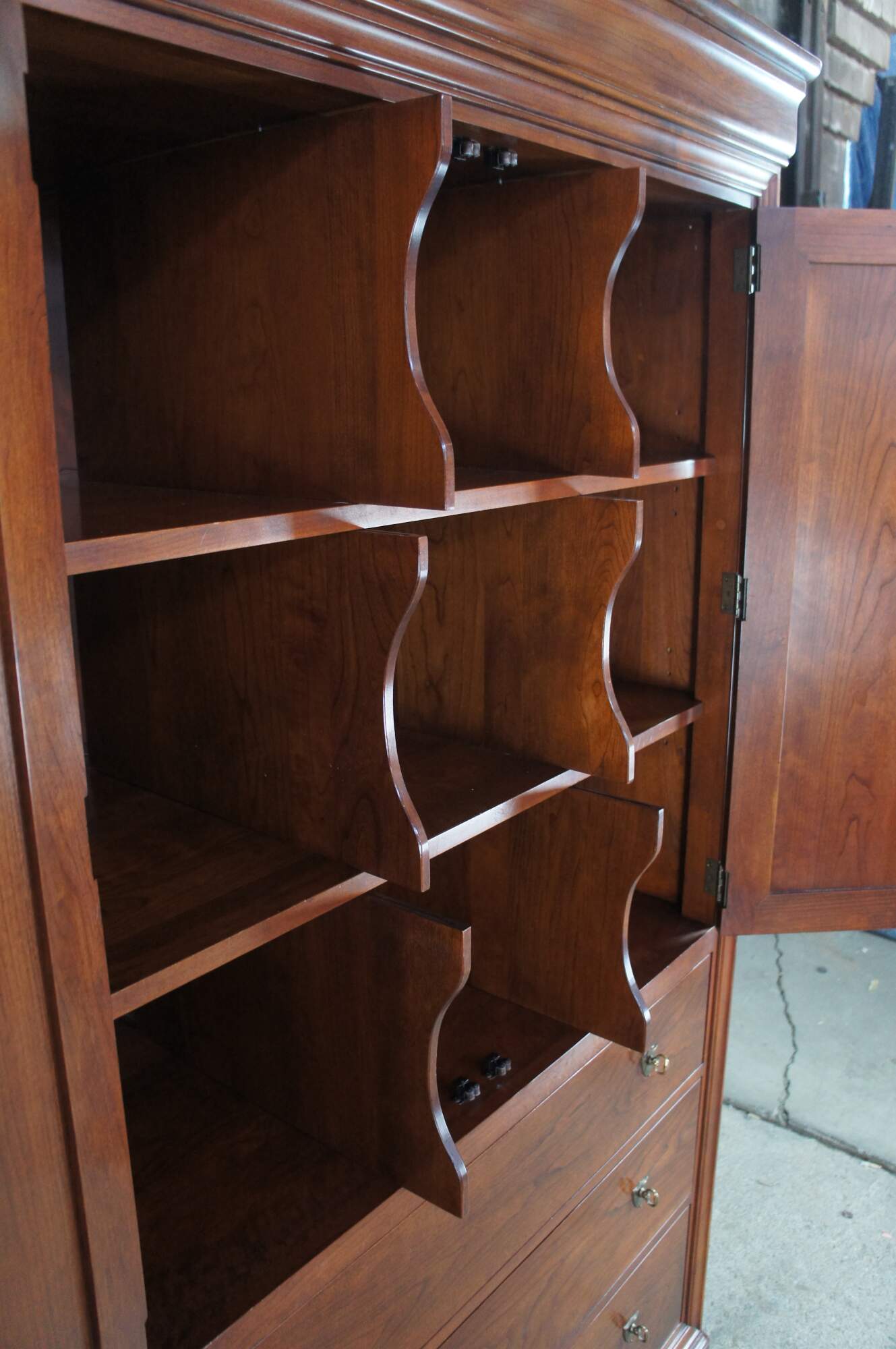 Stickley French Louis Philippe Style Armoire, #7808, circa 2005. Made from solid cherry with two doors opening to a divided interior over three lower dovetailed drawers with brass hardware. Drawer pulls have shield plates. The dresser is supported by a plinth base with bracket feet.