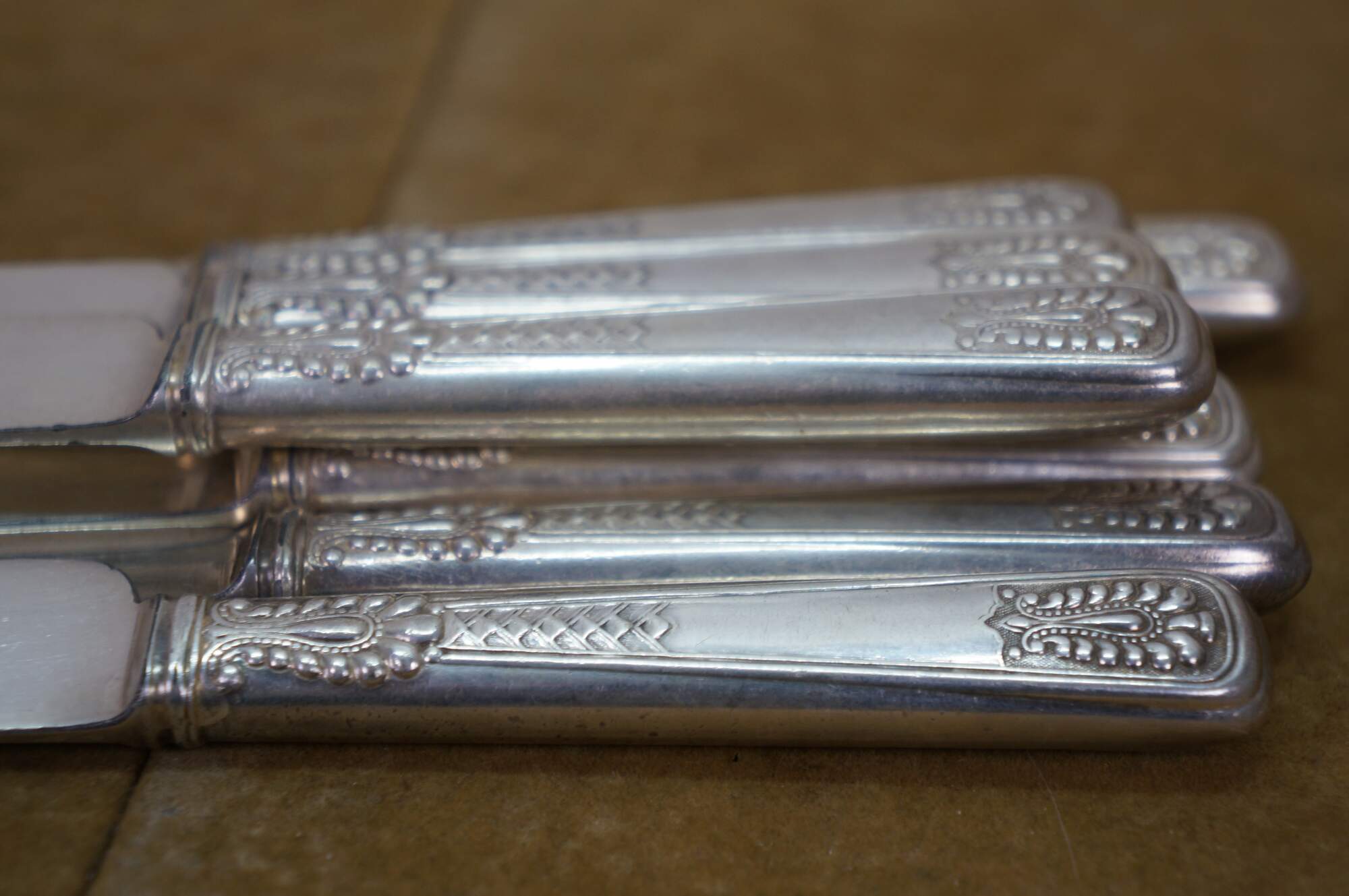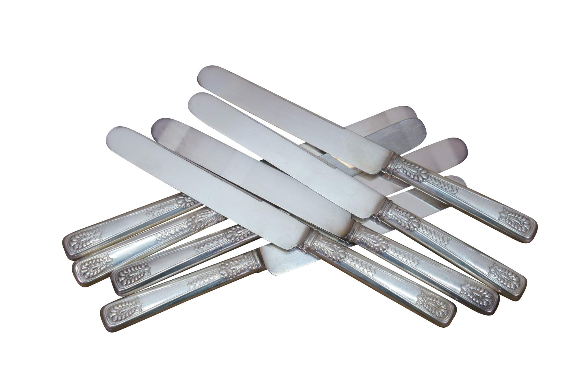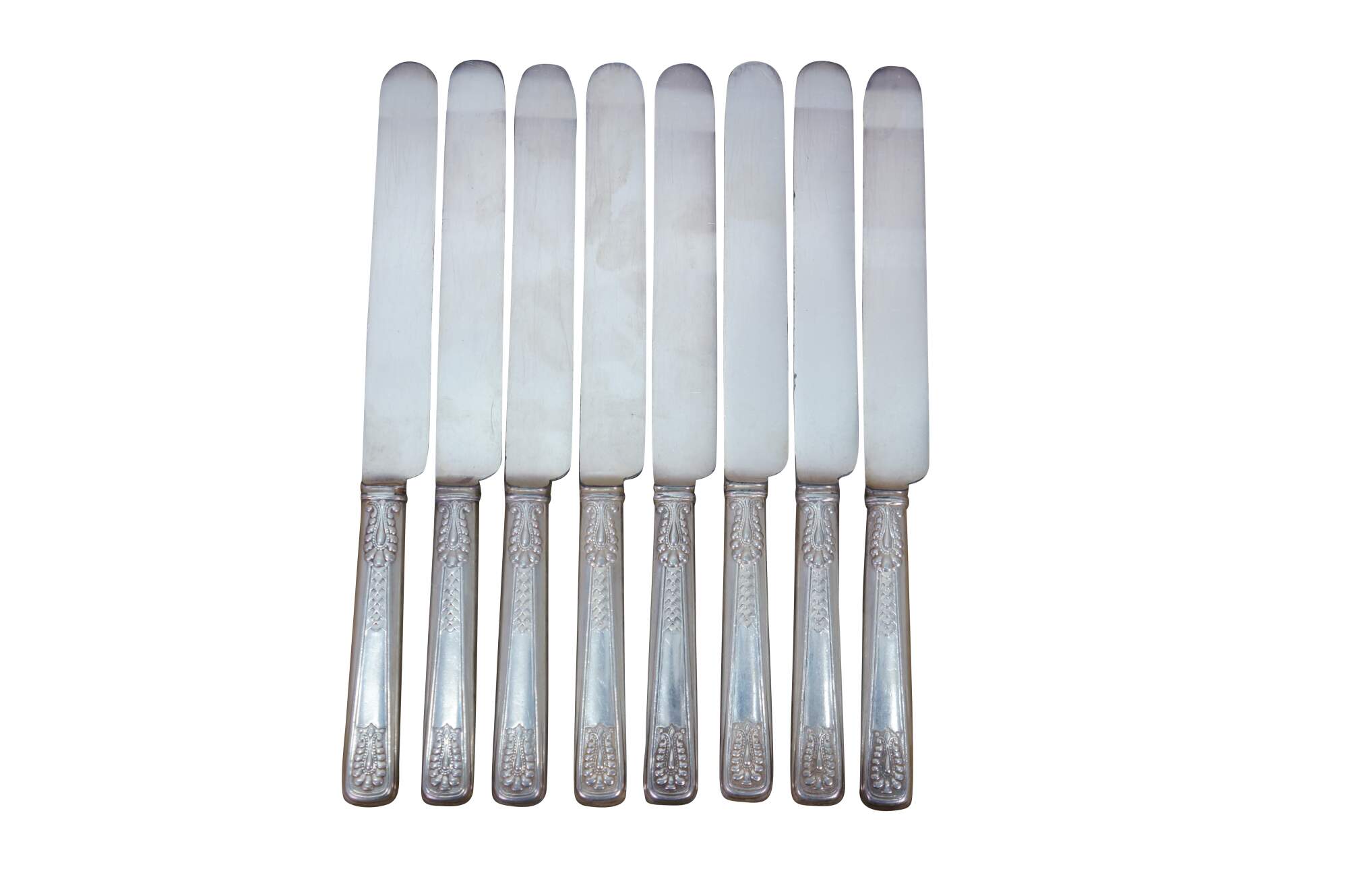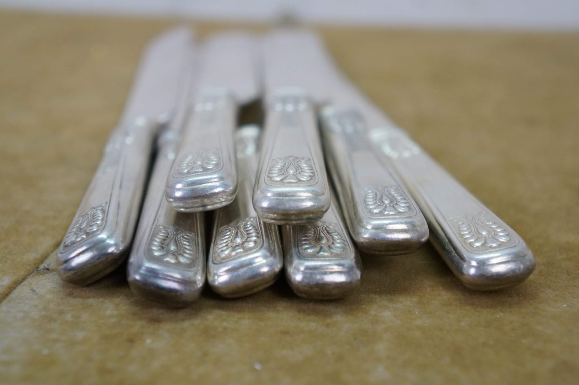 Eight antique Towle Silver plated dinner knives in the Norwood pattern. Discontinued circa 1884. TWSNOR.