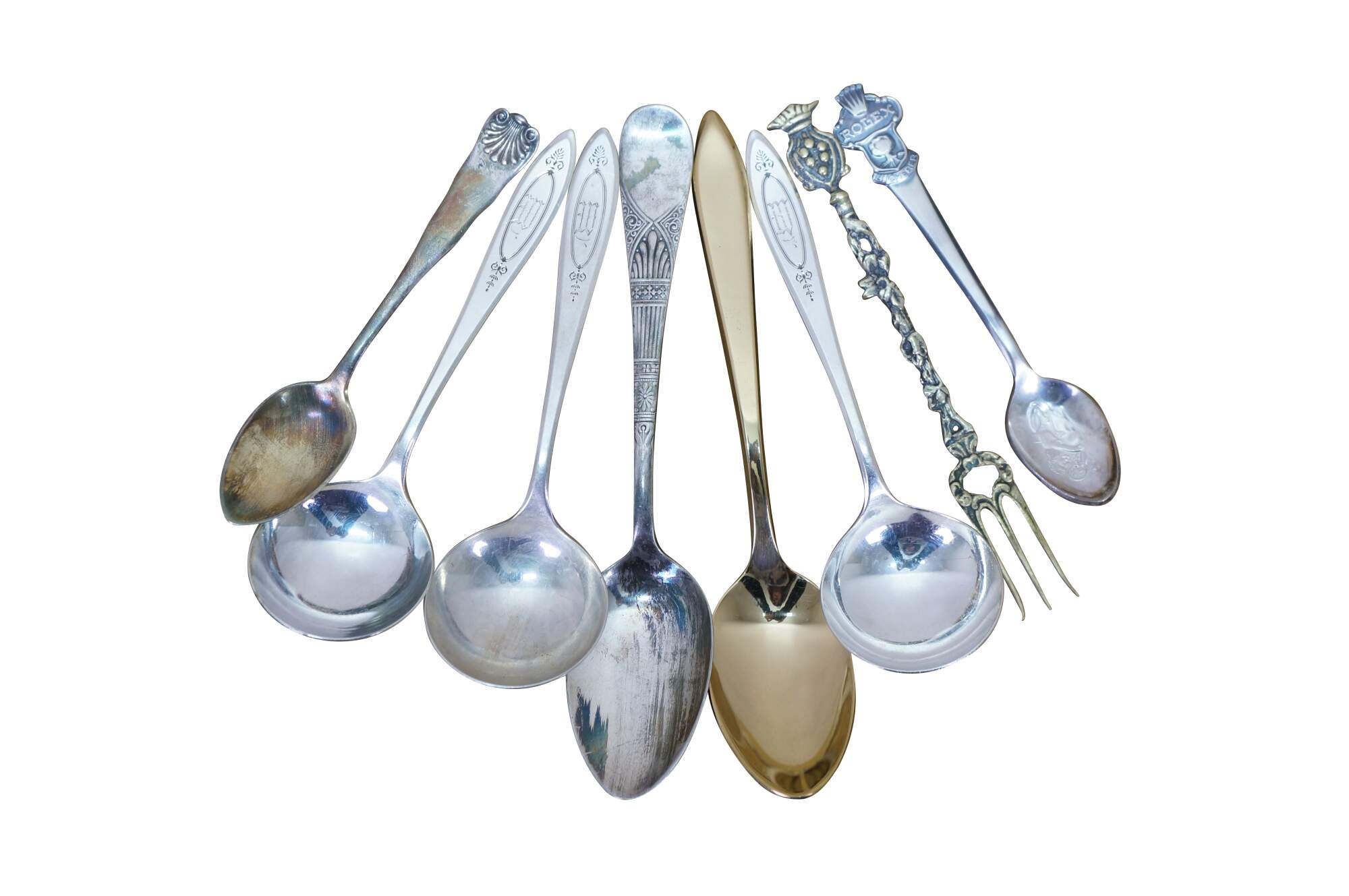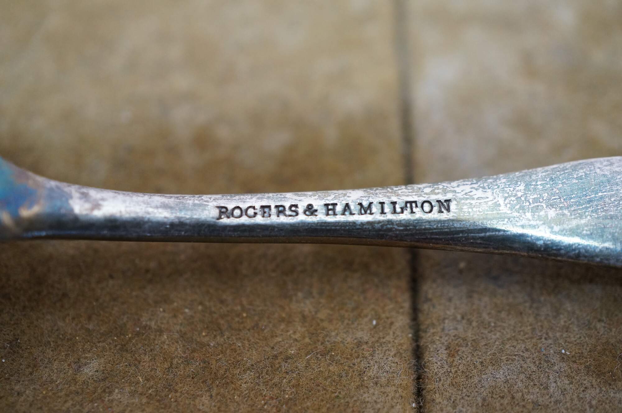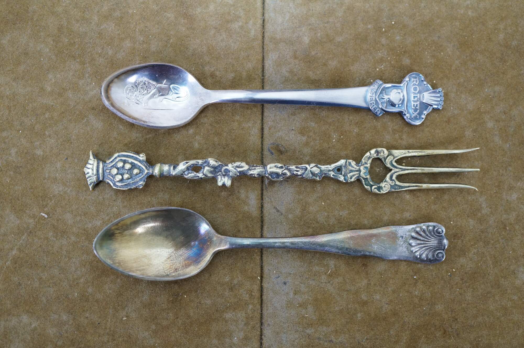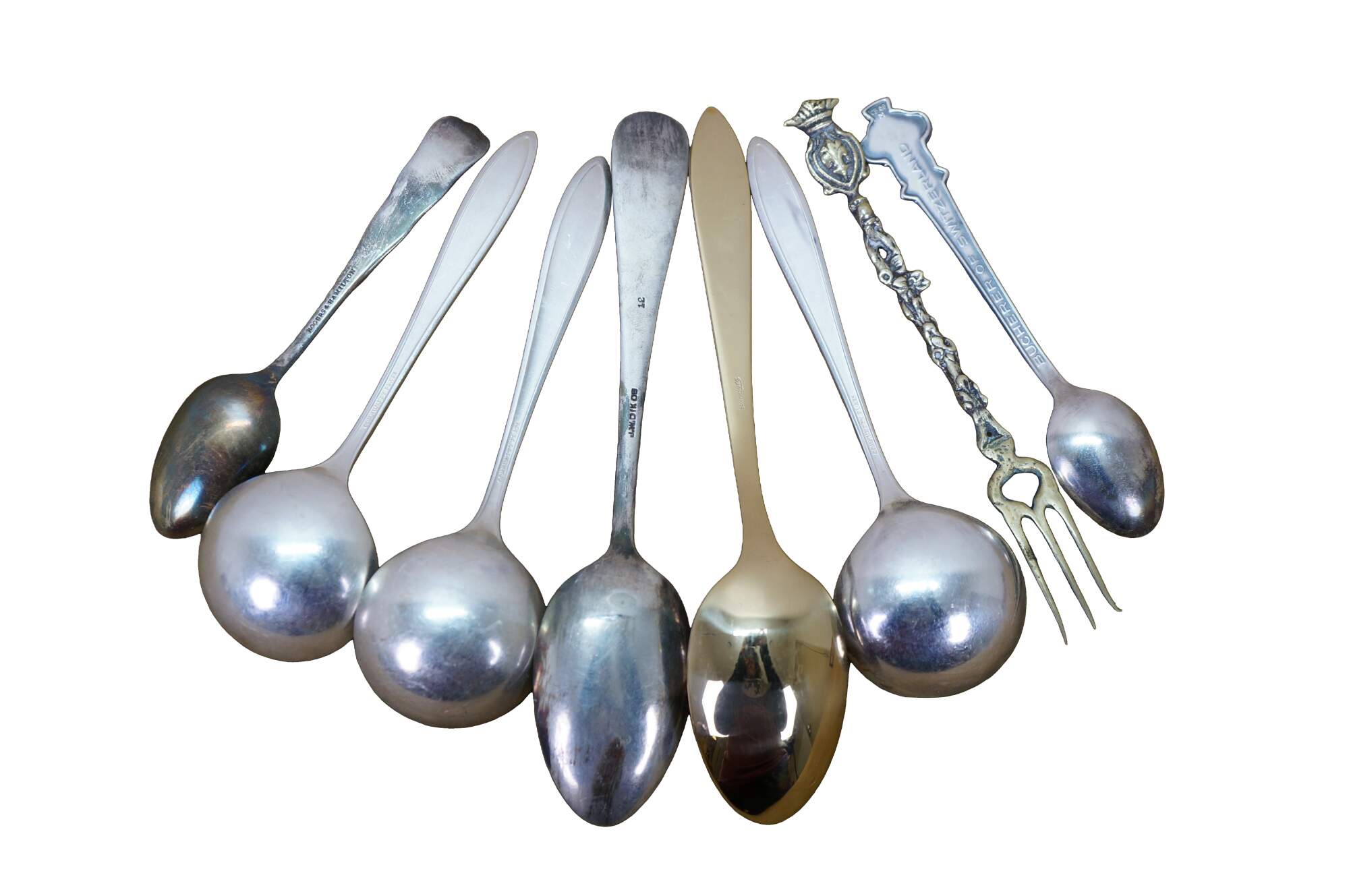 Eight vintage and antique silver-plated spoons and fork. Includes Rolex souvenir, bouillon, soup, berry, tea spoons and one cocktail fork. Rogers & Hamilton, Dynalyte, JW Dikob, Community plate.