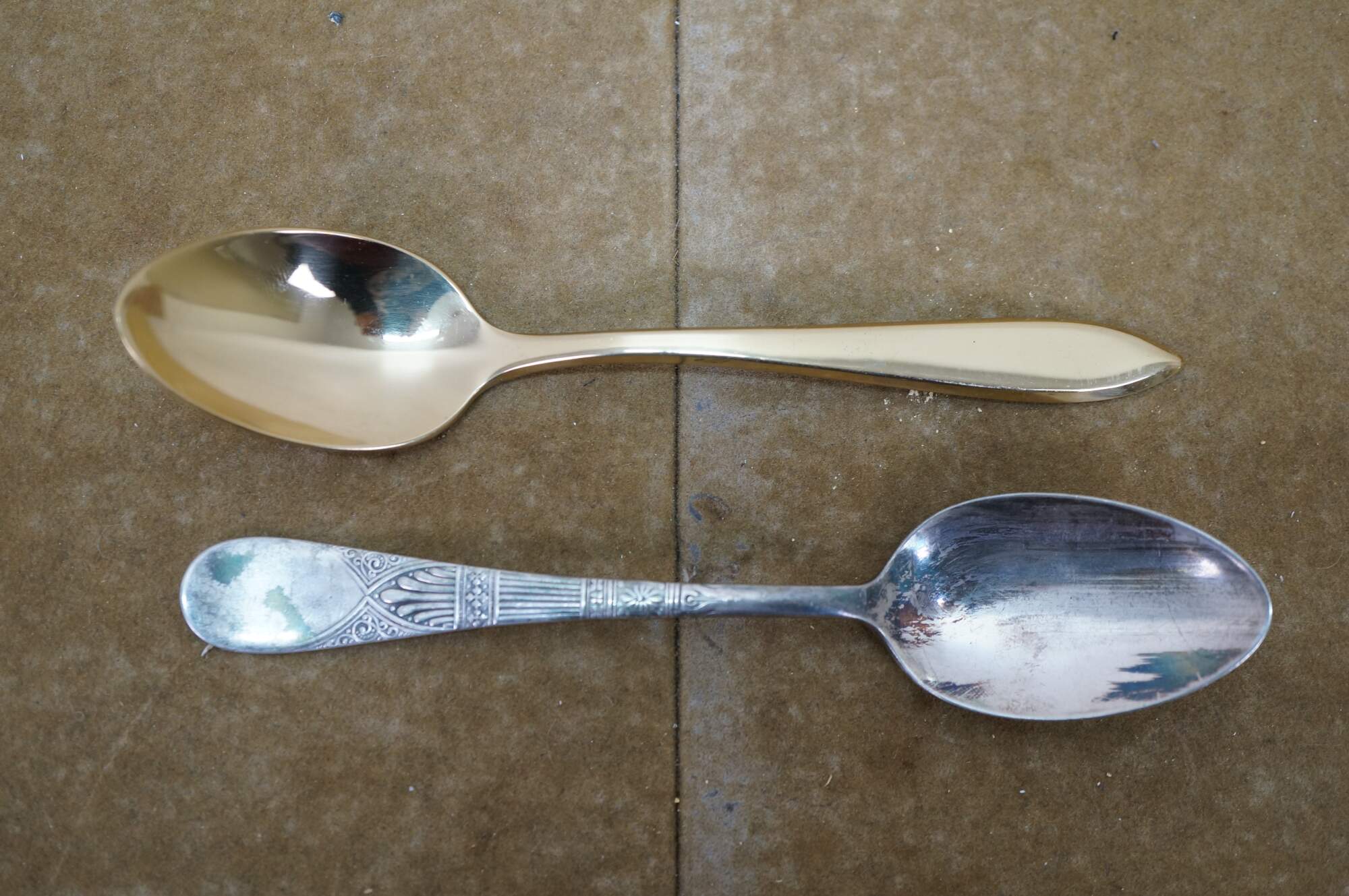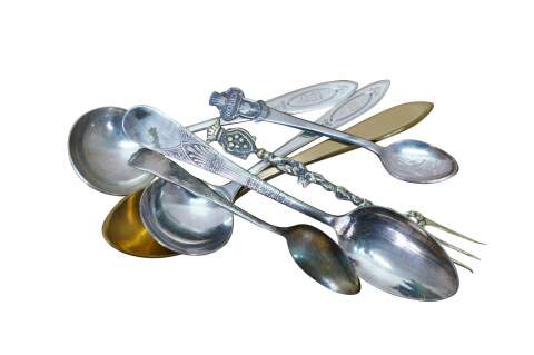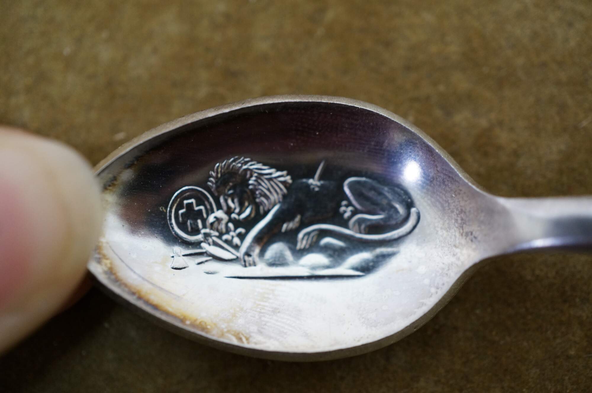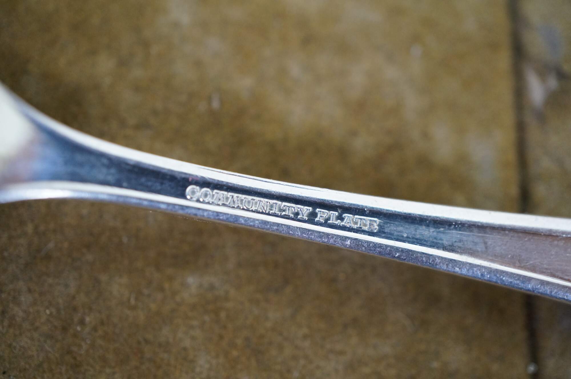 Eight vintage and antique silver-plated spoons and fork. Includes Rolex souvenir, bouillon, soup, berry, tea spoons and one cocktail fork. Rogers & Hamilton, Dynalyte, JW Dikob, Community plate.