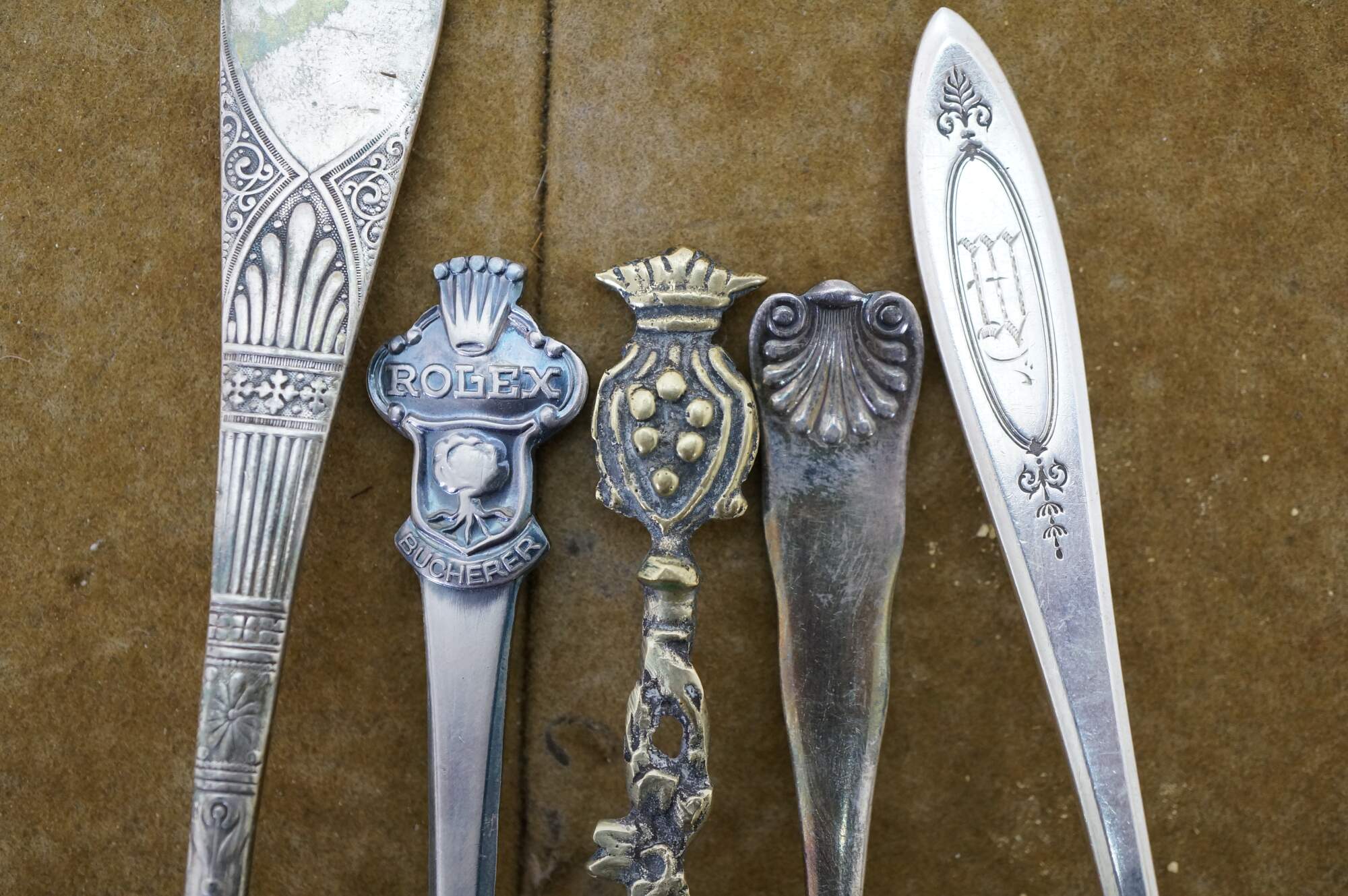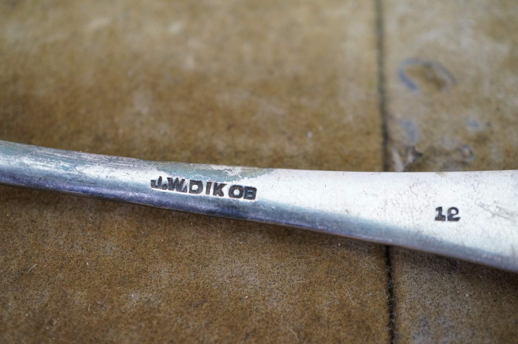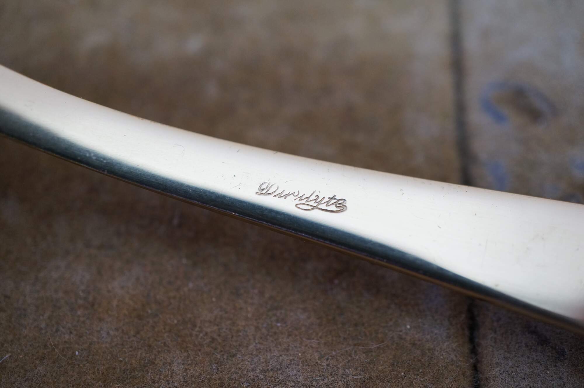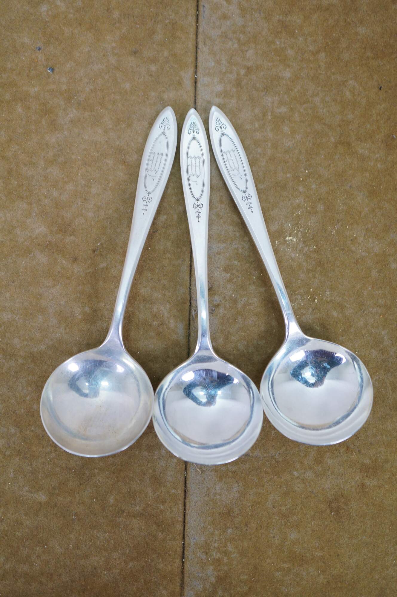 Eight vintage and antique silver-plated spoons and fork. Includes Rolex souvenir, bouillon, soup, berry, tea spoons and one cocktail fork. Rogers & Hamilton, Dynalyte, JW Dikob, Community plate.