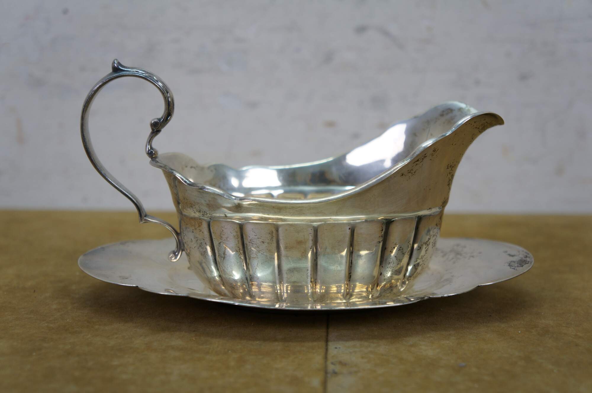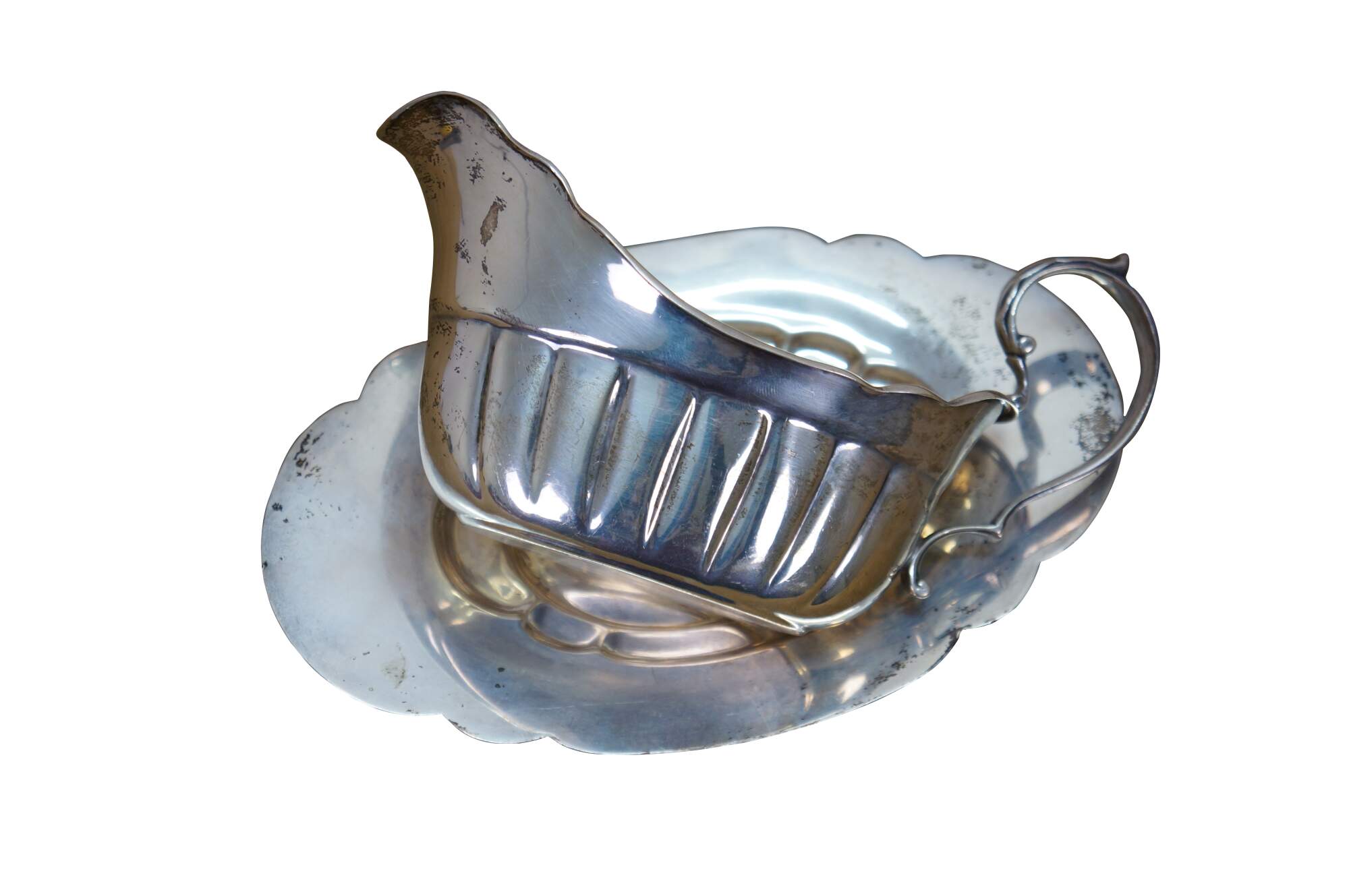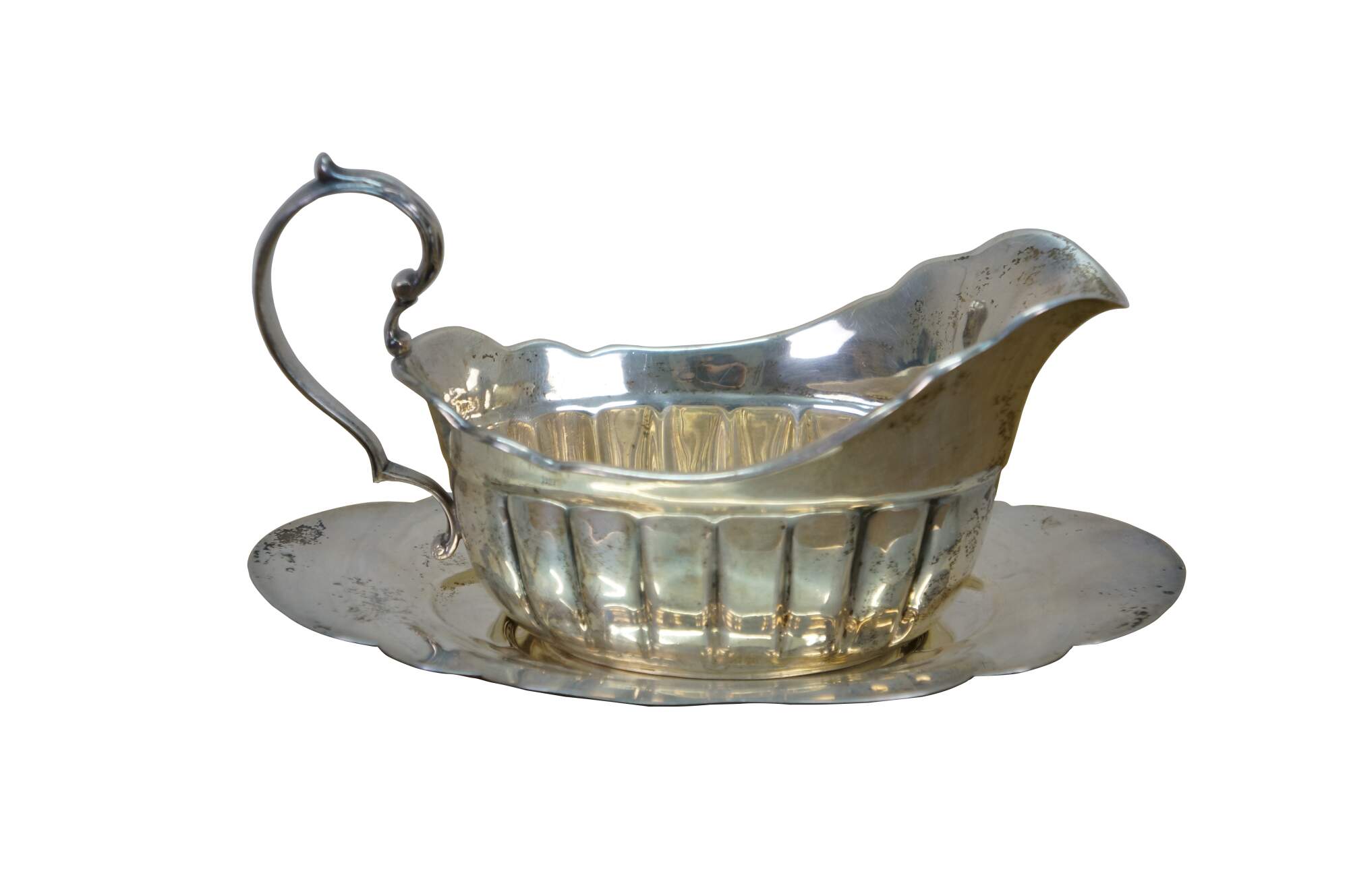 Antique Fisher Silversmiths sterling silver sauce / gravy boat and underplate tray featuring a ribbed or fluted body, a scrolled handle, and scalloped edges. Crown F Shield,1001.