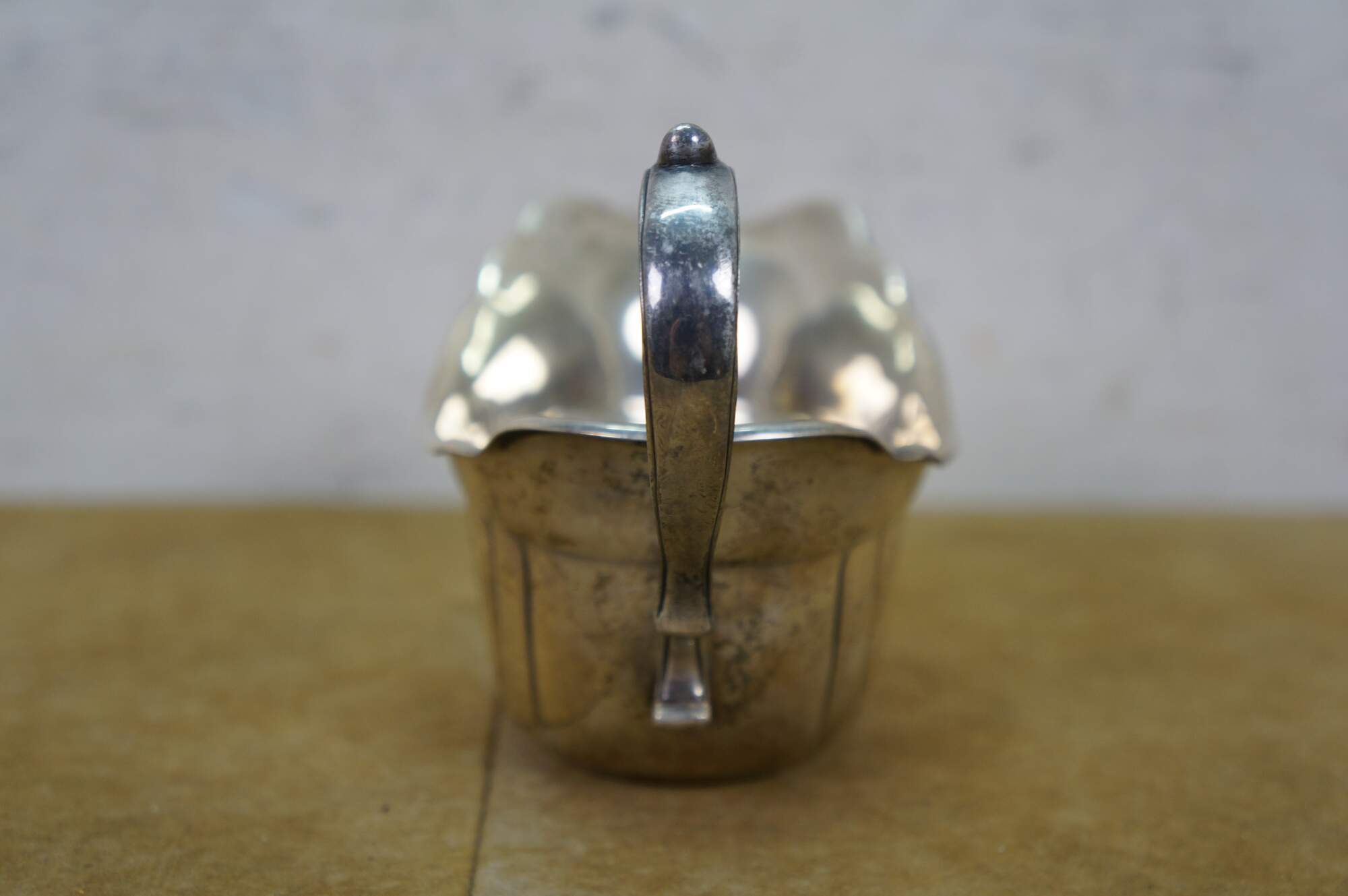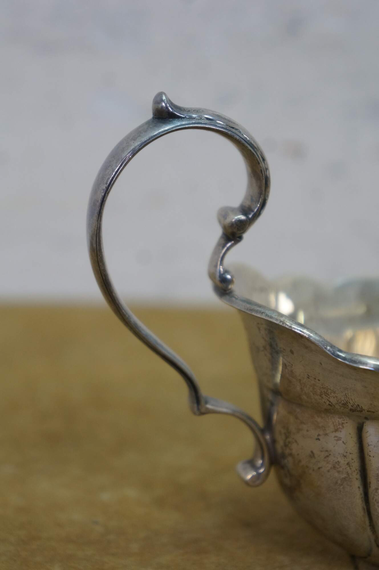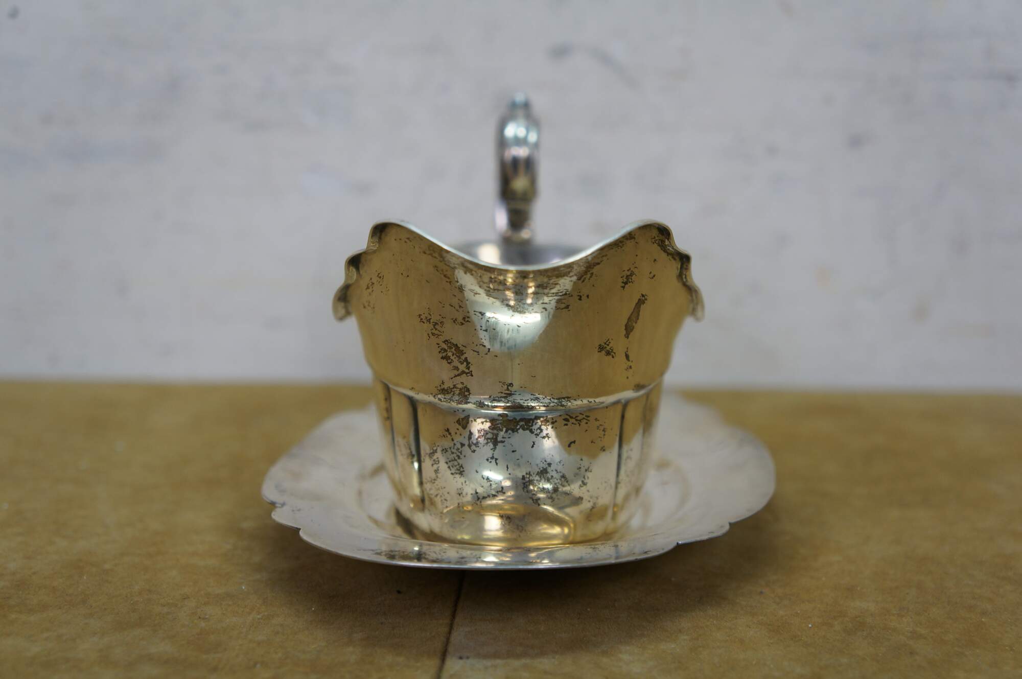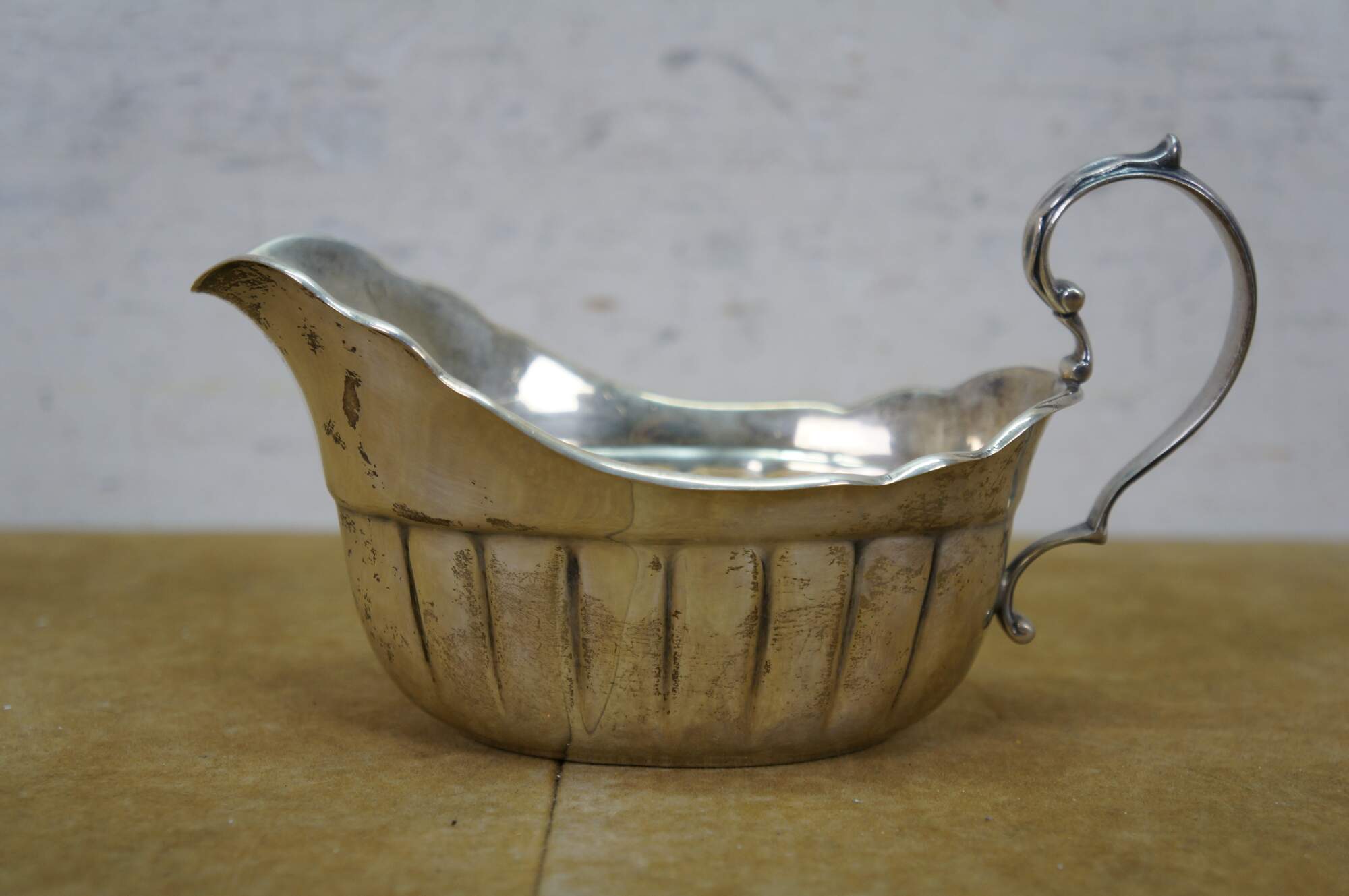 Antique Fisher Silversmiths sterling silver sauce / gravy boat and underplate tray featuring a ribbed or fluted body, a scrolled handle, and scalloped edges. Crown F Shield,1001.