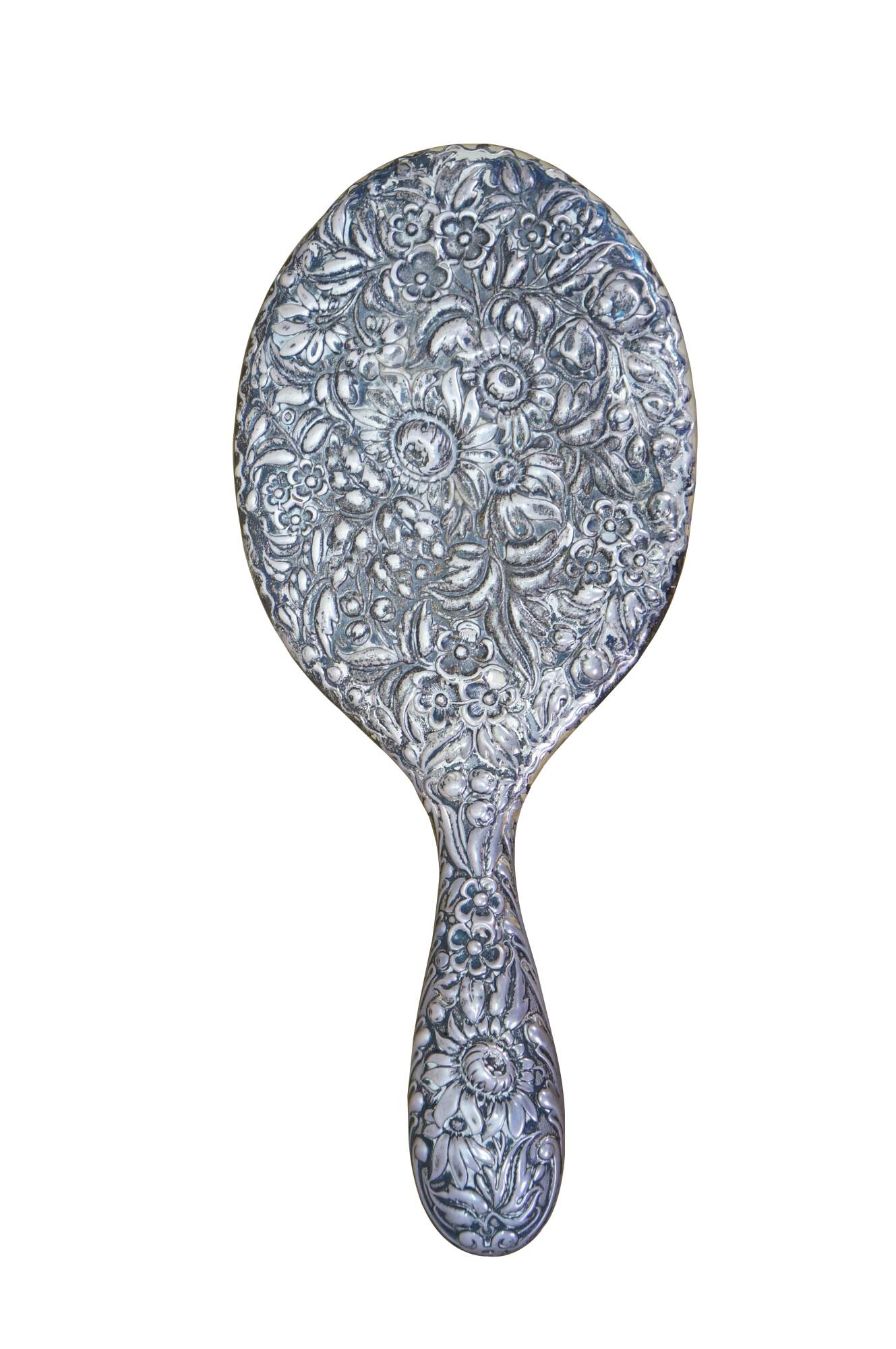Antique Dominick & Haff sterling silver 925 beveled hand vanity mirror featuring repousse high relief floral sunflower / daisy design. Circa 1889.