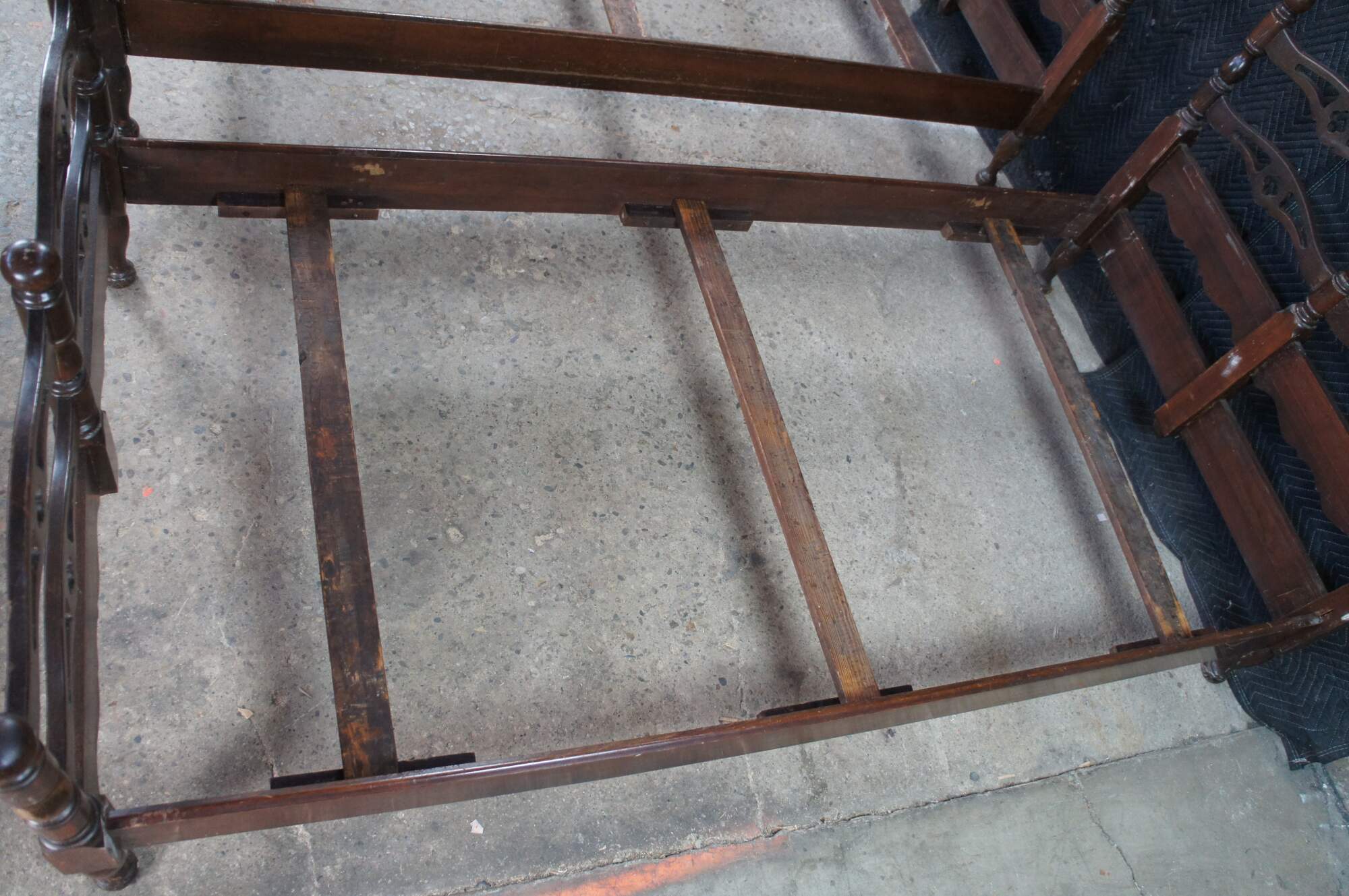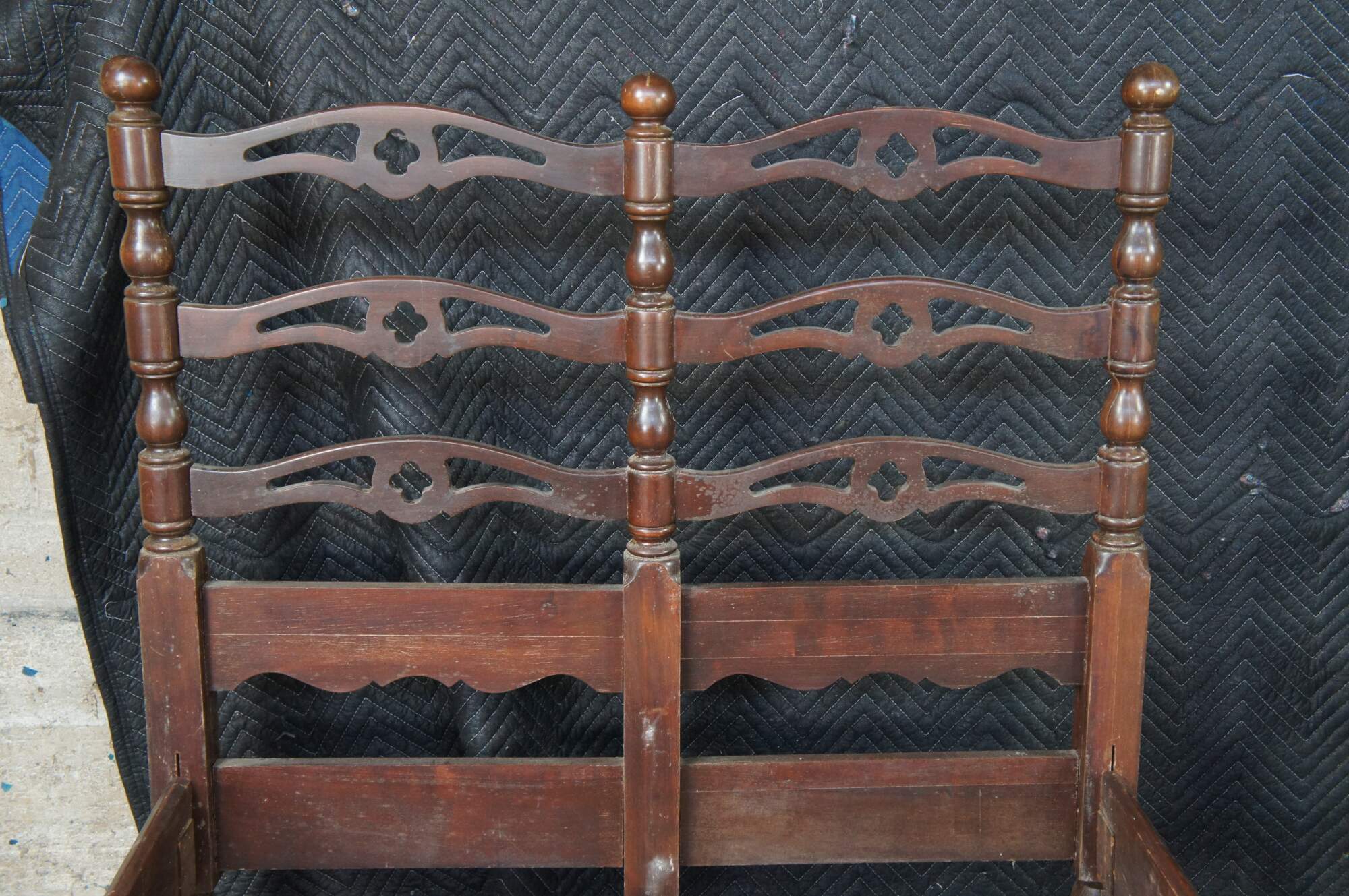 Mid Century American Colonial twin size beds. Made of oak featuring a reticulated ladderback design with pierced quatrefoil / four leaf clover accents.