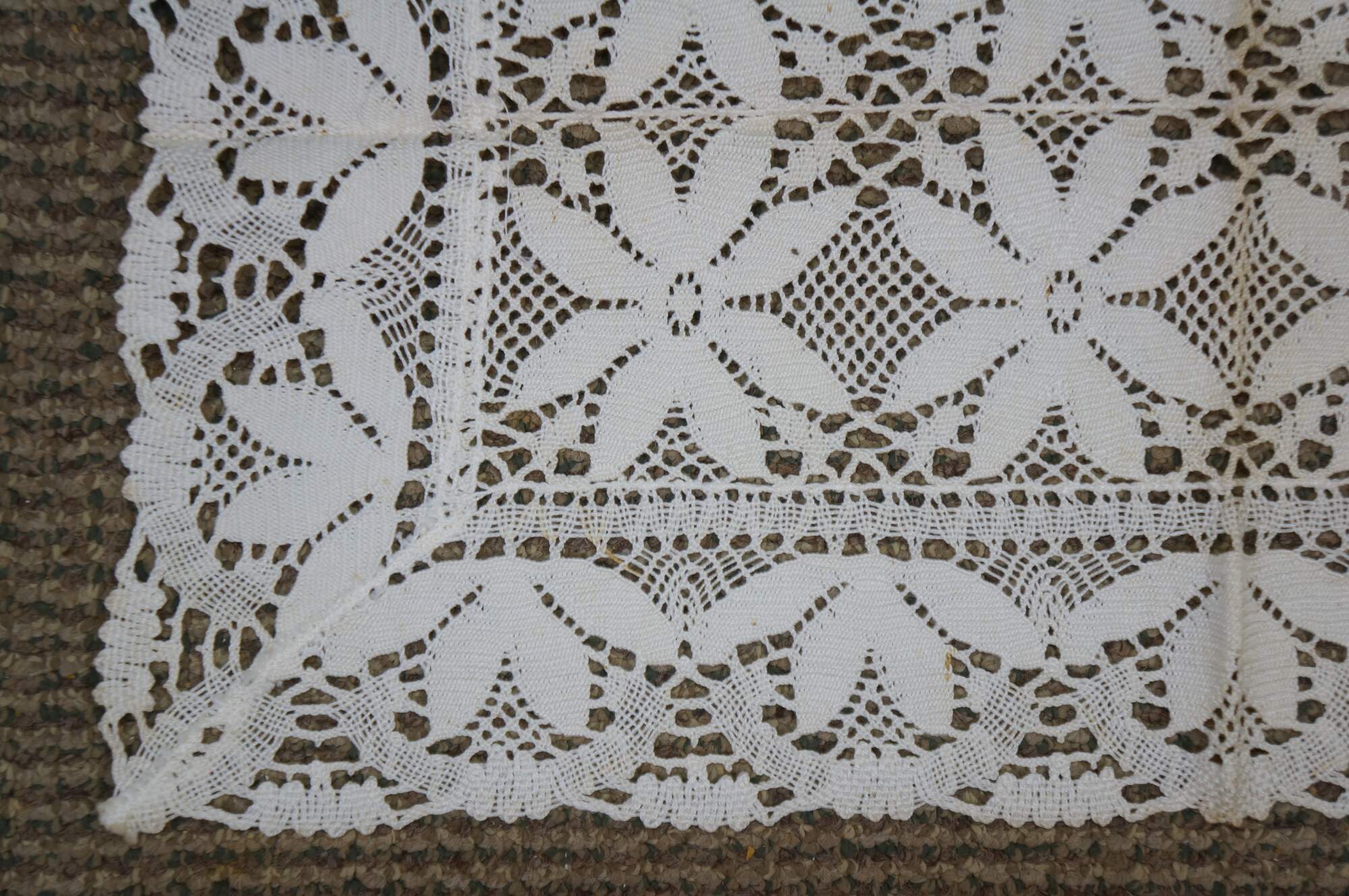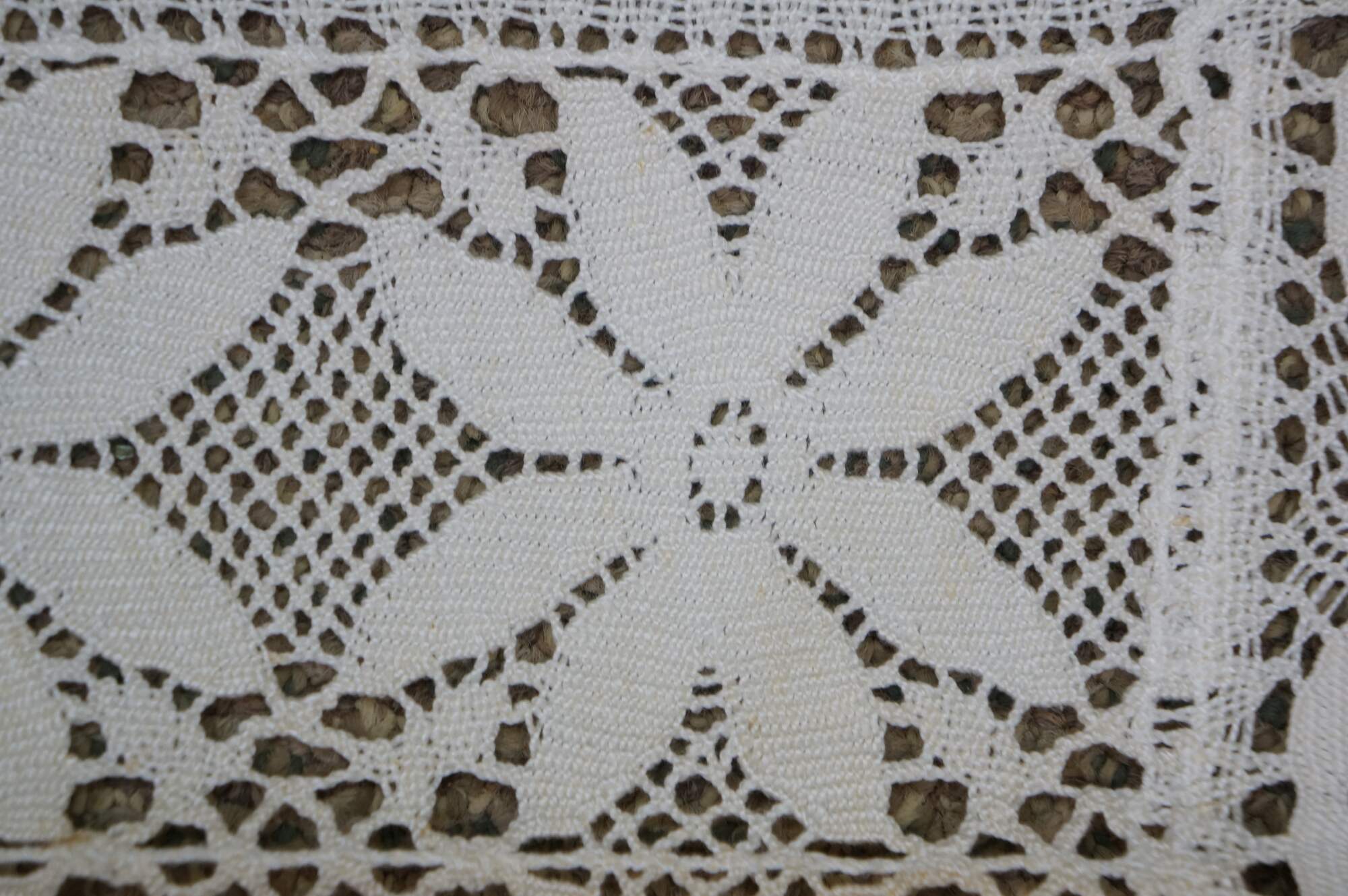 Vintage white Bobbin lace crochet doily place mat / table cloth featuring rectangular form with scalloped floral design. Made in Puy En Velay, France.