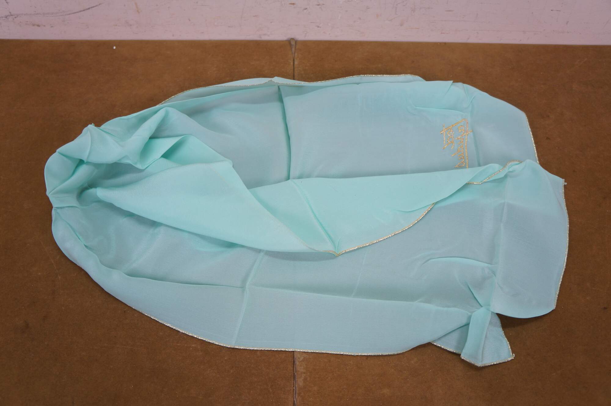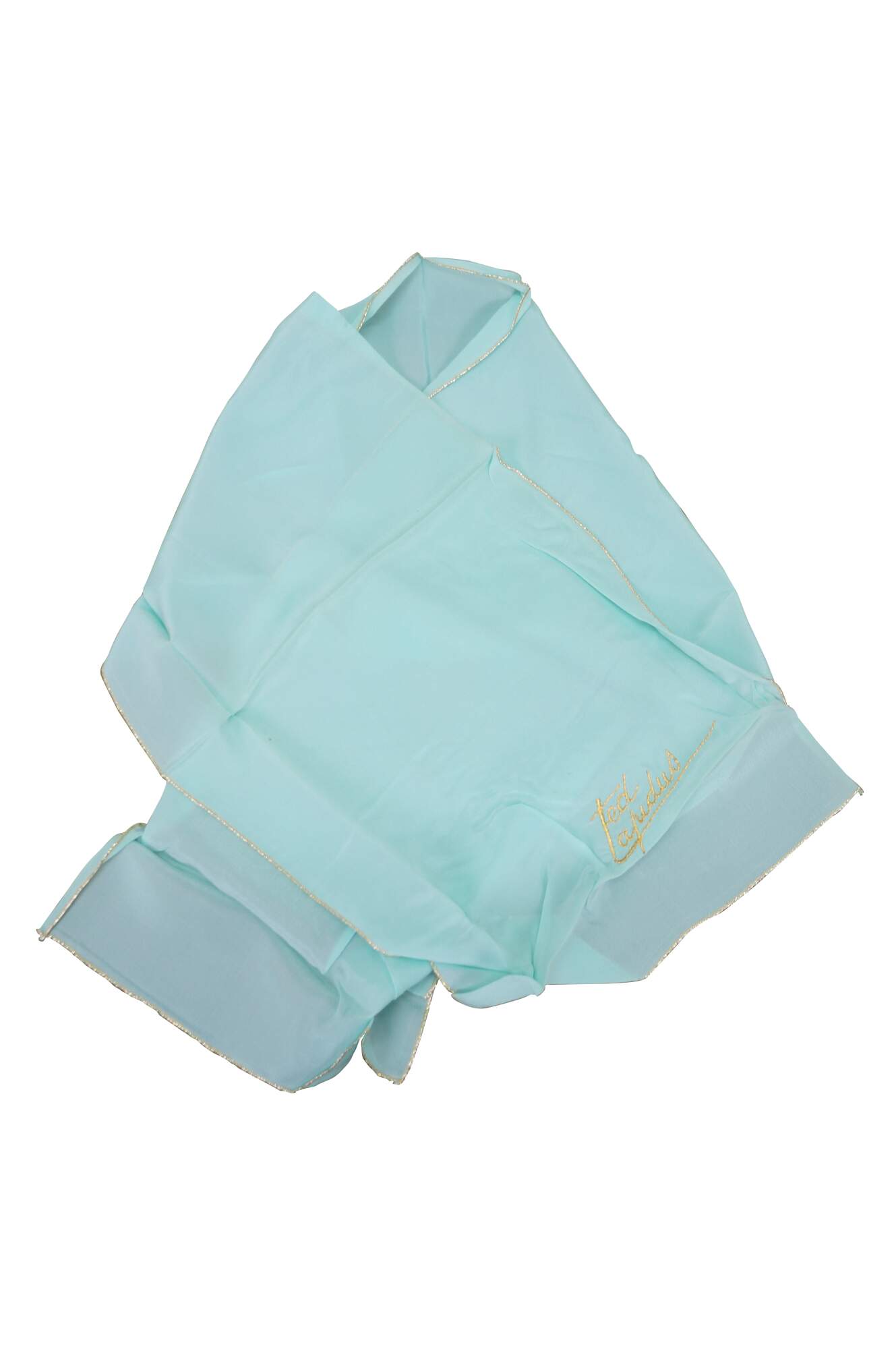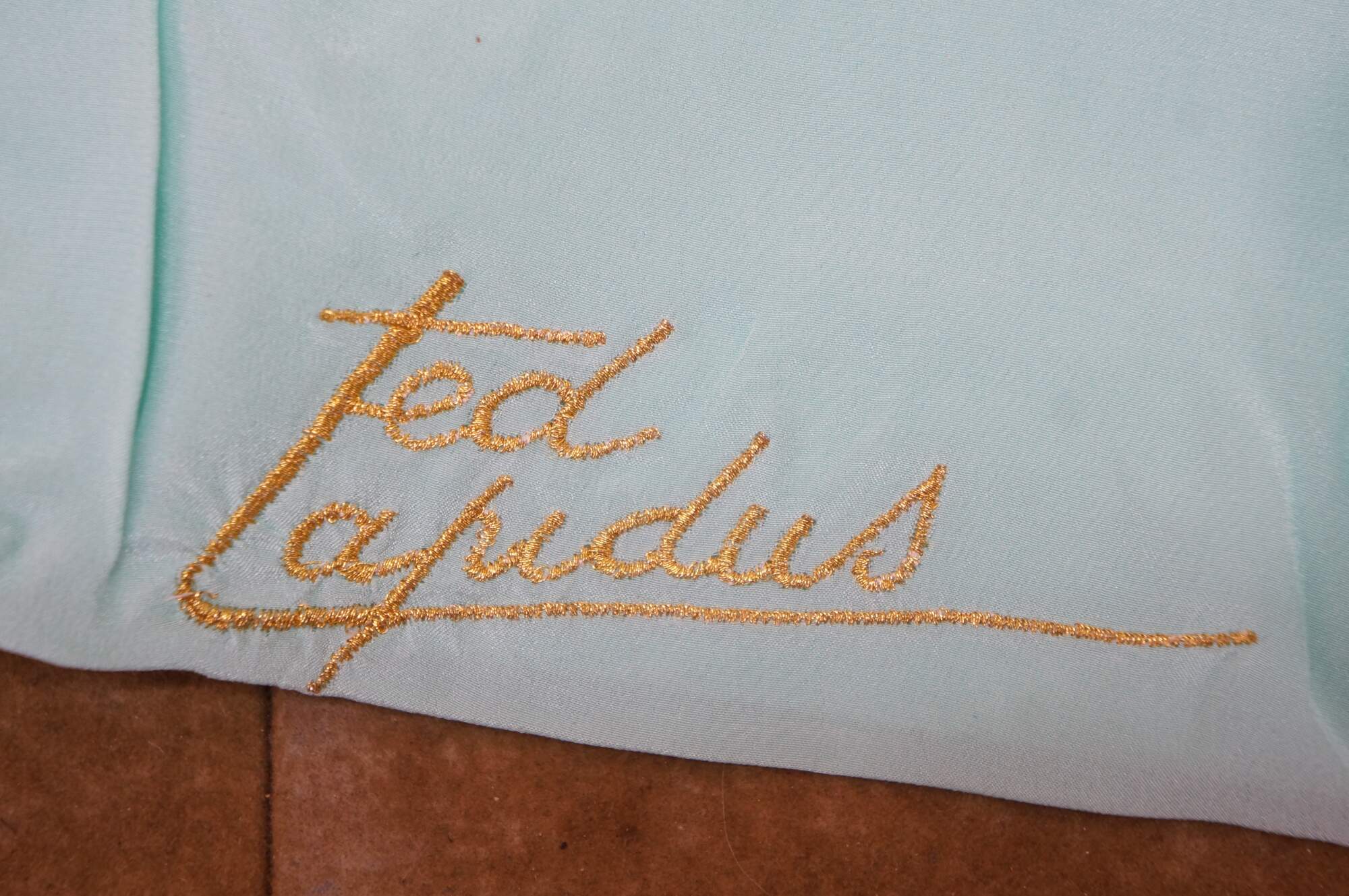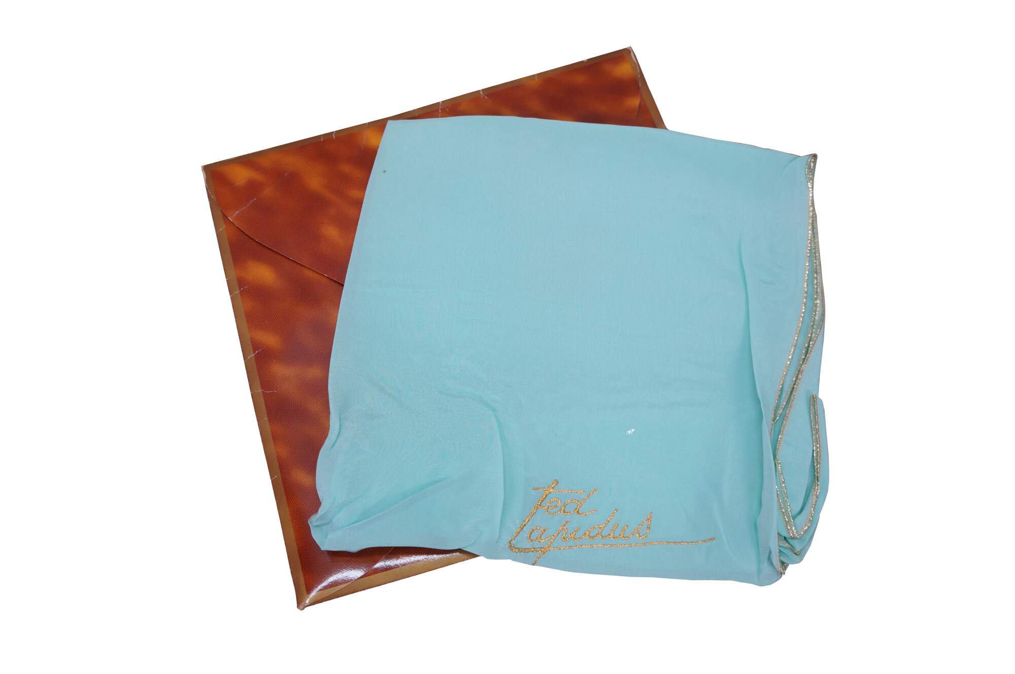 Vintage Ted Lepidus silk turquoise gold stitch scarf with name in cursive script and original packaging.