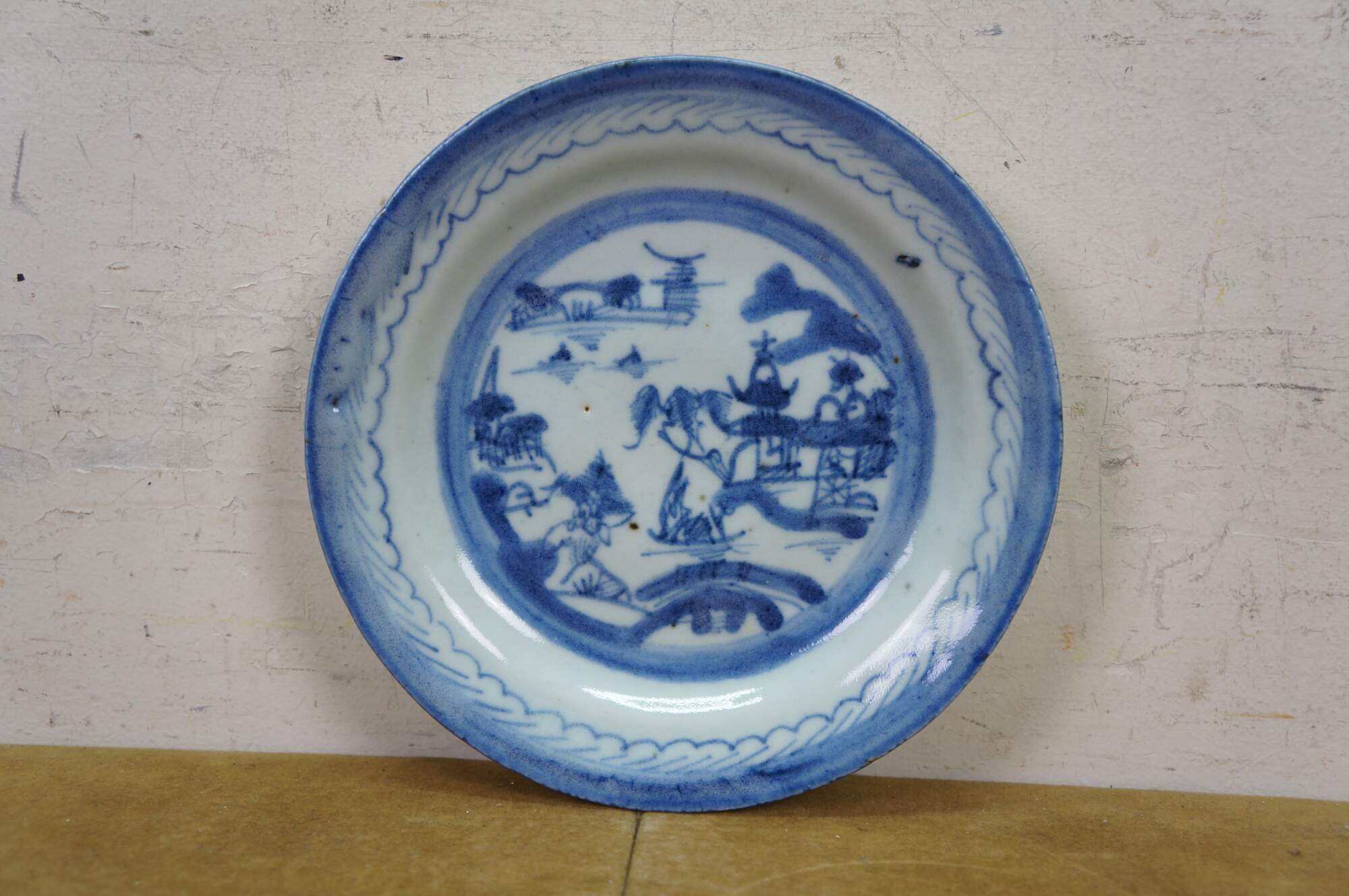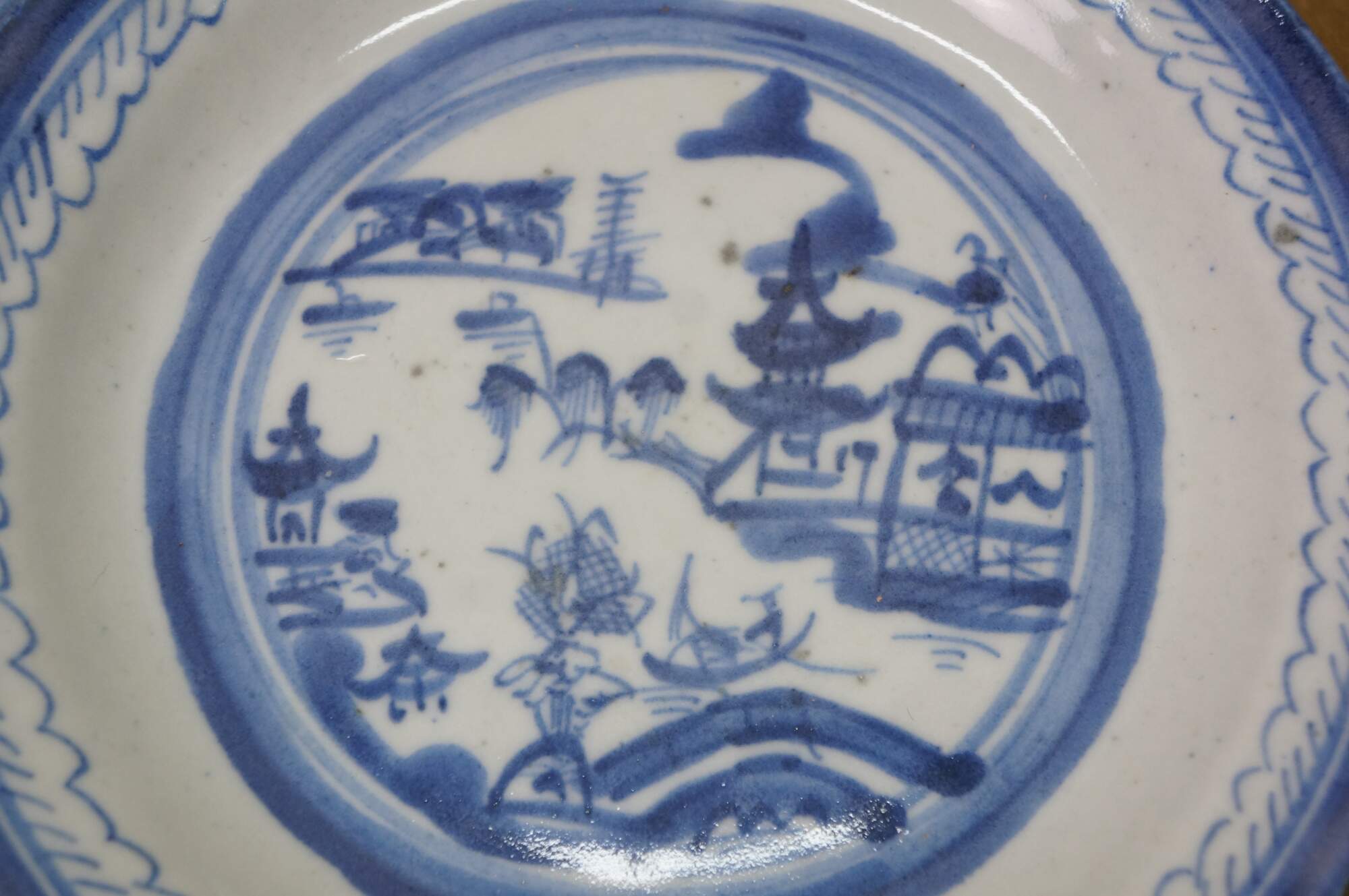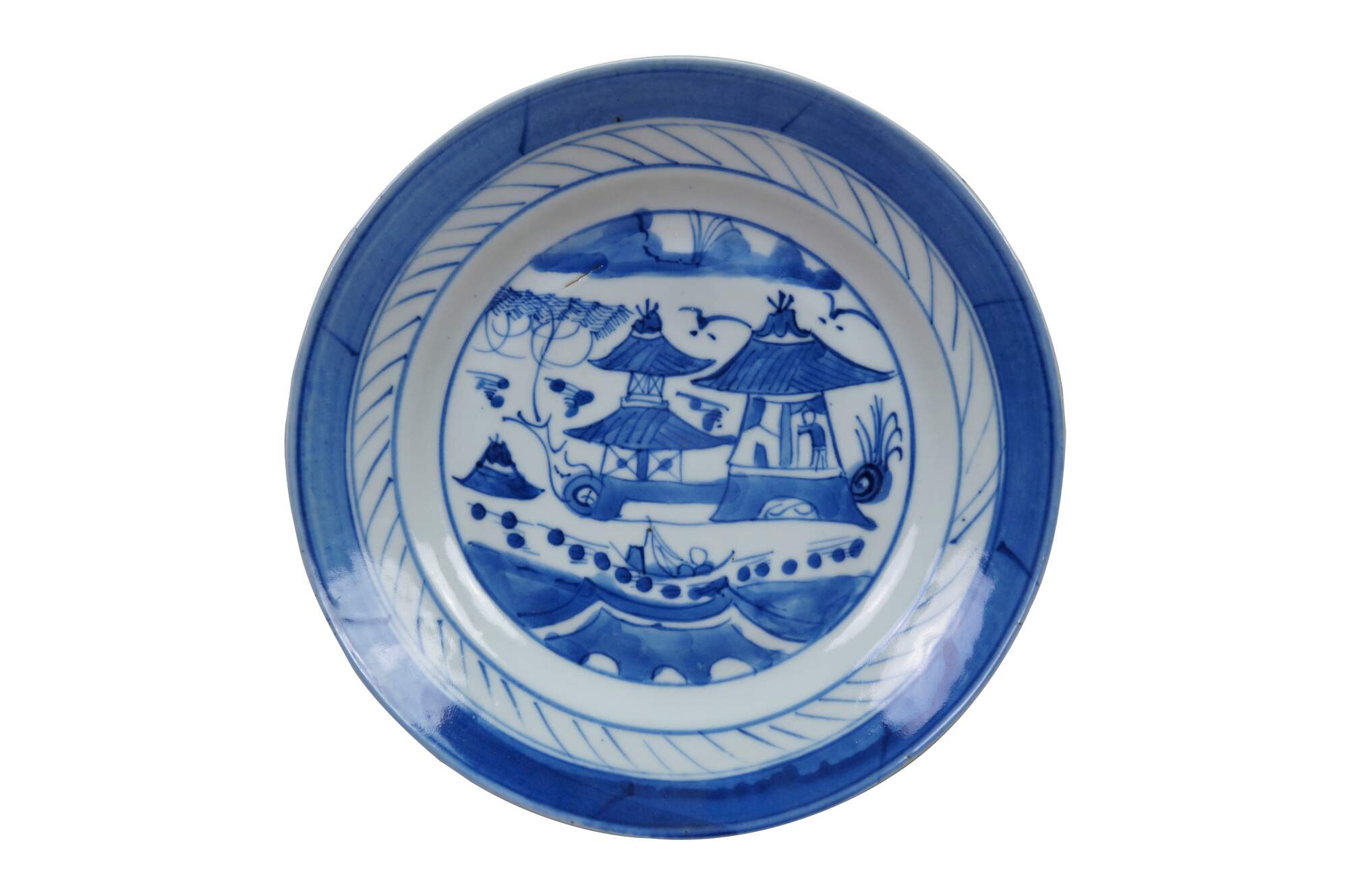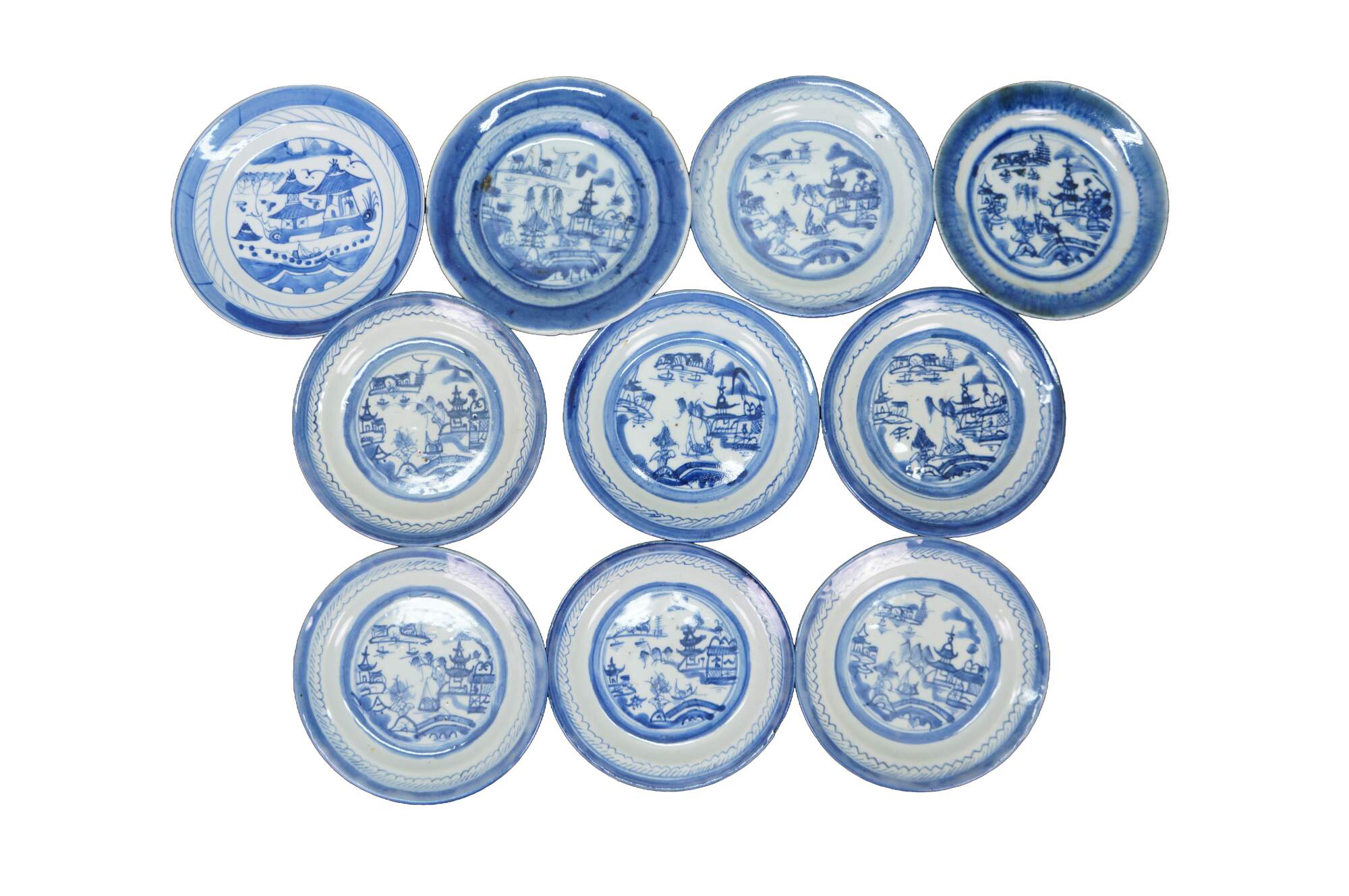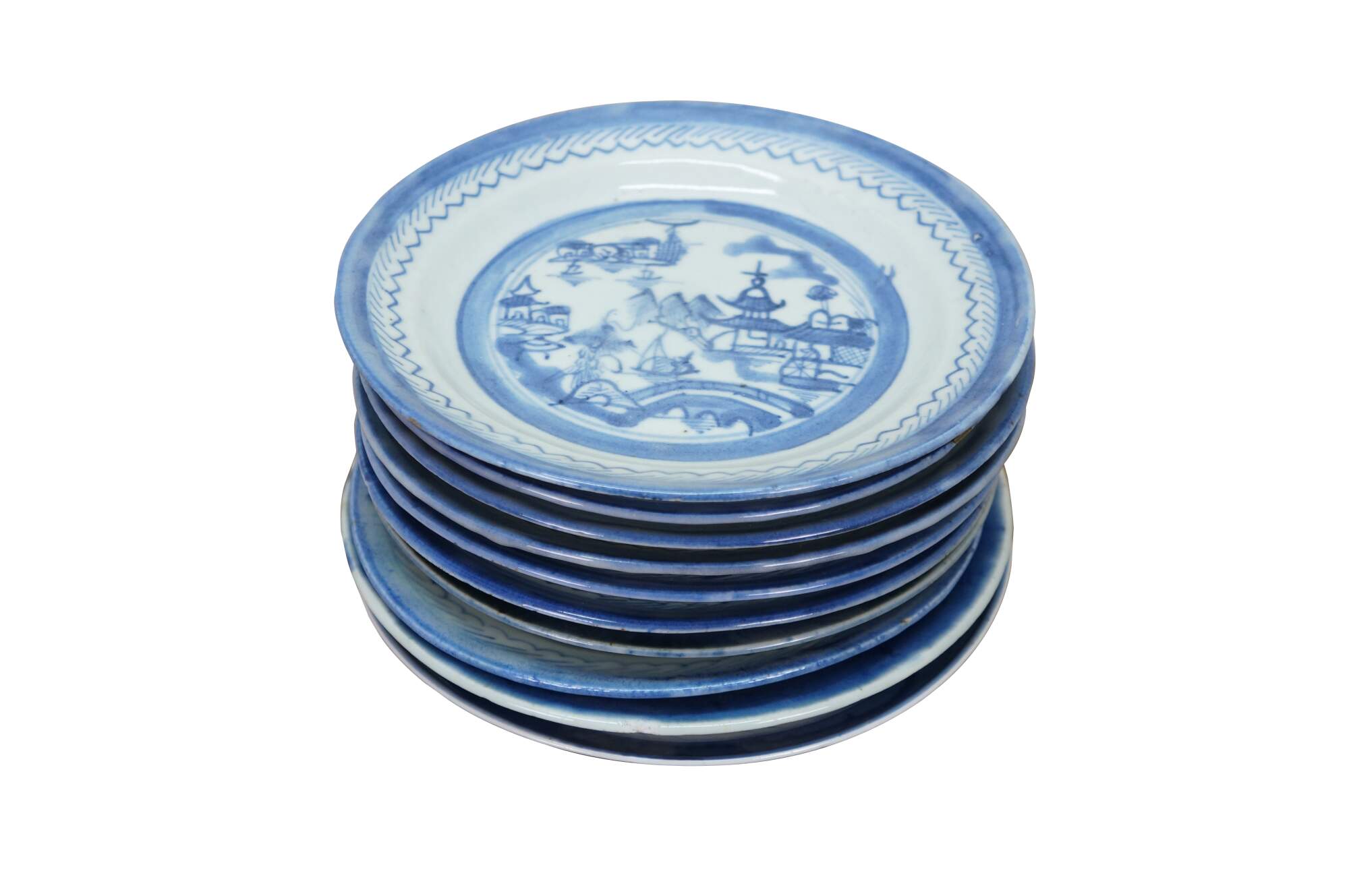 Ten antique mid to early 19th century Chinese Canton blue and white porcelain bread and butter or dessert plates. Produced in Guangzhou (historically known as Canton), specifically for export to western markets.� Features a central medallion depicting a Chinese garden scene with pagodas, bridges, boats, mountains and willow trees surrounded by a characteristic lattice / criss-cross border.