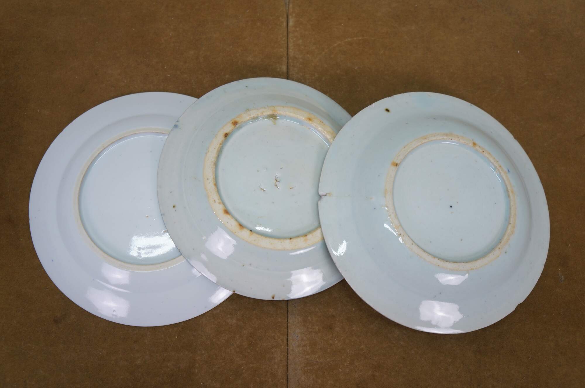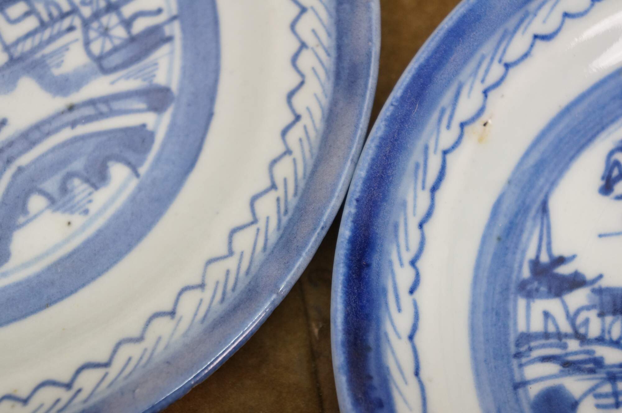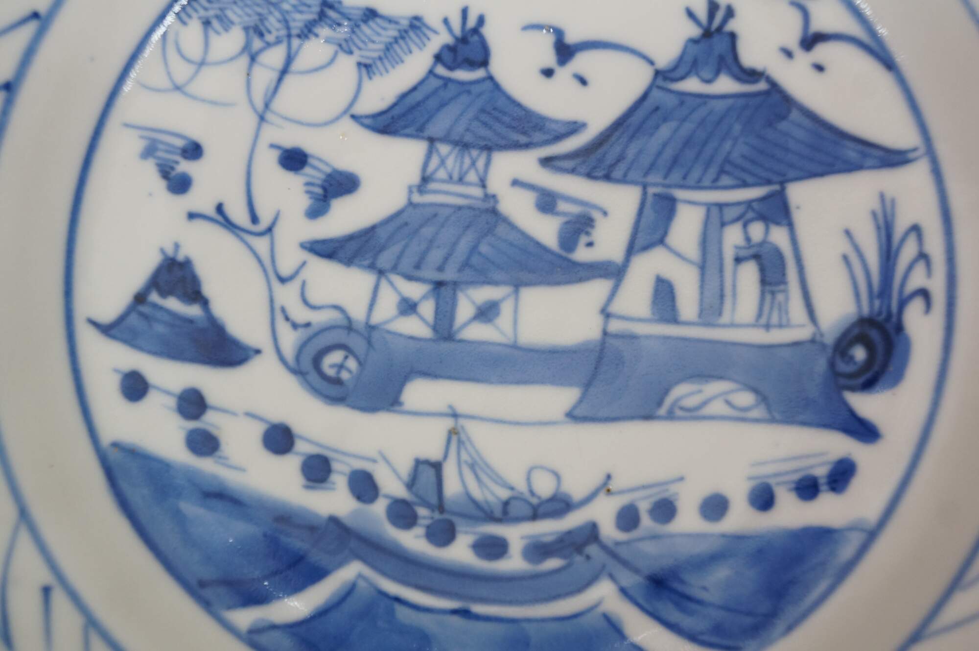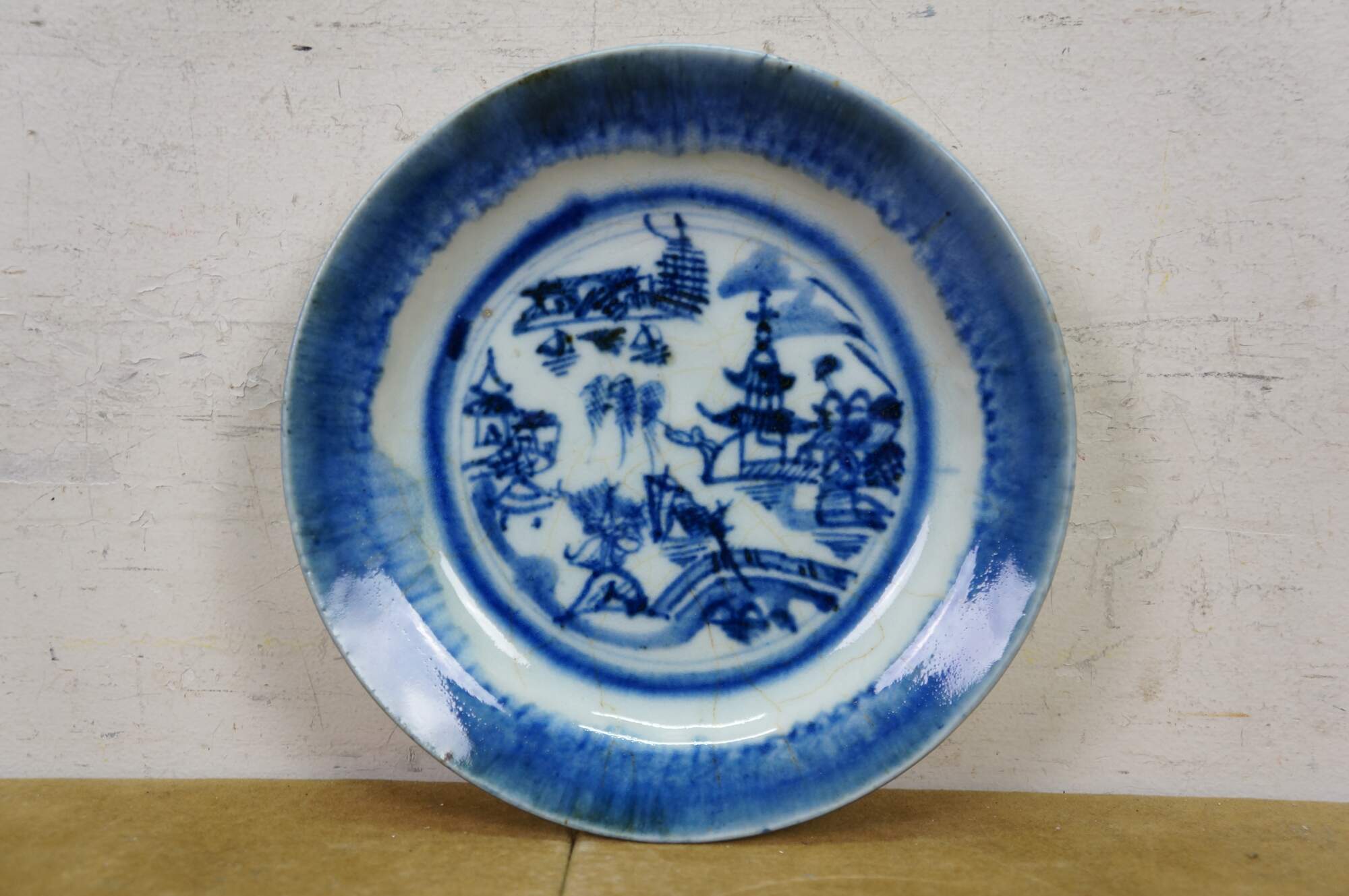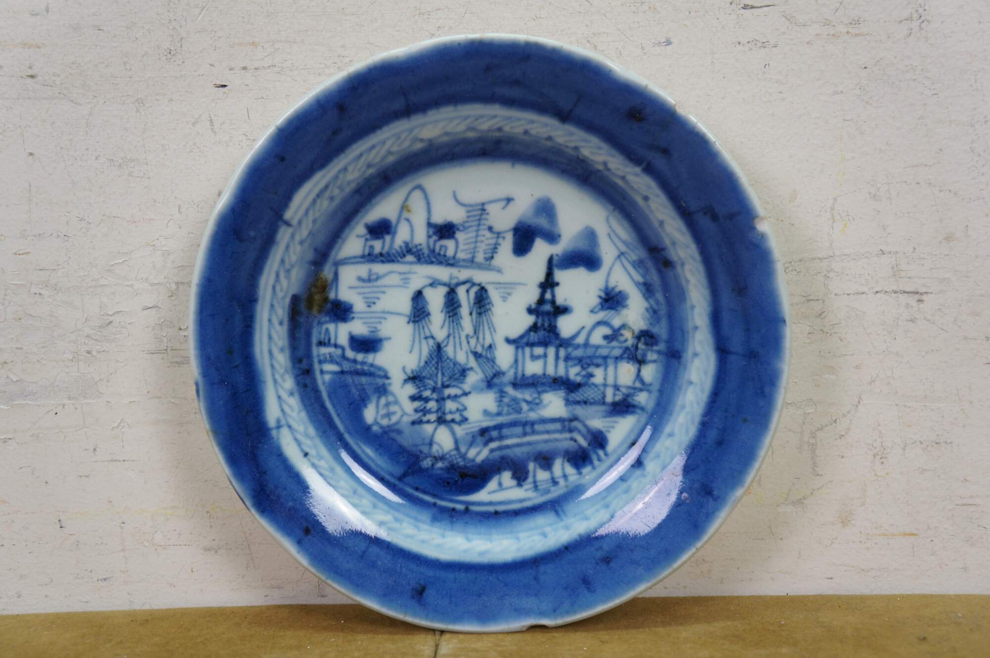 Ten antique mid to early 19th century Chinese Canton blue and white porcelain bread and butter or dessert plates. Produced in Guangzhou (historically known as Canton), specifically for export to western markets.� Features a central medallion depicting a Chinese garden scene with pagodas, bridges, boats, mountains and willow trees surrounded by a characteristic lattice / criss-cross border.