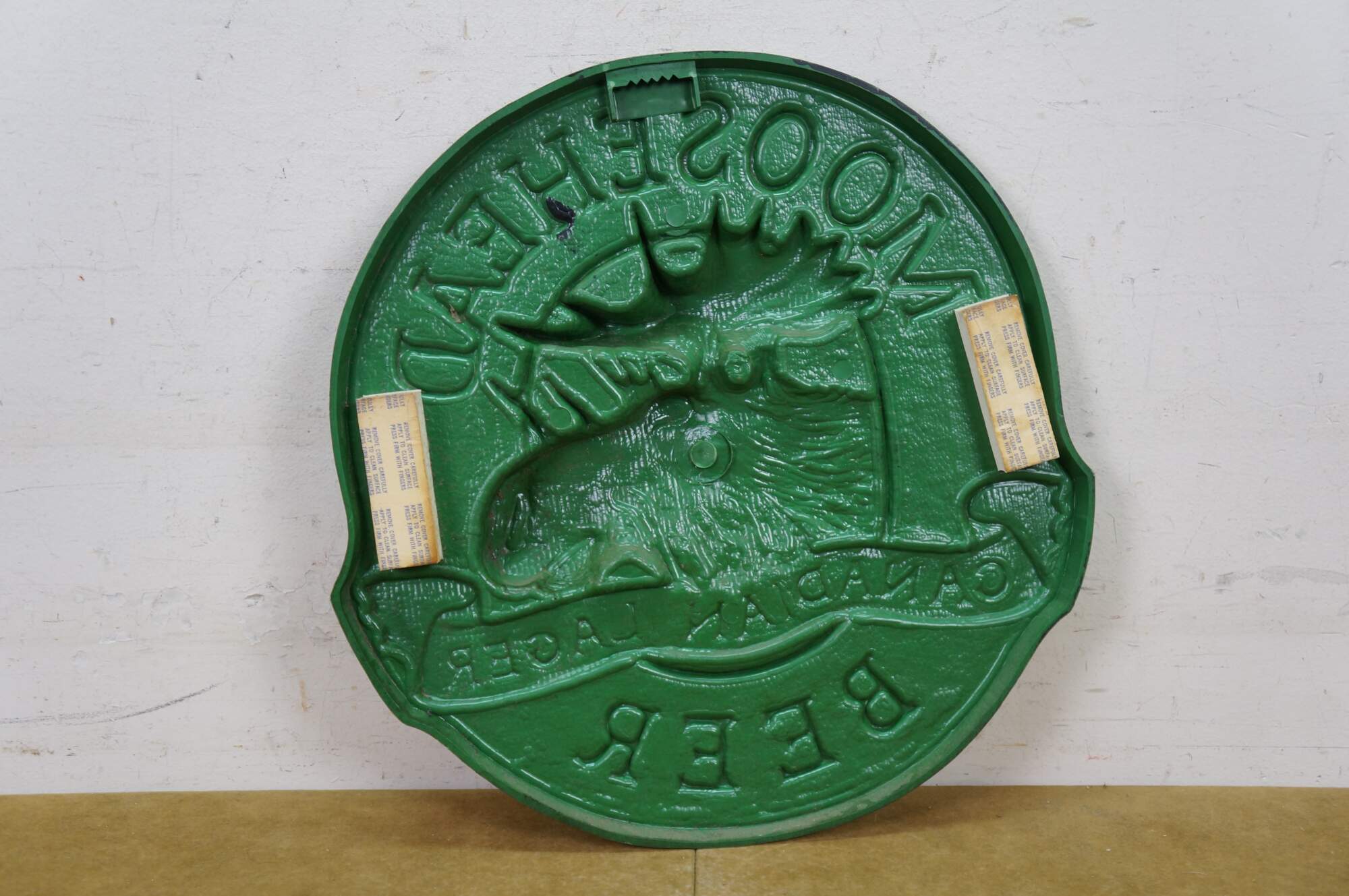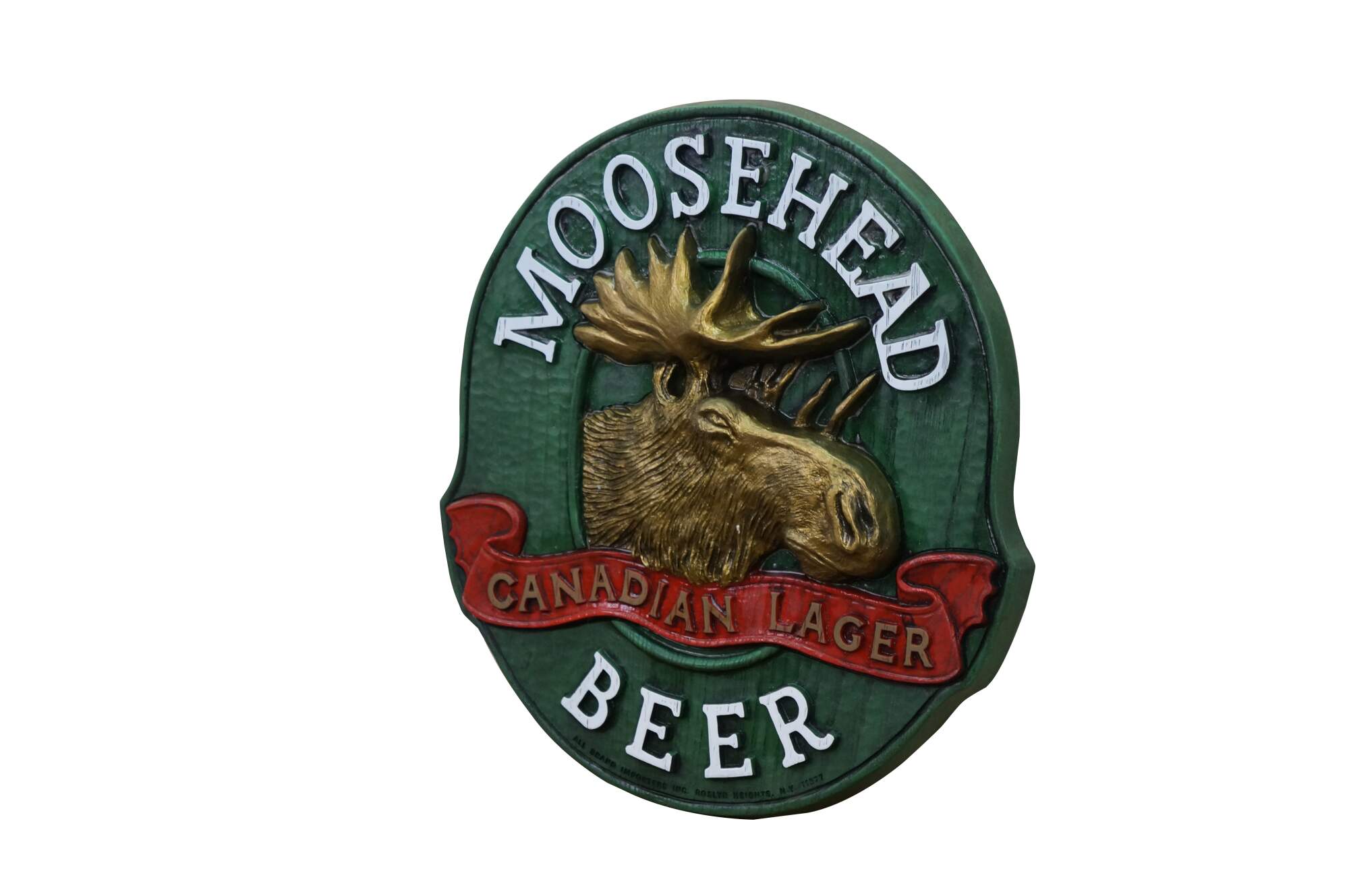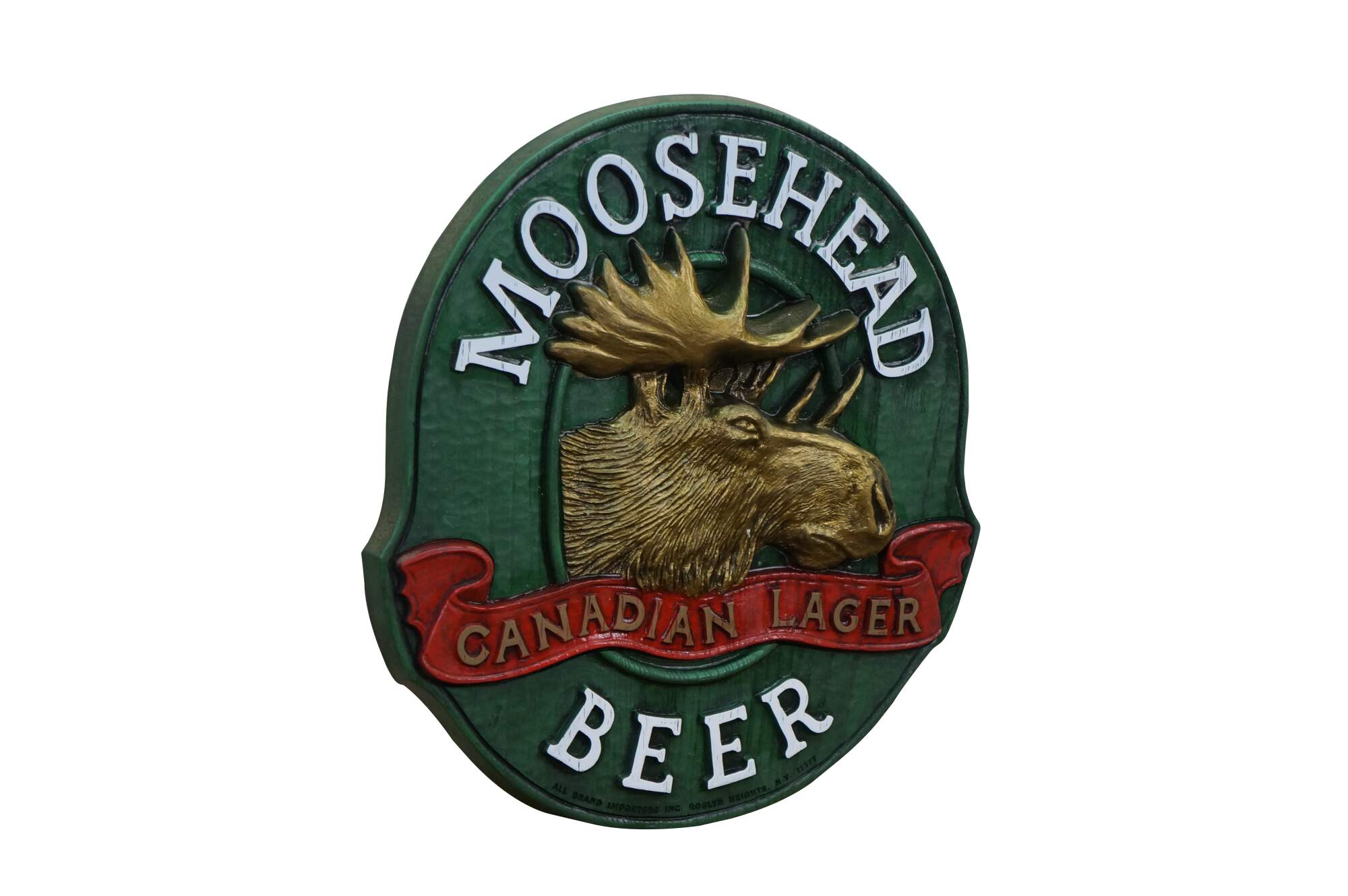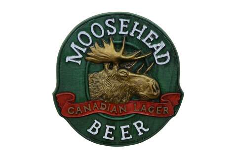 Vintage 3D molded plastic sign featuring the Moosehead Canadian Lager Beer logo.� An embossed design made to look like wood with a central moose head. Made by All Brand Importers Inc., Roslyn Heights, N.Y.
