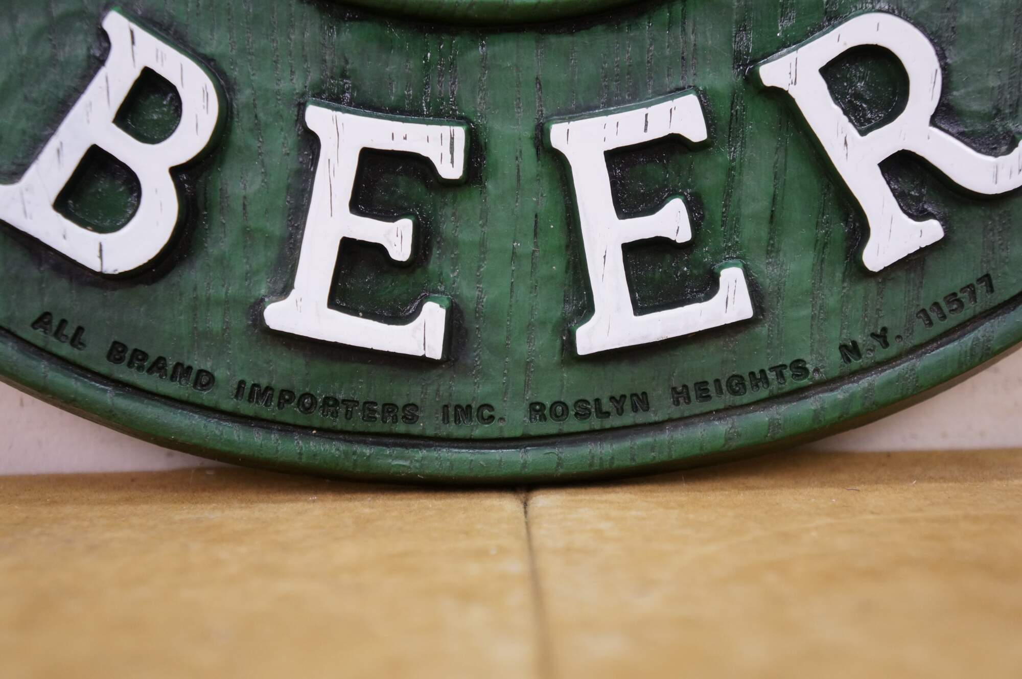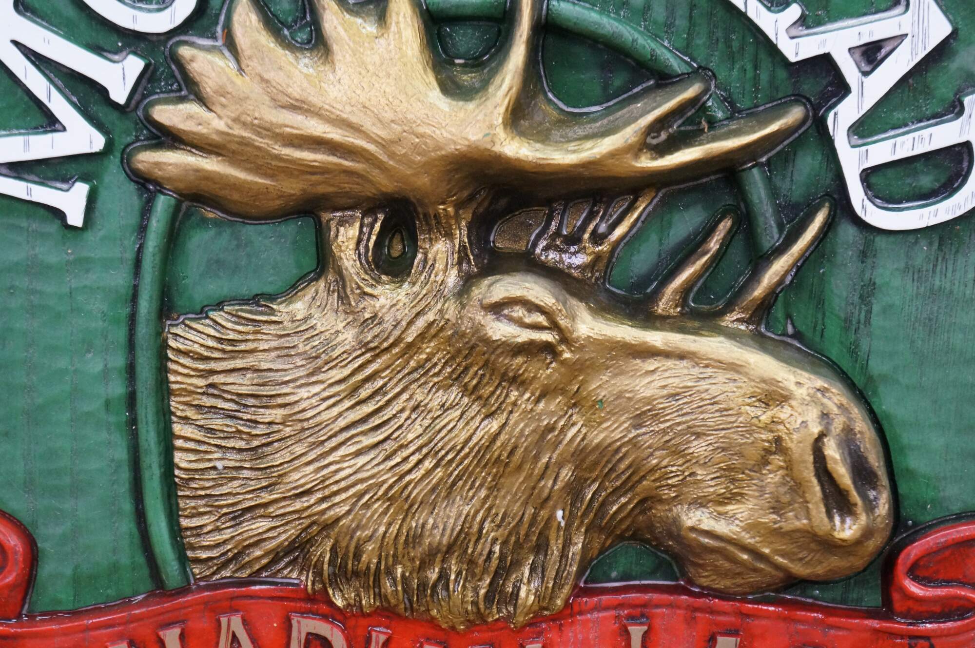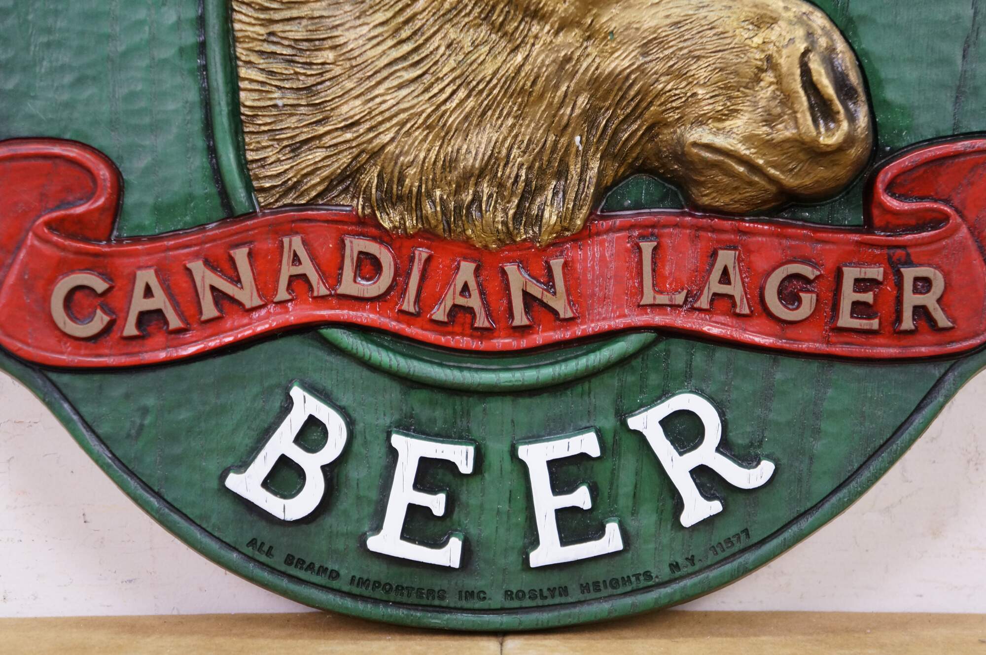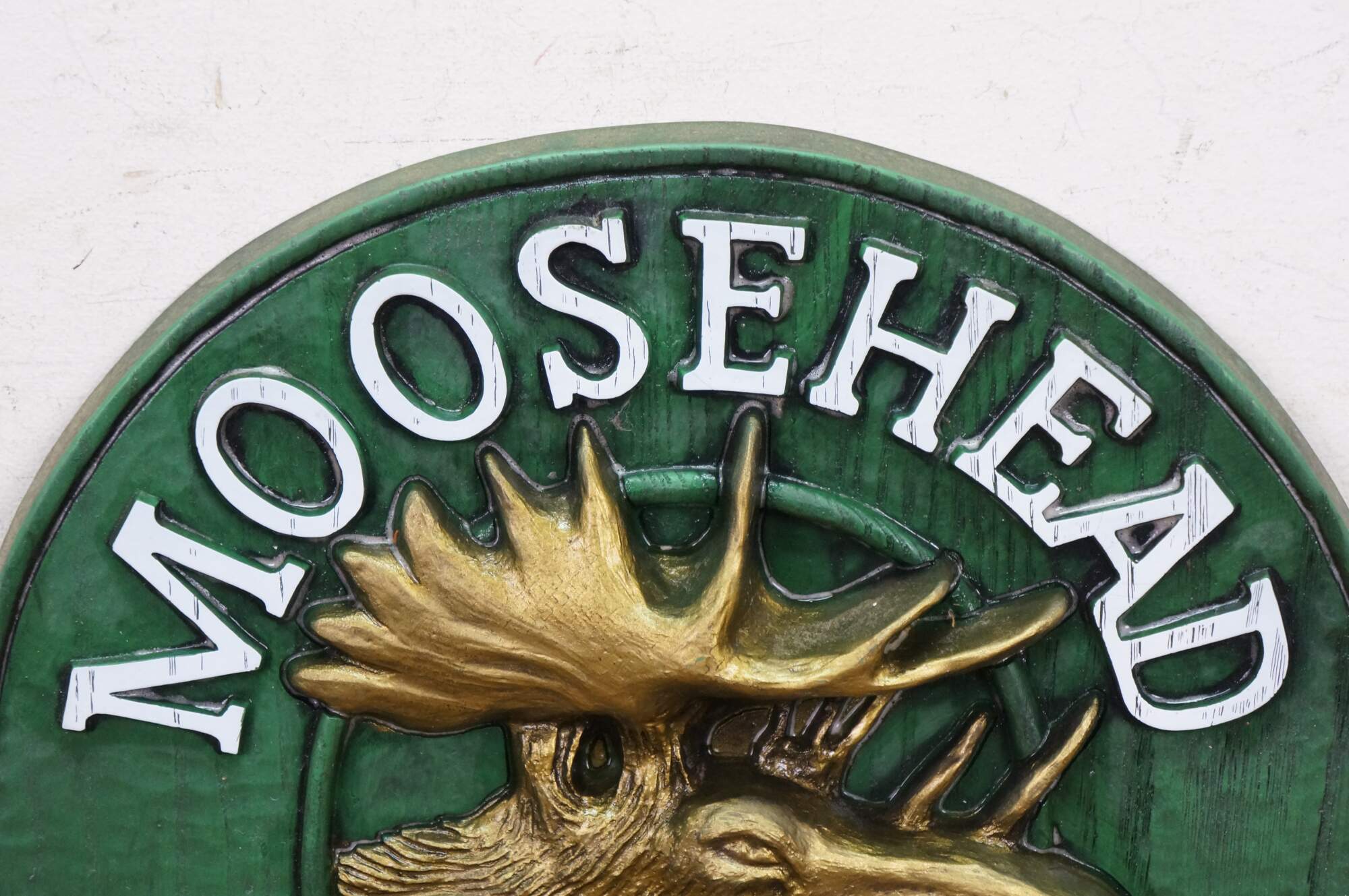 Vintage 3D molded plastic sign featuring the Moosehead Canadian Lager Beer logo.� An embossed design made to look like wood with a central moose head. Made by All Brand Importers Inc., Roslyn Heights, N.Y.