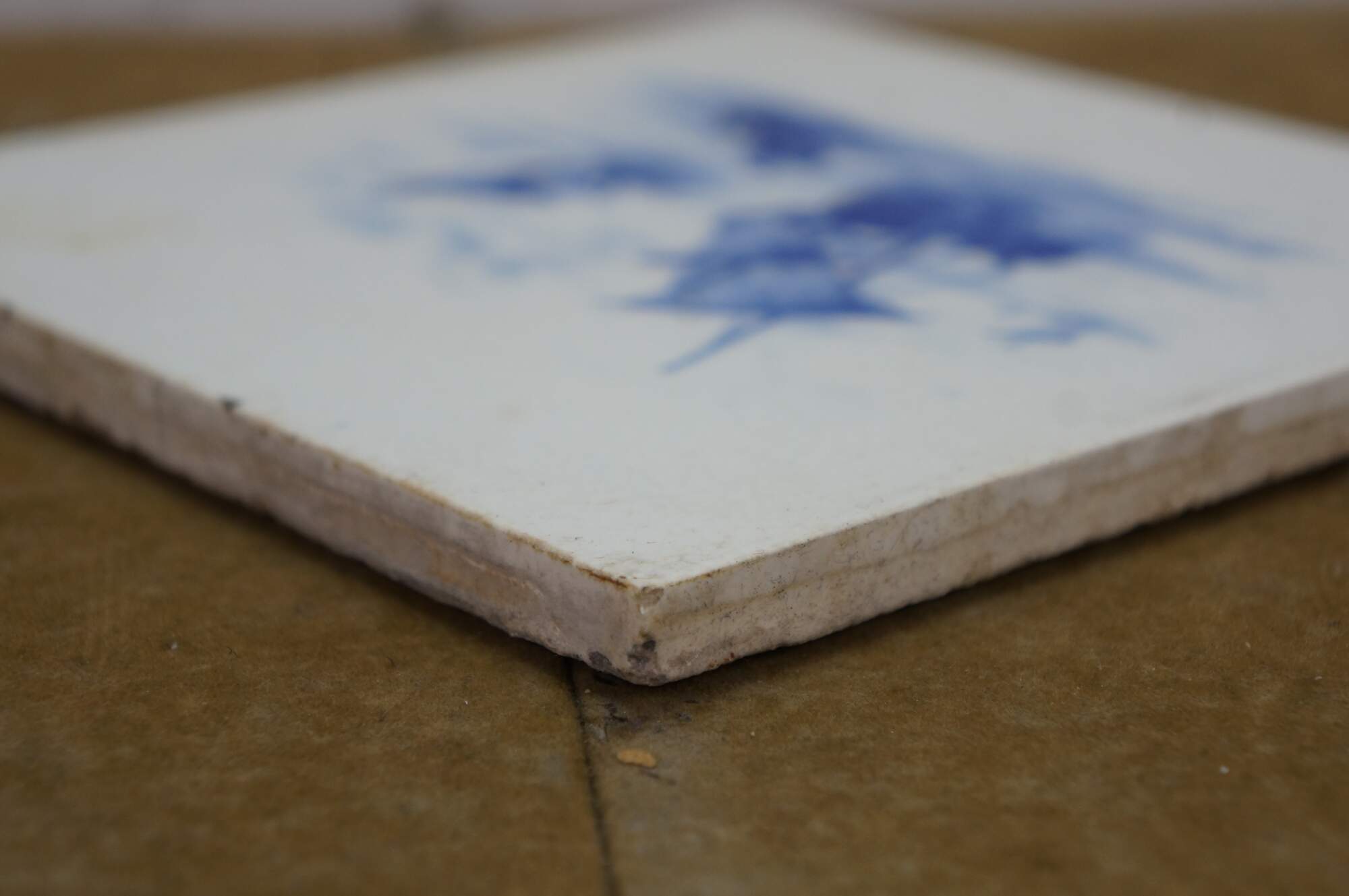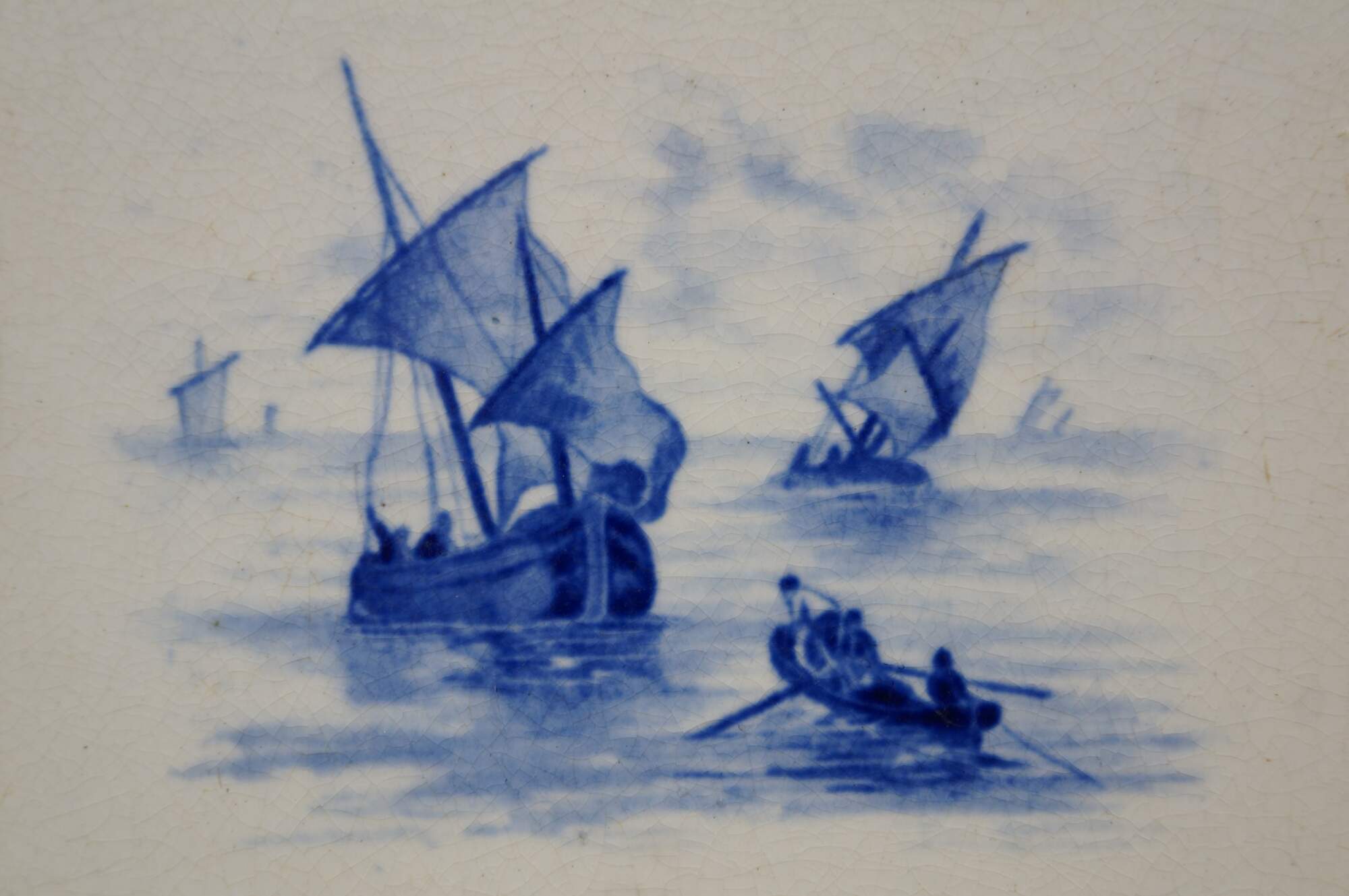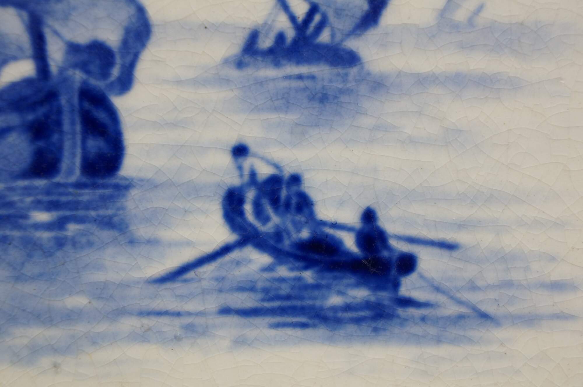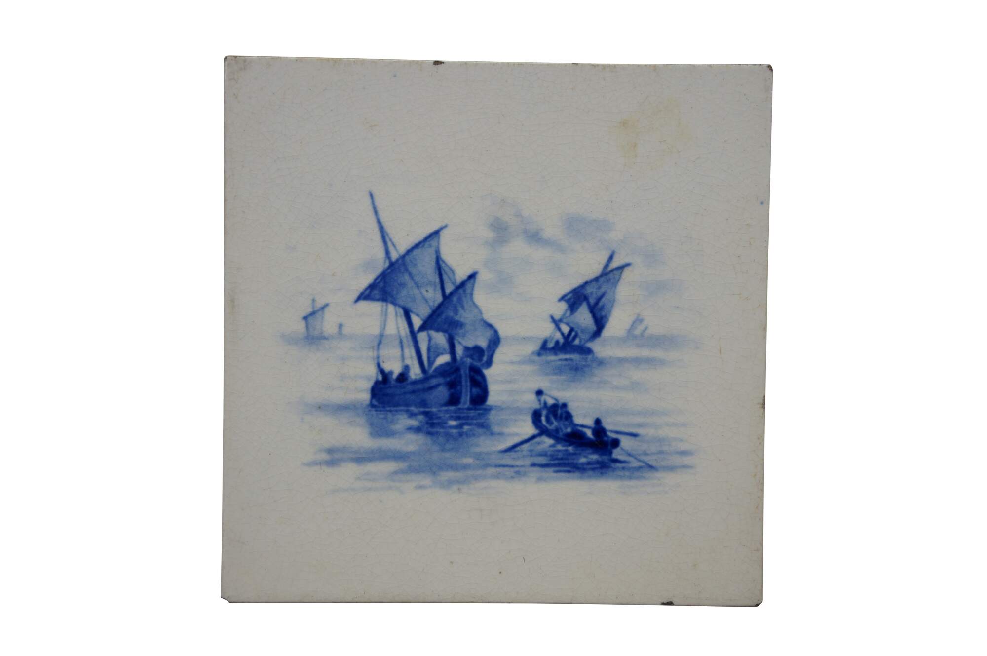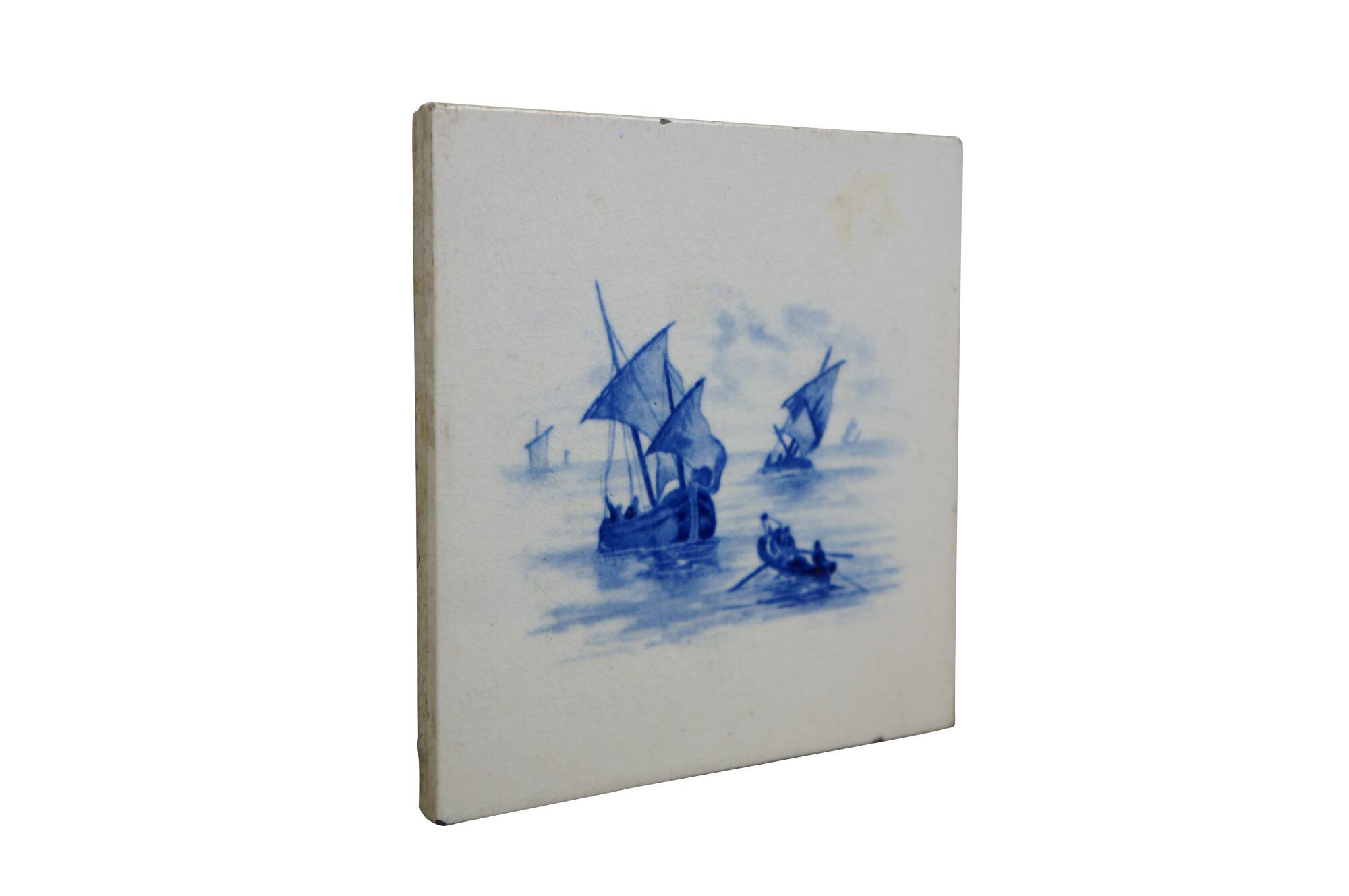 Antique 18th century Dutch Delft cobalt blue ceramic tile featuring a maritime scene with ships / boats / sailboats.� Origin: Netherlands.