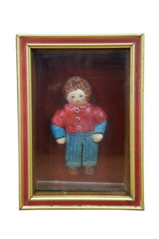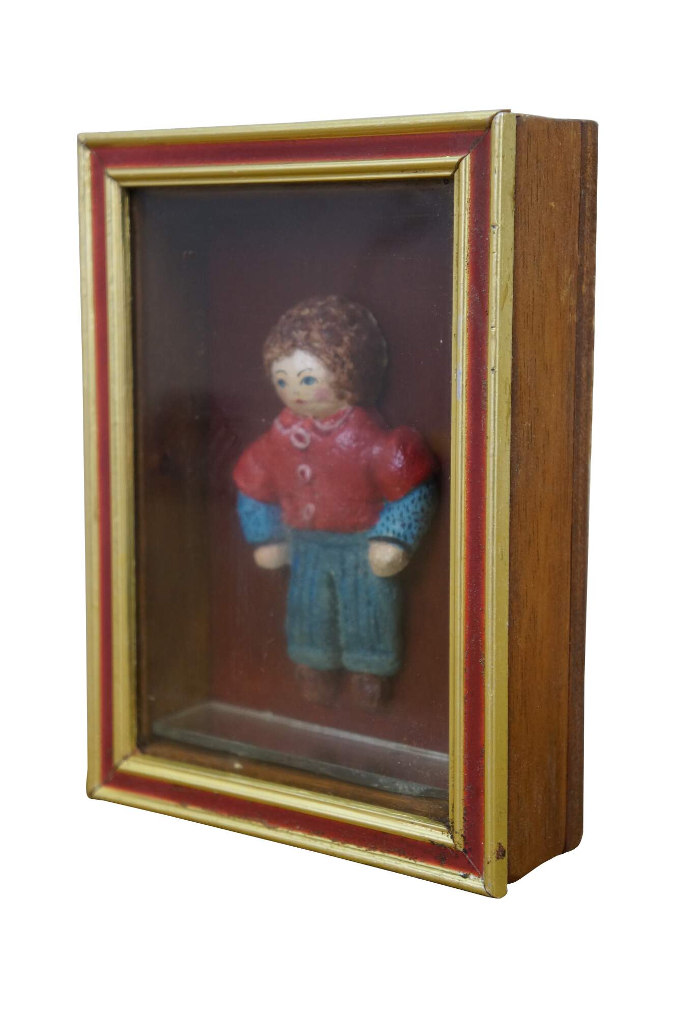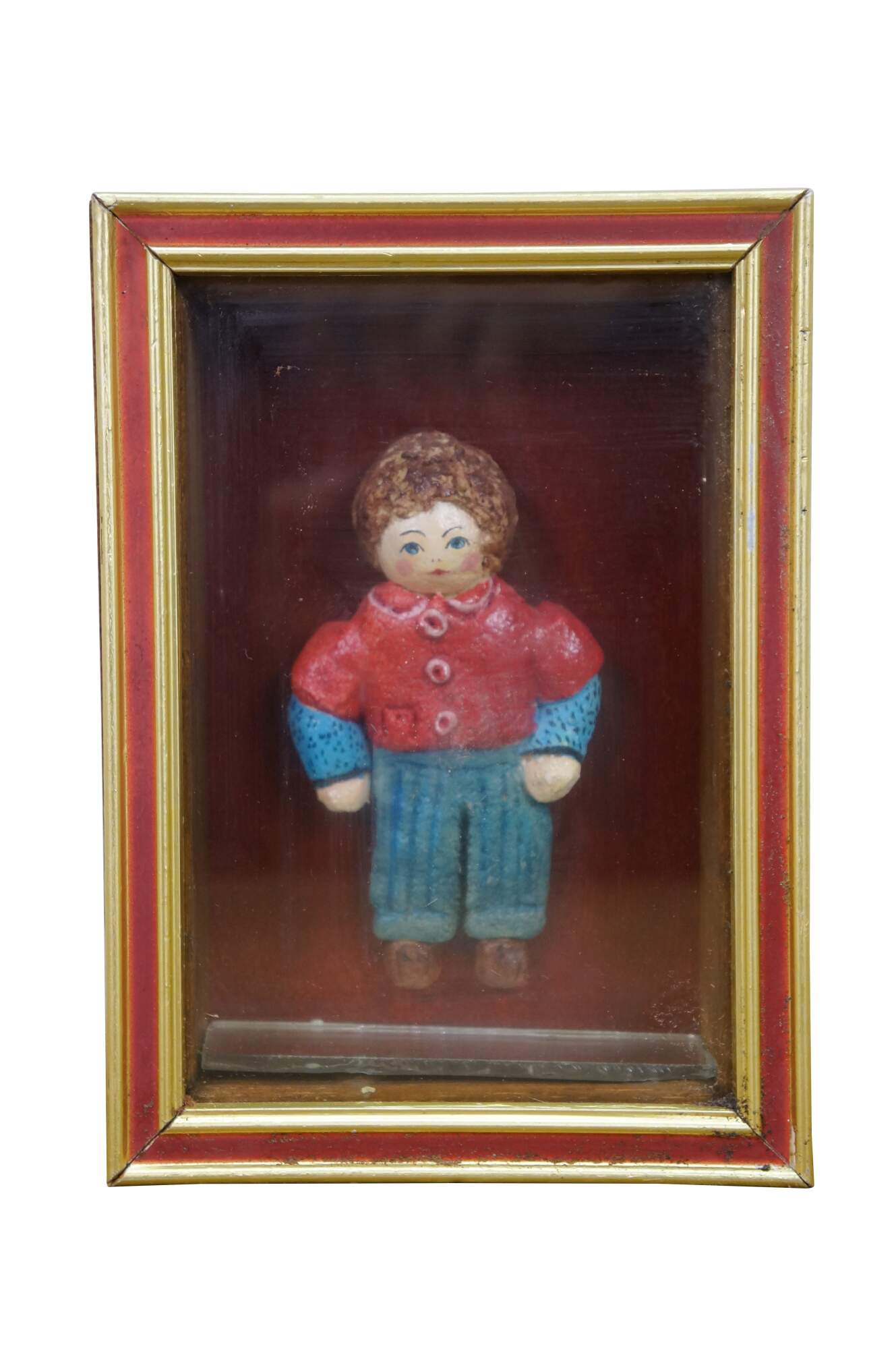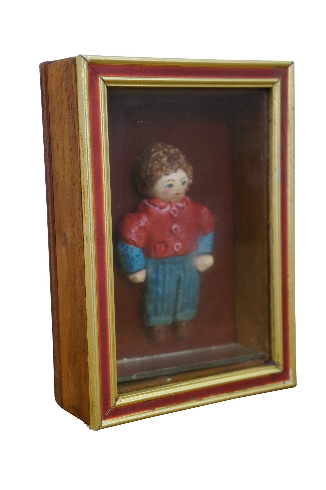 Vintage folk art shadowbox composition doll figurine of a young boy in a red collared shirt and blue jeans. Framed in oak with gold and red painted exterior.