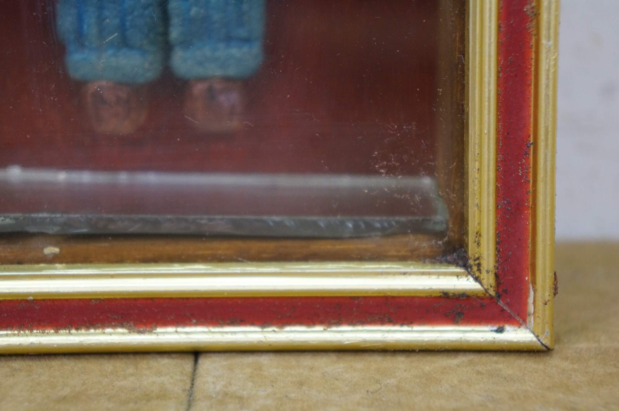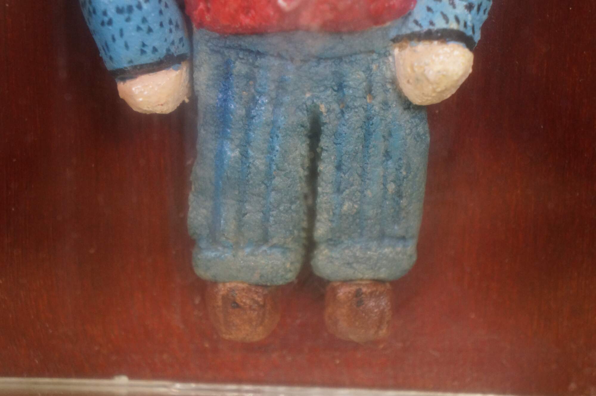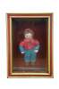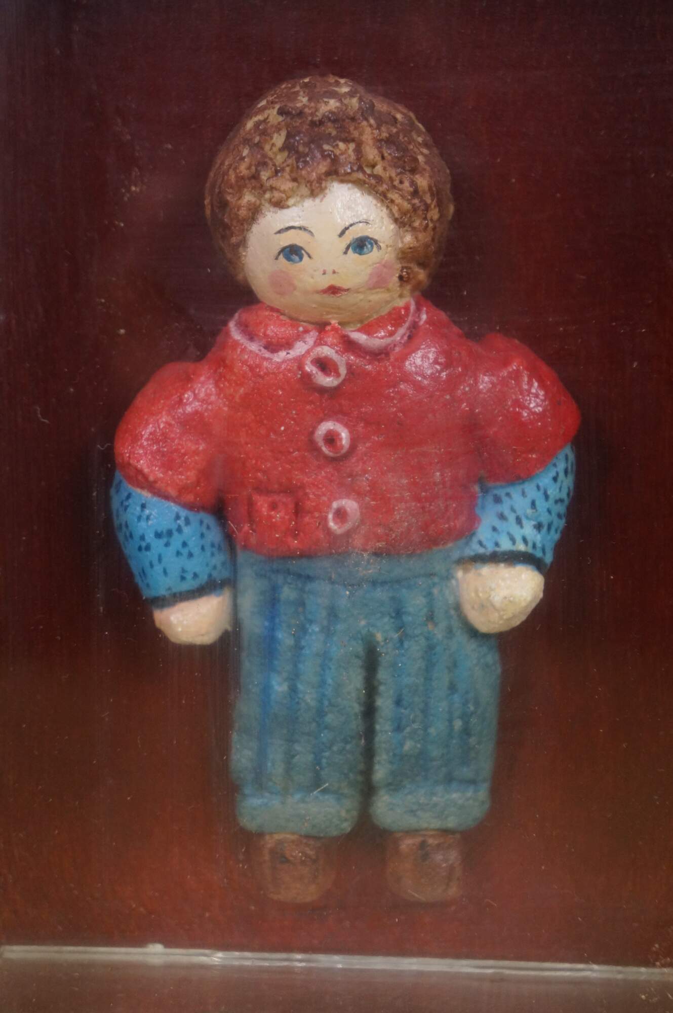 Vintage folk art shadowbox composition doll figurine of a young boy in a red collared shirt and blue jeans. Framed in oak with gold and red painted exterior.