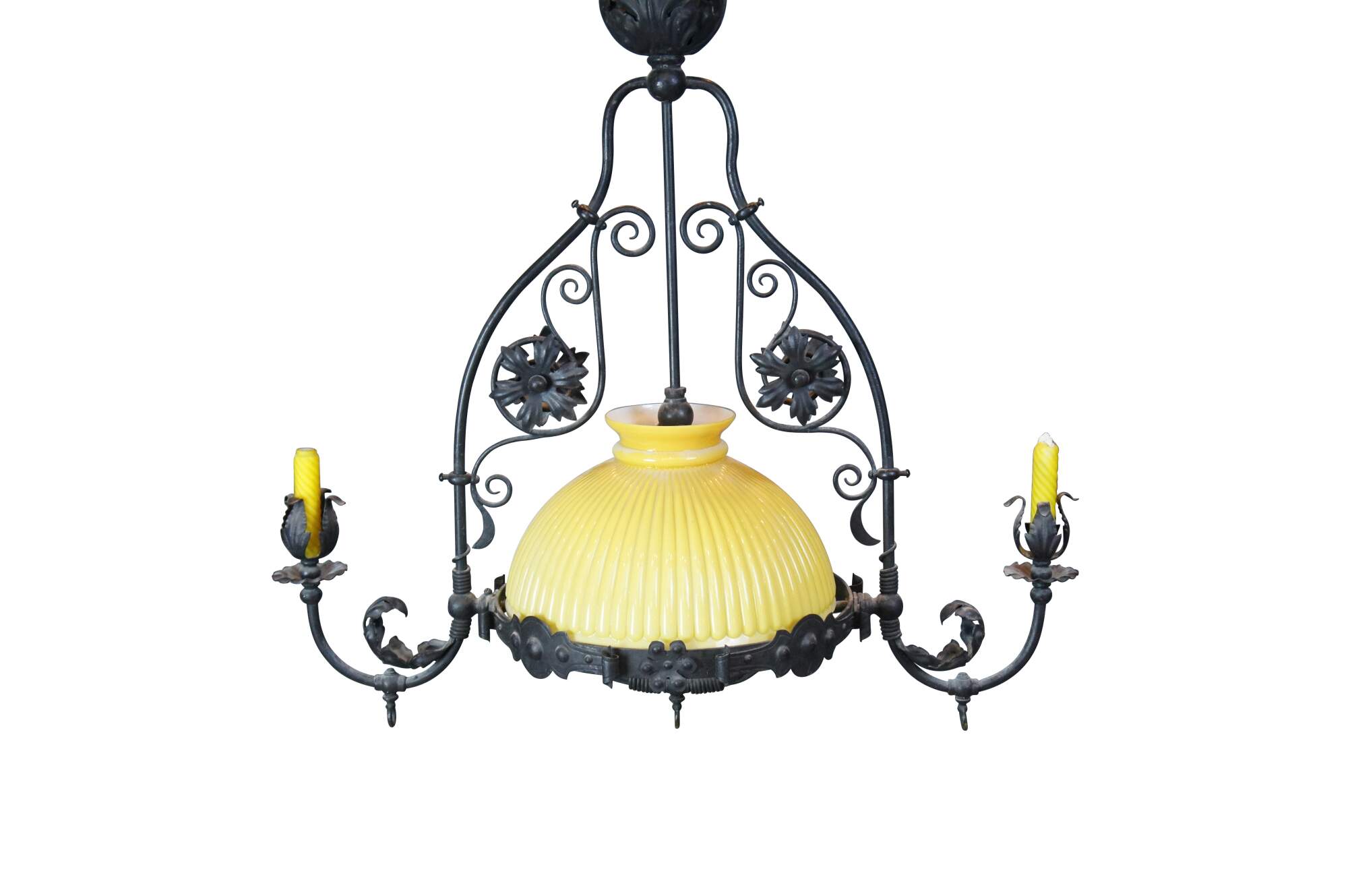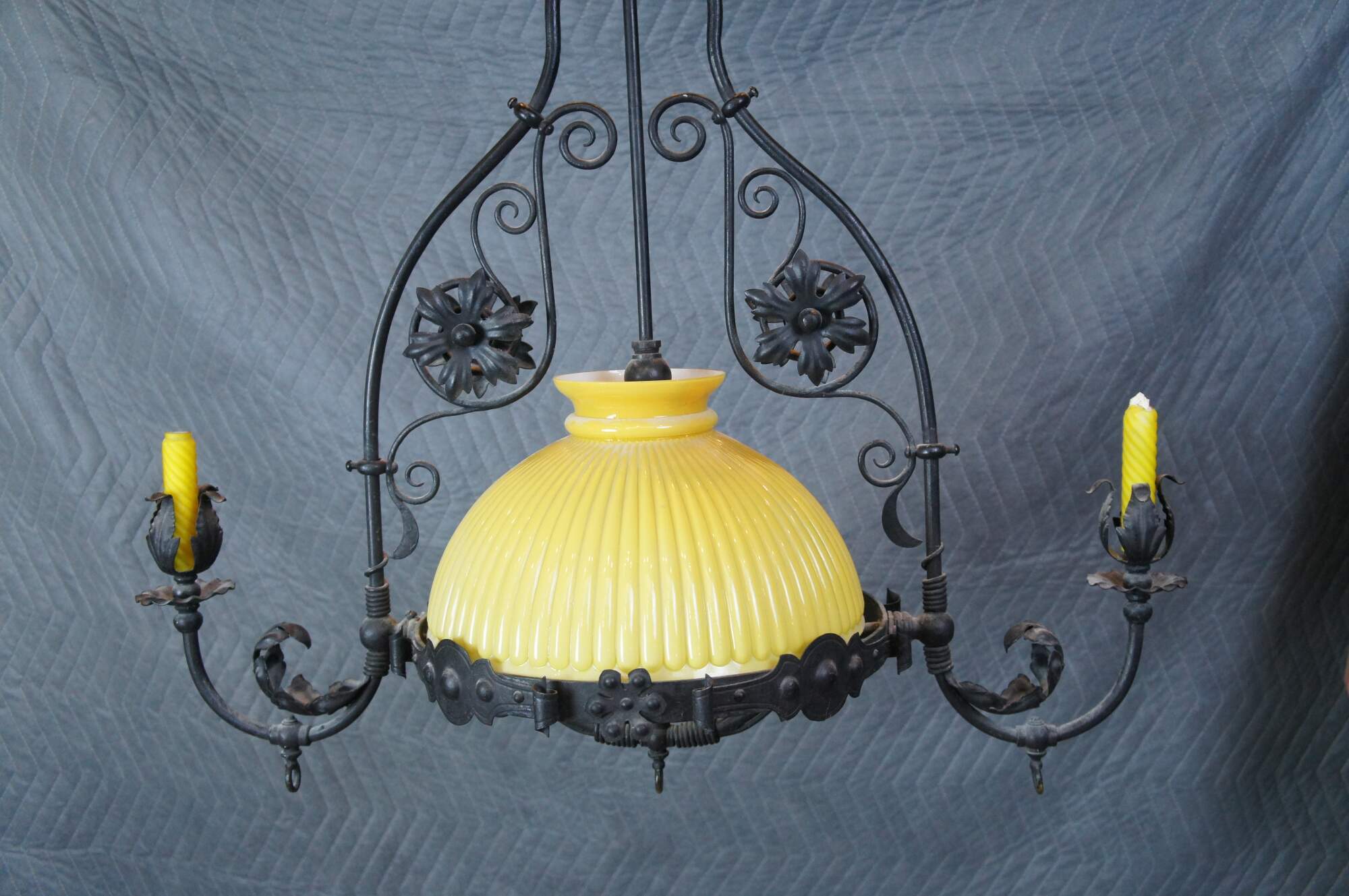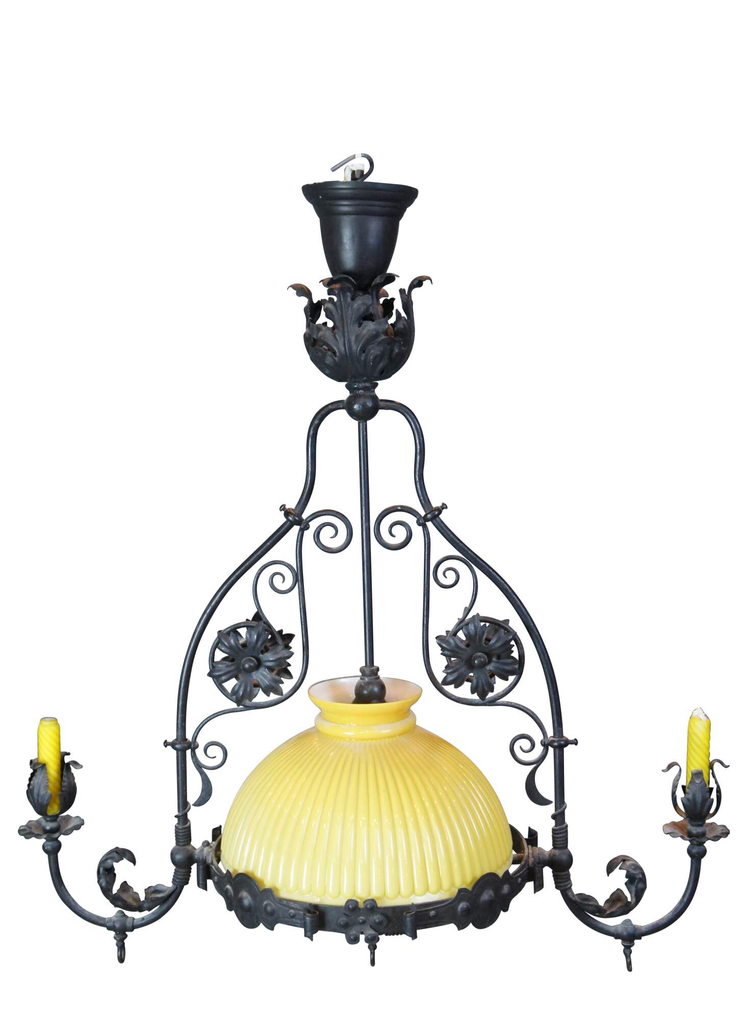 Antique Victorian converted gas 3 light parlor pendant / pool table chandelier. Made of scrolled wrought iron featuring Spanish styling with florets, acanthus leaves and yellow glass shade flanked by two candlesticks / candle holders.