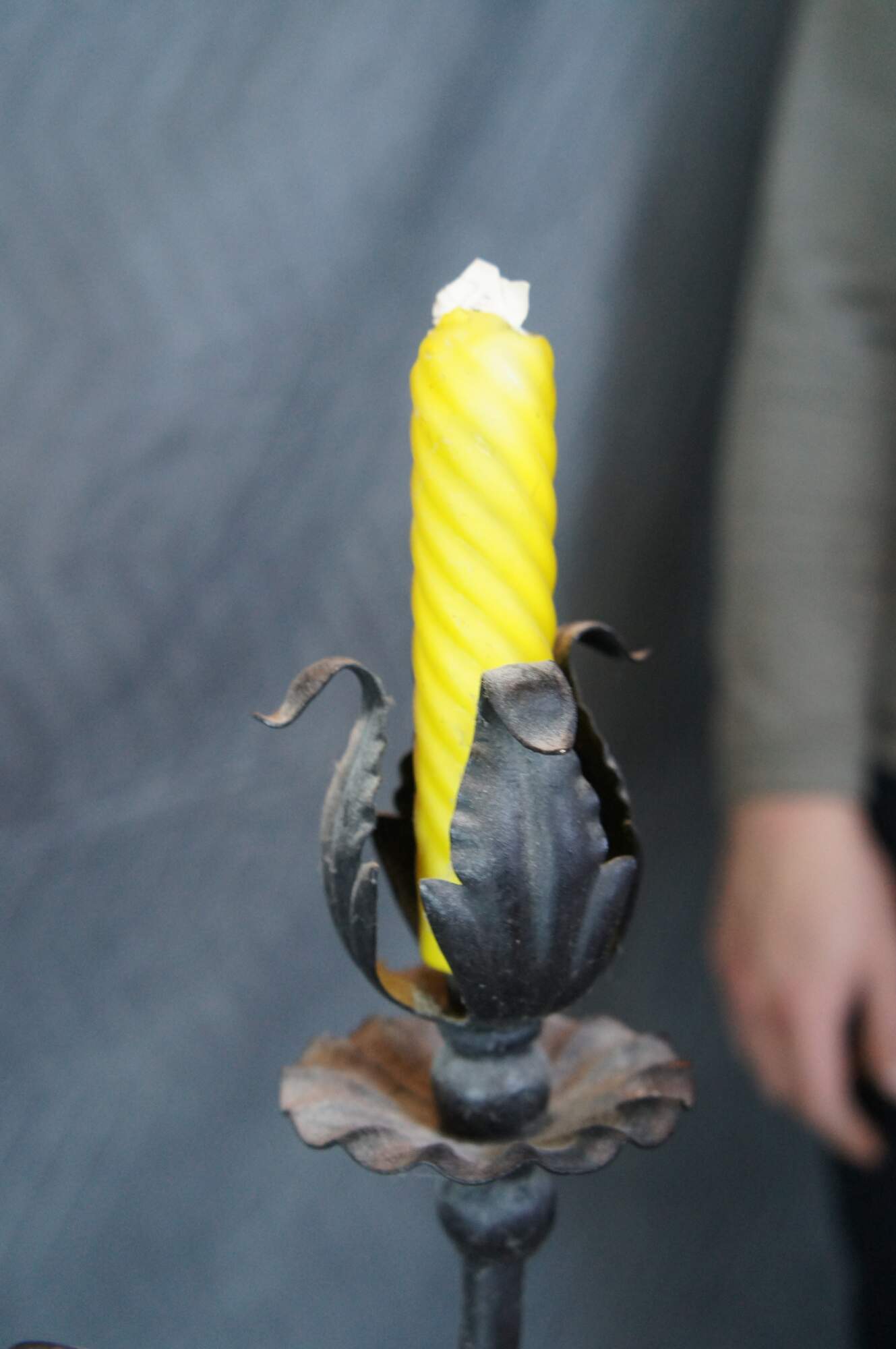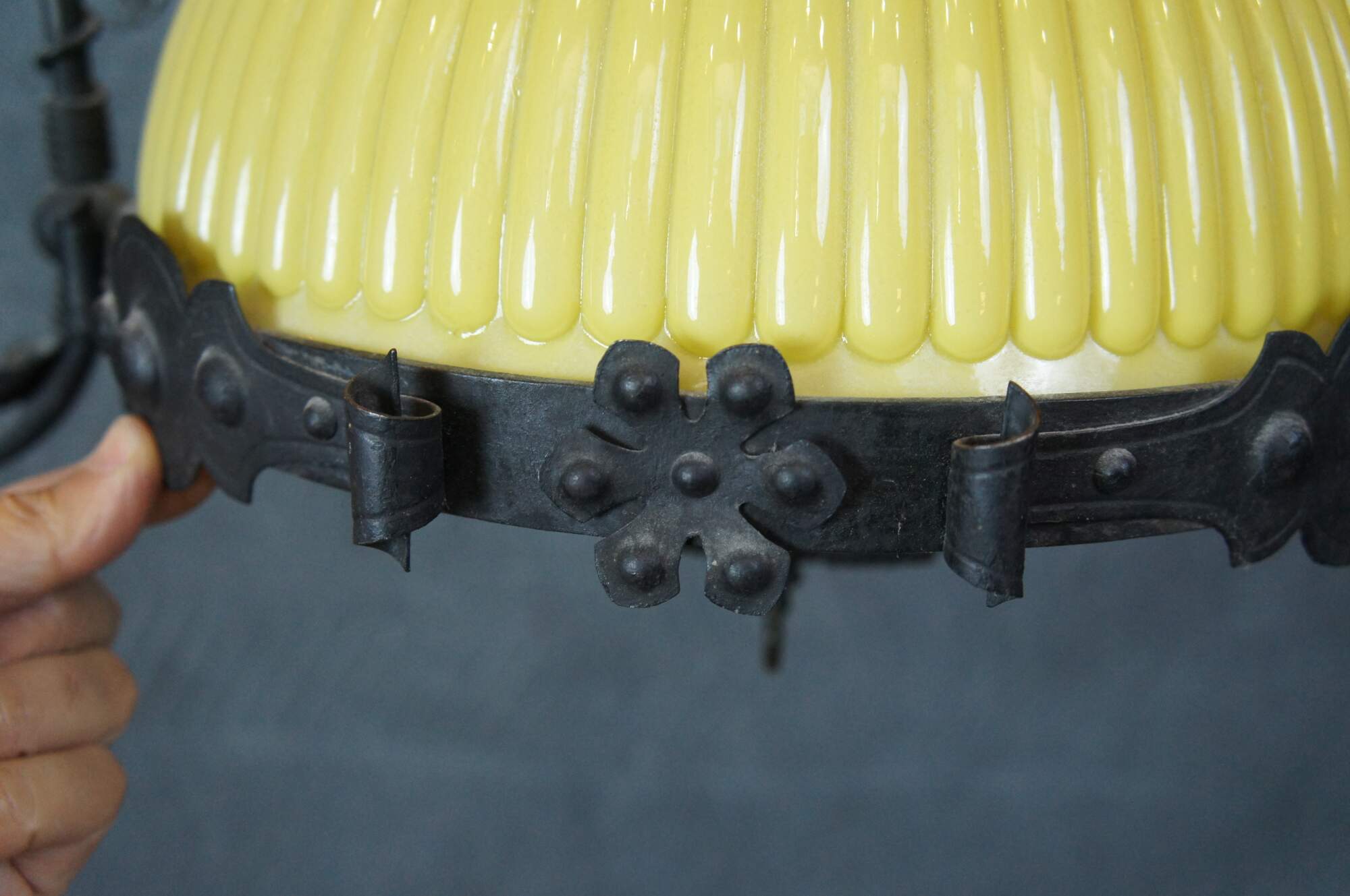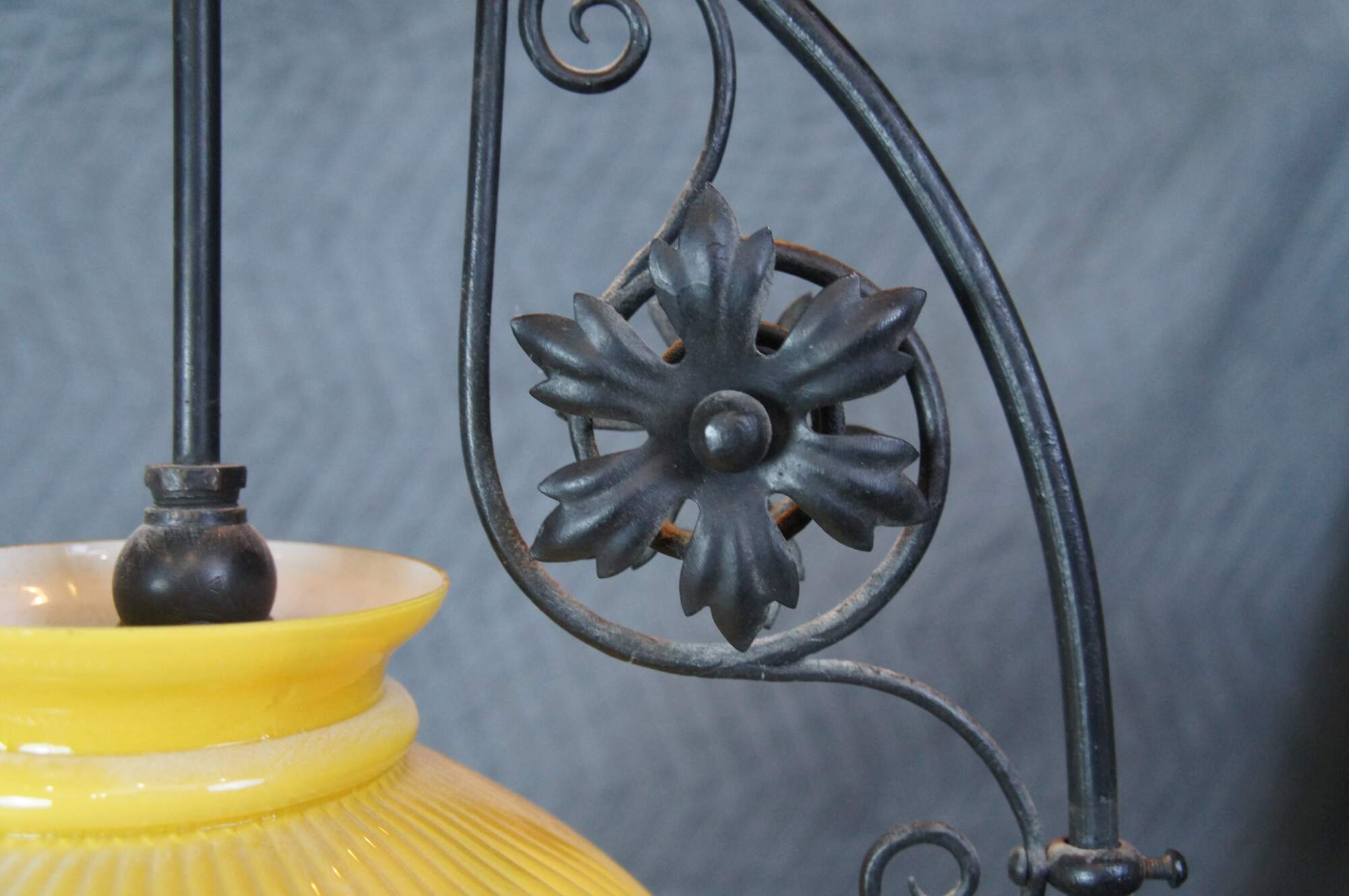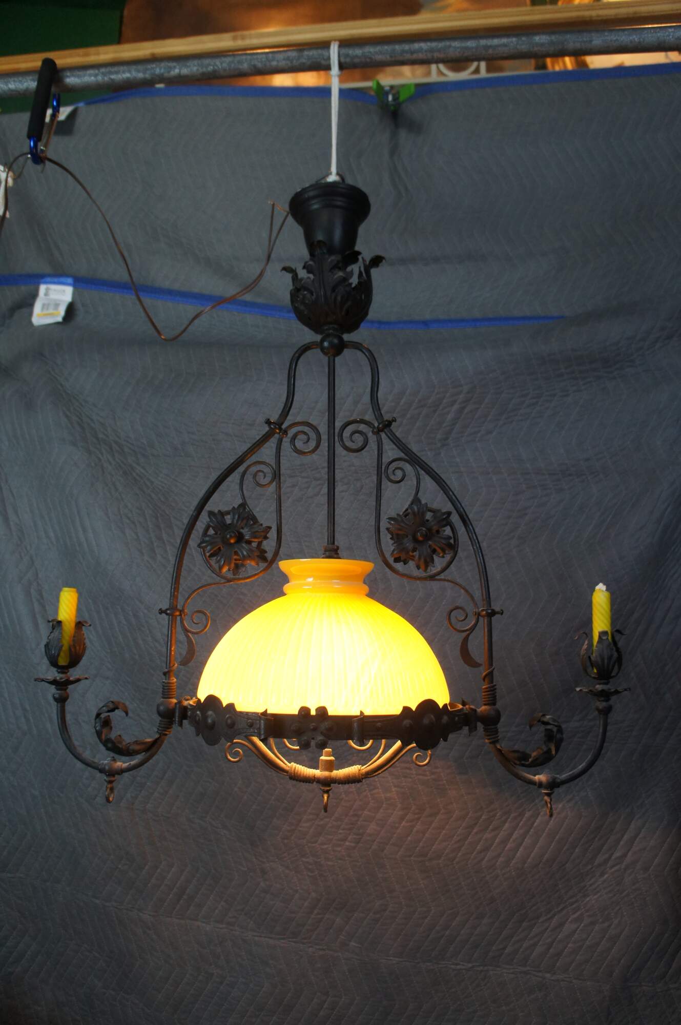 Antique Victorian converted gas 3 light parlor pendant / pool table chandelier. Made of scrolled wrought iron featuring Spanish styling with florets, acanthus leaves and yellow glass shade flanked by two candlesticks / candle holders.