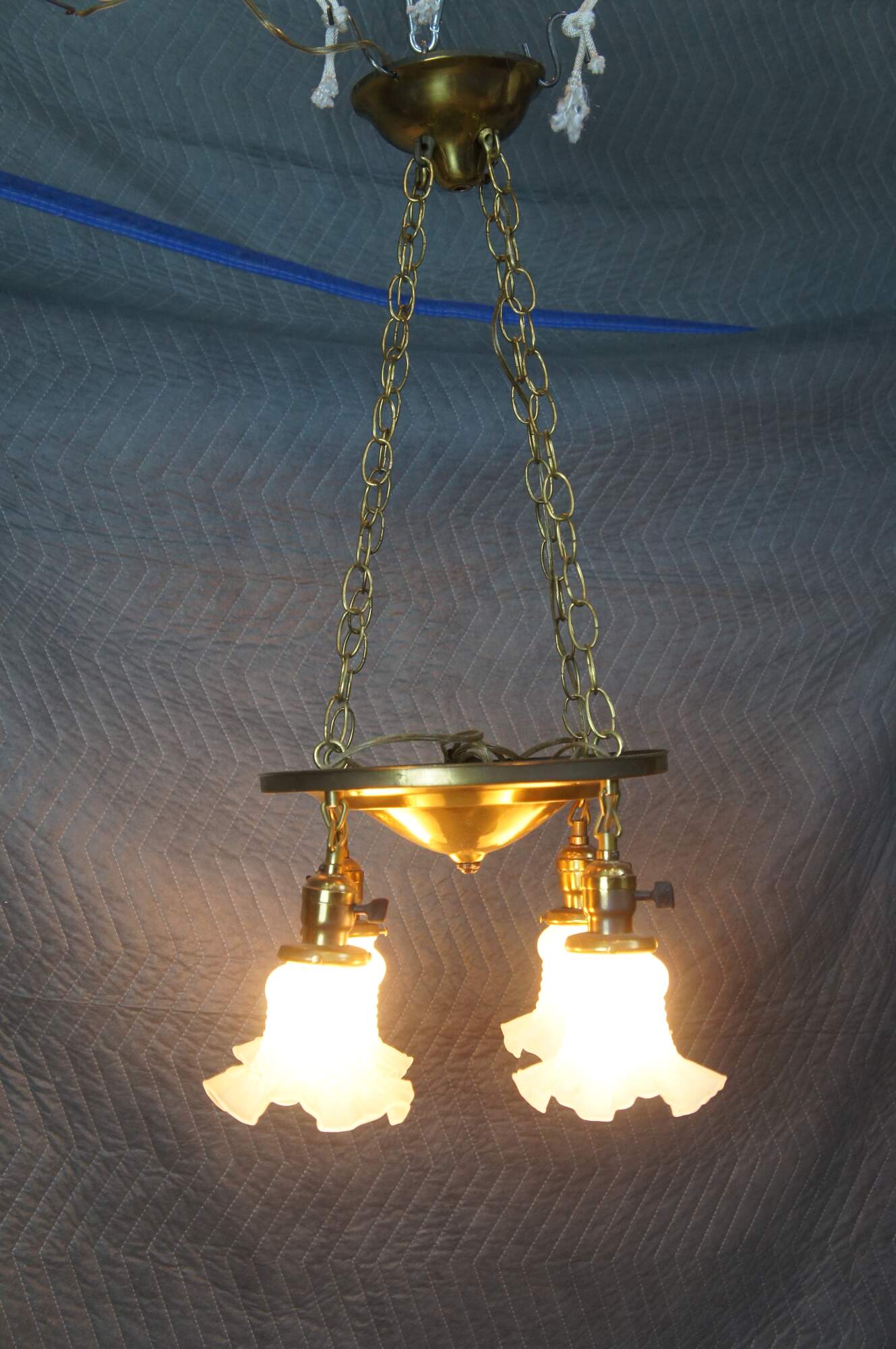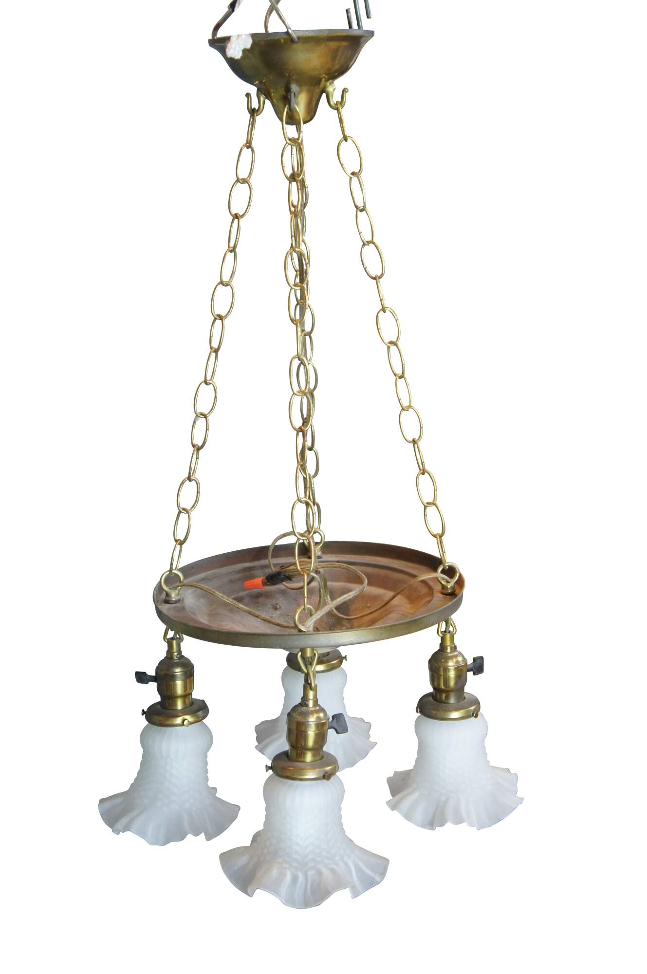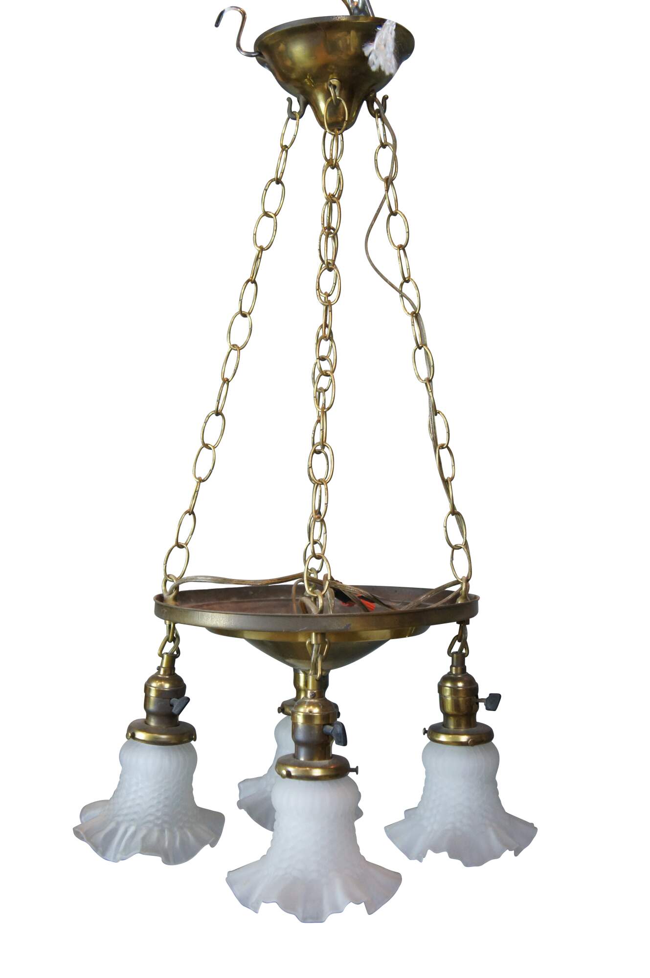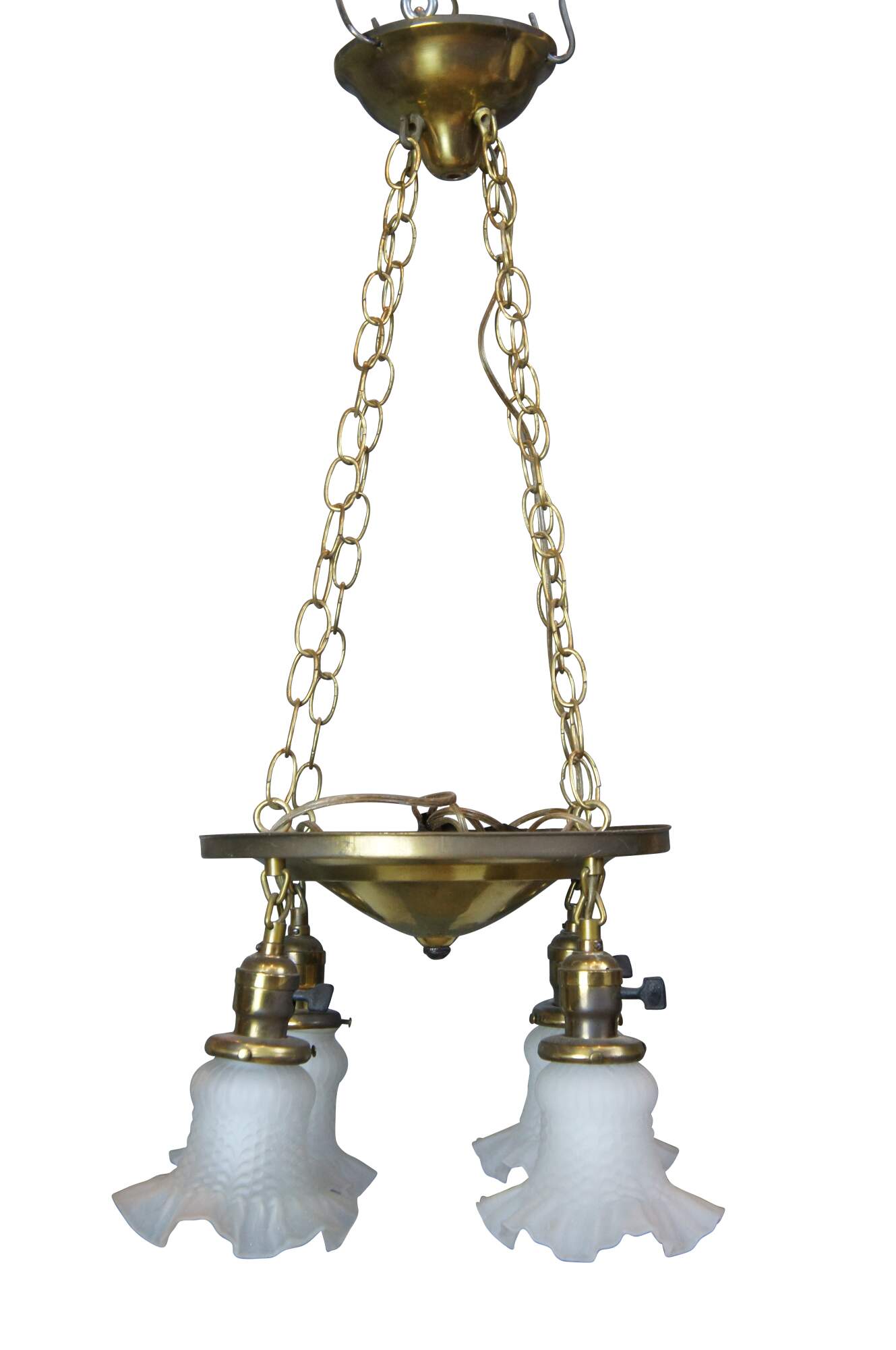 Antique drop light pendant chandelier. Made of brass featuring Victorian styling with four ruffled frosted / satin glass shades.