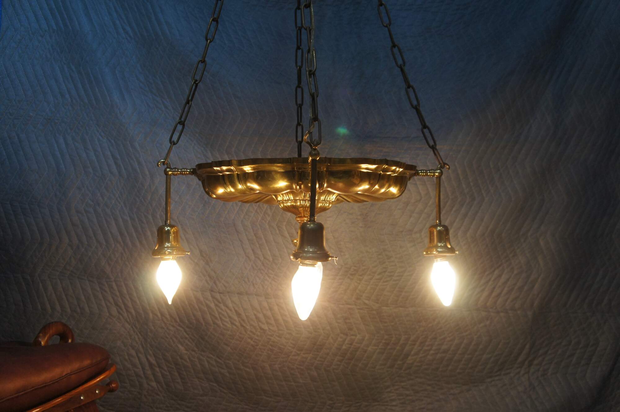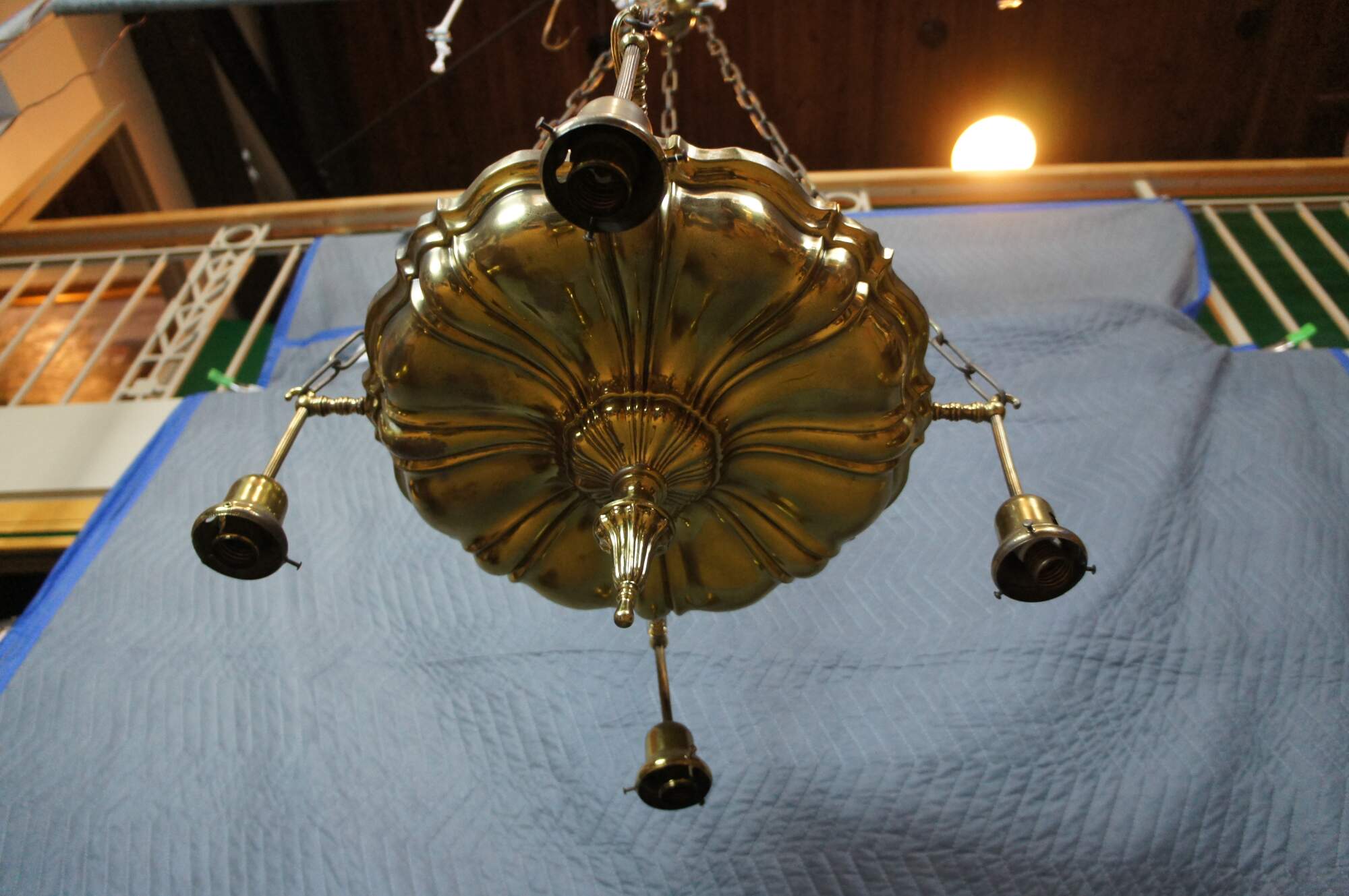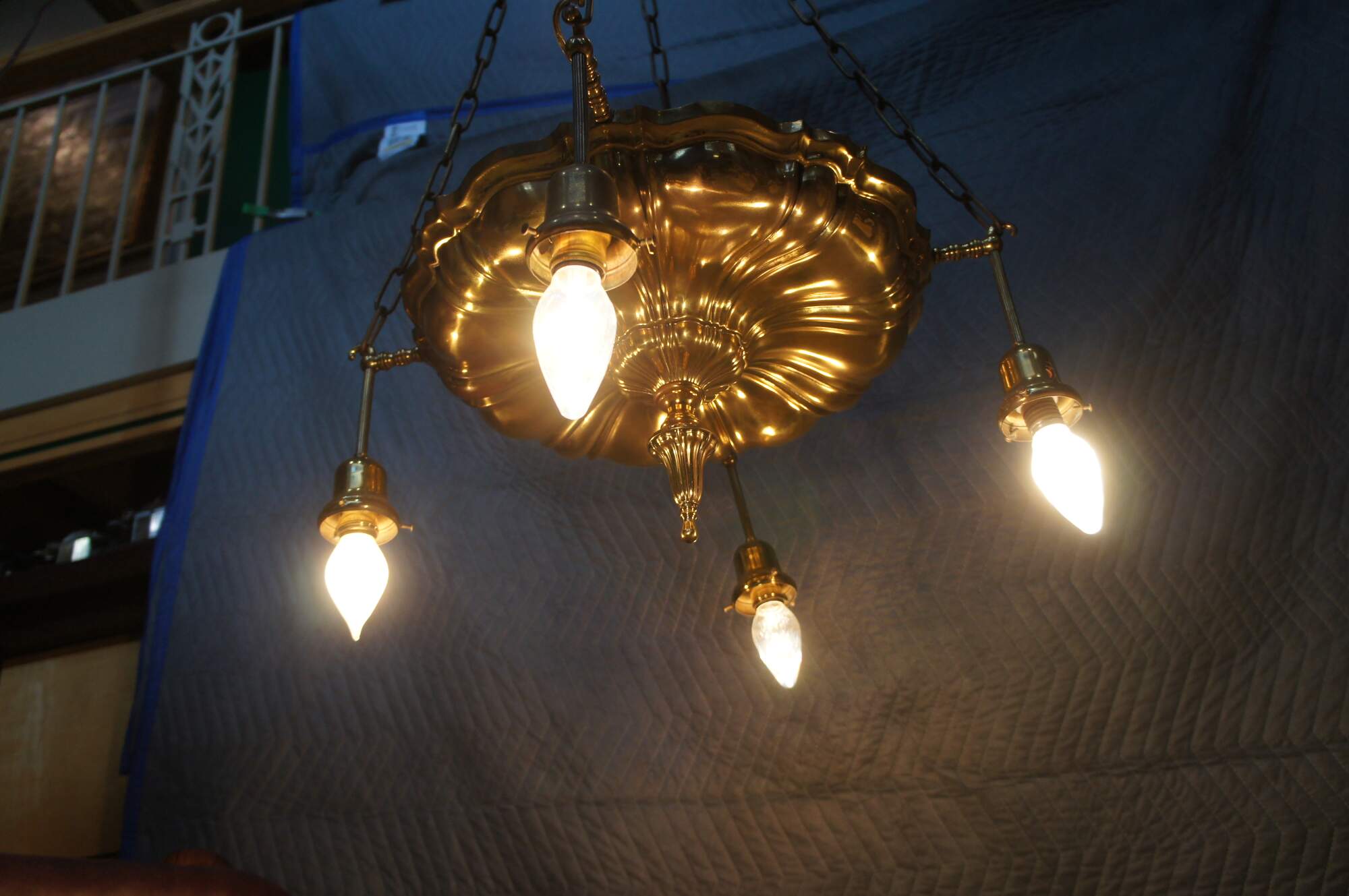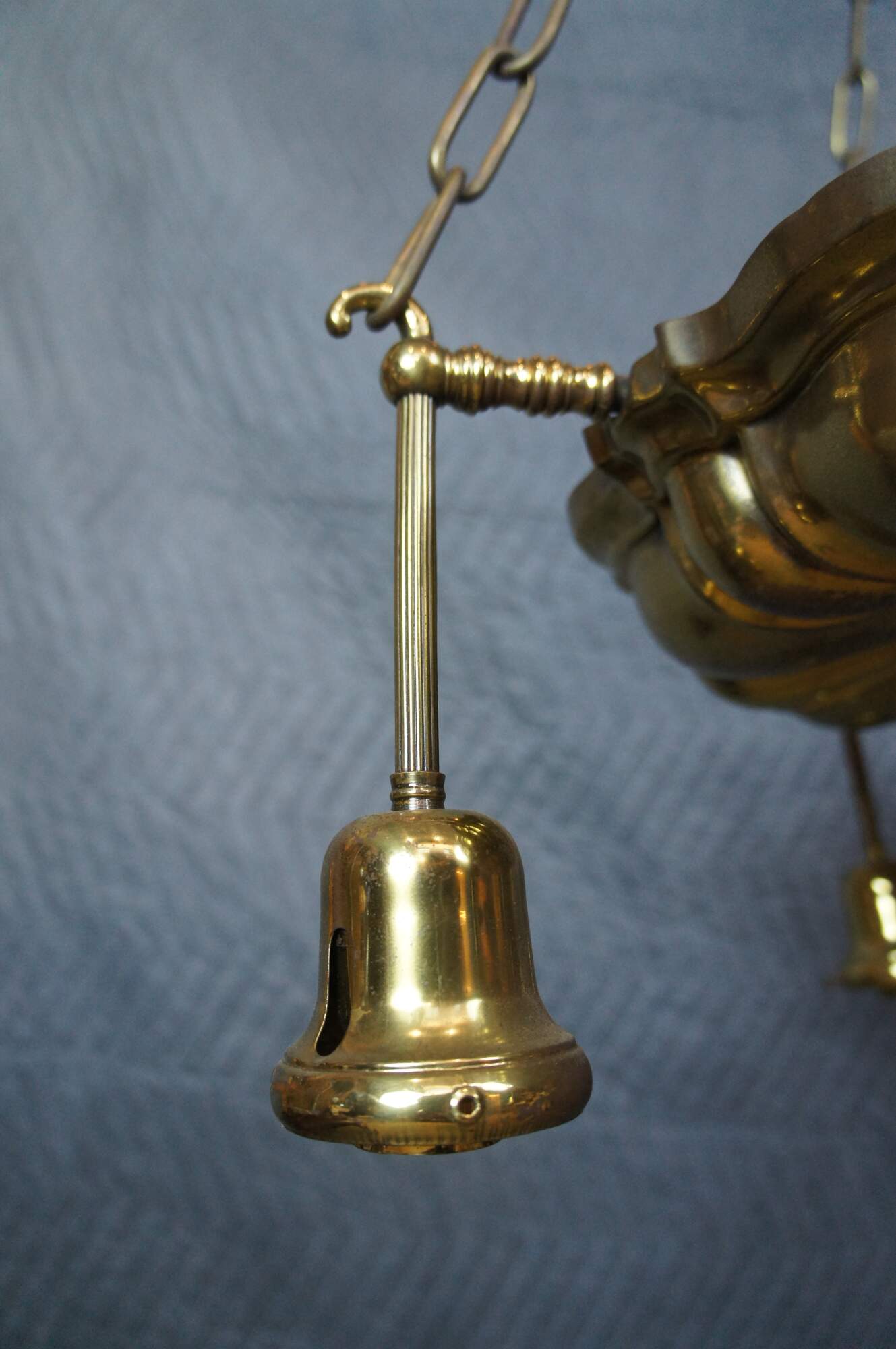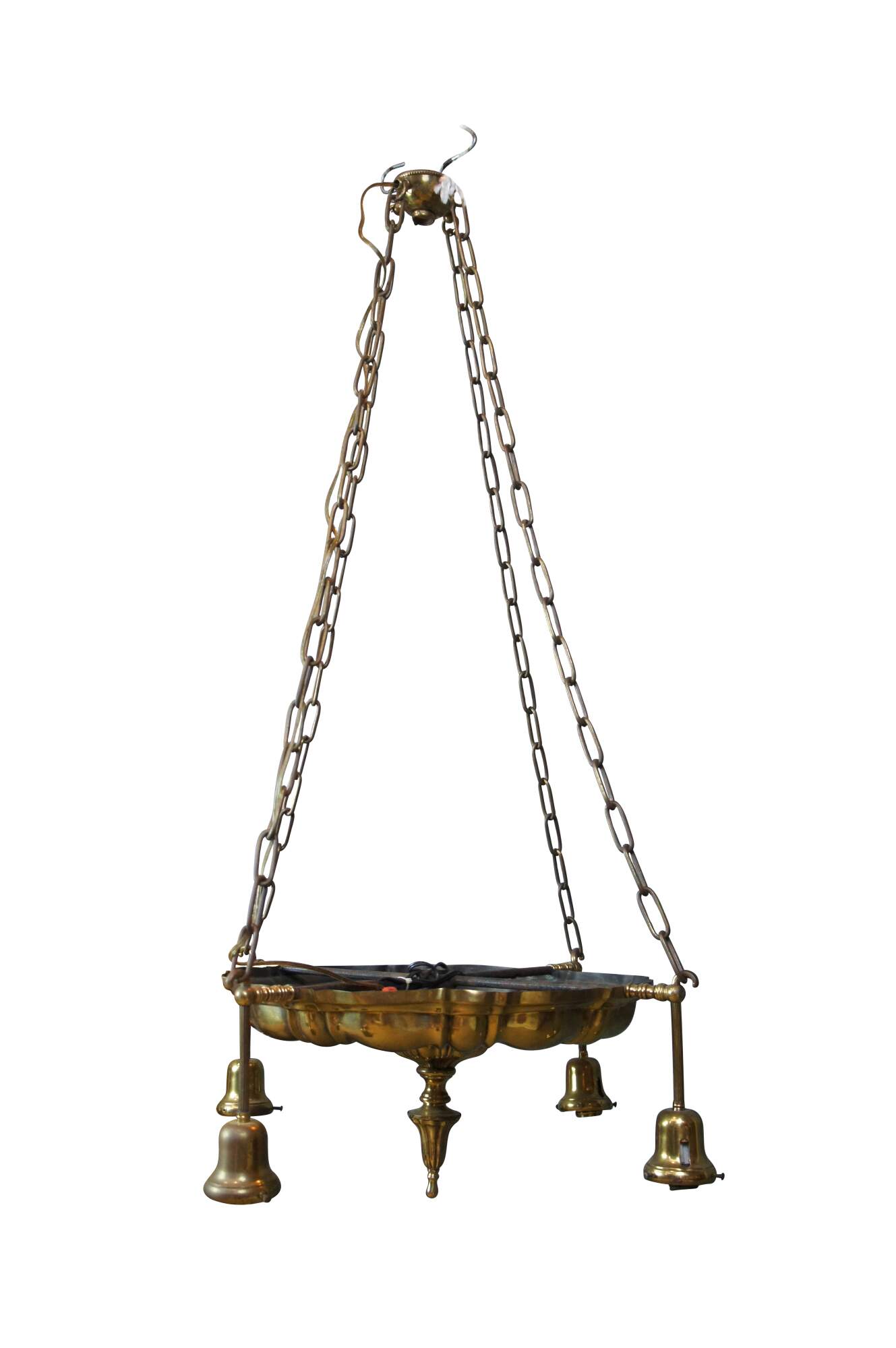Antique Victorian drop light pendant chandelier. Made of brass featuring Hollywood Regency styling with four lights.