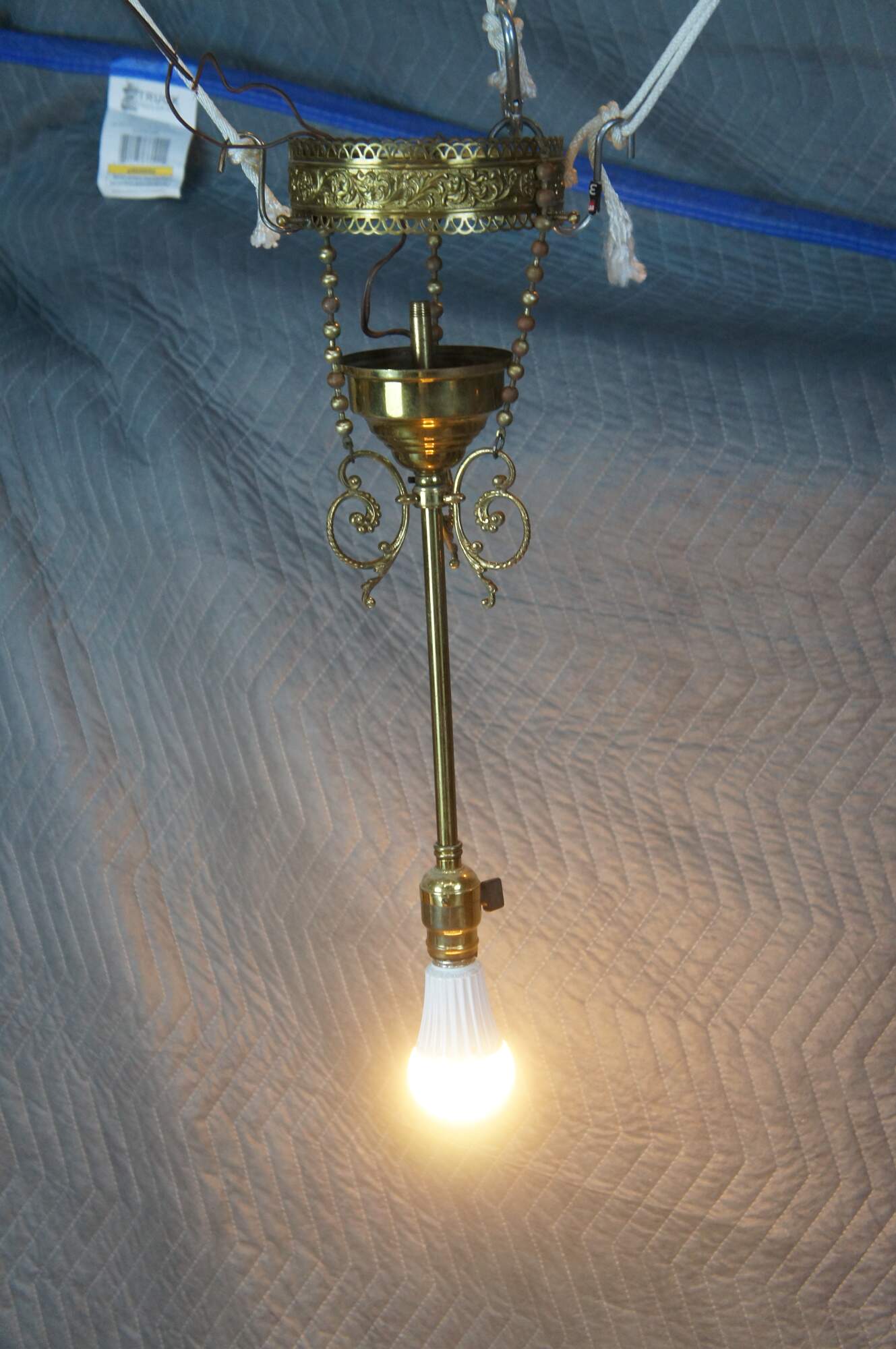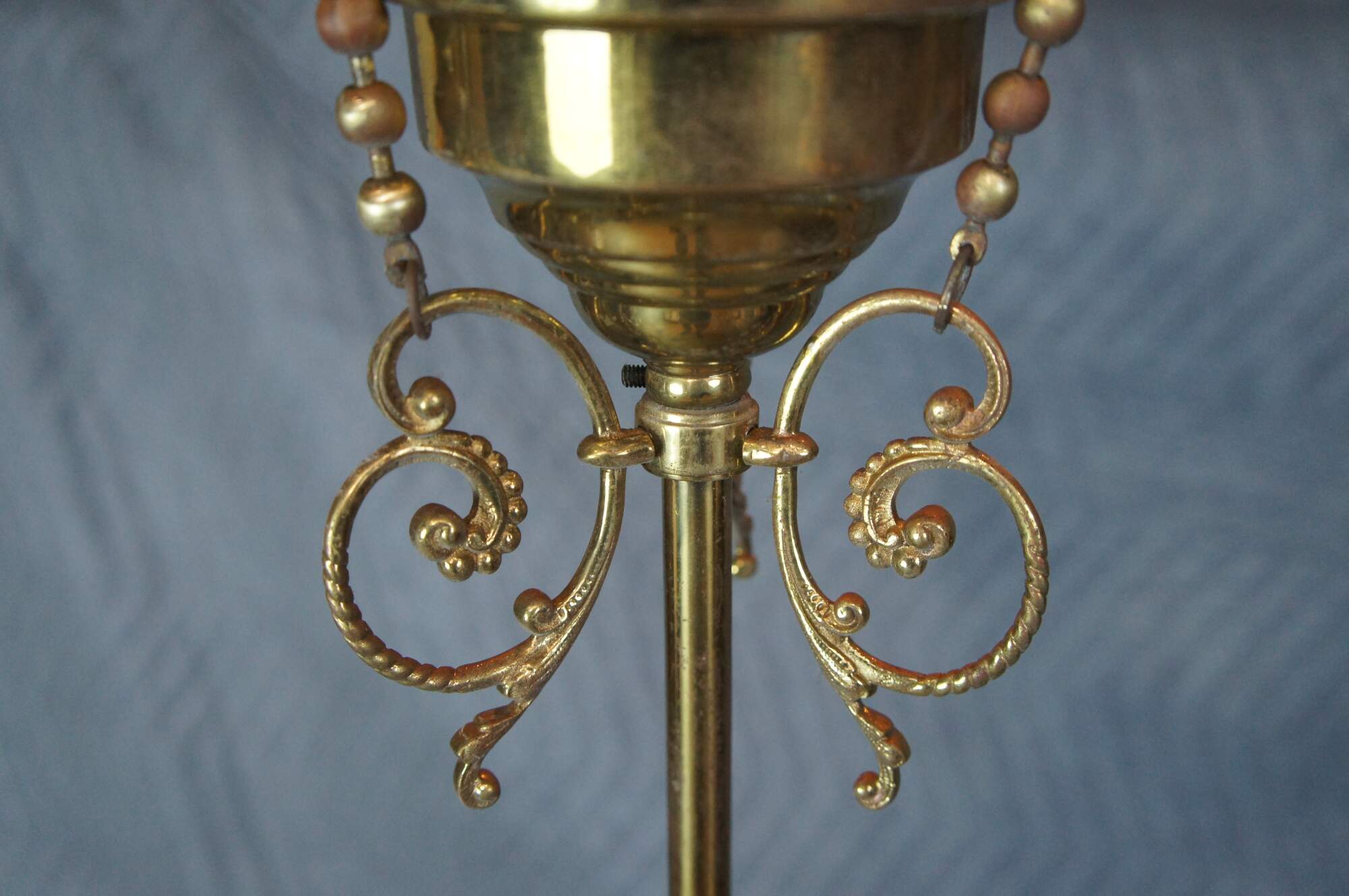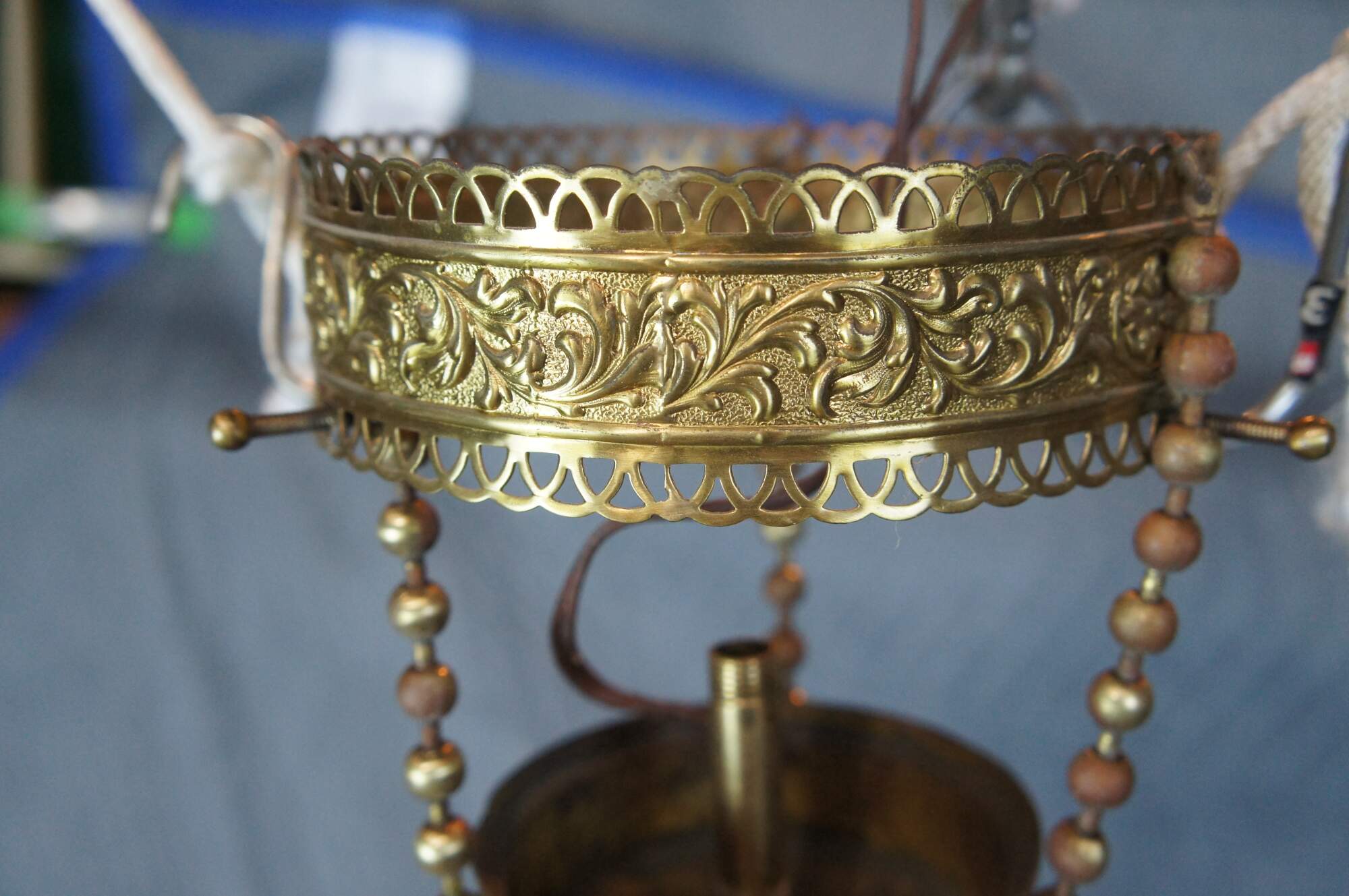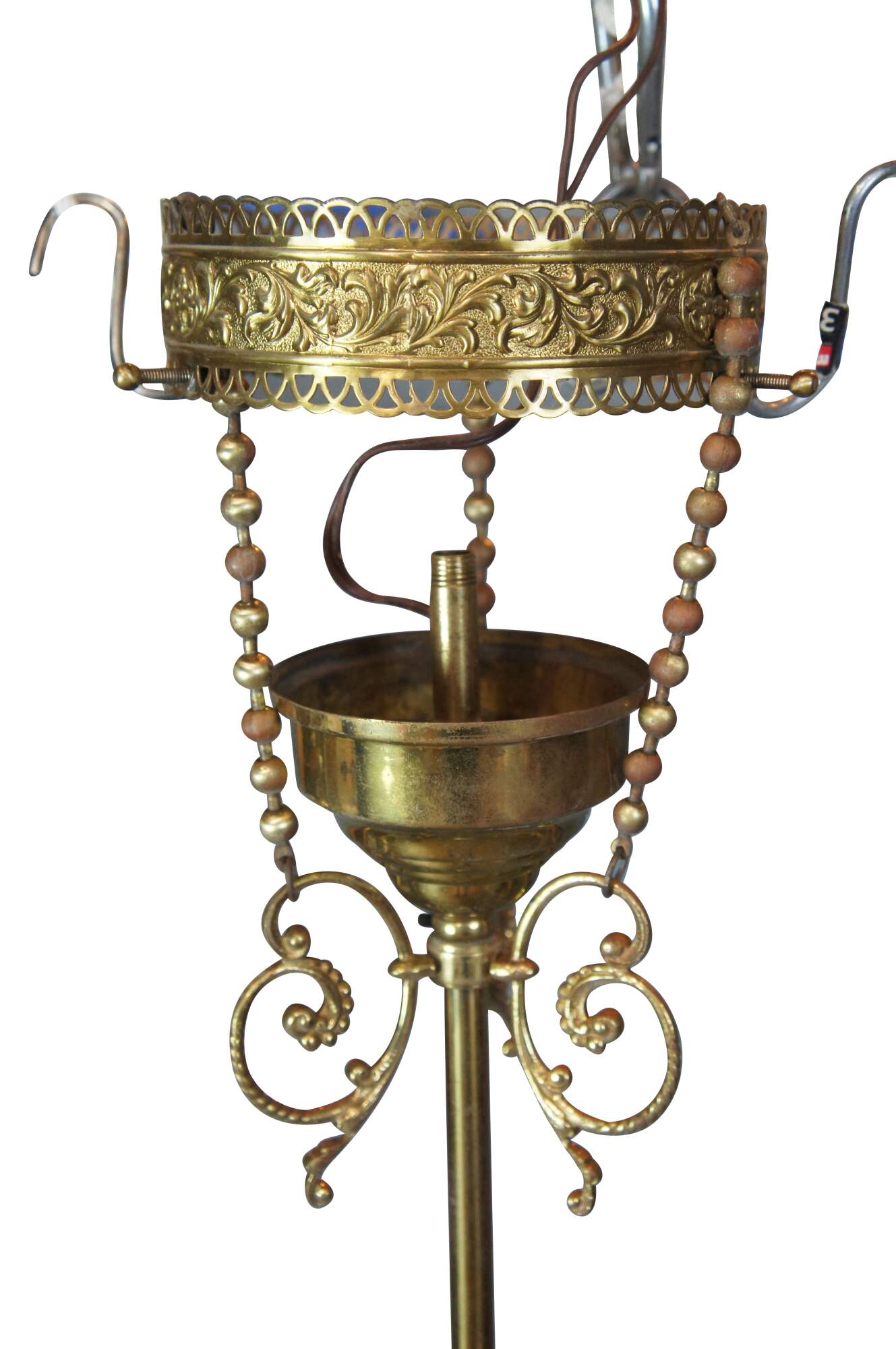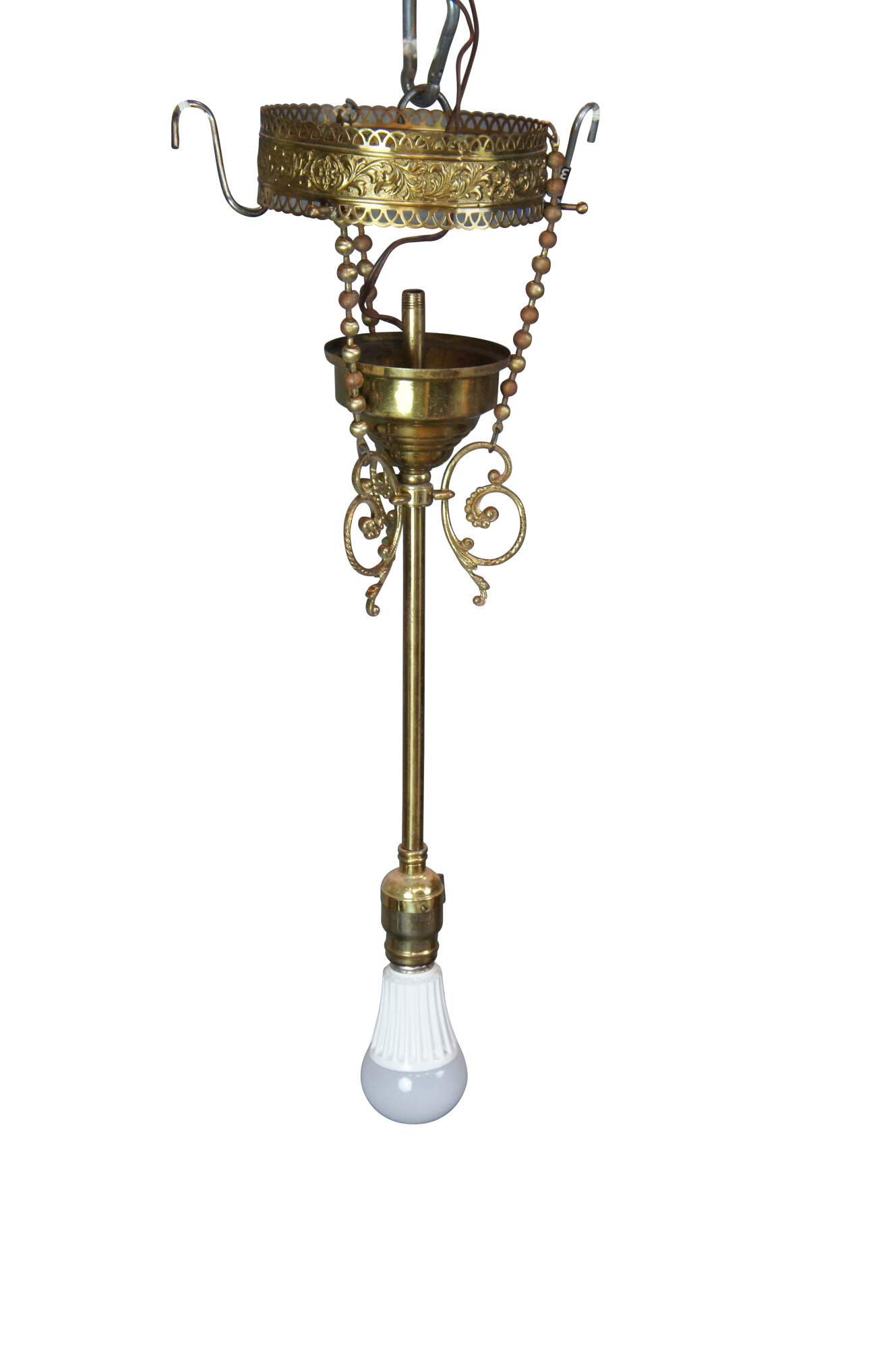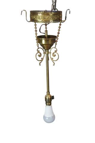 Antique Victorian drop pendant light . Made of brass featuring a Neoclassical scrolled and pierced filigree acanthus motif.