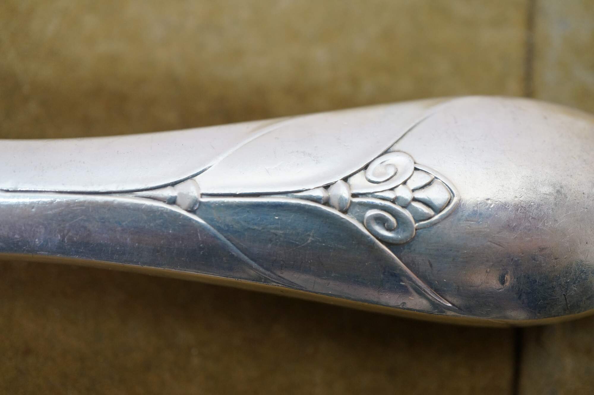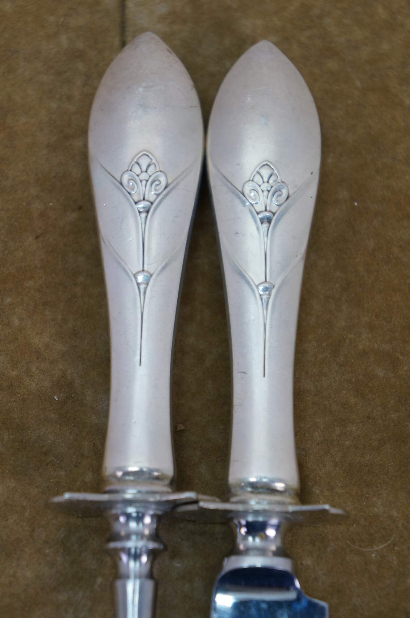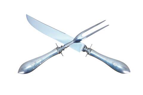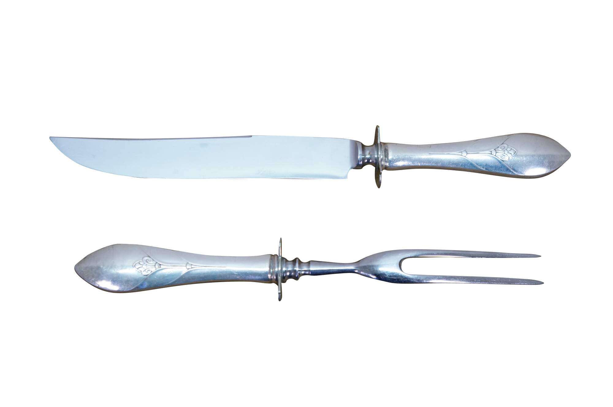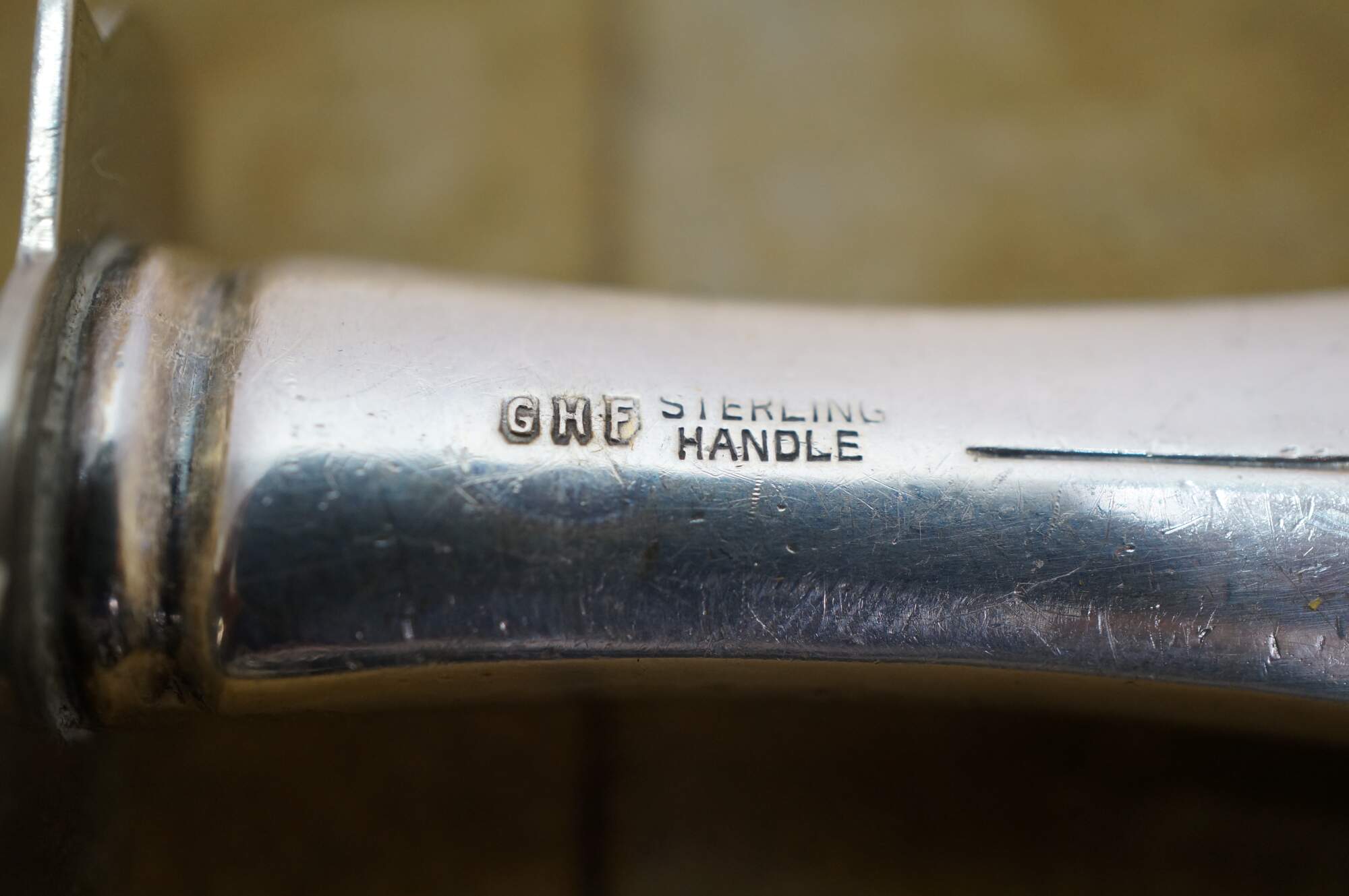 Antique G.H. French & Company (GHF) sterling silver carving serving knife fork set. GHF was active in North Attleboro, MA, from 1900 to 1939. They were absorbed by Ellmore Silver Co circa 1939.